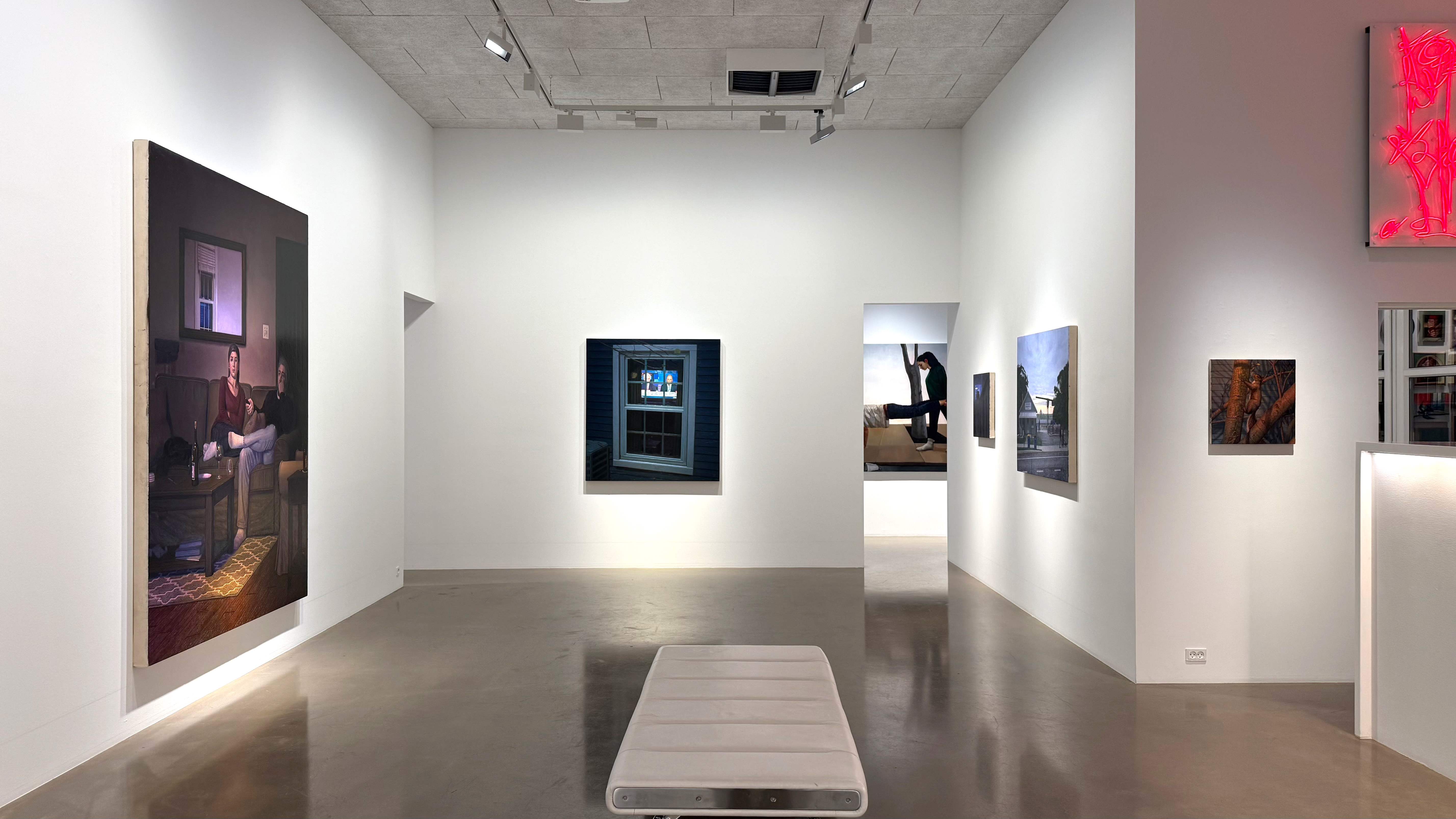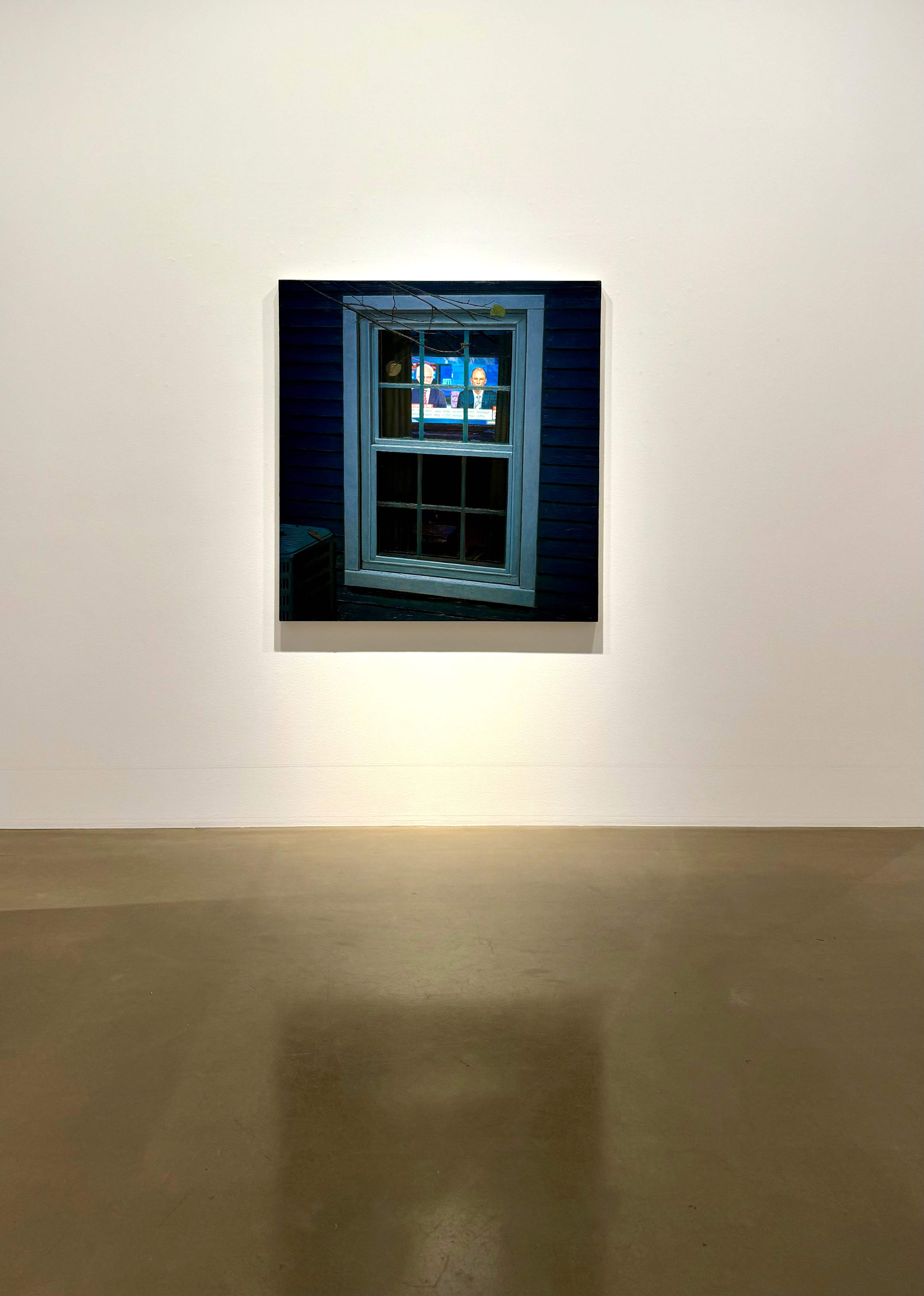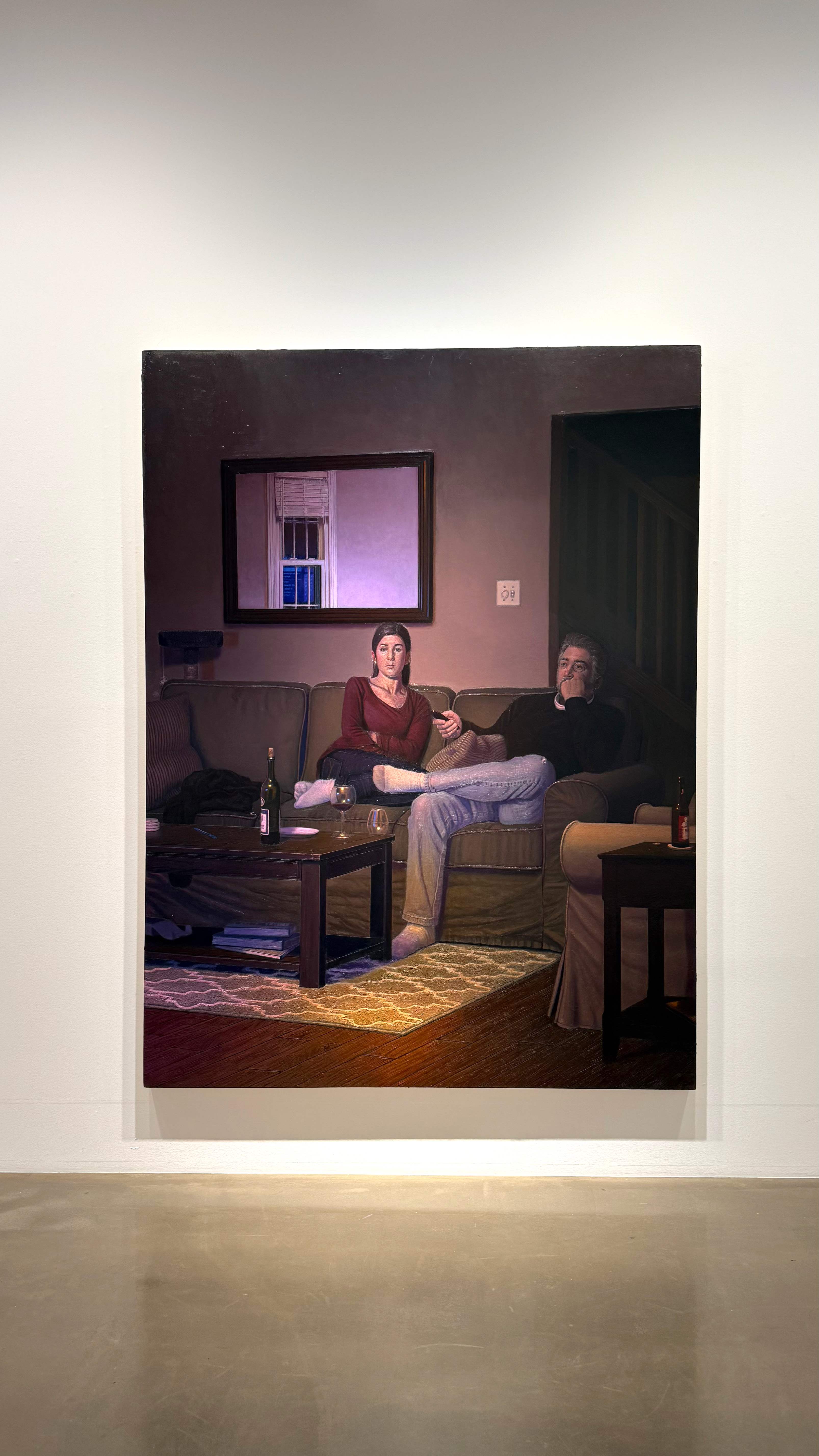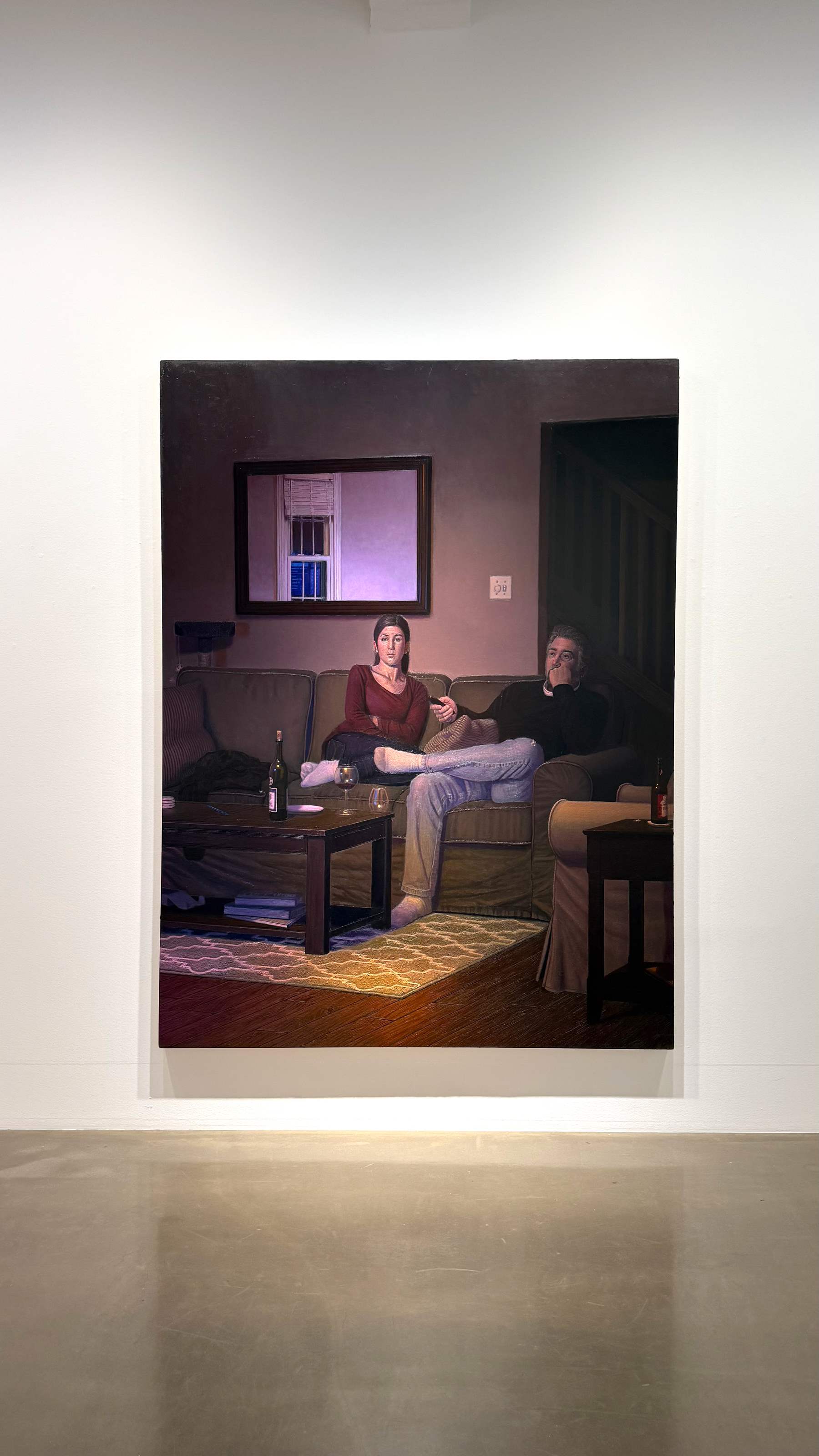 The paintings often begin with a single room but expand to include people, life, and surrounding details - mirrors, windows, TV screens, wine glasses, all elements both personal and familiar in American culture. The theme of the house becomes central, not as a specific building but as a physical and psychological center where both comfort and unease can be felt.