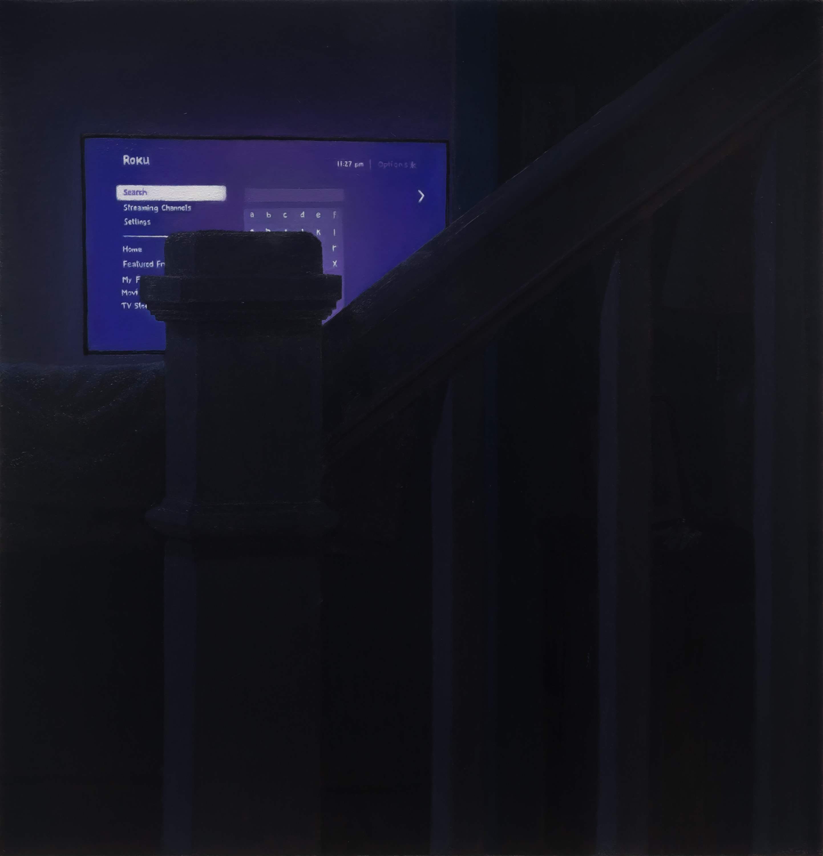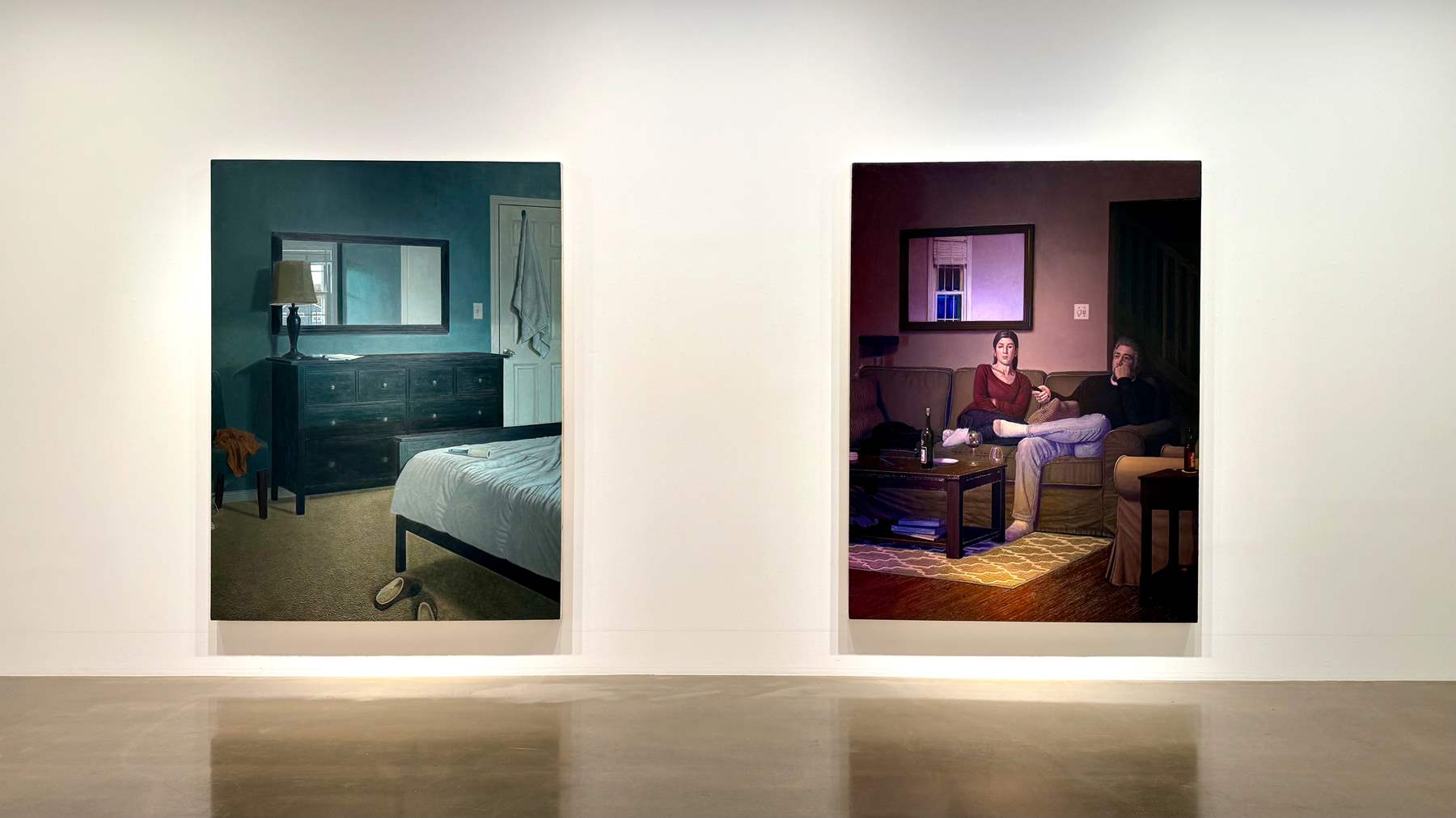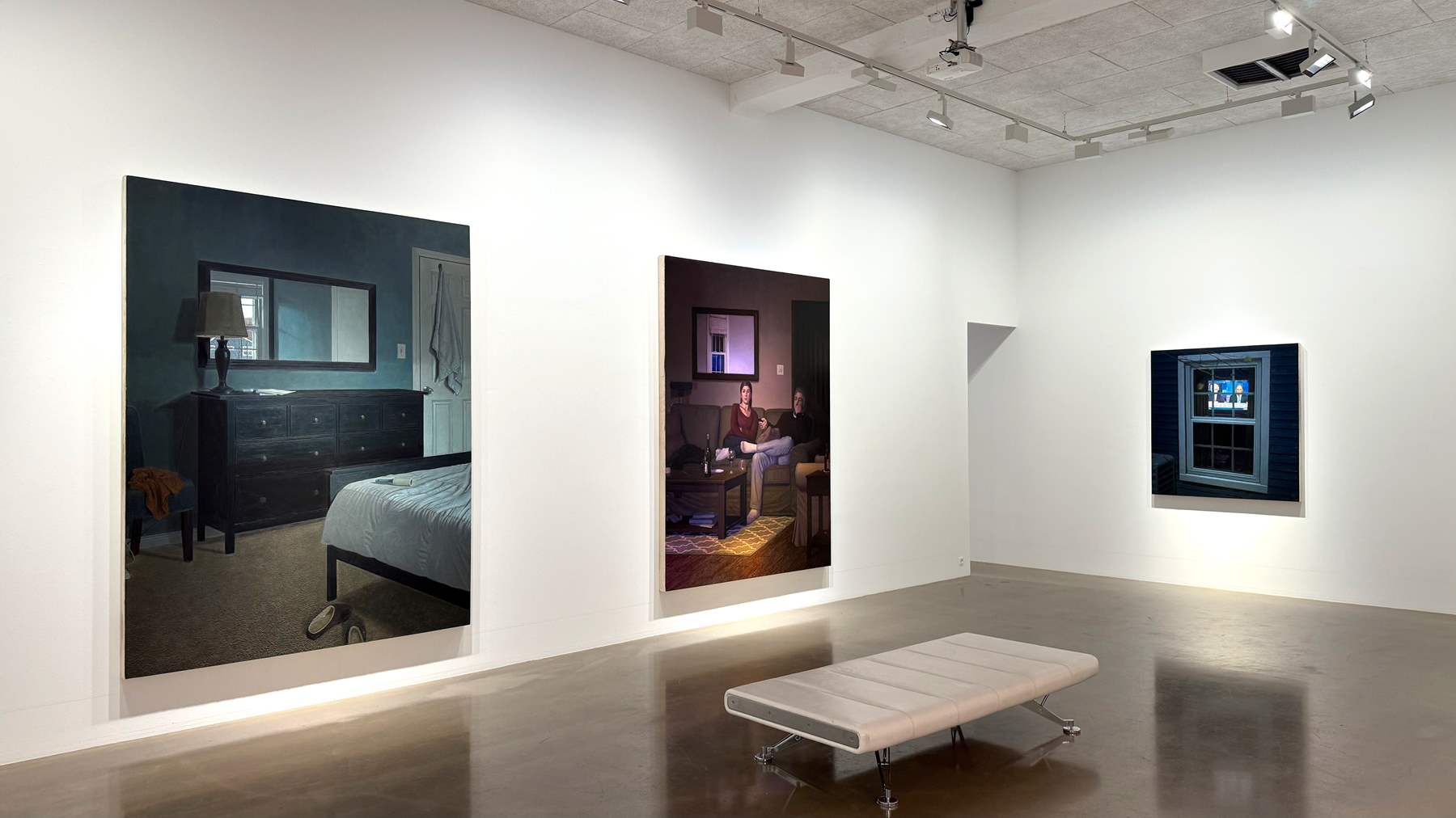 The paintings often begin with a single room but expand to include people, life, and surrounding details - mirrors, windows, TV screens, wine glasses, all elements both personal and familiar in American culture. The theme of the house becomes central, not as a specific building but as a physical and psychological center where both comfort and unease can be felt.