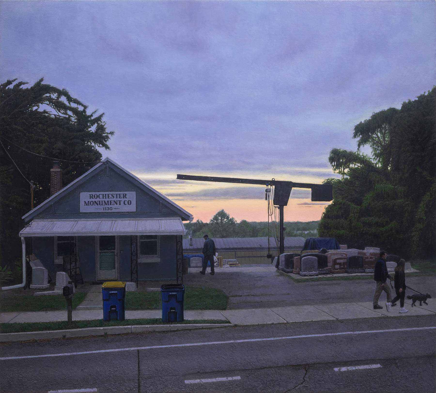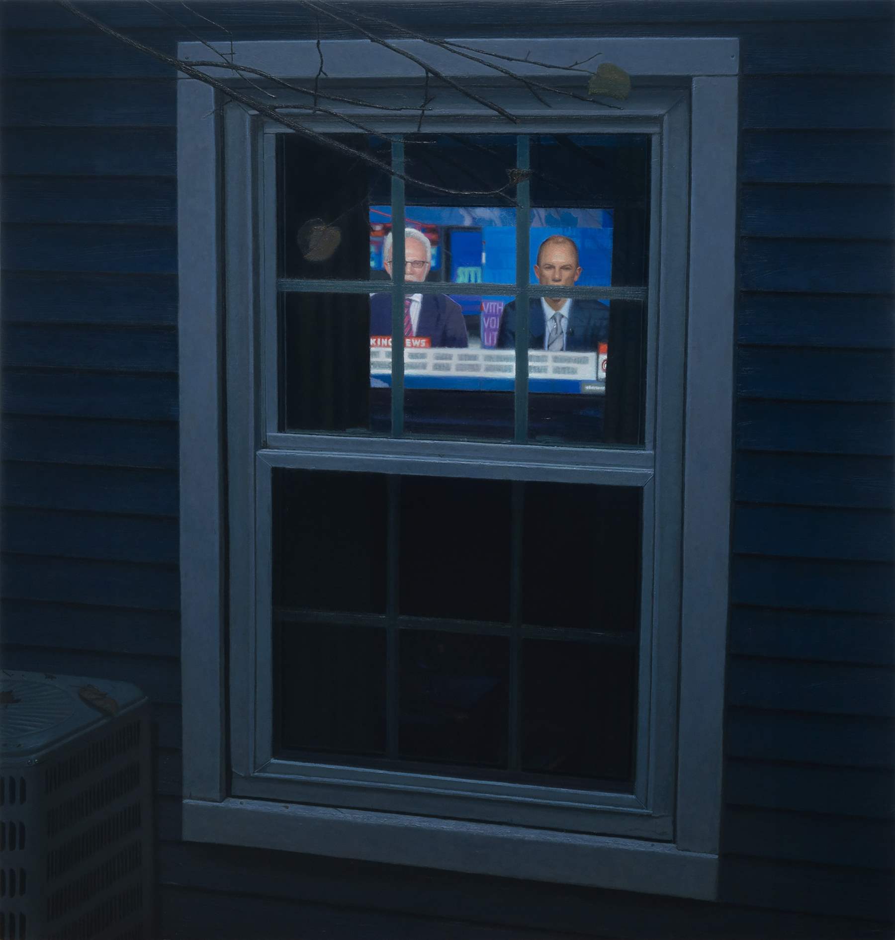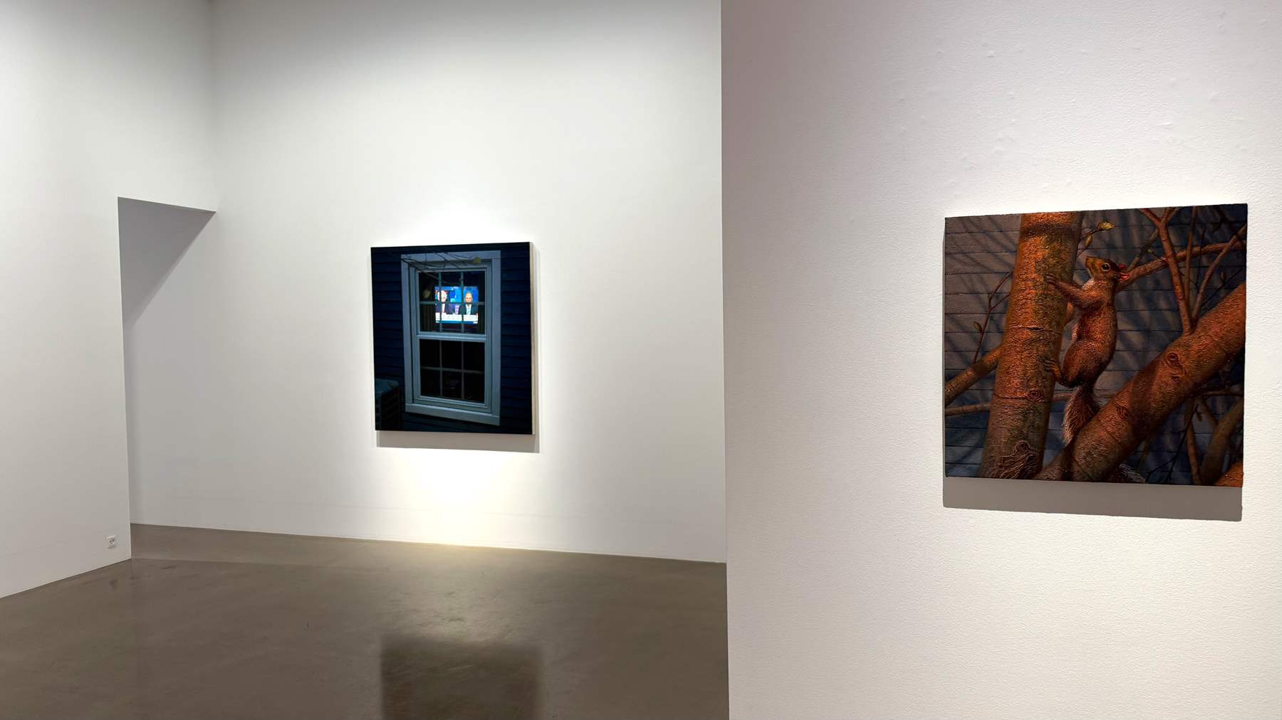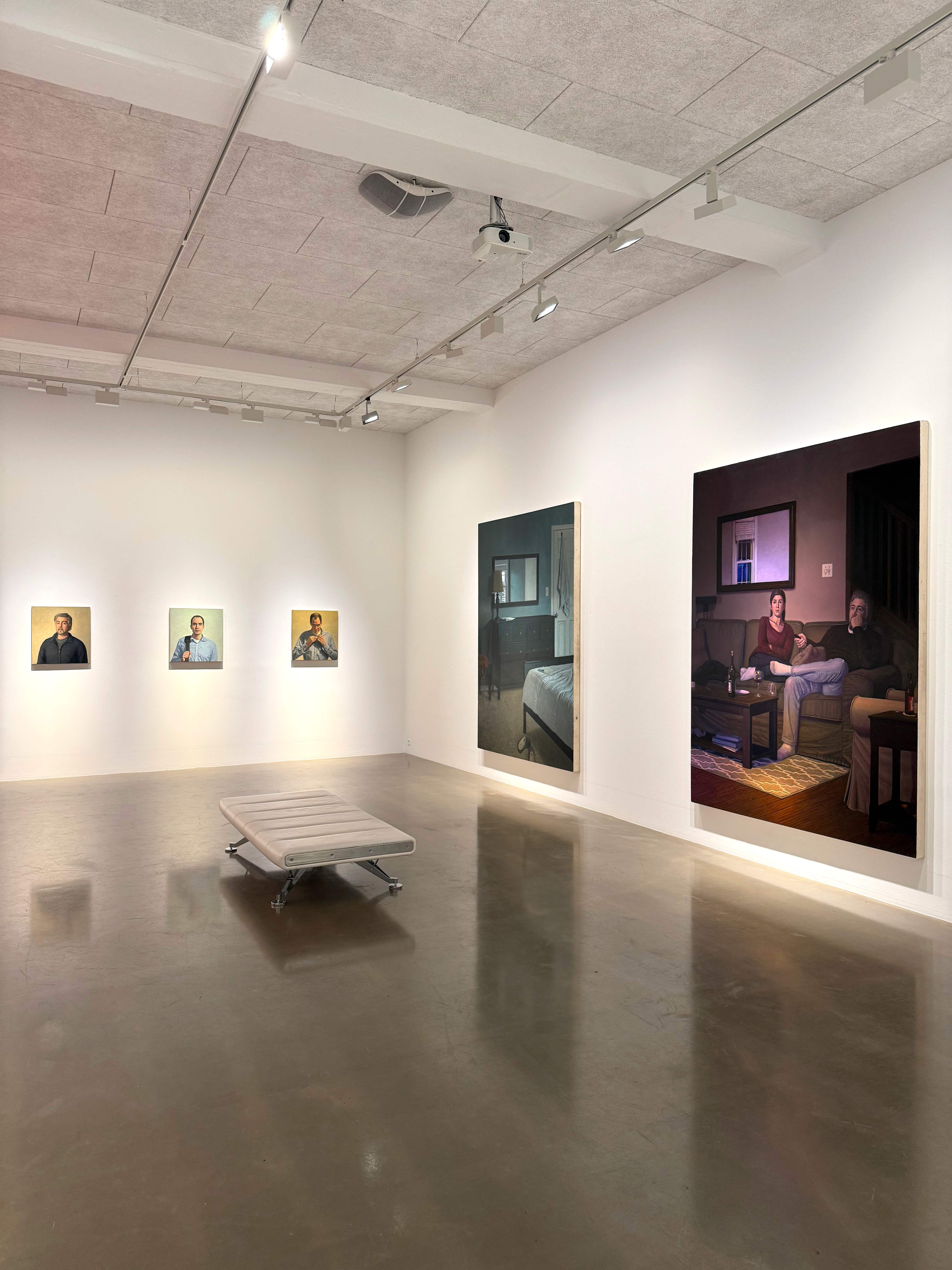 The paintings often begin with a single room but expand to include people, life, and surrounding details - mirrors, windows, TV screens, wine glasses, all elements both personal and familiar in American culture. The theme of the house becomes central, not as a specific building but as a physical and psychological center where both comfort and unease can be felt.