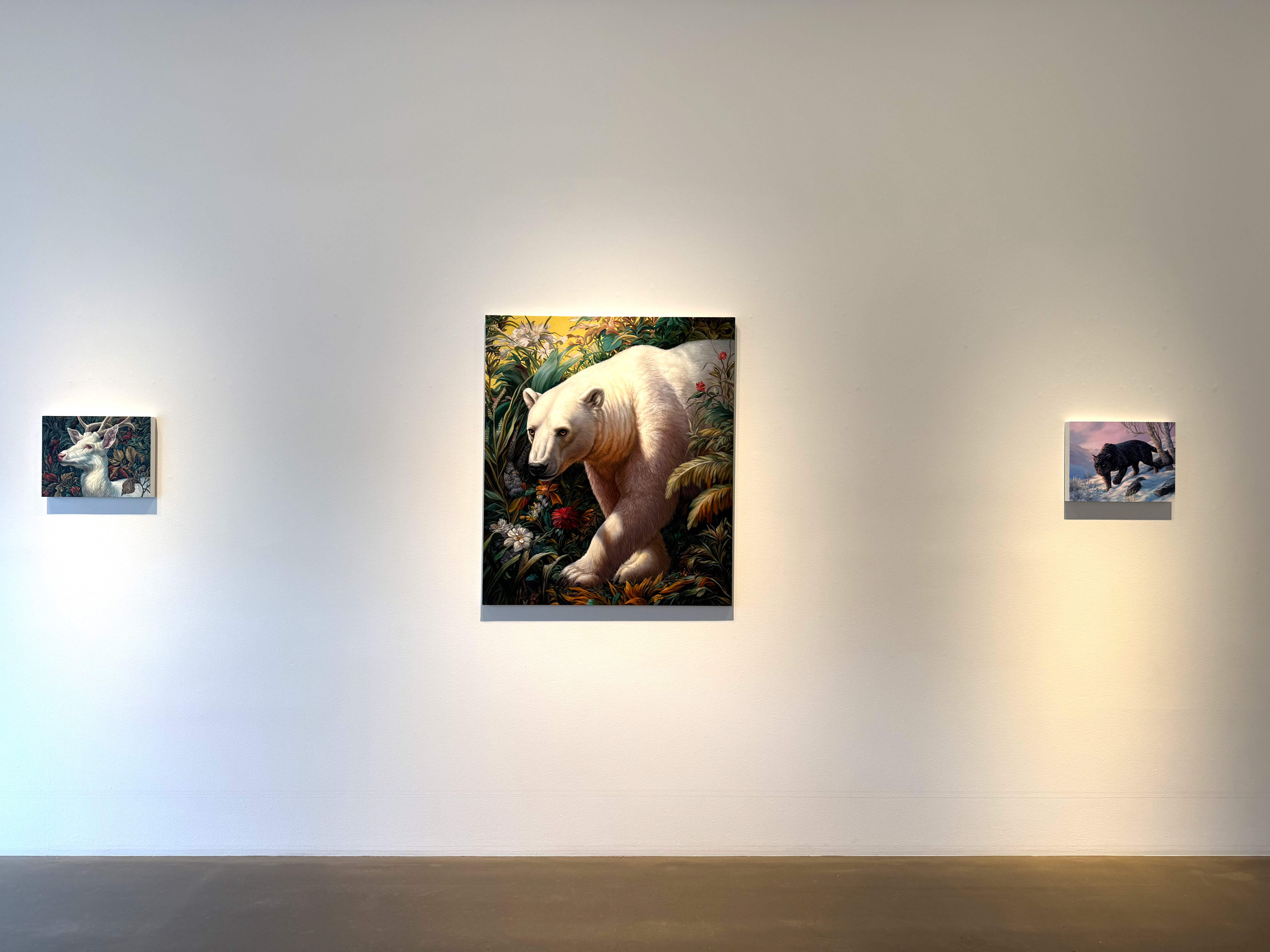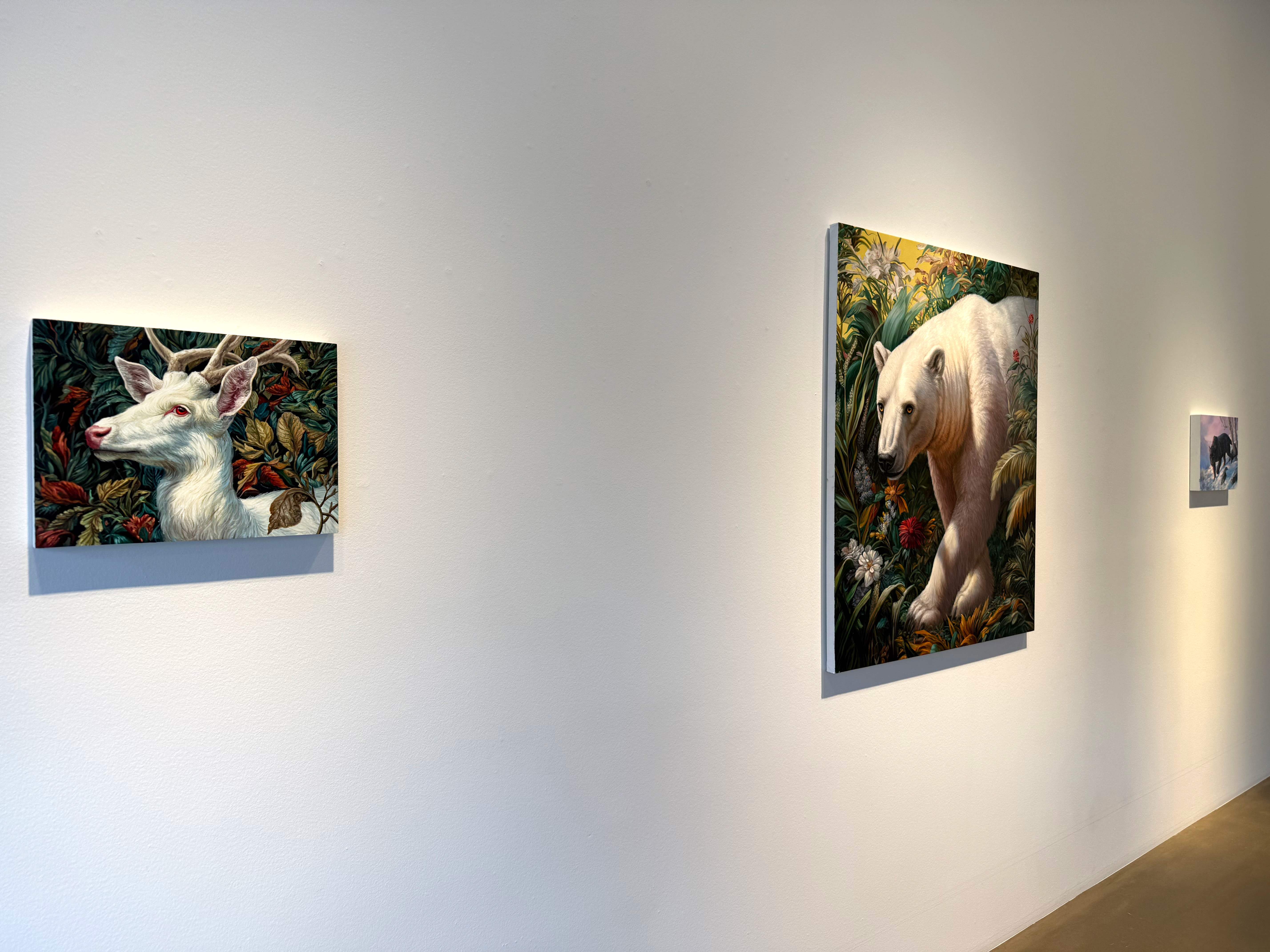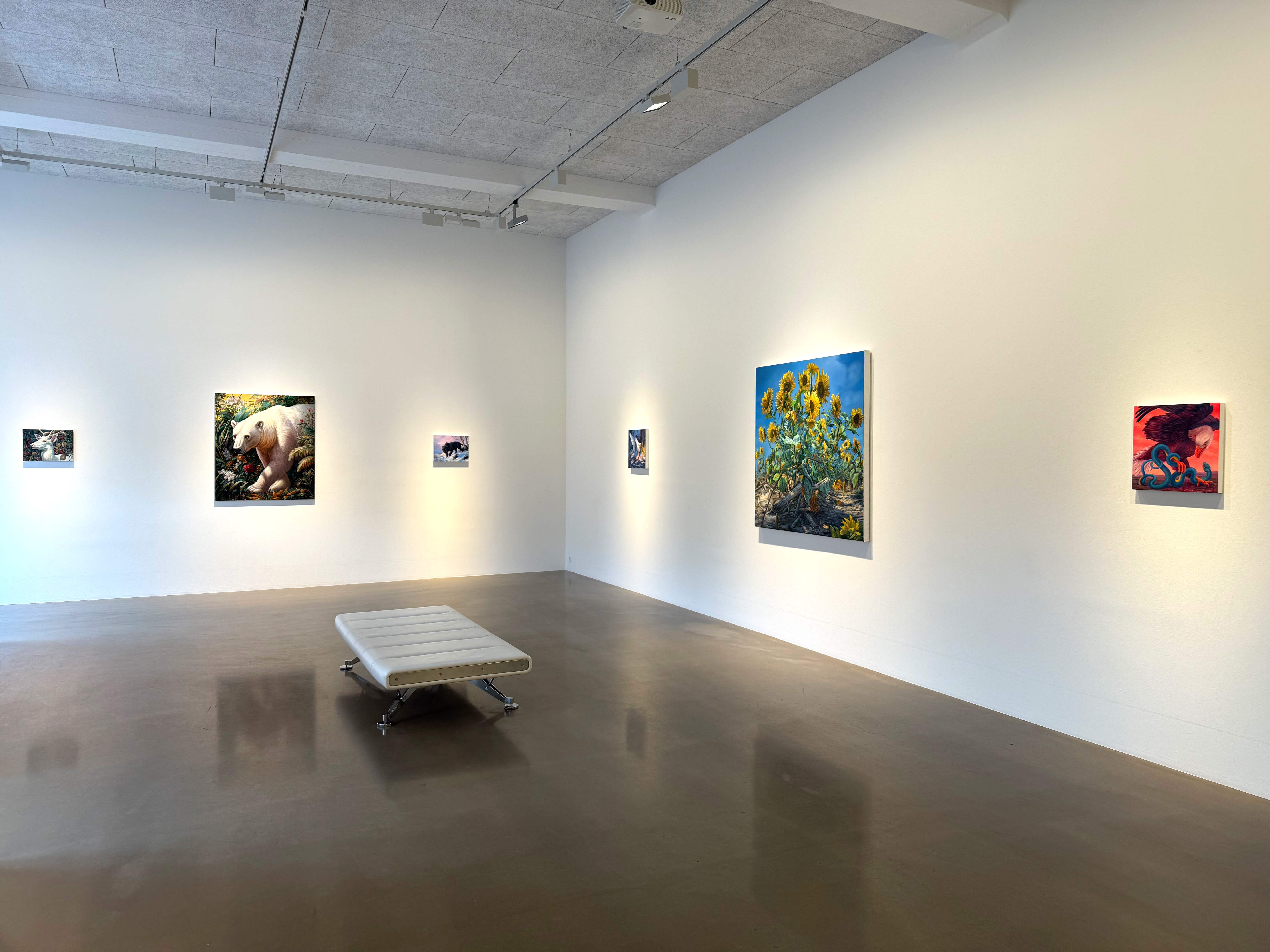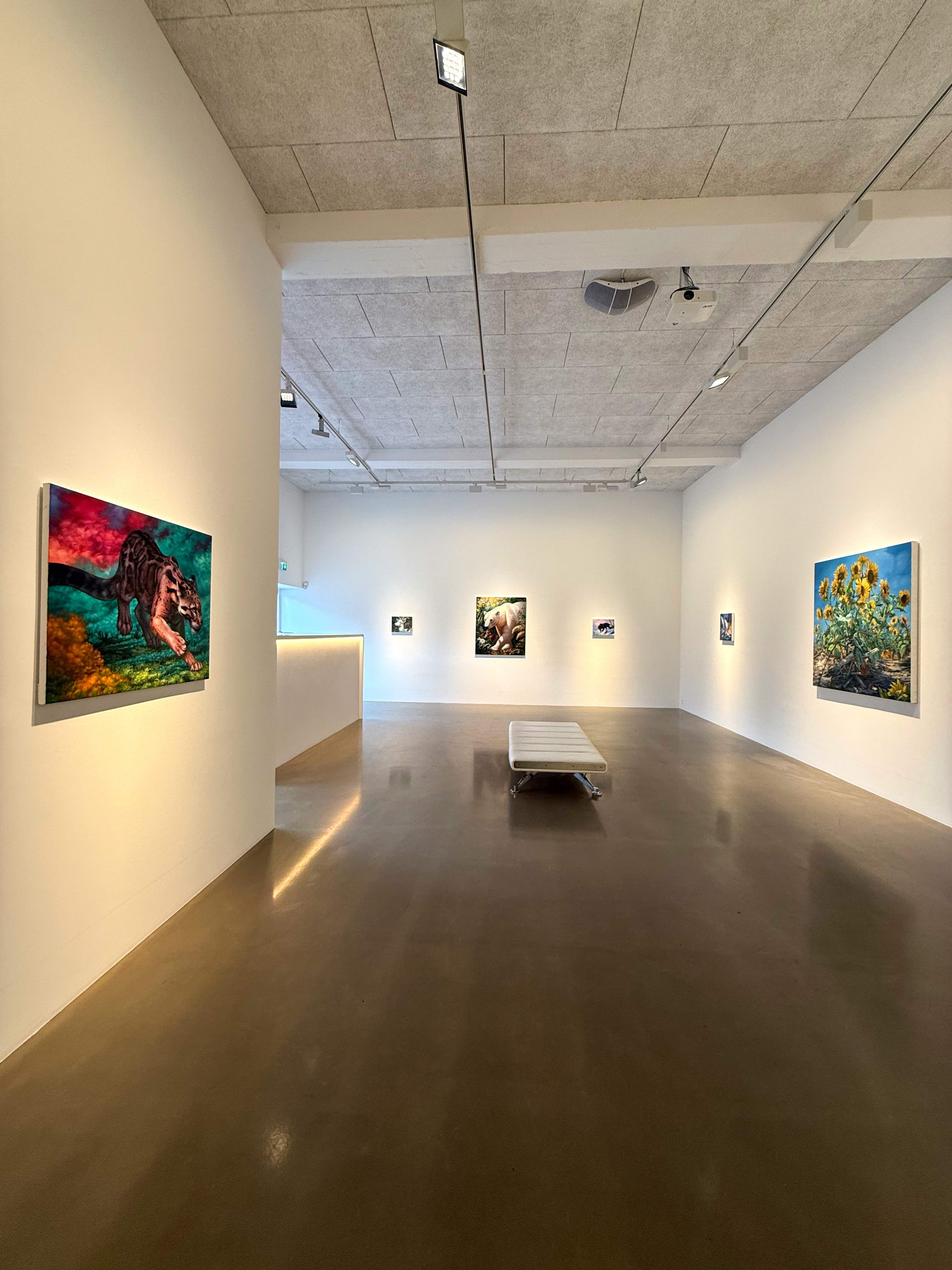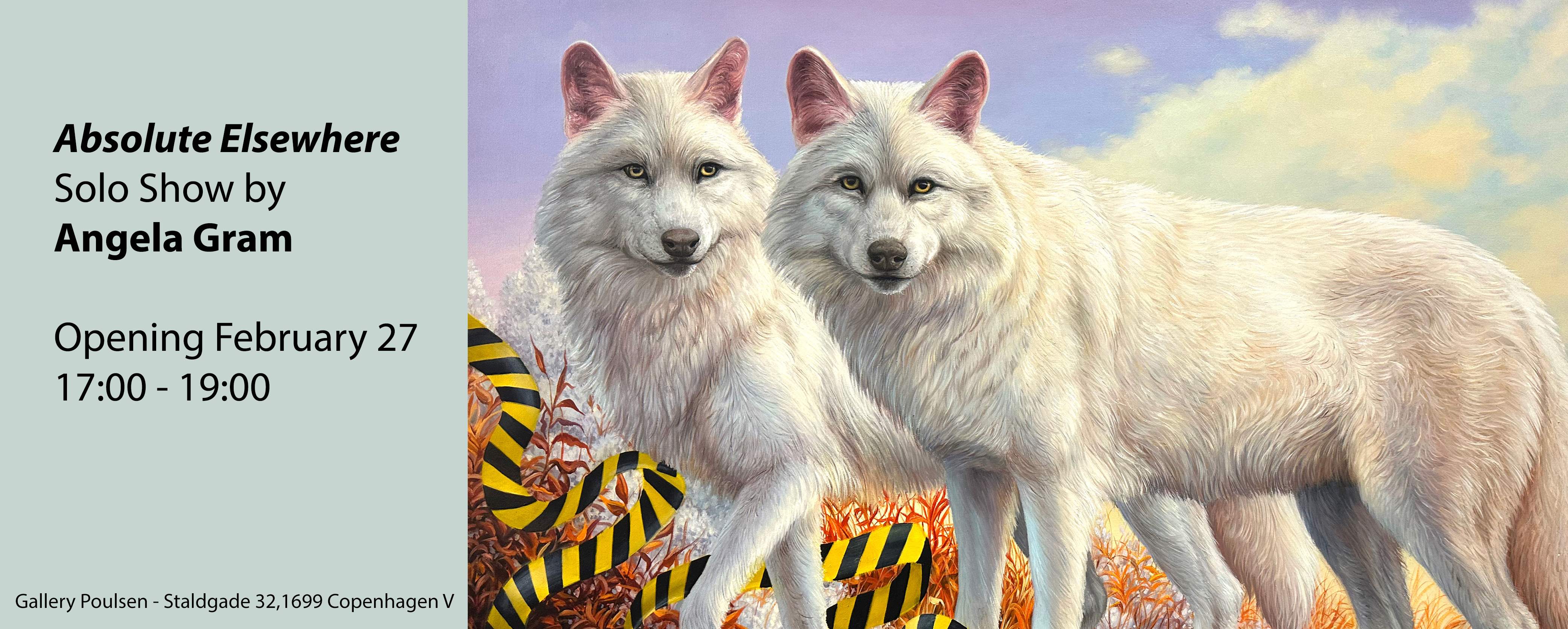 Absolute Elsewhere is Angela Gram’s fourth solo exhibition at Gallery Poulsen. In this new series of paintings, she explores some of the most radical scientific experiments of our time, shifting global power structures, and climate change, expressed through the symbolic language of nature and wild animals.
