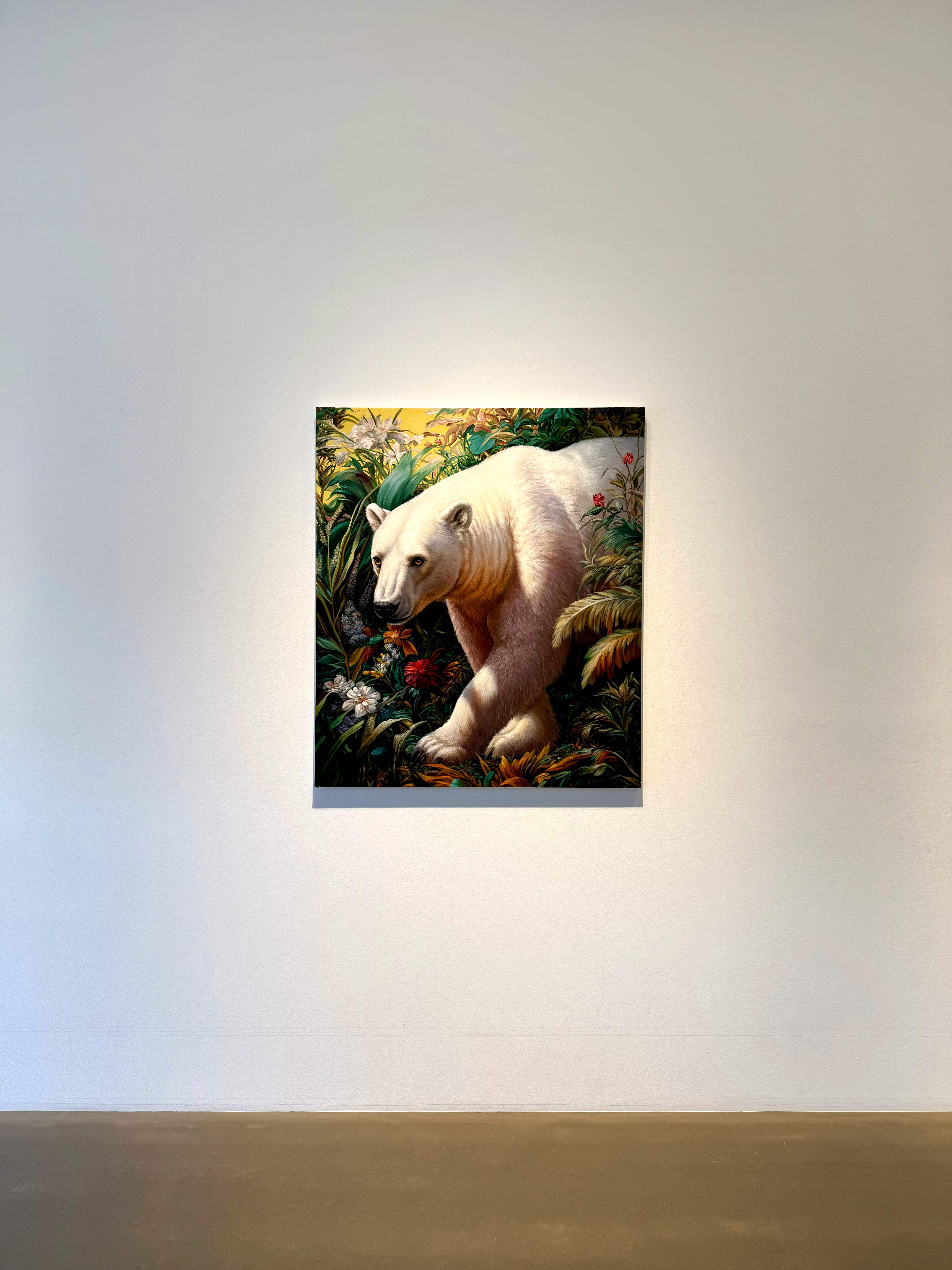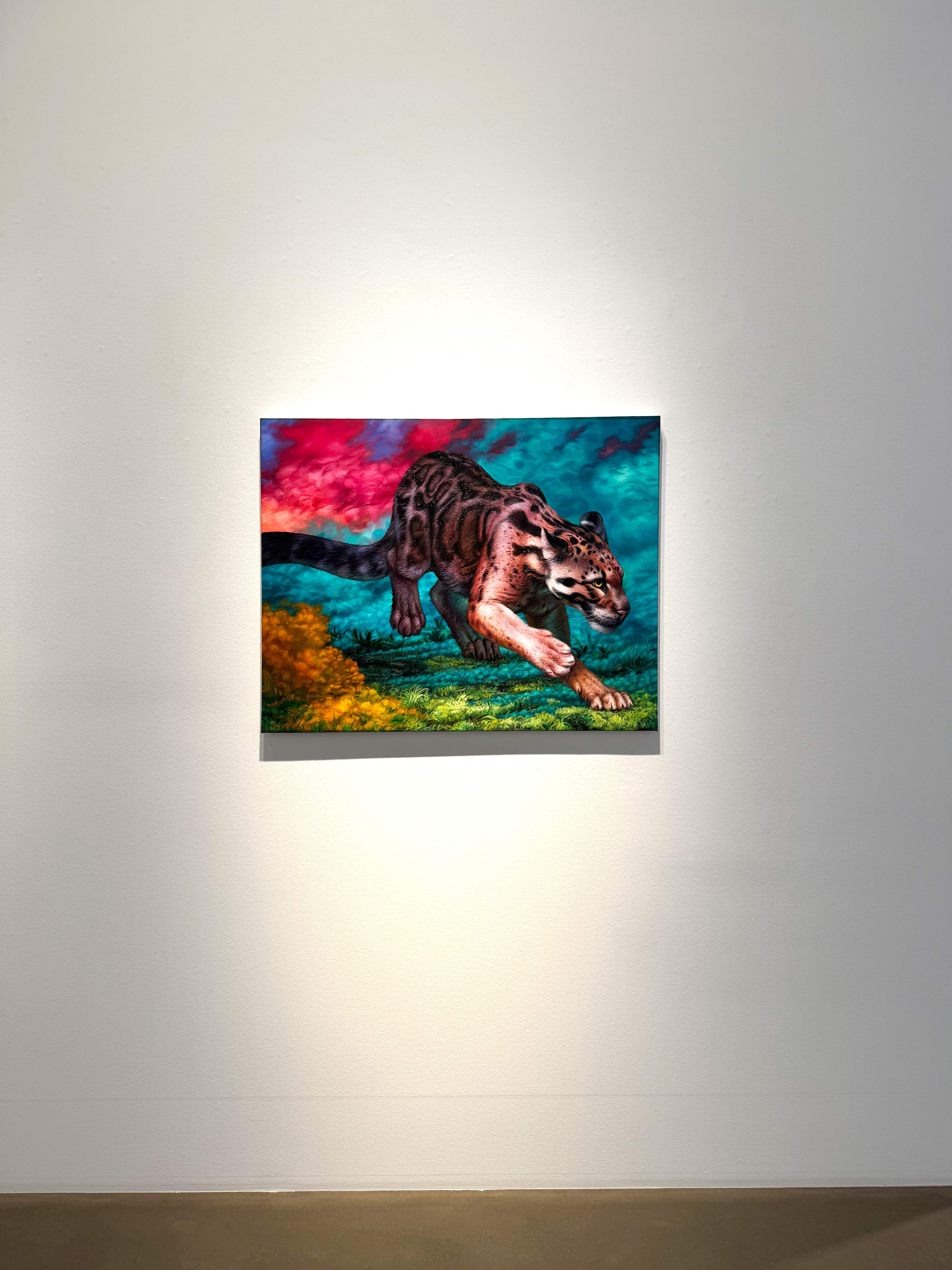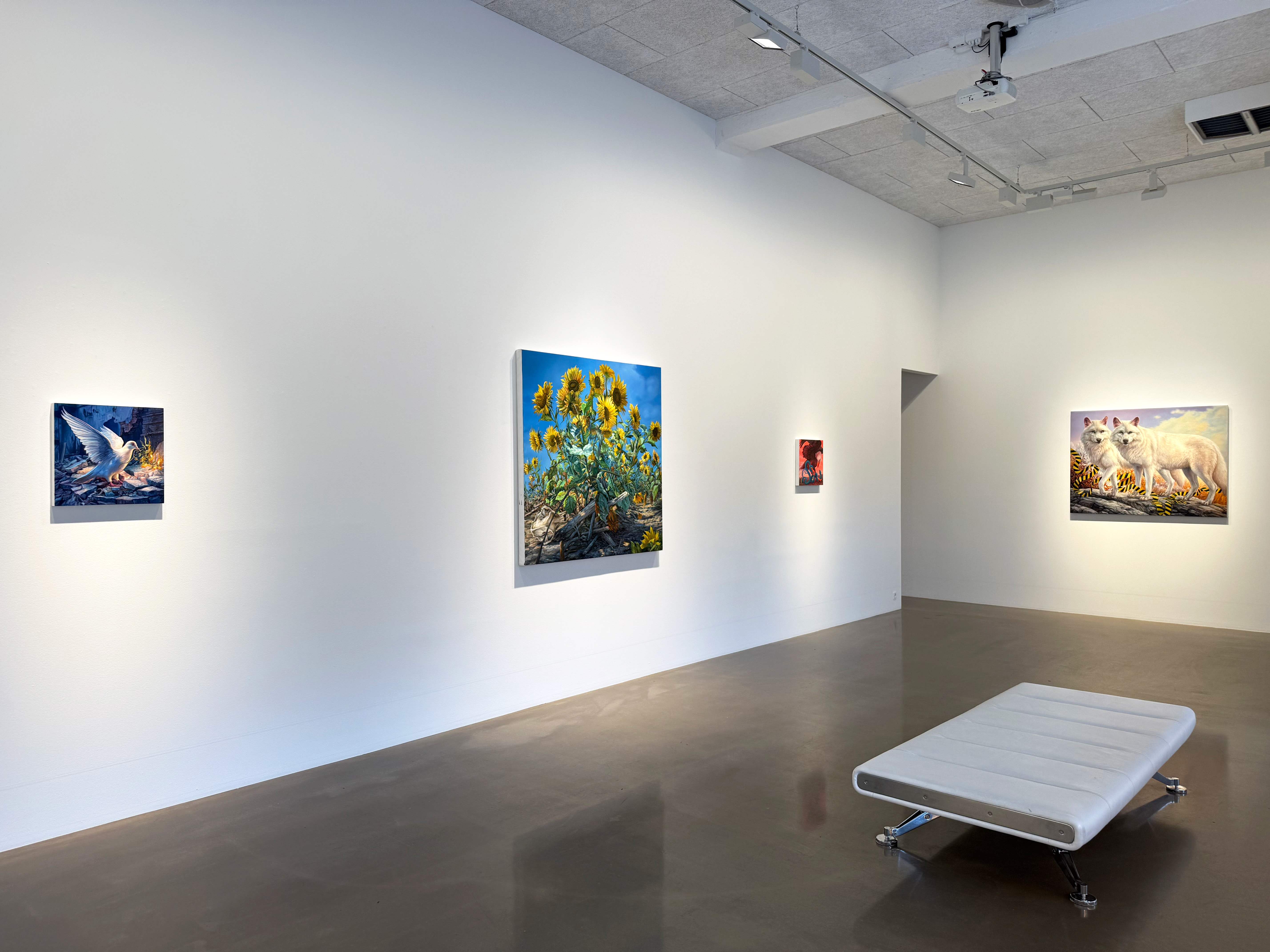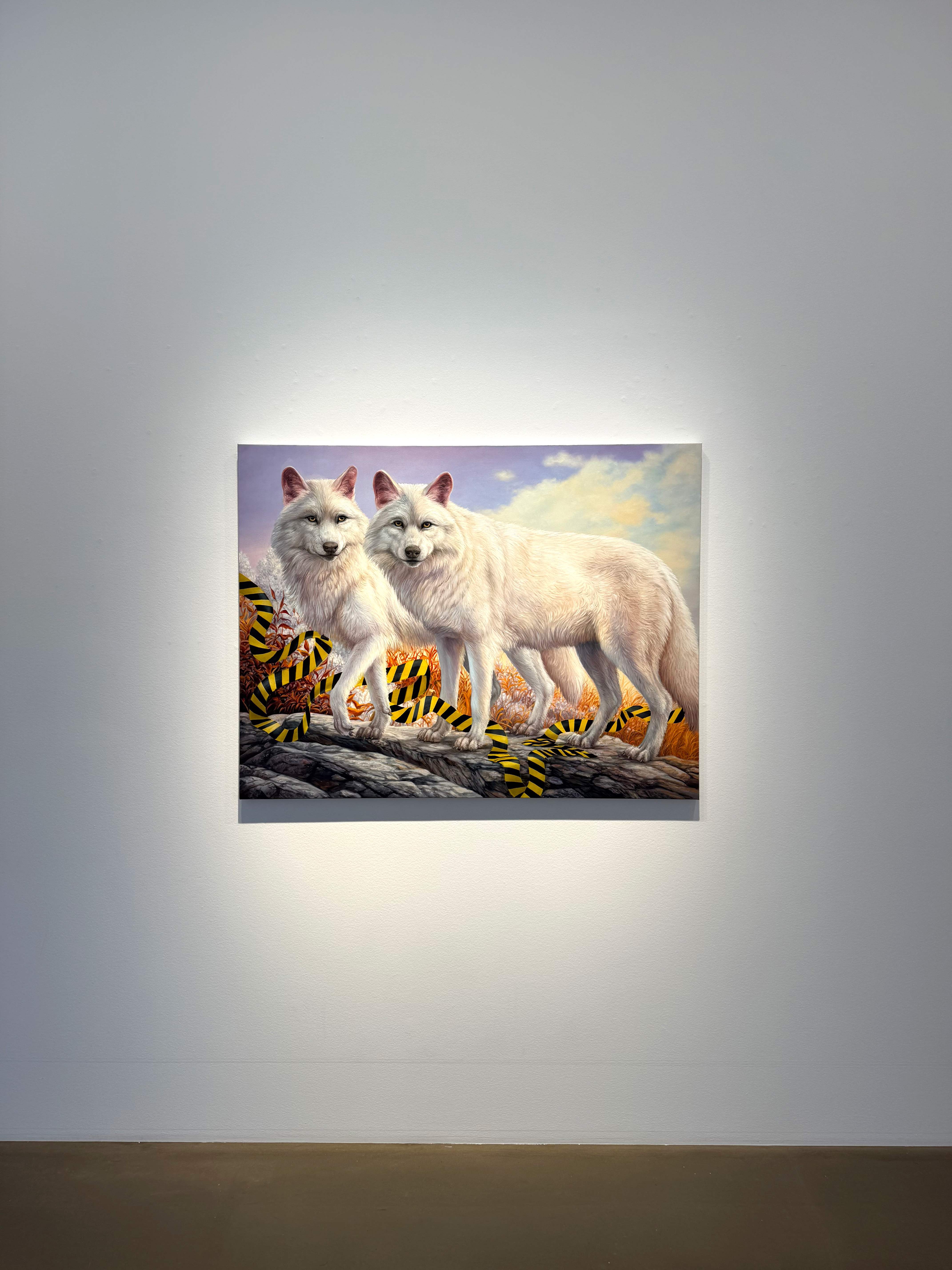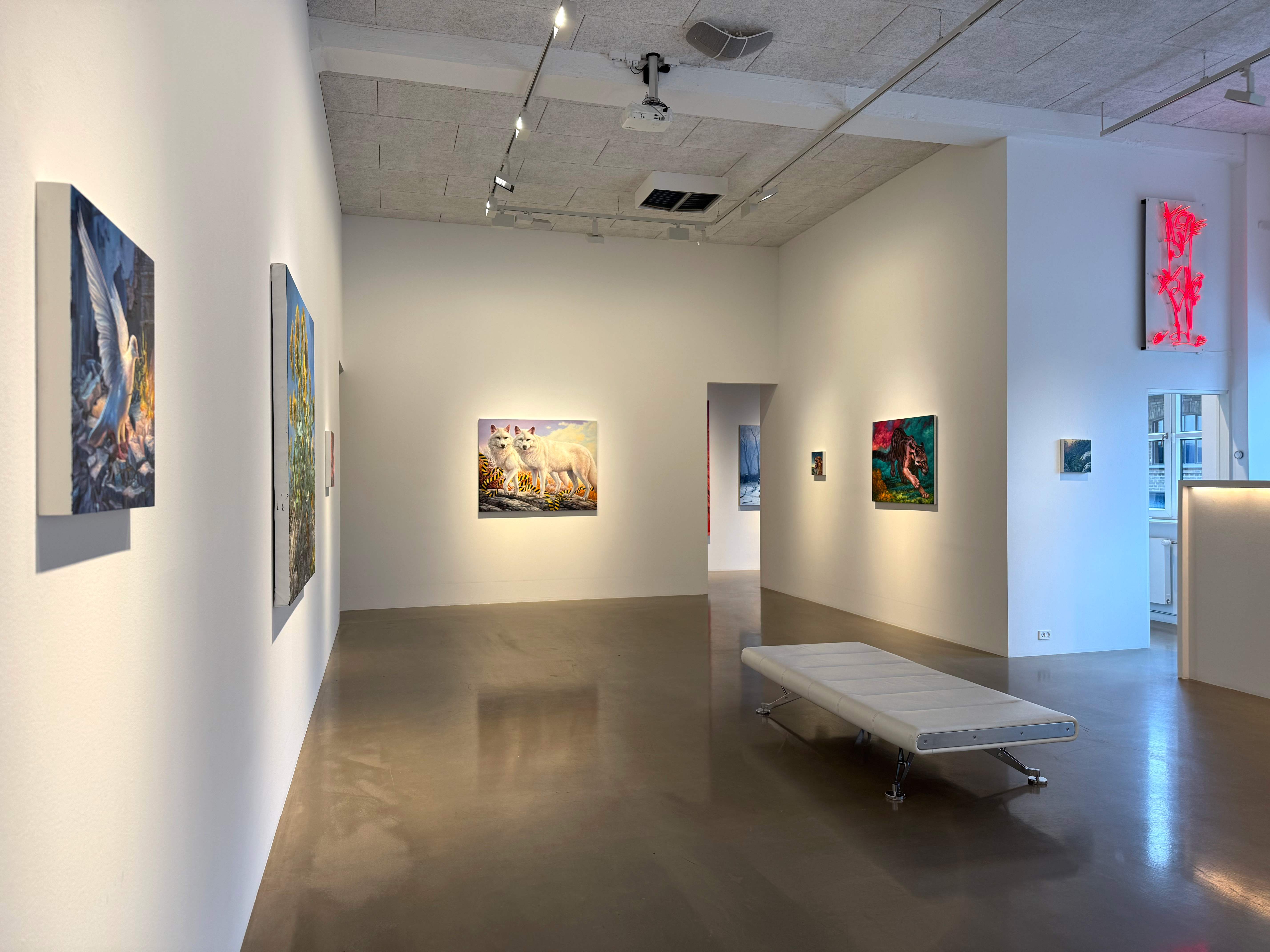 Absolute Elsewhere is Angela Gram’s fourth solo exhibition at Gallery Poulsen. In this new series of paintings, she explores some of the most radical scientific experiments of our time, shifting global power structures, and climate change, expressed through the symbolic language of nature and wild animals.