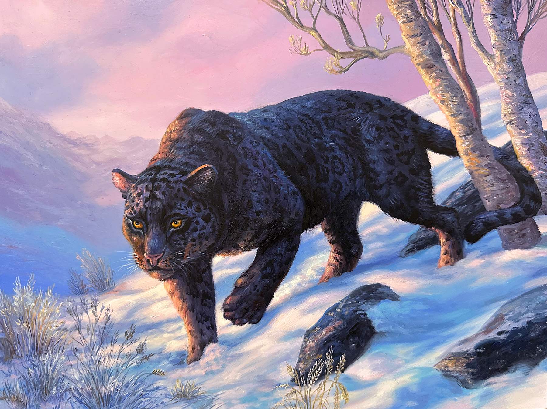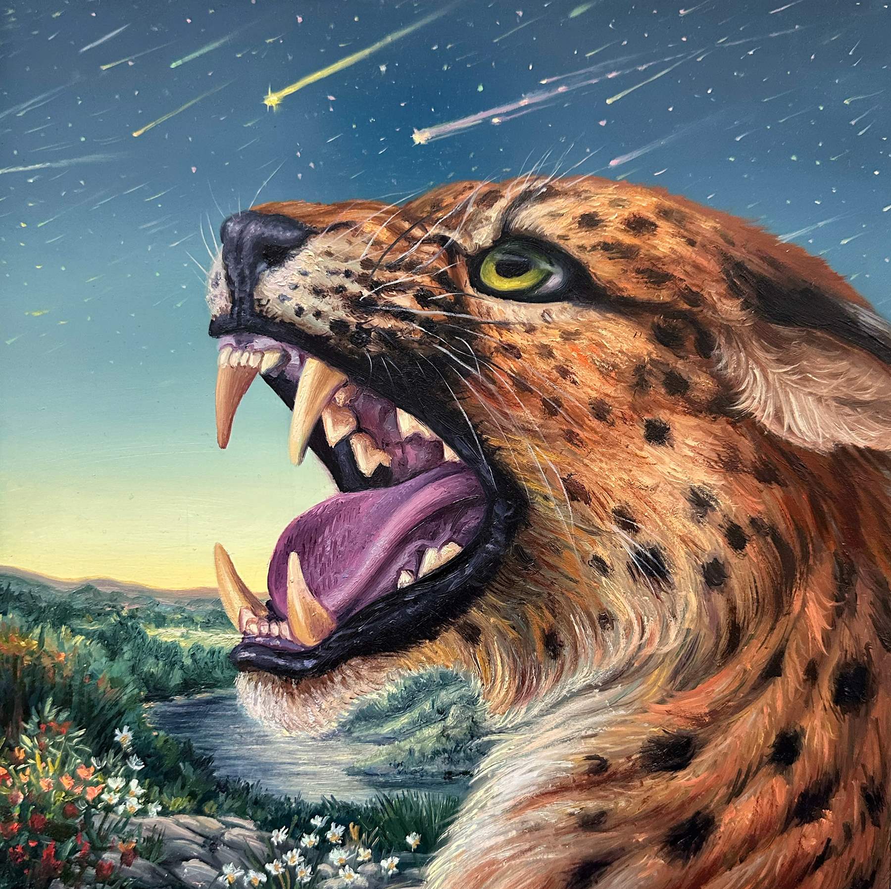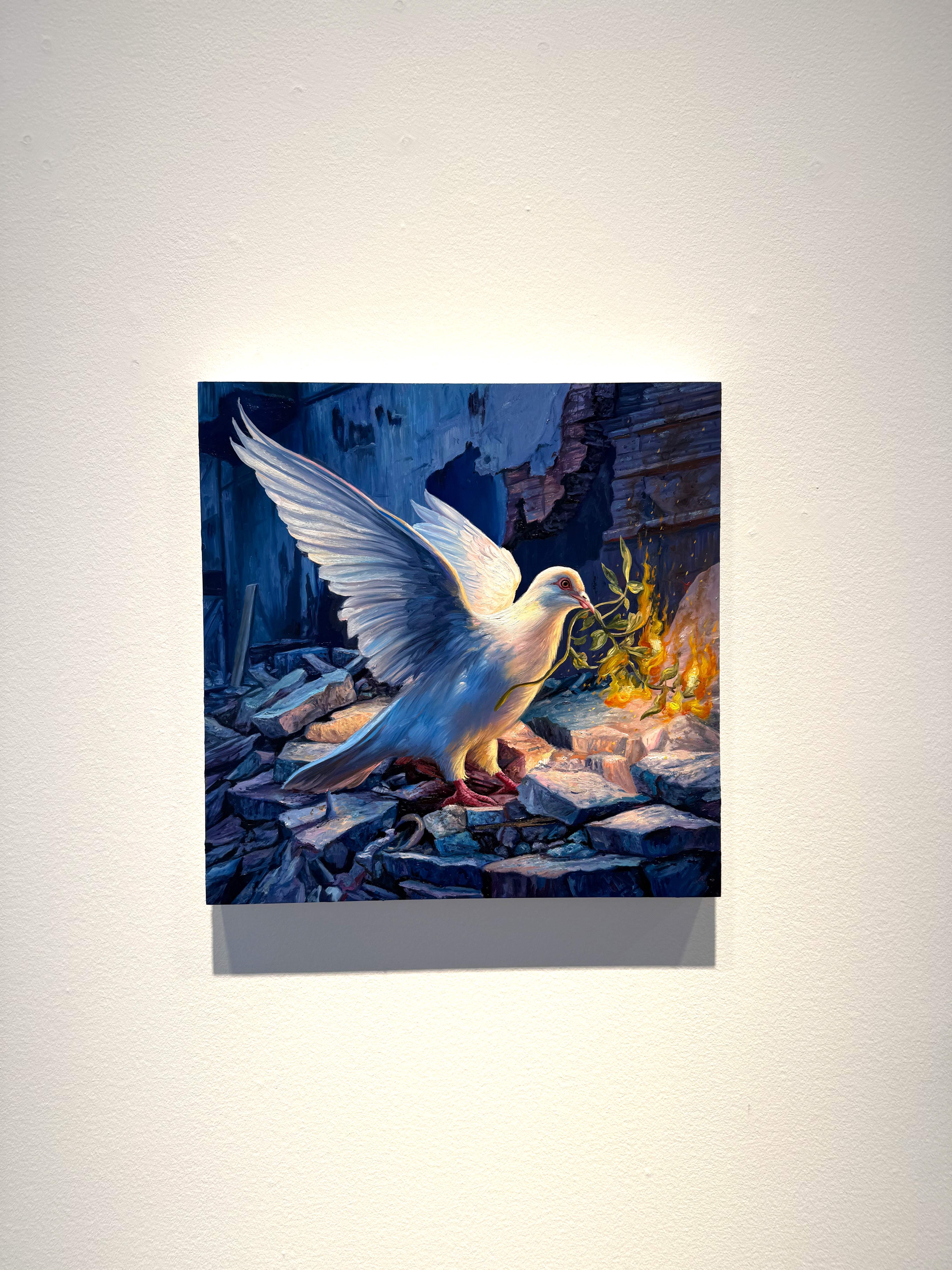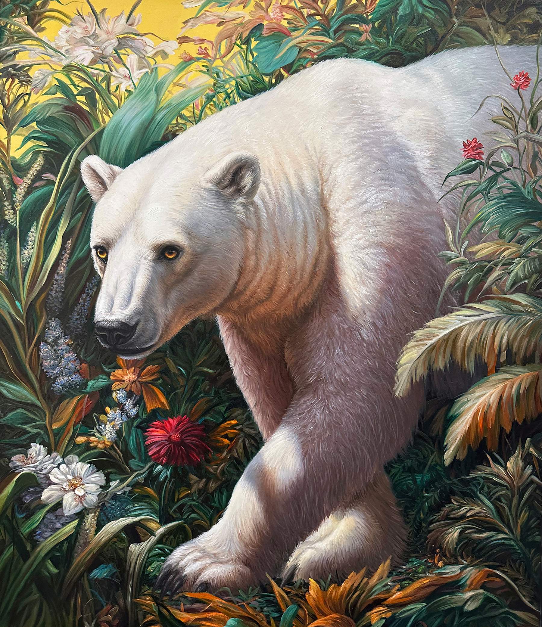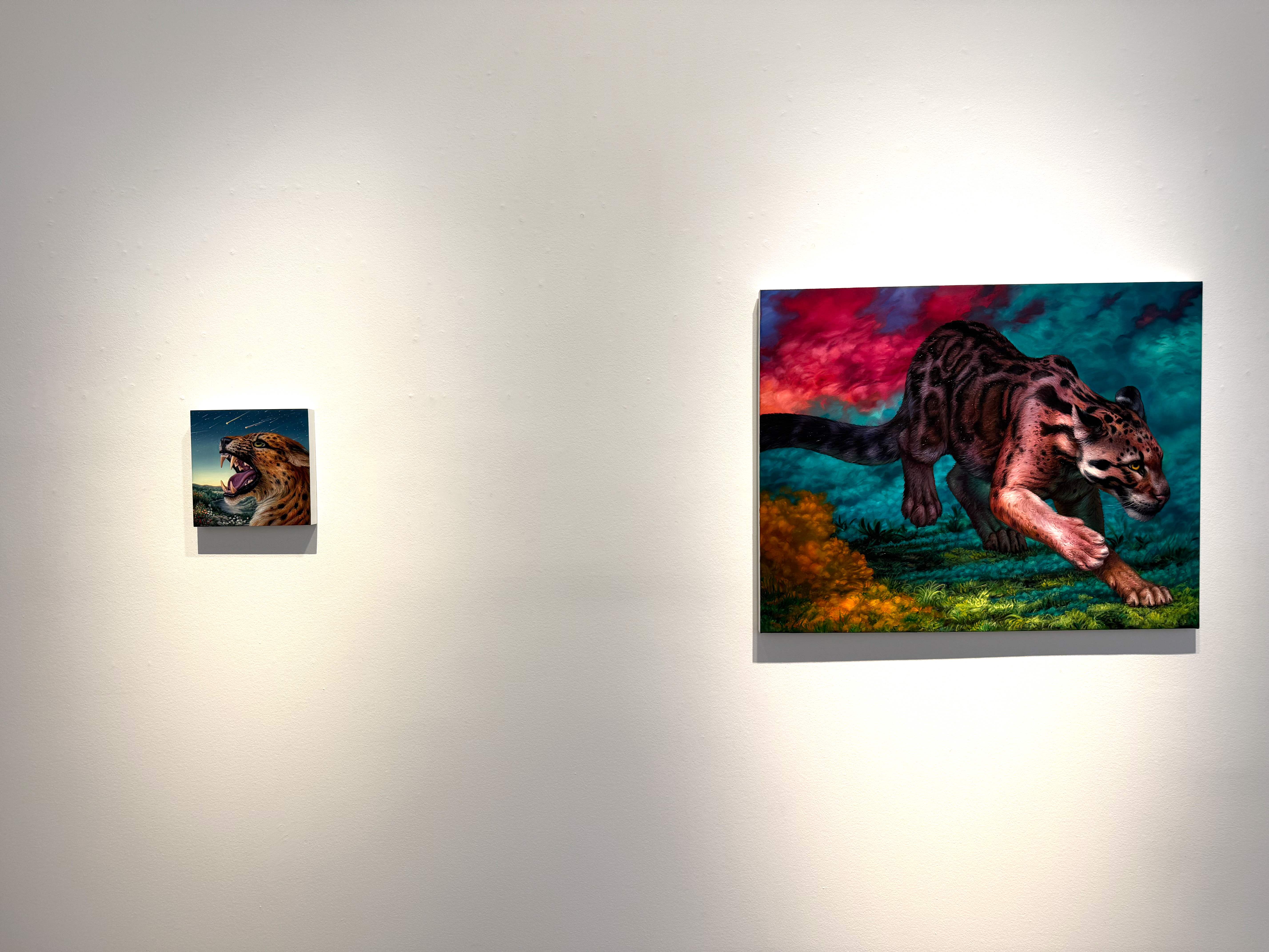 Absolute Elsewhere is Angela Gram’s fourth solo exhibition at Gallery Poulsen. In this new series of paintings, she explores some of the most radical scientific experiments of our time, shifting global power structures, and climate change, expressed through the symbolic language of nature and wild animals.