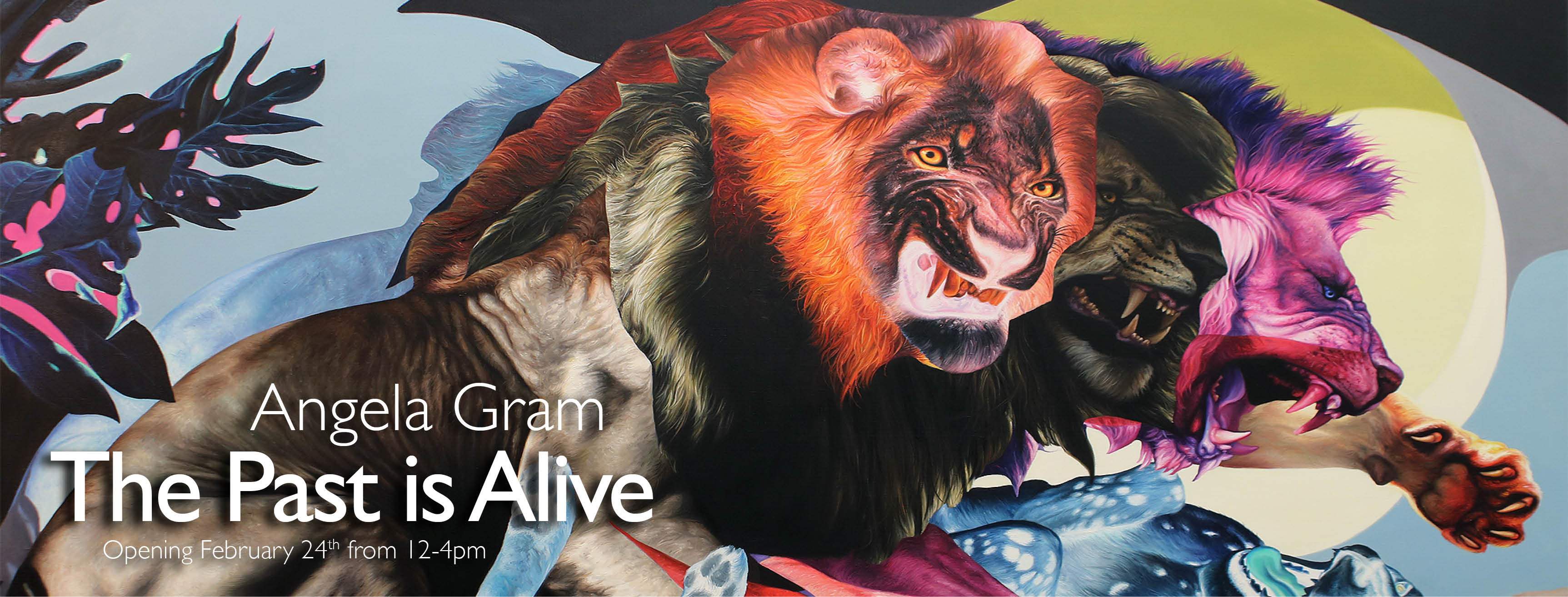 ”The Past is Alive” viser værk for værk Angela Grams vedvarende fascination af det uhyrligt surrealistiske, der kommer til udtryk gennem hendes dekonstruerede dyrerige, hvor hver enkelte vilde skabning fremstilles som splittede, irrationelle, kaotiske væsner, der i deres fragmenterede tilstand, fuldstændigt blottes for identitet. Hun udfordrer vores gængse opfattelse af naturens verden ved at sønderrive den og lade vores egen bevidsthed stykke en ny helhed sammen, brik for brik af genkendelige elementer.