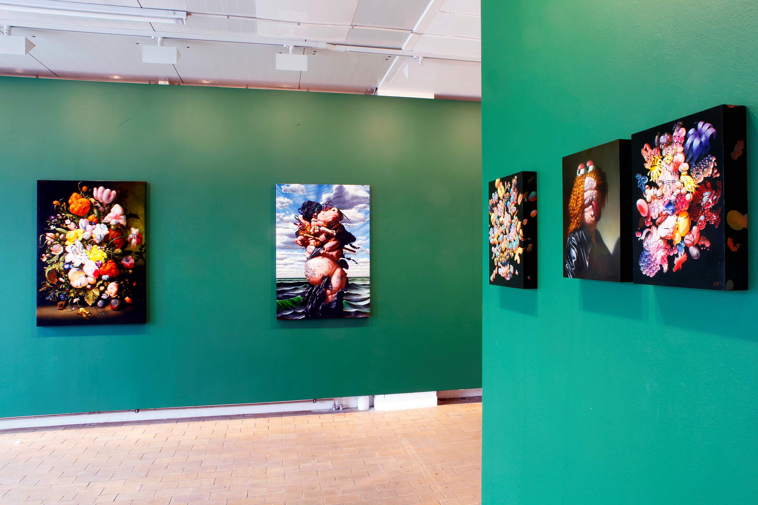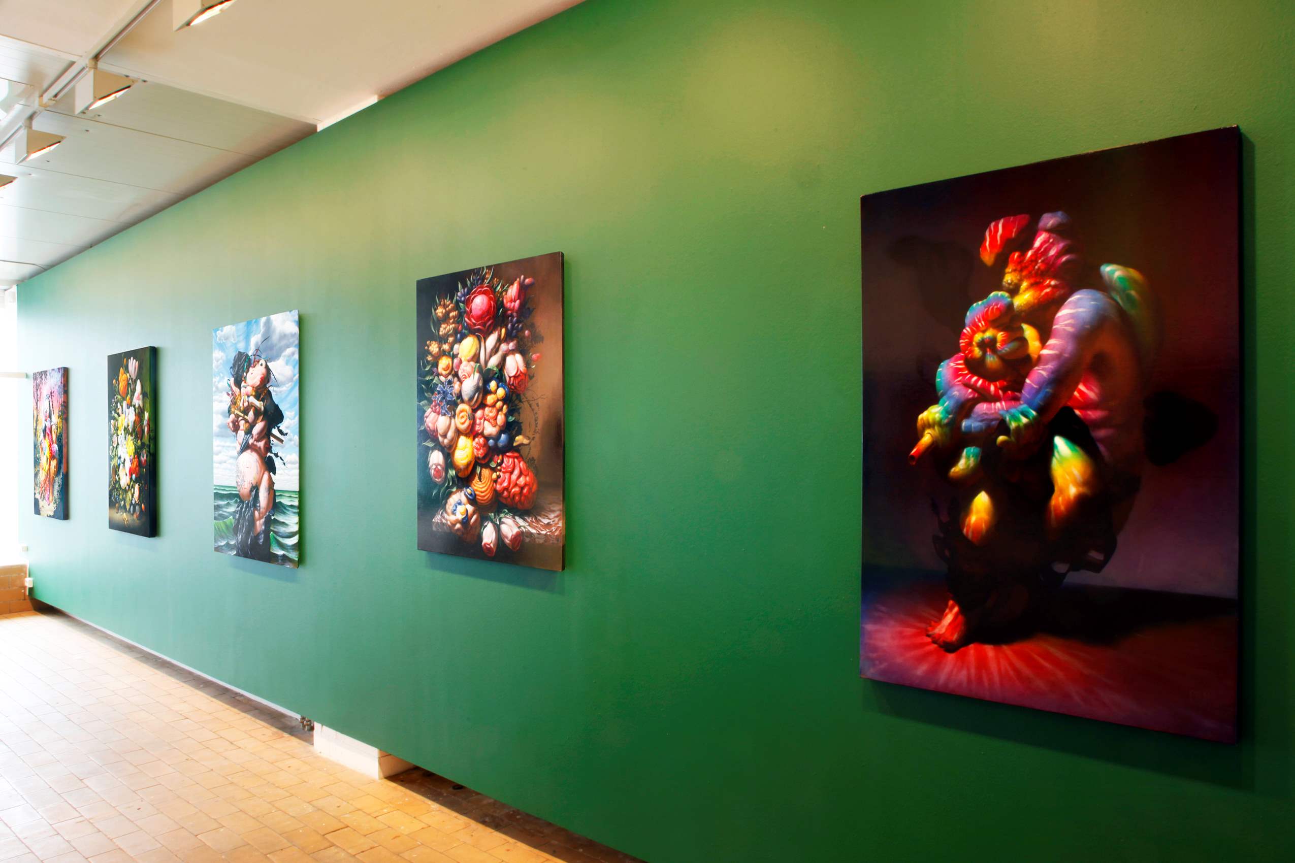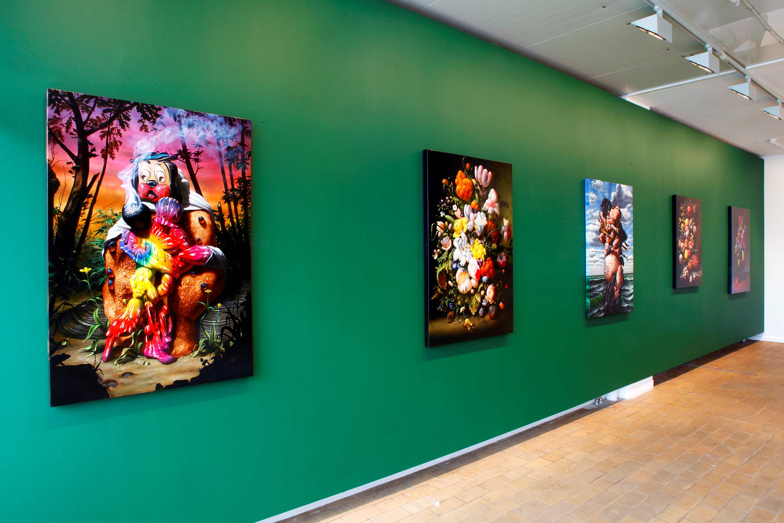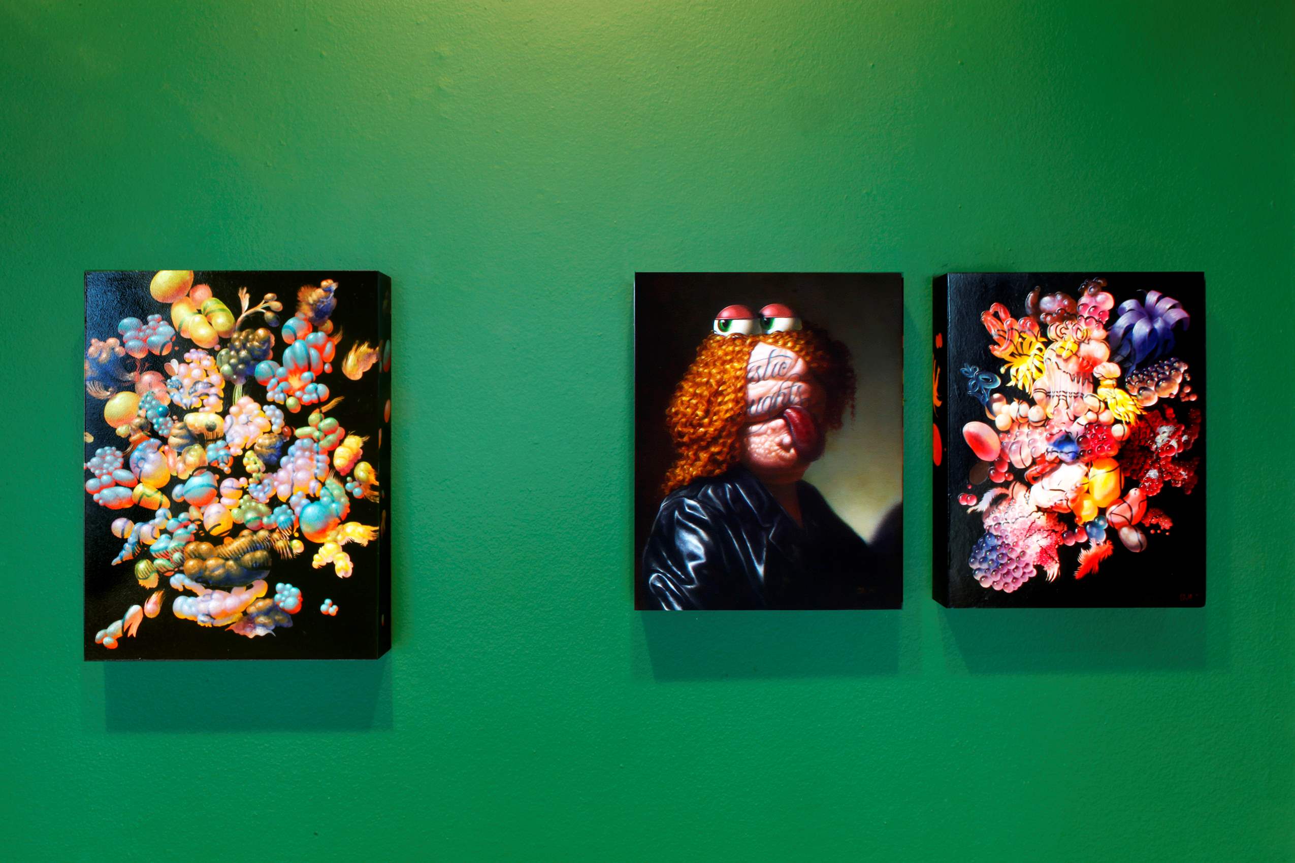 The works in this exhibit depict grotesque portraits tattooed with a matrix of old and new tattoos, psychedelic patterns draped over mutated and chimeric forms, and hidden drawings embedded within the flowers of a still-life: images that present confusions of truth within the layers of paint; the mask and the face; psychedelia and psychosis; the cancer and the body; cultural inclusivity and assimilation; profundity and the absurd.