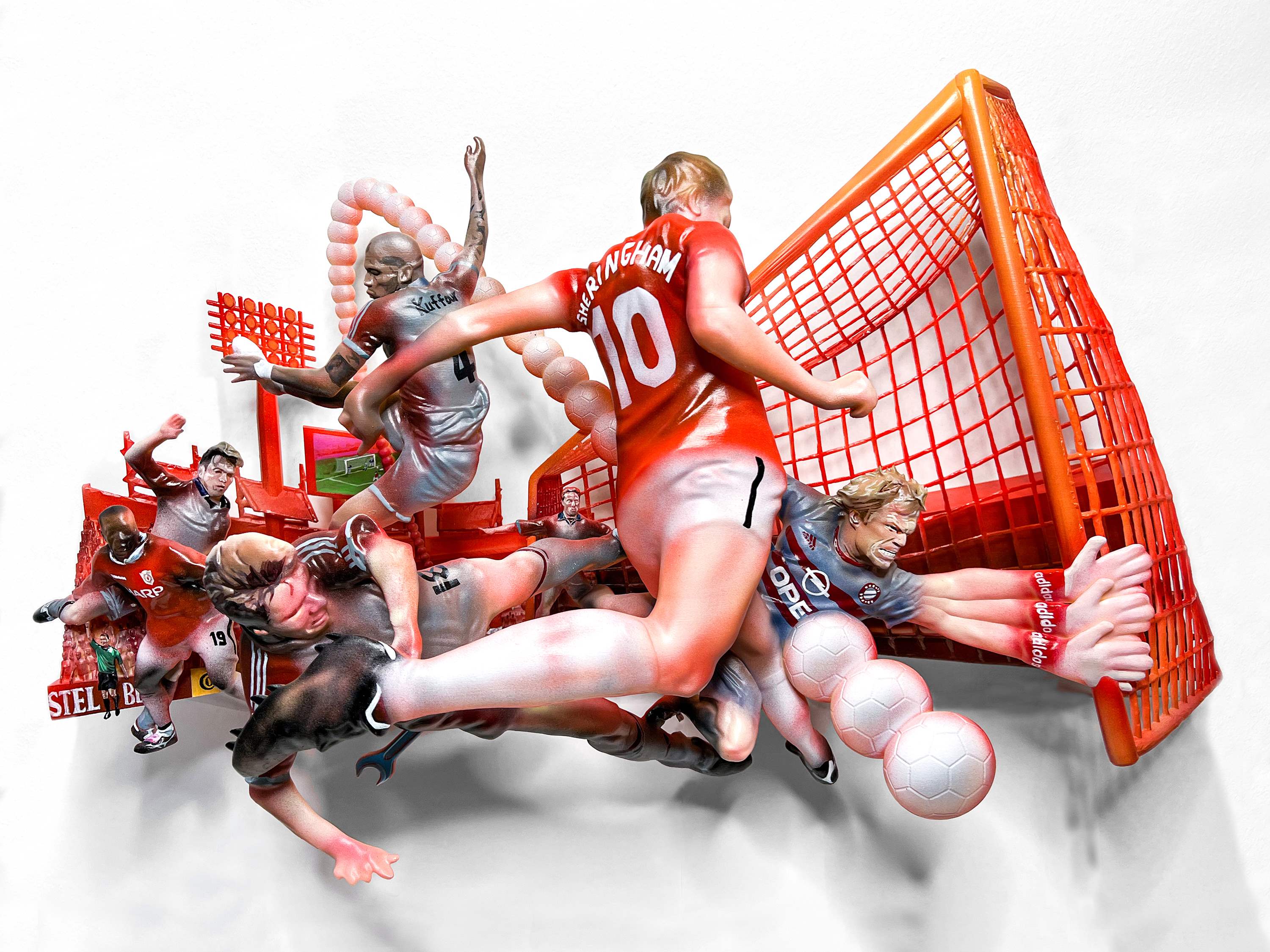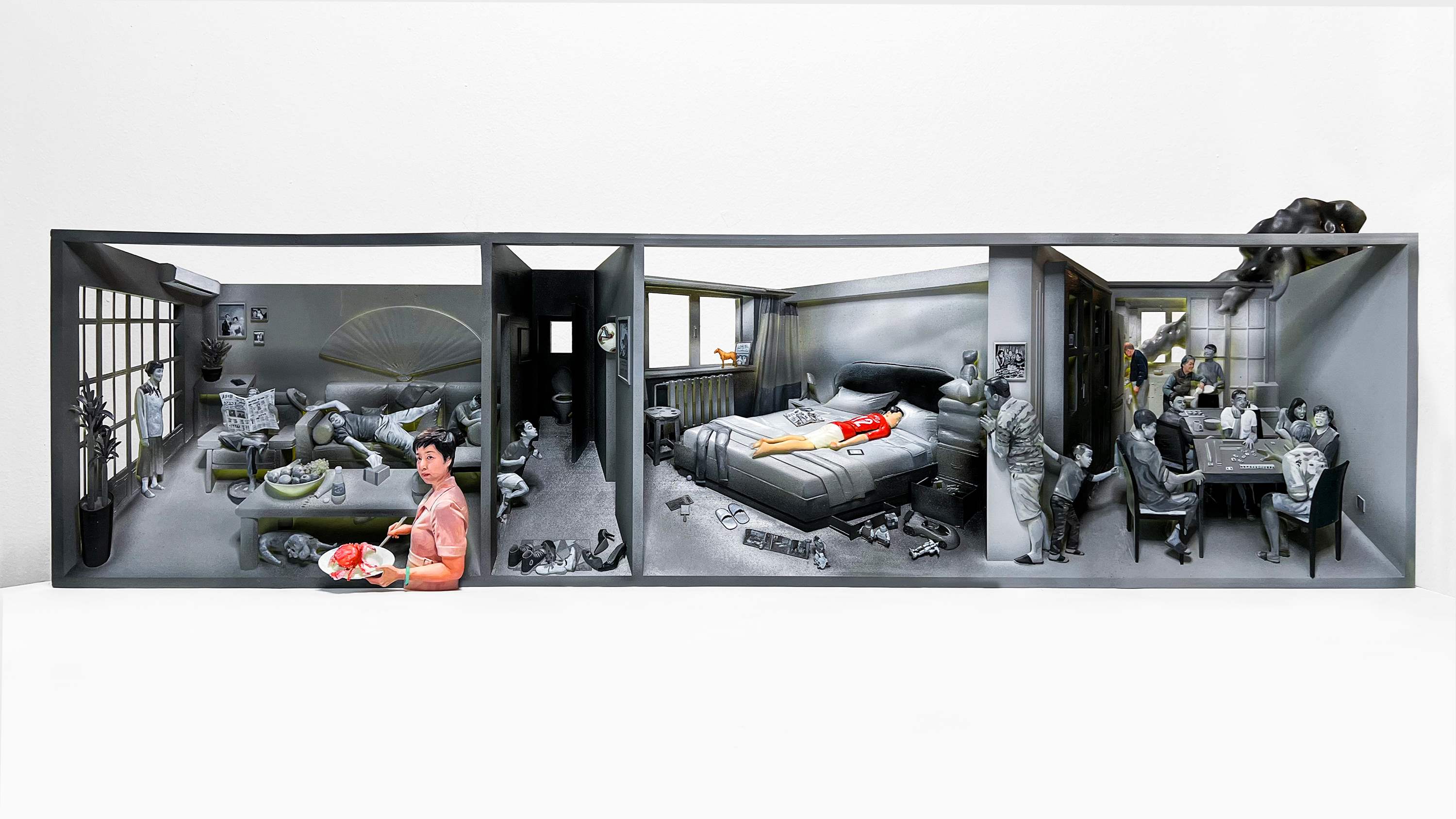 There are also works in Jiannan Wu’s newest collection of relief sculptures that tell more intimate and personal stories. The sculpture “Adolescence” presents a story about family relations in Jiannan’s own formative years. Centrally in the relief Jiannan Wu has portrayed himself as an adolescent, on the left and right side are representations of his mother’s and father’s different heritages and family dynamics. The young artist in the center of the rectangular relief sculpture doesn’t belong to either side, which conveys an unmistakable sensation of loneliness and intimacy. Even though the relief sculpture tells a very specific and personal story, it still succeeds in conveying universal feelings of being caught in the middle of two radically different sides who are both trying to pull the individual in their direction which leaves the individual in a crisis of identity.
