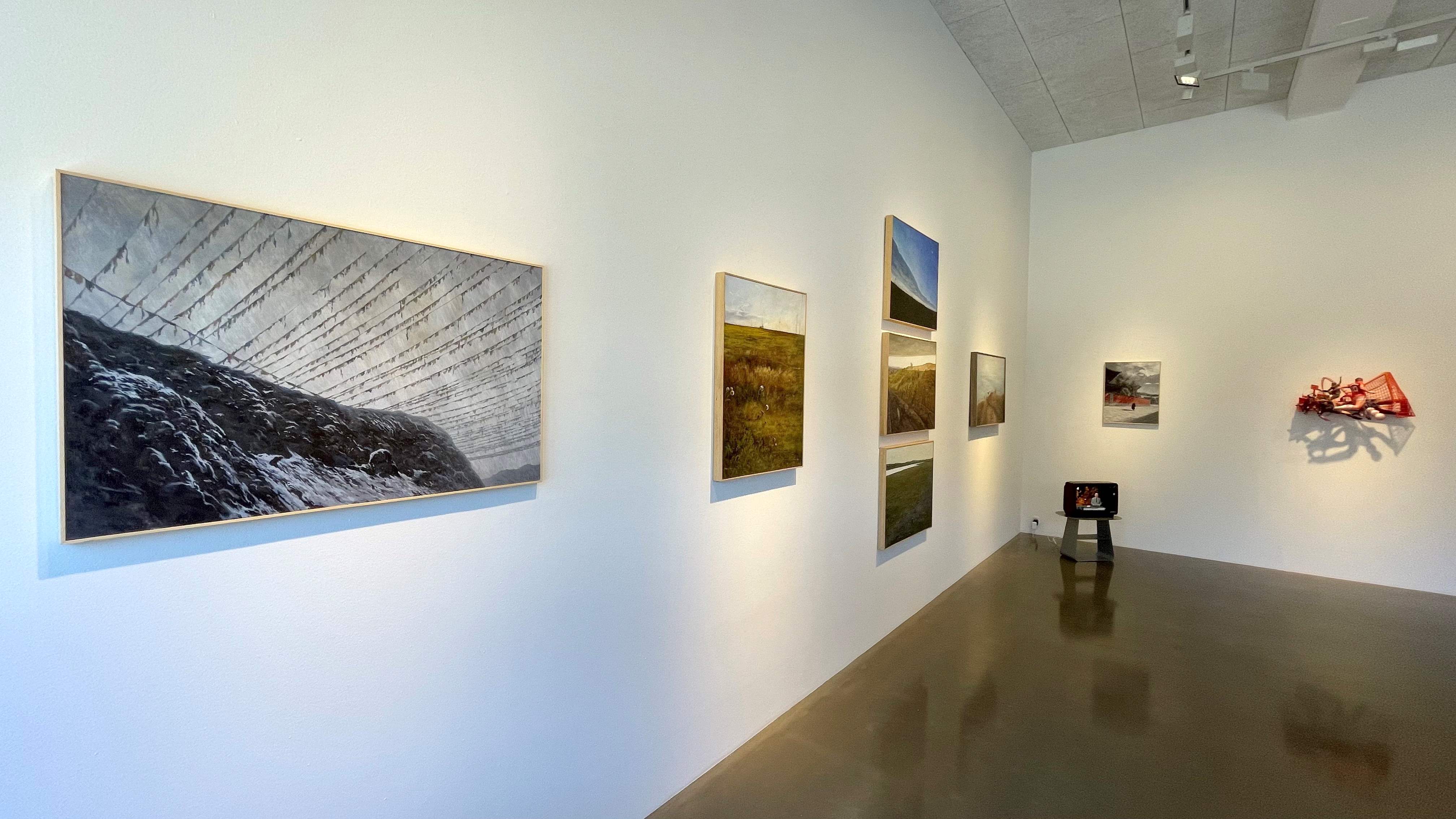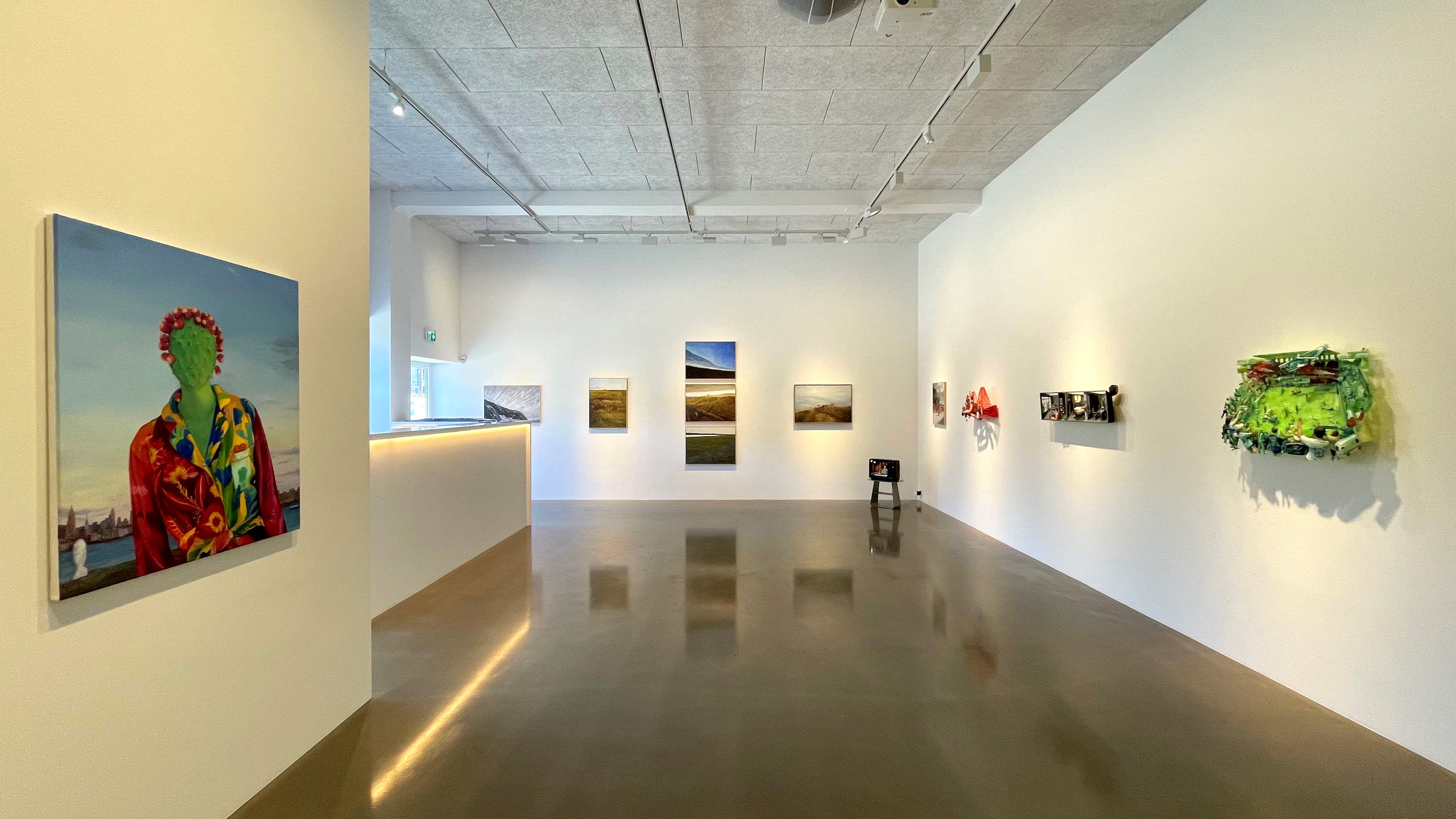 The exhibition presents oil and tempera paintings and relief sculptures in resin and acrylic paint