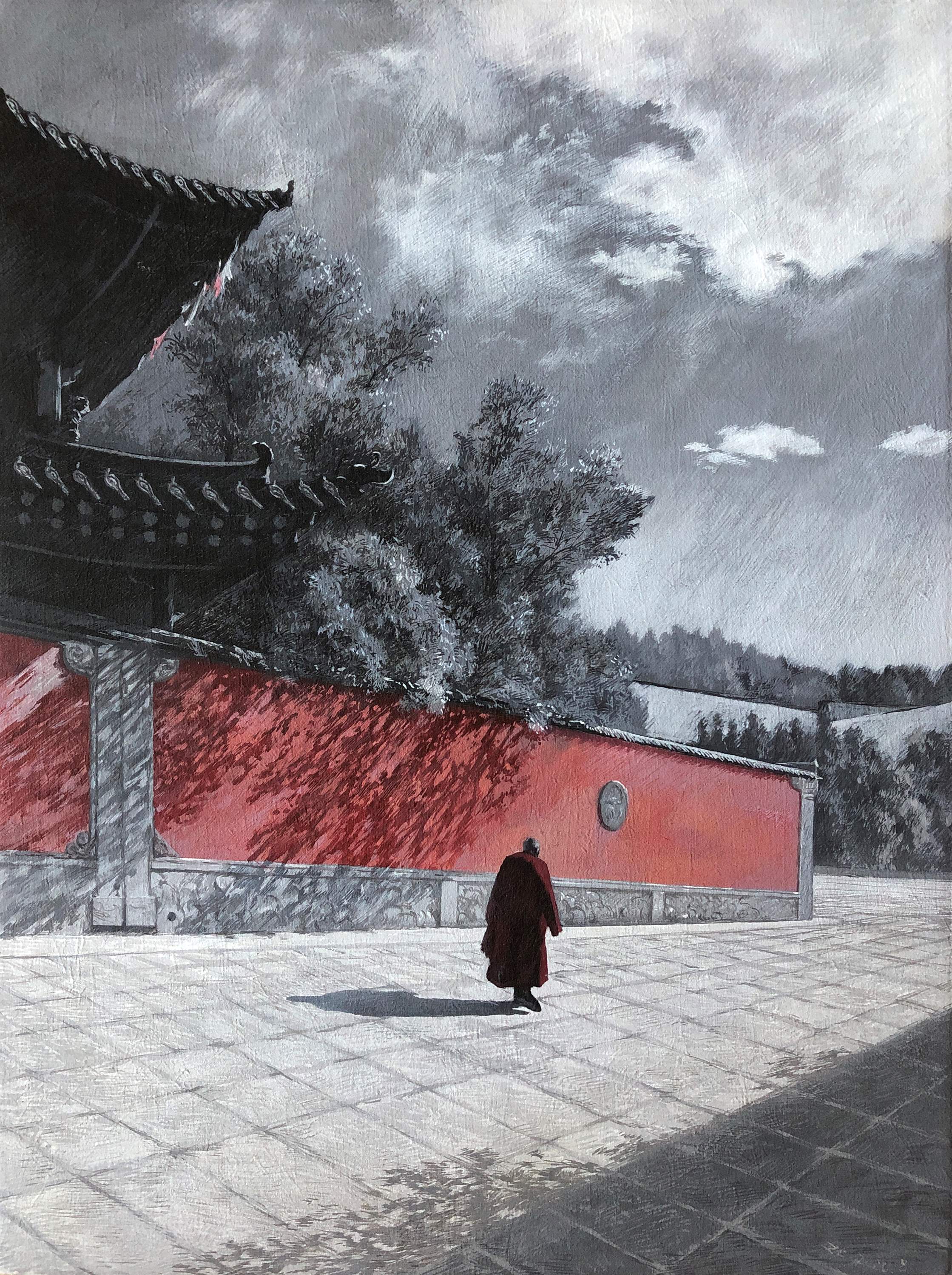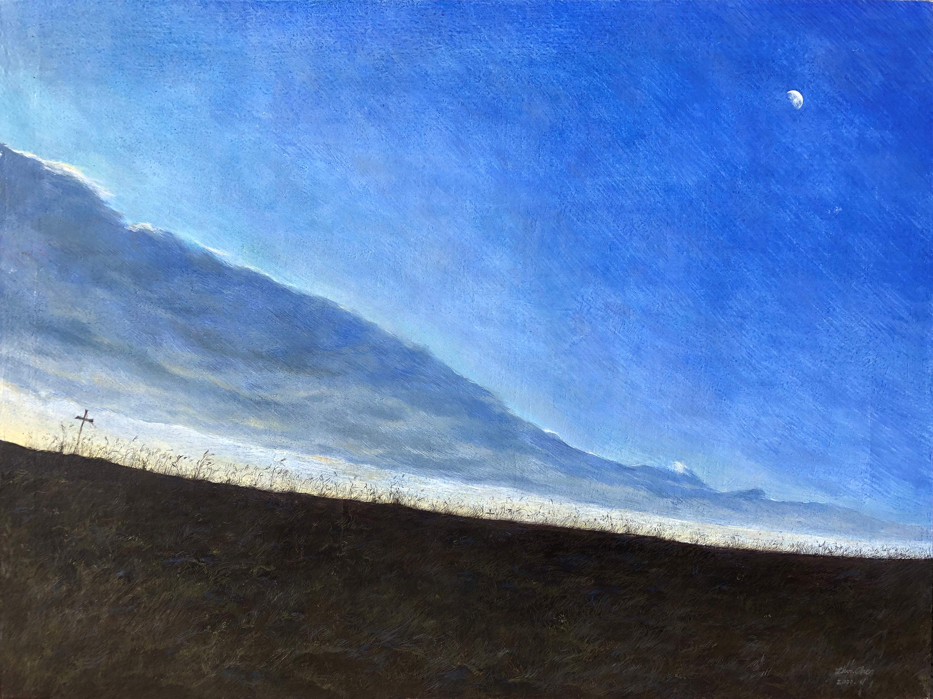Zhou Chen’s painting “Follow Light” depicts a lone cross placed on top of a grass-clad hill with a dynamic and colorful twilight sky weighing down on the landscape. This scene expresses the sublimity of the wild nature in this area of China, completely empty of people. To convey these feelings, Zhou Chen has chosen tempera as his preferred medium. The characteristics of this specific technique are especially compatible with the presented themes and gives Zhou Chen the opportunity to reinforce his project and to “weave” his inner world layer by layer.
