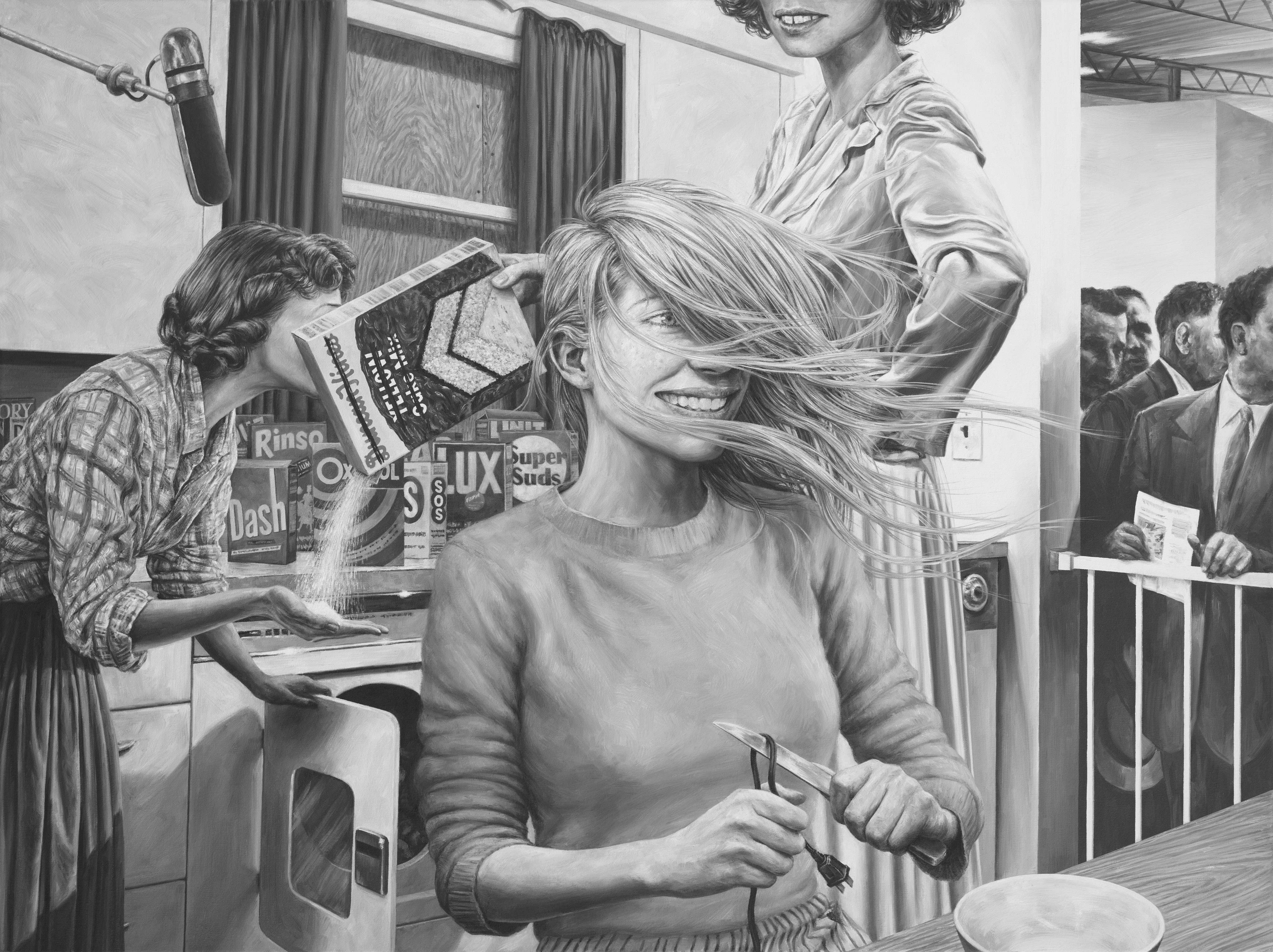 The works possess a surreal quality rooted in realism, which grounds the pictures and solidifies the internal dream logic. They also share a depiction of women as a central thematic constant. These women are idealized or anonymized, either free of literal place and time, or stuck in particular and somehow all-too-familiar phantasmagoric locales. Disquieting humor runs throughout the incidental interactions between these dysmorphic personalities, and the viewer is left to create their own personal narrative from divergent snippets of reality, culled into a cohesive fantasy/nightmare from which we don't want to awaken.