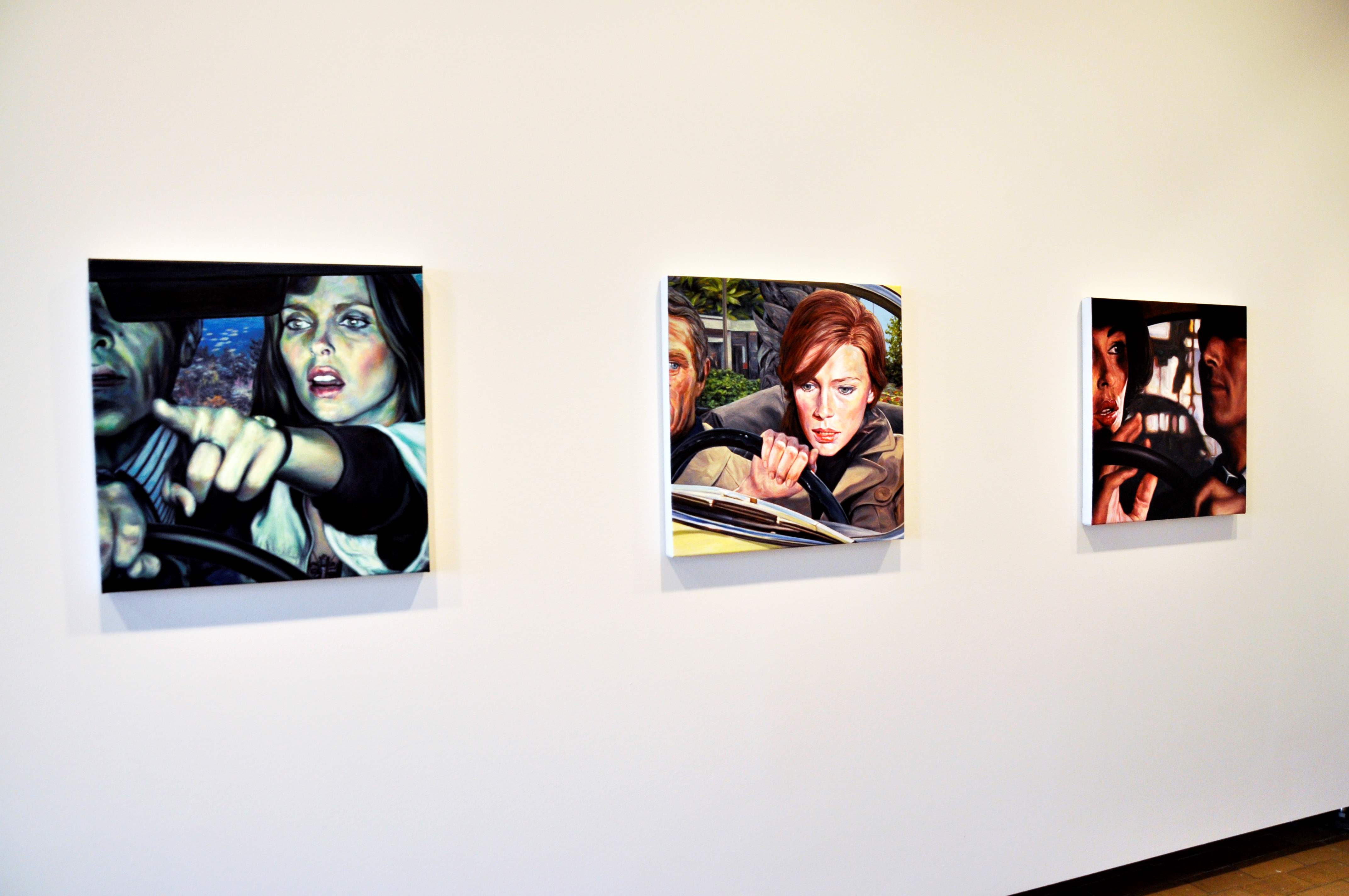 Eric White's expertly rendered oil paintings seduce our eye and pull us in. Like the car accident we have to slow down for, we are voyeurs to his bizarre imagination. We peer into a cranial peephole to see beautiful protagonists awkwardly engaging in paranoid psychological melodramas in a landscape made up of indeterminate yet recognizable fragments which exude the distinct odor of a decaying Americana. The use of appropriated film imagery serves to symbolize an invented and idealized “reality,” and combined with other random components create complex and claustrophobic scenarios which examine dysfunctional relationship, buried emotion, and the finite boundaries of human perception.