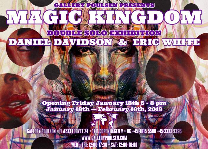 Gallery Poulsen starter kunståret 2013 op med Daniel Davidson og Eric Whites dobbeltudstilling “Magic Kingdom.” Udstillingens titel hentyder til det drømmelandskab, der er koreograferet og iscenesat i malerierne og tegningerne. Kunstnerne er inviteret til at udstille efter at vi så deres værk i New York, da de i tråd med galleriets profil skaber kunstværker der er af højeste kunstneriske kvalitet og visuelt udfordrende med et satirisk bid.