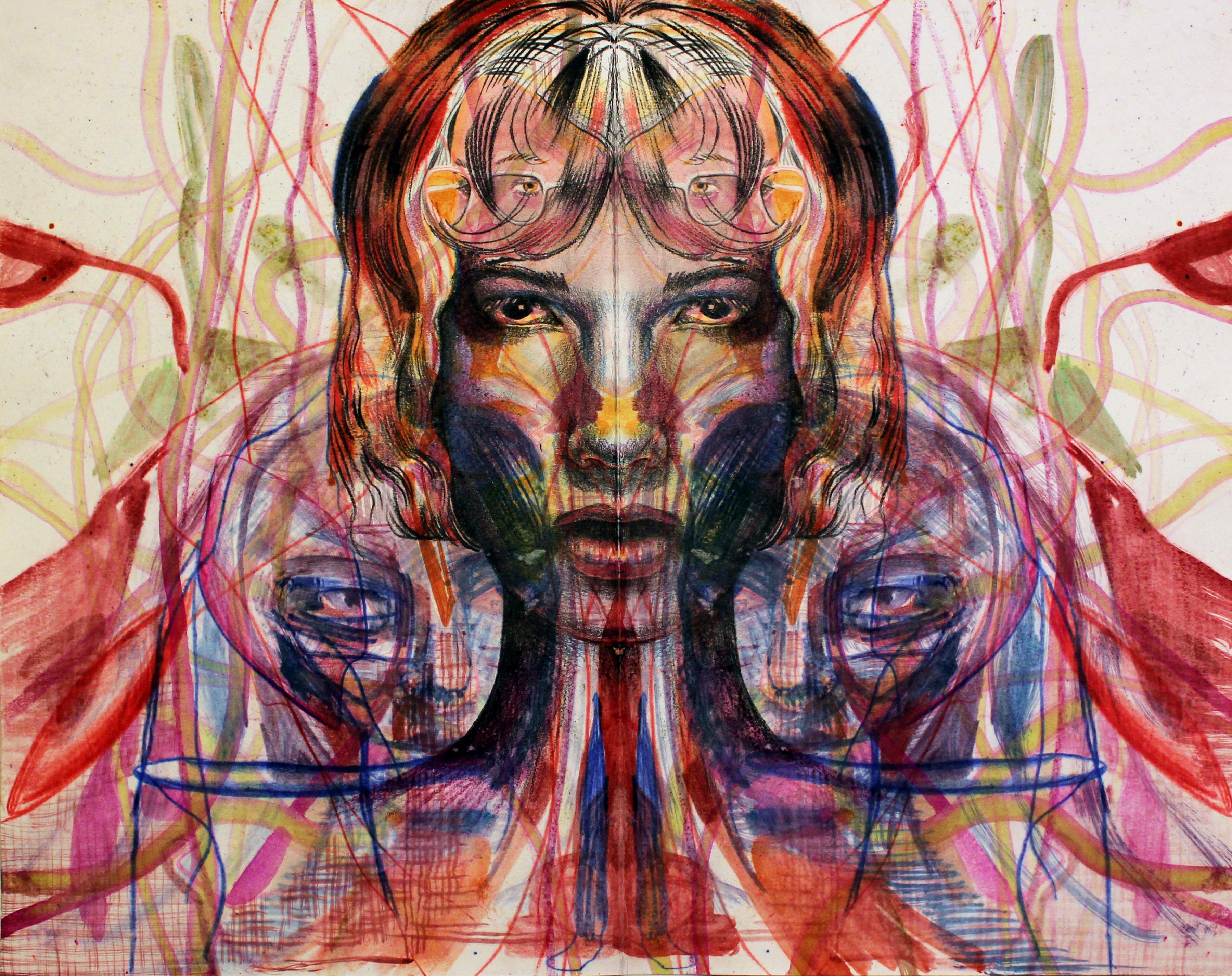 Daniel Davidson's works in "Magic Kingdom" display figuration and abstraction as twin protagonists spilling into a spontaneous mirroring field, where the initial gesture of an ink blot or an accidental scratch can open out and transform into a tangled architecture of faces, dizzying designs, and vibrant color. Davidson approaches his drawings by working directly on selected portions of the paper, often opposing faces with abstract forms on differing sides, then wetting the paper and making numerous folds to produce symmetrical transfers and unexpected new images—a process that results in something akin to a hallucinatory Rorschach test, a Gysin/Burroughs visual cut-up/fold-up experiment, or the remnants of some wildly disorienting dada parlor game.