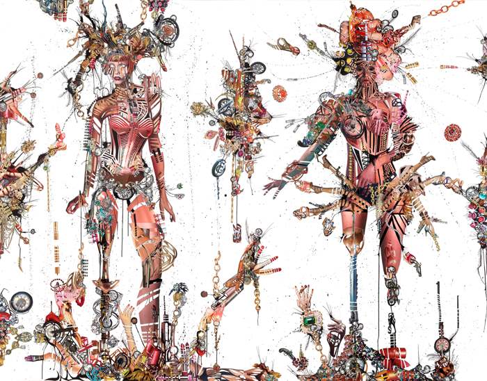 At a time when we are bombarded daily with the impossible task of filtering and decoding an onslaught of visual information from every social and material facet of our lives, Debra Hampton’s frenetic collages seem the perfect fusion of creative output and cultural commentary. Her subjects, meticulously assembled from thousands of cut-up advertisements, capture the conceptual and literal essence of a frenzied and transformative culture on the brink of constant destruction and rebirth.