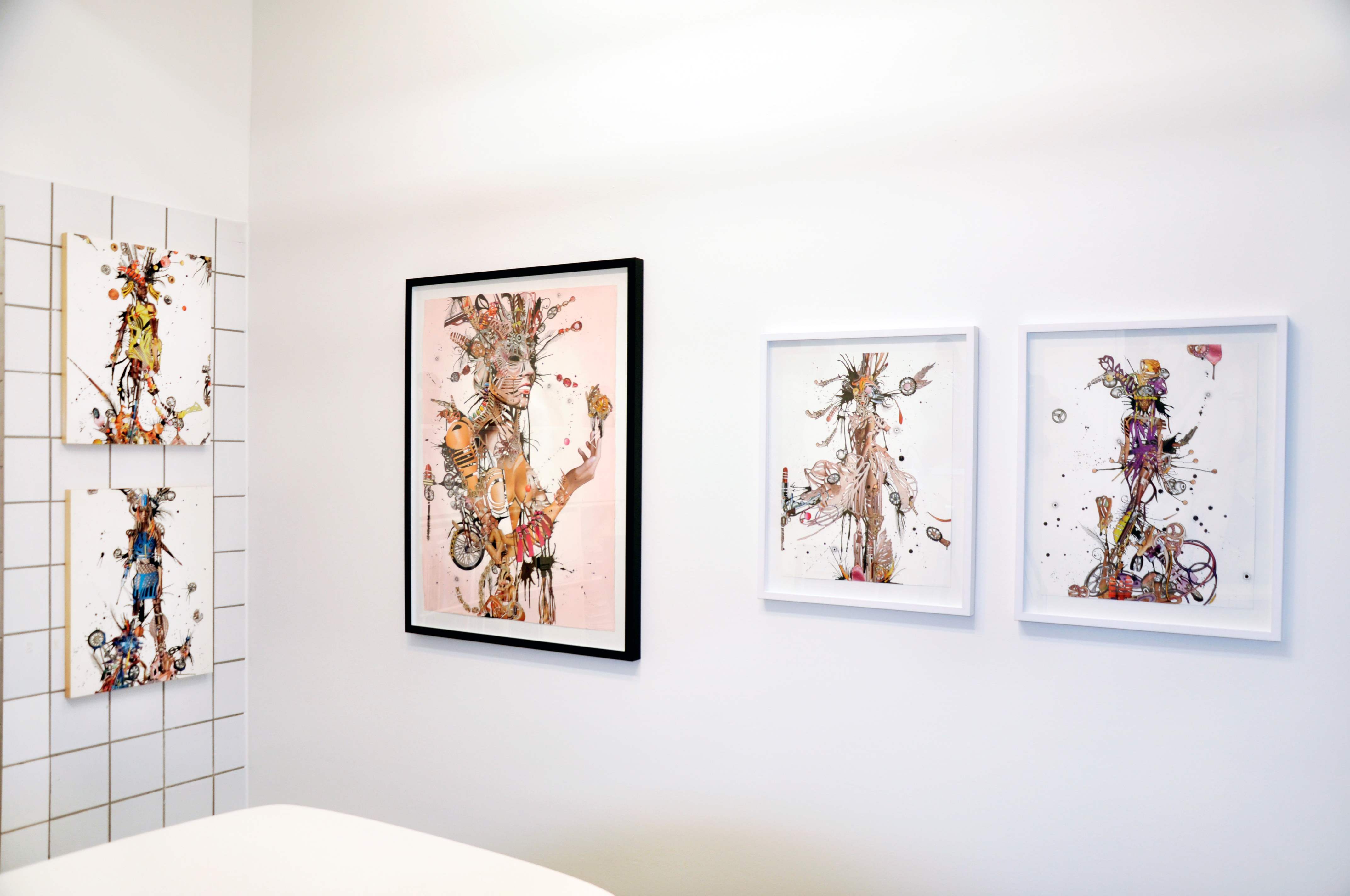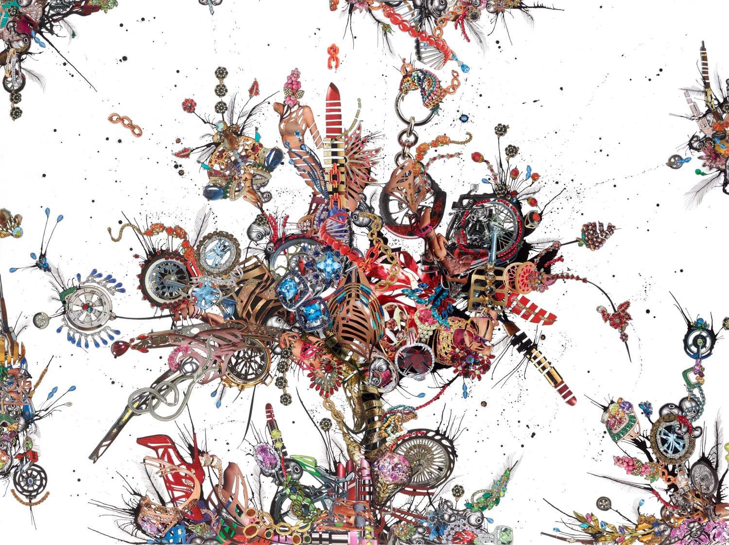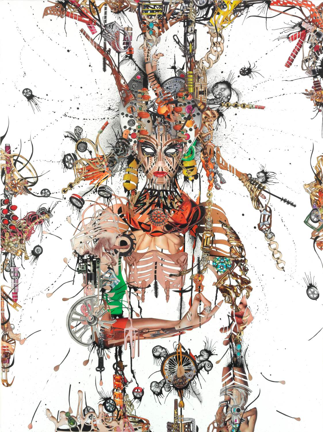 The casual viewer is rewarded with a dizzying selection of symbolic images sliced up almost beyond recognition—dissected beauty products, flying motorcycle wheels, exploding bullets, youthful bodies, wooden rifles, gold chains, splattered ink and hand-drawn organic shapes—while patient appreciation reveals the emotional and conceptual tenor of the juxtapositions. These elements under the scrutiny of Hampton ultimately culminate in lusciously dark and powerful female forms who appear at once heroine and victim of their materialistic obsessions.
