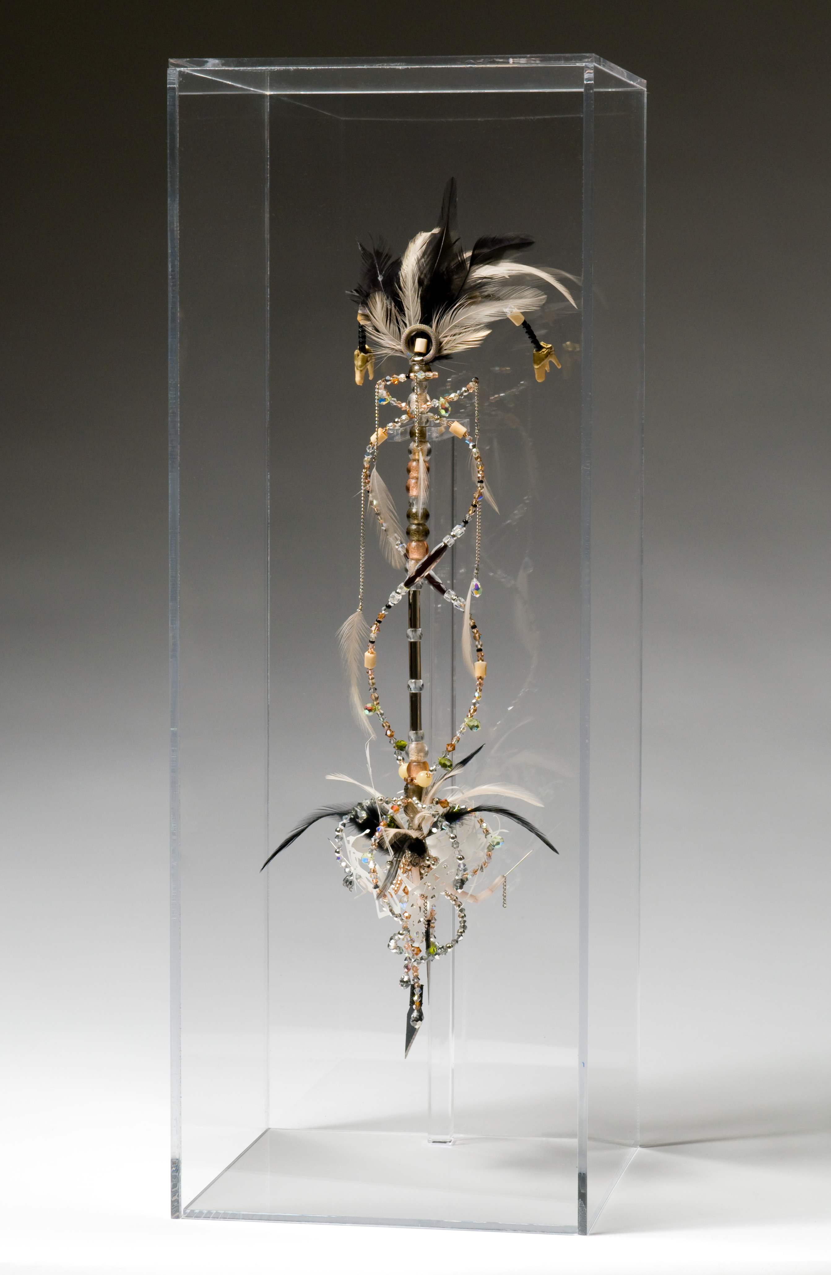 The talisman is a unique, delicate piece which includes luxuriously valuable elements like Swarovski crystals, environmentally and culturally significant objects such as bone and stone beads, and more personal items such as discarded Xacto blades used to create the collages, cut-out backings as well as beads from a necklace worn by the artist’s deceased maternal grandmother.