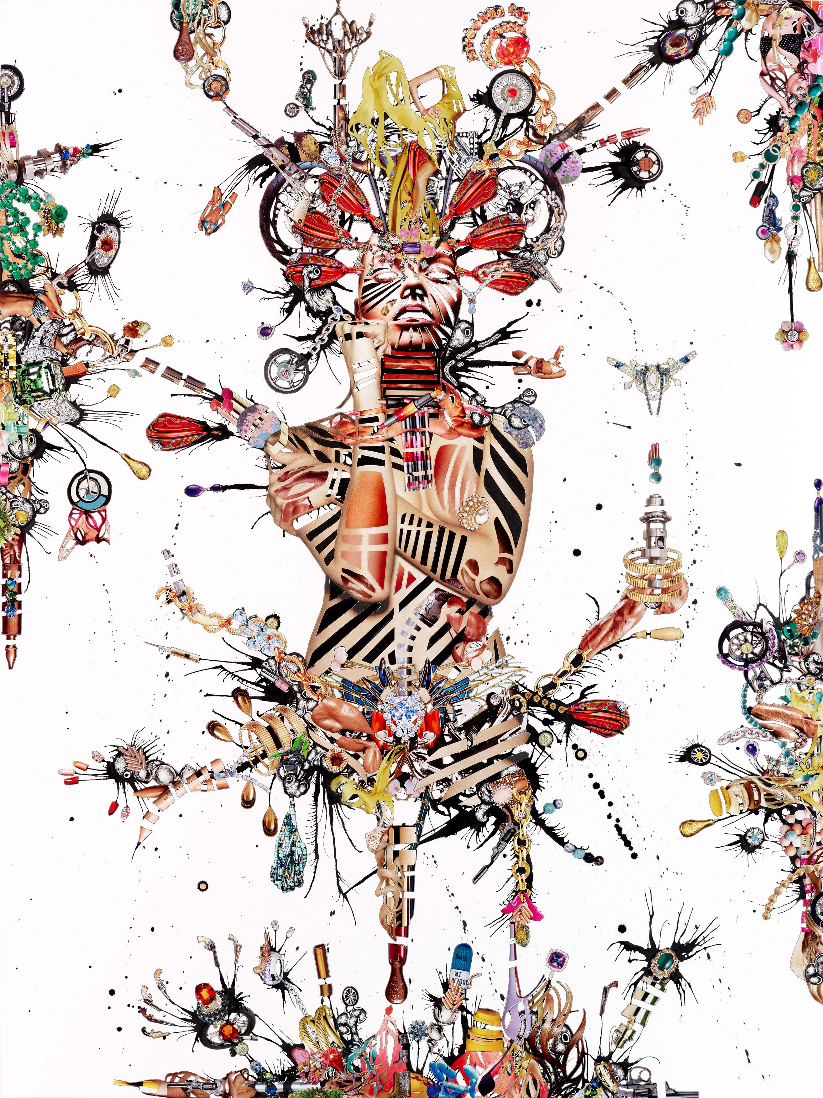 Debra Hampton's work spans various unconventional media and process to investigate issues of commodity, identity and appropriation. She is best known for mixed media, mash-up collage portraits created from 1000s of magazine cutouts, splattered ink, and intricately stippled shapes. Accompanying the portrait series are sculpted objects such as a talisman and a full-size suit of armor.