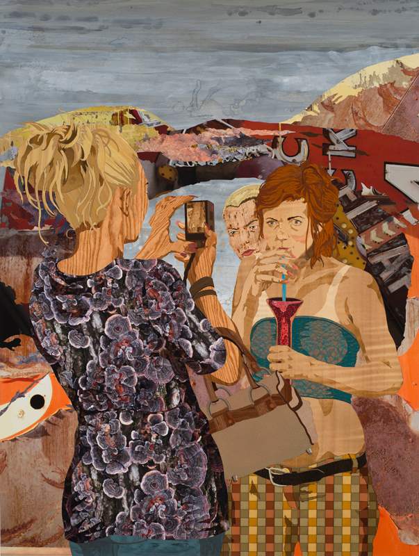 Alison Elizabeth Taylor makes fantastic and impressive works primarily in wood. The work borrows from the technique intarsia (wood inlay), which can be described as a collage of myriads of veneers – a stylized and decorative art form which can be traced all the way back to ancient Egypt. However, in an exciting way, Taylor sends us directly up to present times through her subject of figuration and through her innovative approach to the wood. The works have an intense texture through the wood, and an illusory perspective enabled by adding oil paint. The traditional craft really gets a serious kick in the butt and shows us how detailed, deep, and mesmerizing a painting in wood can be.