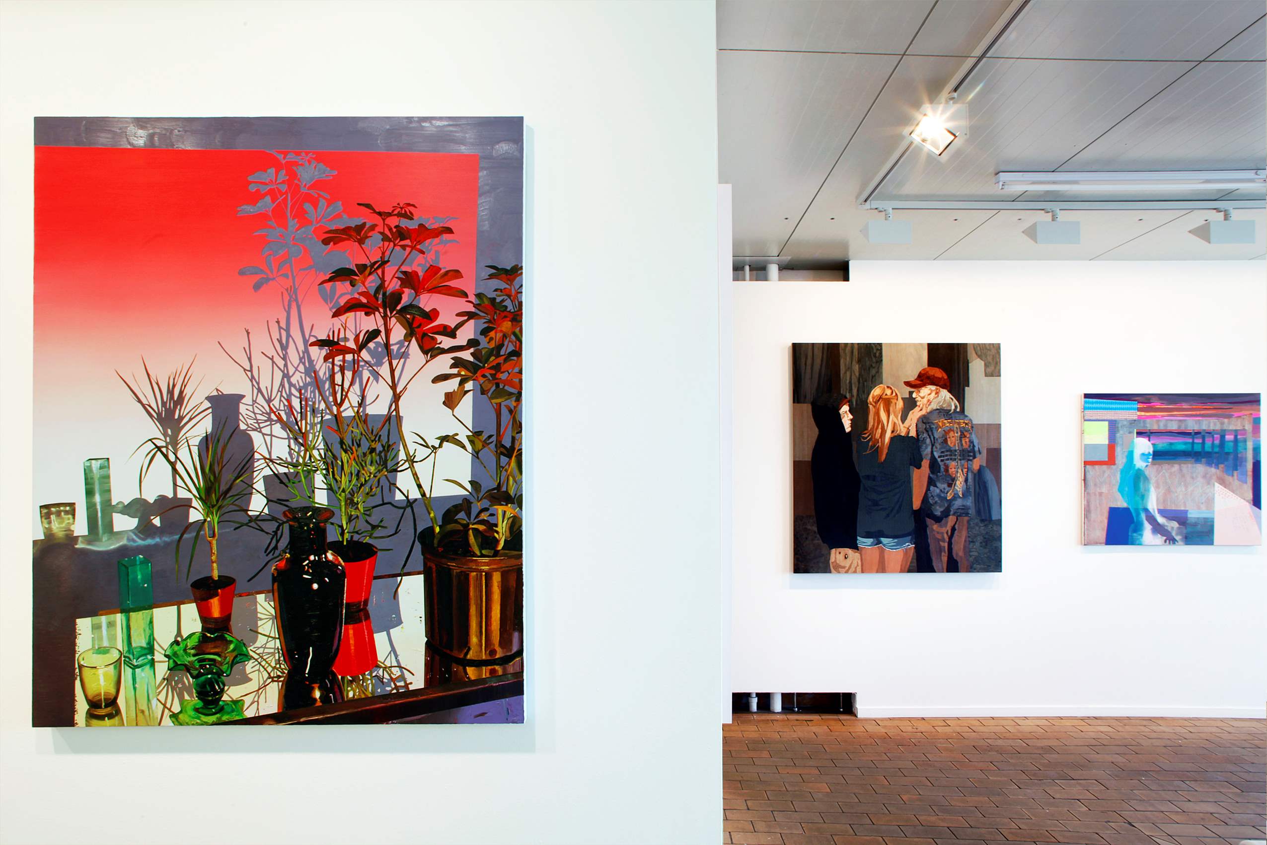 Collagen er også sat i spil hos Kristen Schiele, der på farverig og dynamisk vis kombinerer olie, akryl og silketryk inden for samme værk. Schieles kompositioner er komplicerede og levende idet, de hele tiden danner nye rum i rum, som kontinuerligt viser sig for øjet. Motiverne er i bevægelse, og bedst som man lige har identificeret en væg i baggrunden af et rum, bliver samme element til en græsplæne mellem en række træstammer. Vi befinder os i fantasifulde rum, som vi ikke er vant til at opholde os i. Schiele bedrager os uden slinger i valsen, og jo flere gange øjet snydes, jo bedre føles det paradoksalt nok.