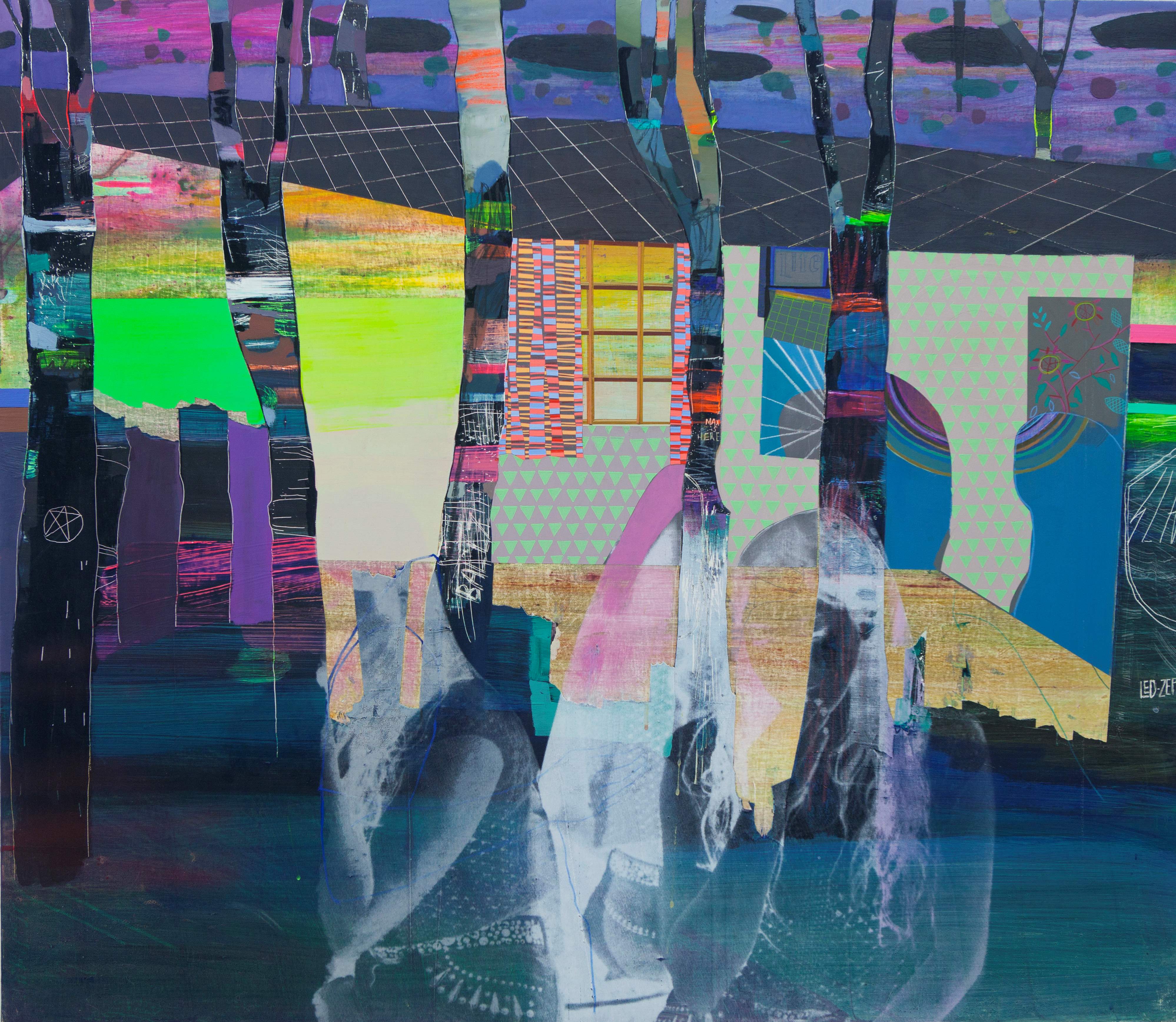 The collage is also brought into play by Kristen Schiele, who combines oil, acrylic, and silkscreen in a very colorful and dynamic way. Schiele’s compositions are complex and vibrant because they continuously create new spaces within spaces for the eye. The motives are moving, and just as you have identified a wall in the back of a room, the same element becomes a lawn between several tree trunks. We are placed in imaginative and dream-like spaces that we’re not used to be in. Schiele deceive us without a hitch. The more it happens, the better it feels paradoxically.