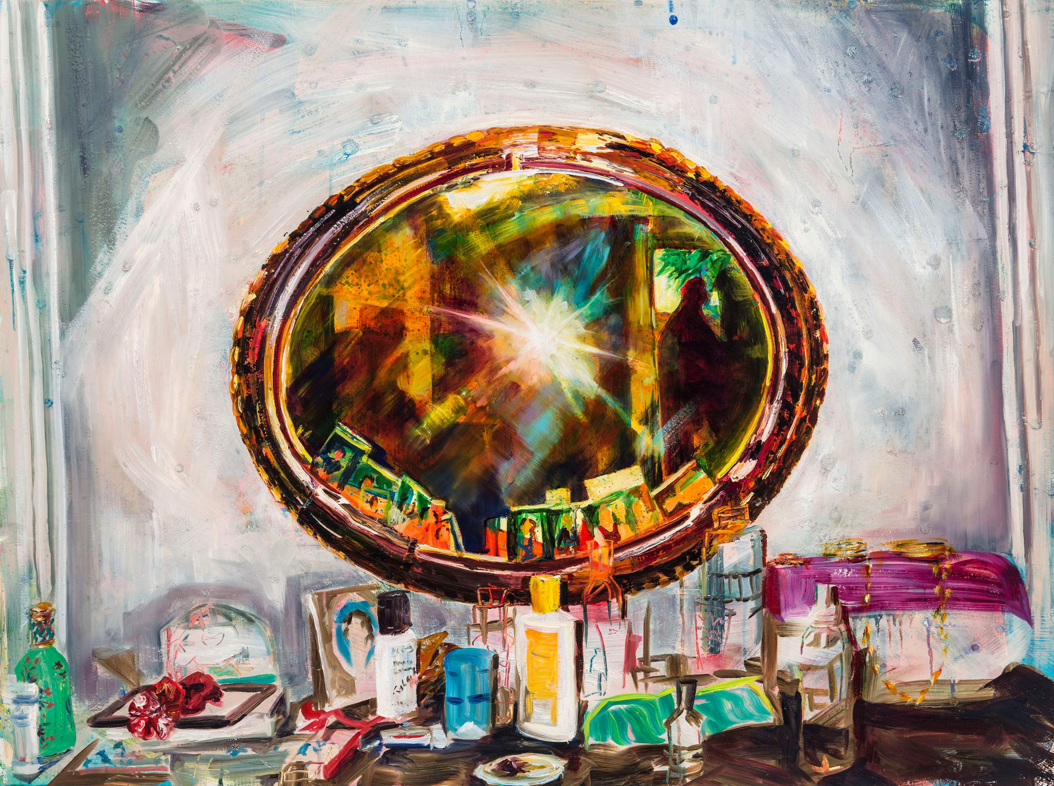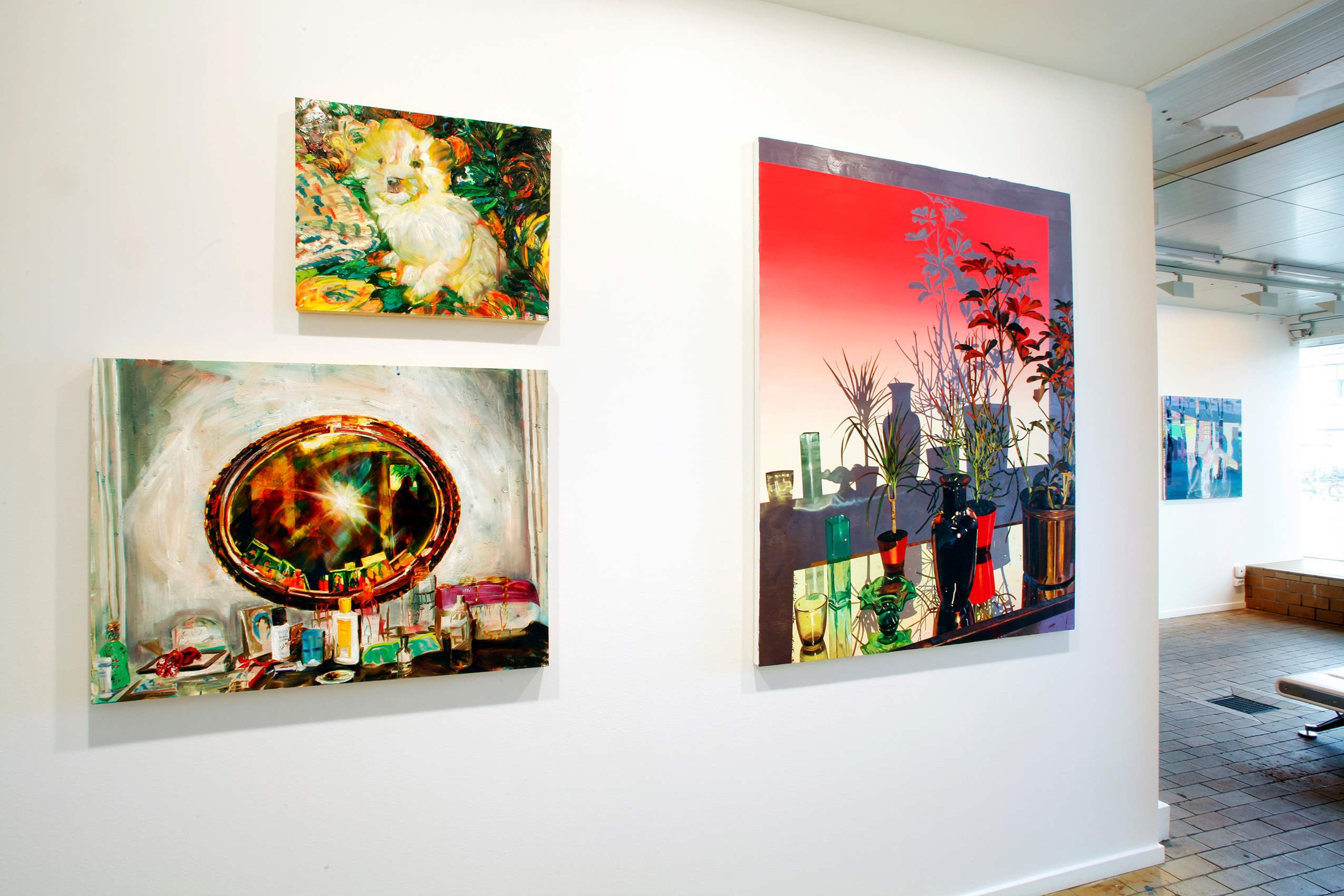 The fourth leg in this quartet is Rachel Schmidhofer, who is the expressive and exuberant contribution. Schmidhofer both adds undiluted oil paint (impasto) to the canvas and removes it with her fingers, which conjures everyday motifs of dressing tables and pets to life. The technique is extremely expressive and gives the works a texture and vividness, which brings the home’s everyday objects like the aquarium, moisturizer, and posters to the foreground. Schmidhofer shows us the simple things in life in a very complicated way. The domestic and the ordinary becomes perpetuated in these relief-like works, where beautiful traces from the artist’s hands are not smoothed out, much to our delight. Schmidhofer’s expressionism is acute, colorful, and hard to keep your eyes off.