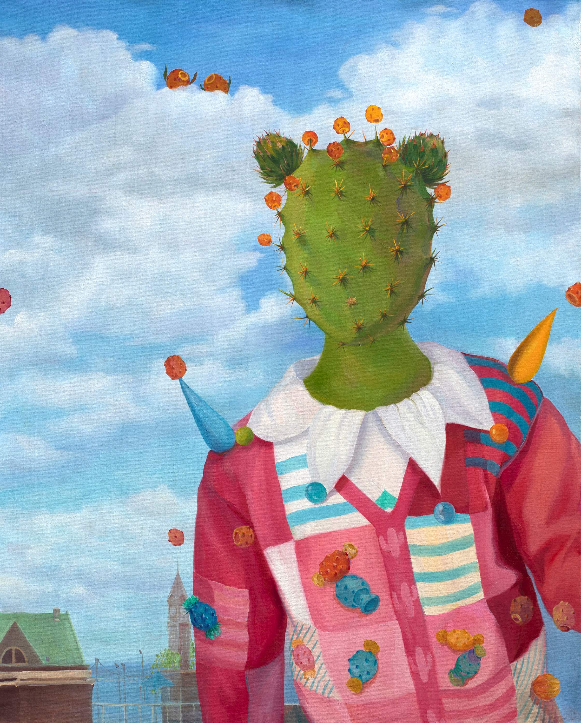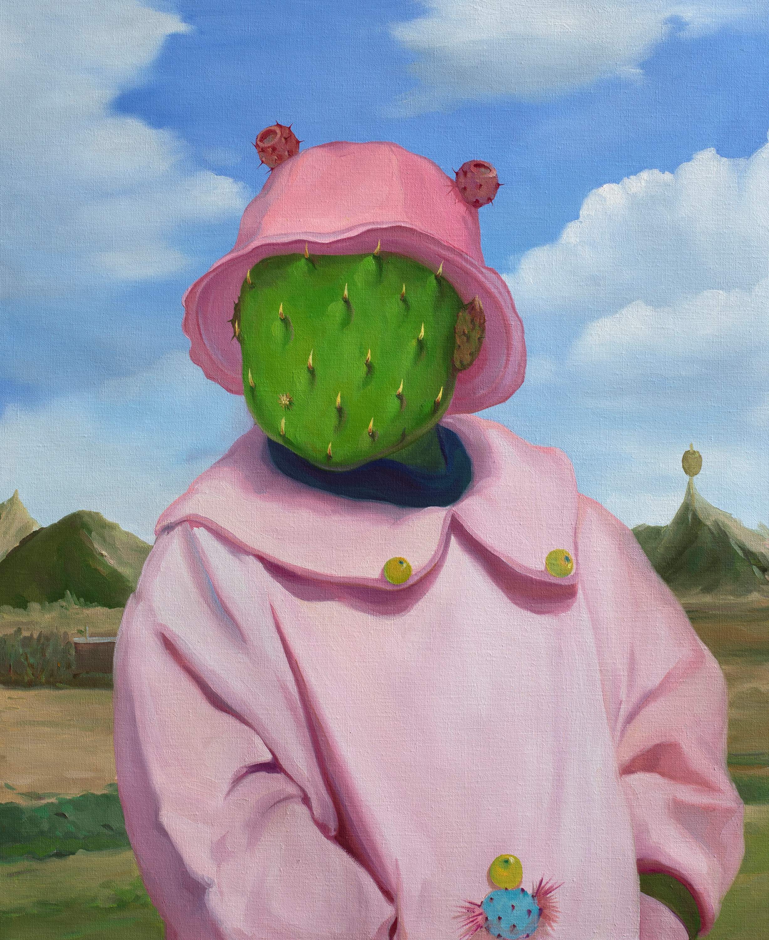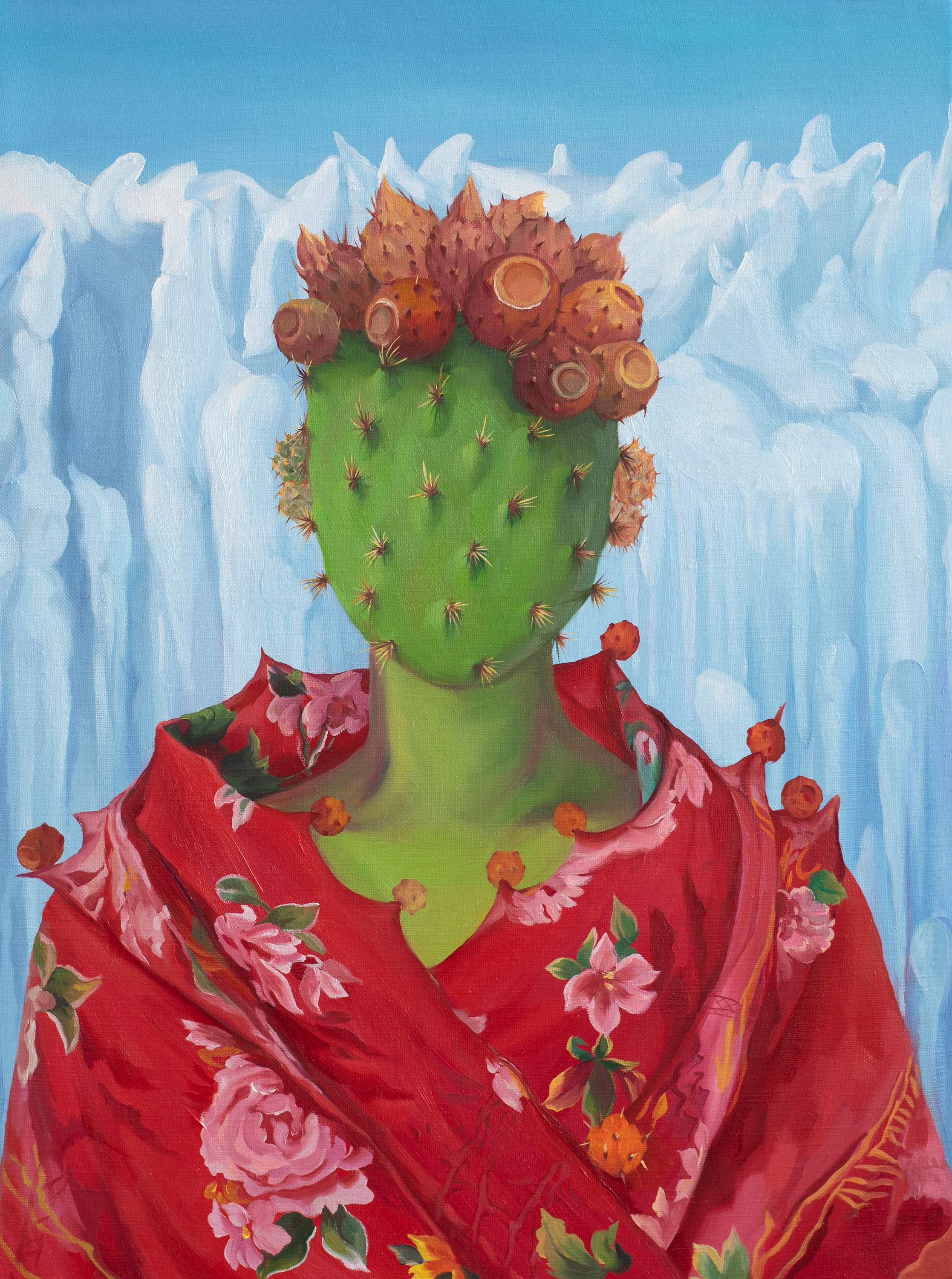 In one of Jingyi Wang’s latest paintings, we see a female cactus figure in a cloak of distinctive patterns that represents the Northeastern region of China. The figure’s hair is made up of the red fruits of the prickly pear cactus, an image that reminds Wang of her mother curling her hair, also drawing upon the comedic portrayal of landladies in classic Hong Kong movies. Wang’s works combine memories from her childhood with her own experiences of growth. The cacti in her paintings represent a yearning for her family and hometown after having moved away from home but at the same time symbolize resilience and her own strength and independence in making this journey. By substituting human faces for cacti and depicting them in the clothing from her childhood, Wang’s works tell a meaningful story of nostalgia and the ability to adapt to situations in order to protect oneself when navigating the world.