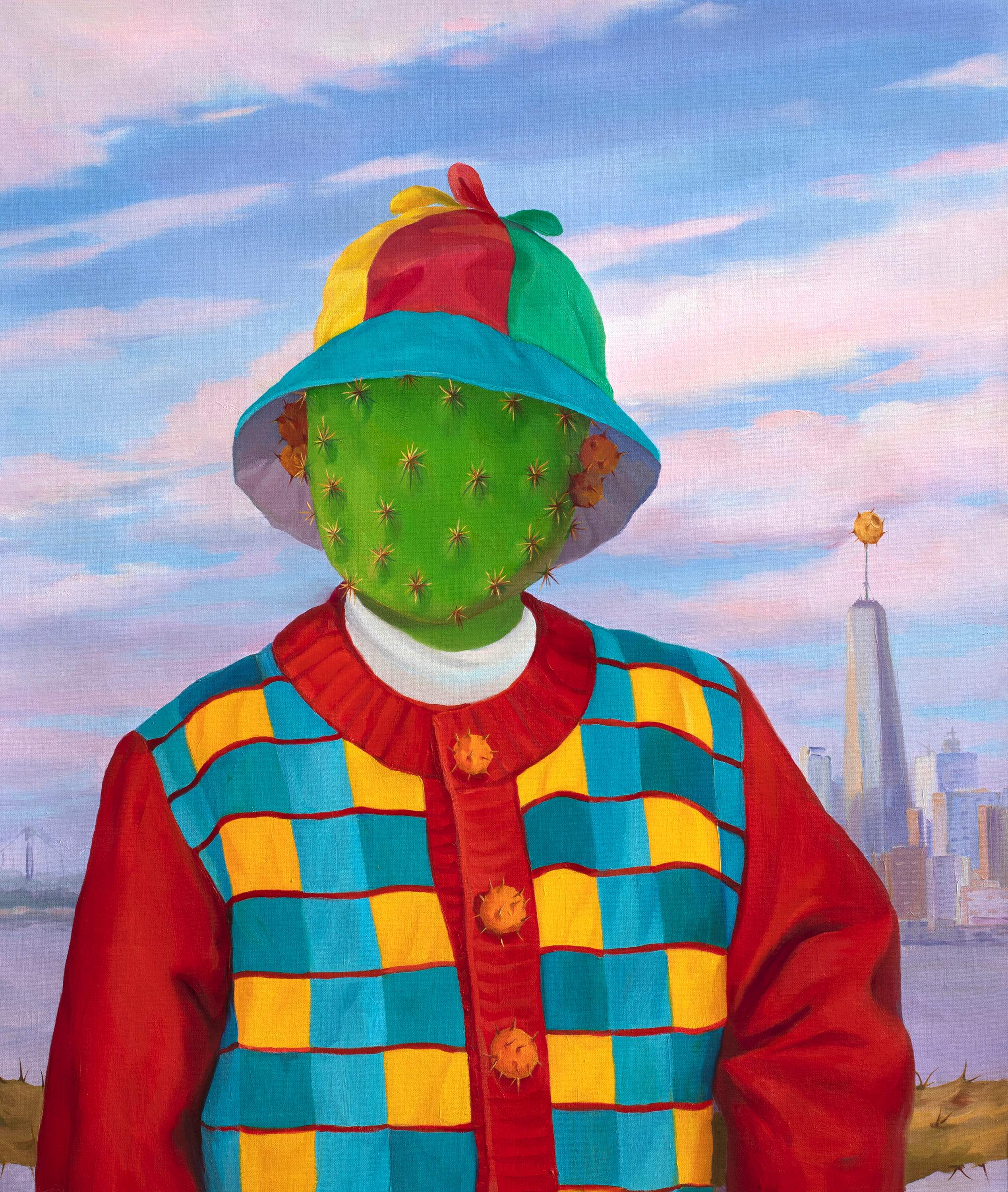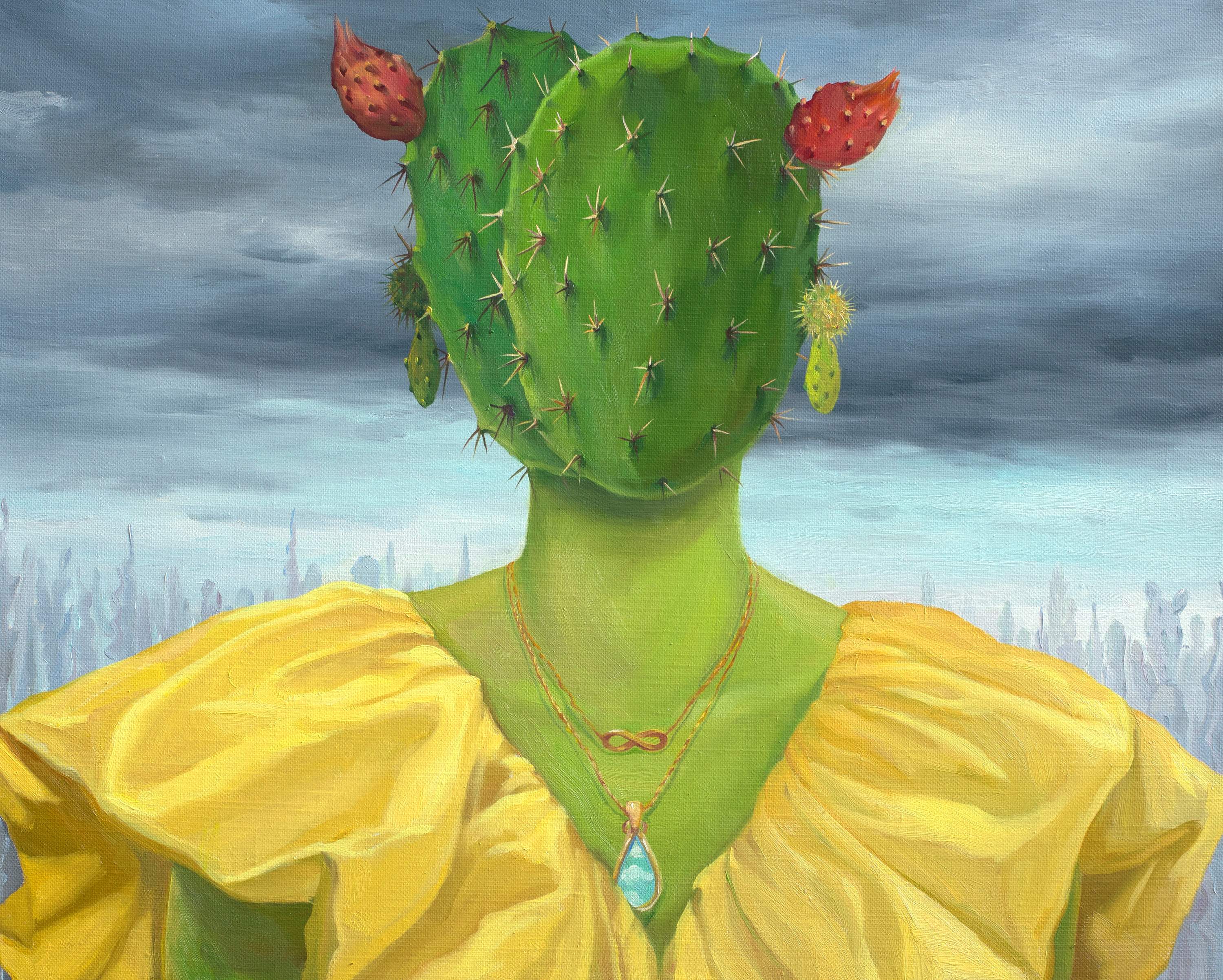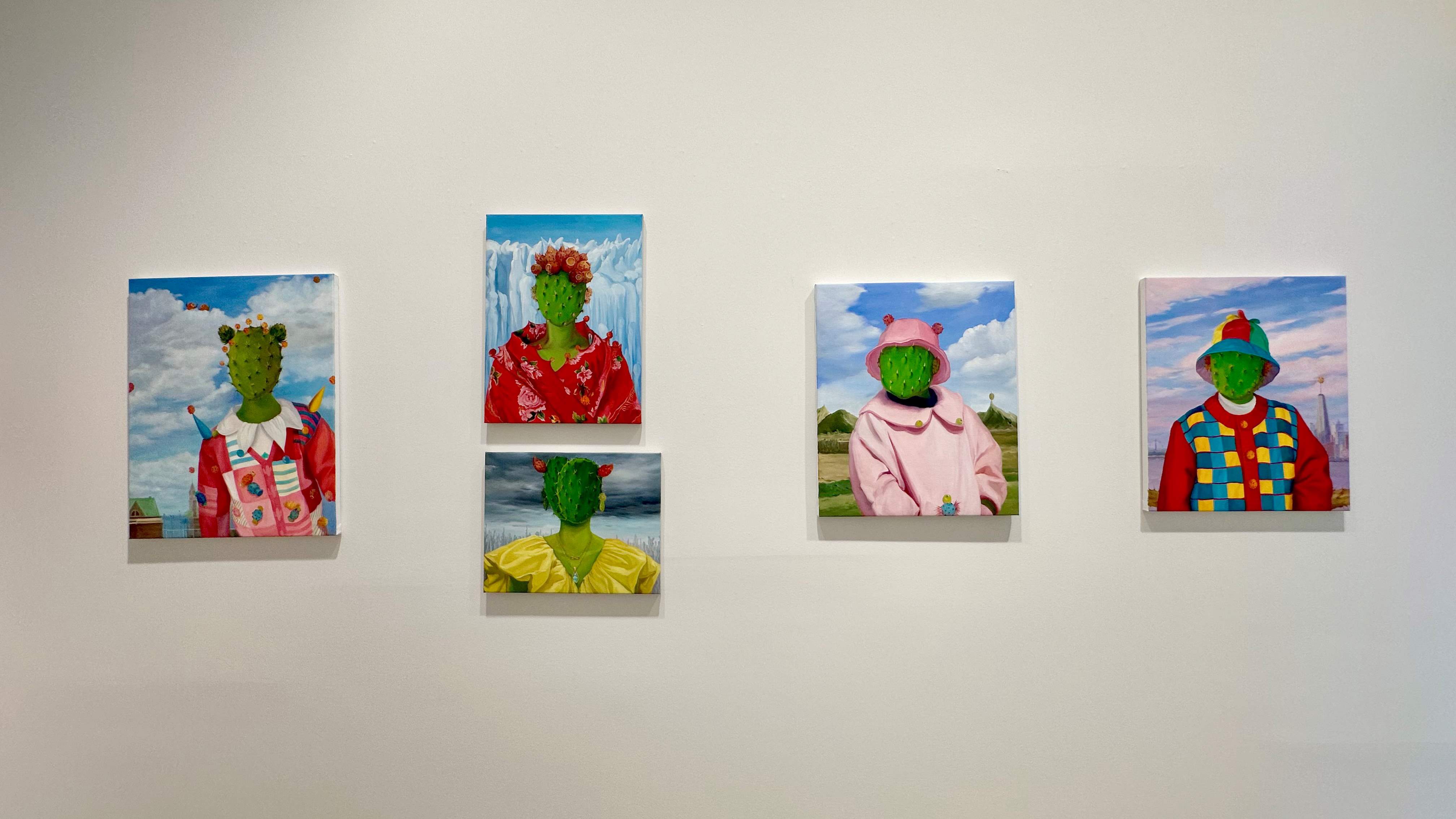 In one of Jingyi Wang’s latest paintings, we see a female cactus figure in a cloak of distinctive patterns that represents the Northeastern region of China. The figure’s hair is made up of the red fruits of the prickly pear cactus, an image that reminds Wang of her mother curling her hair, also drawing upon the comedic portrayal of landladies in classic Hong Kong movies. Wang’s works combine memories from her childhood with her own experiences of growth. The cacti in her paintings represent a yearning for her family and hometown after having moved away from home but at the same time symbolize resilience and her own strength and independence in making this journey. By substituting human faces for cacti and depicting them in the clothing from her childhood, Wang’s works tell a meaningful story of nostalgia and the ability to adapt to situations in order to protect oneself when navigating the world.