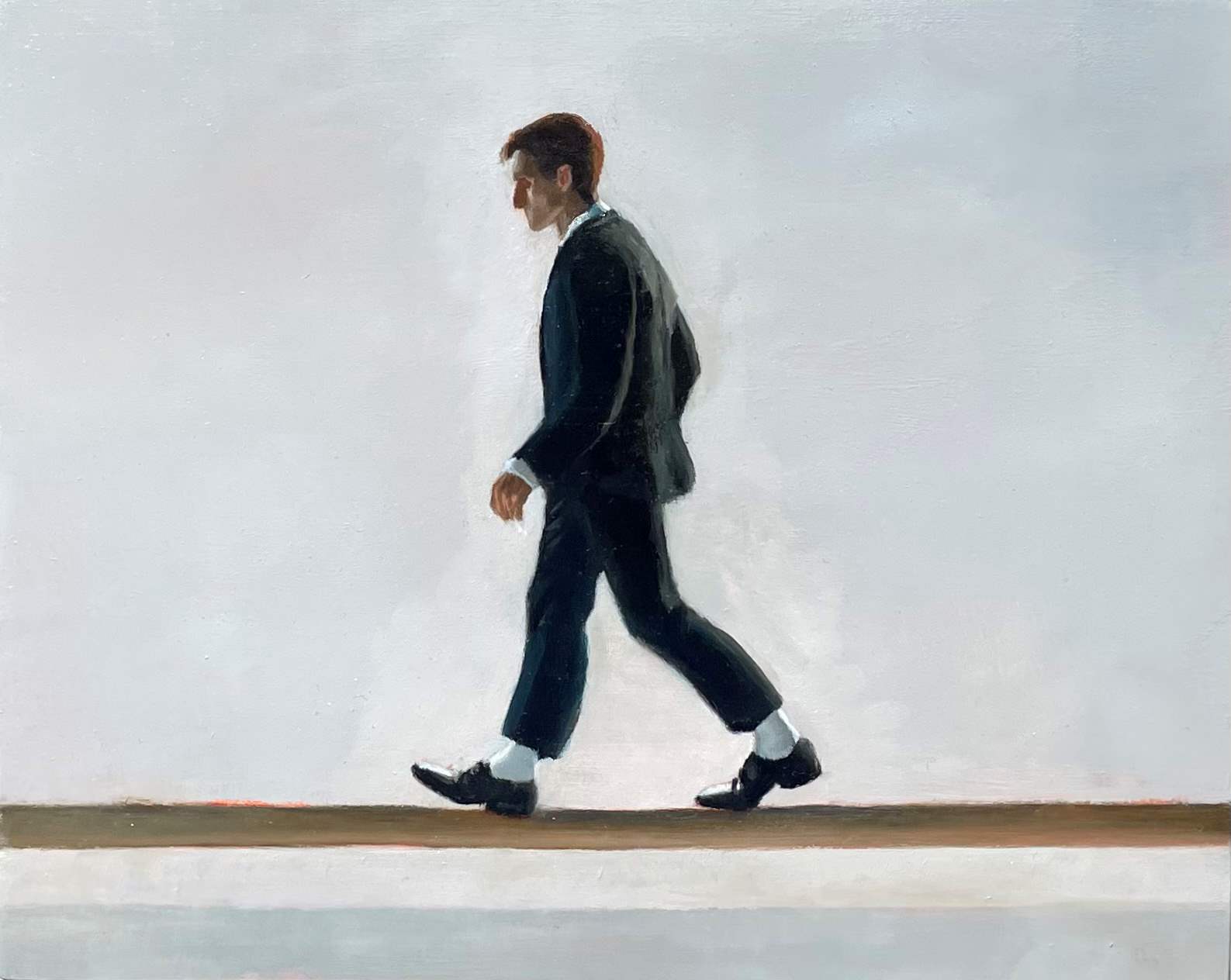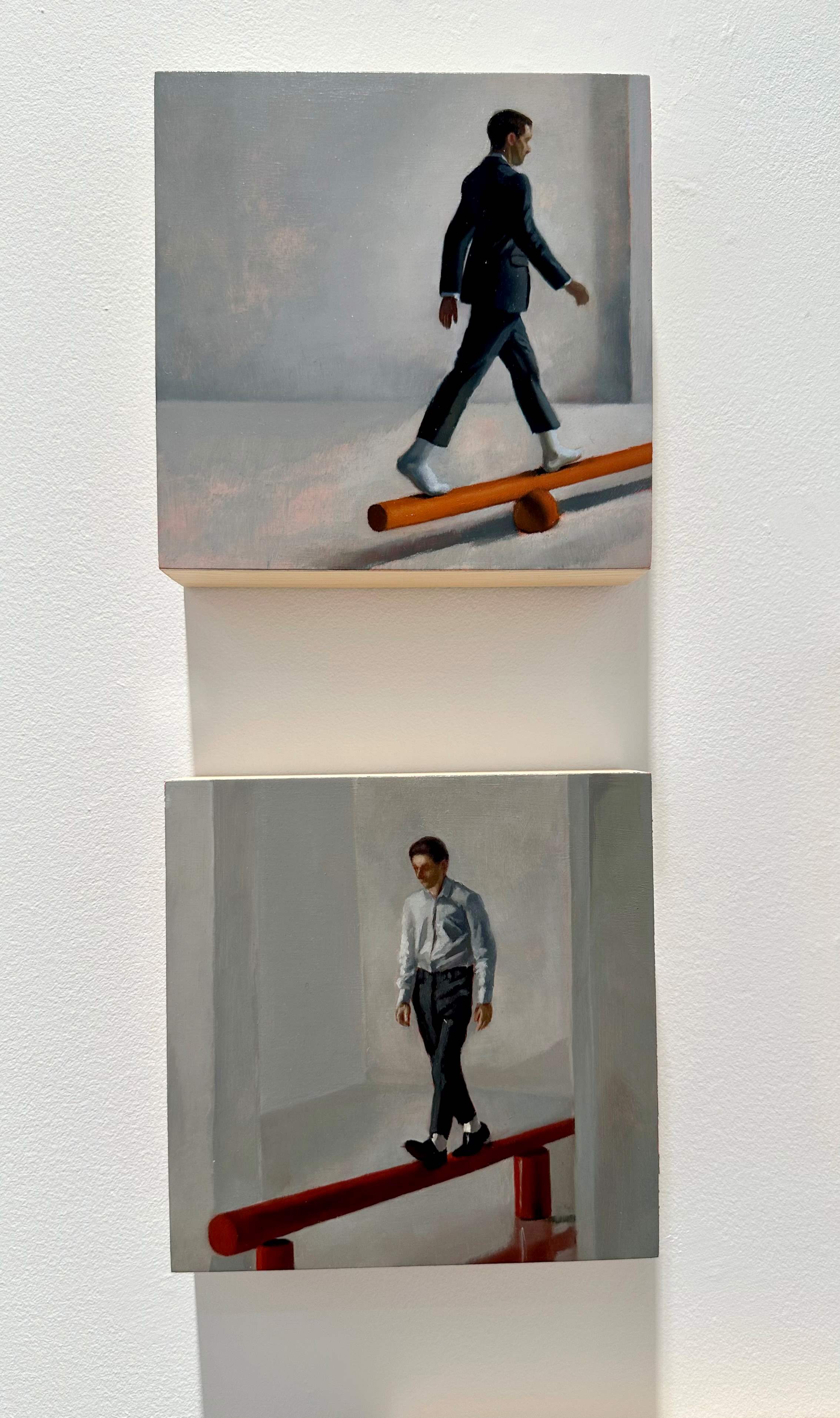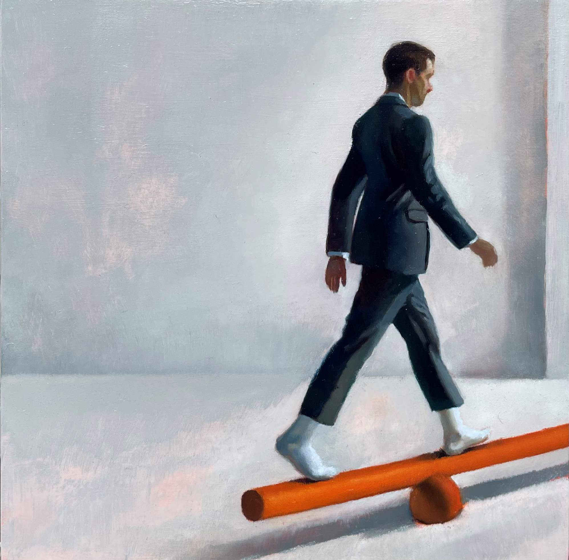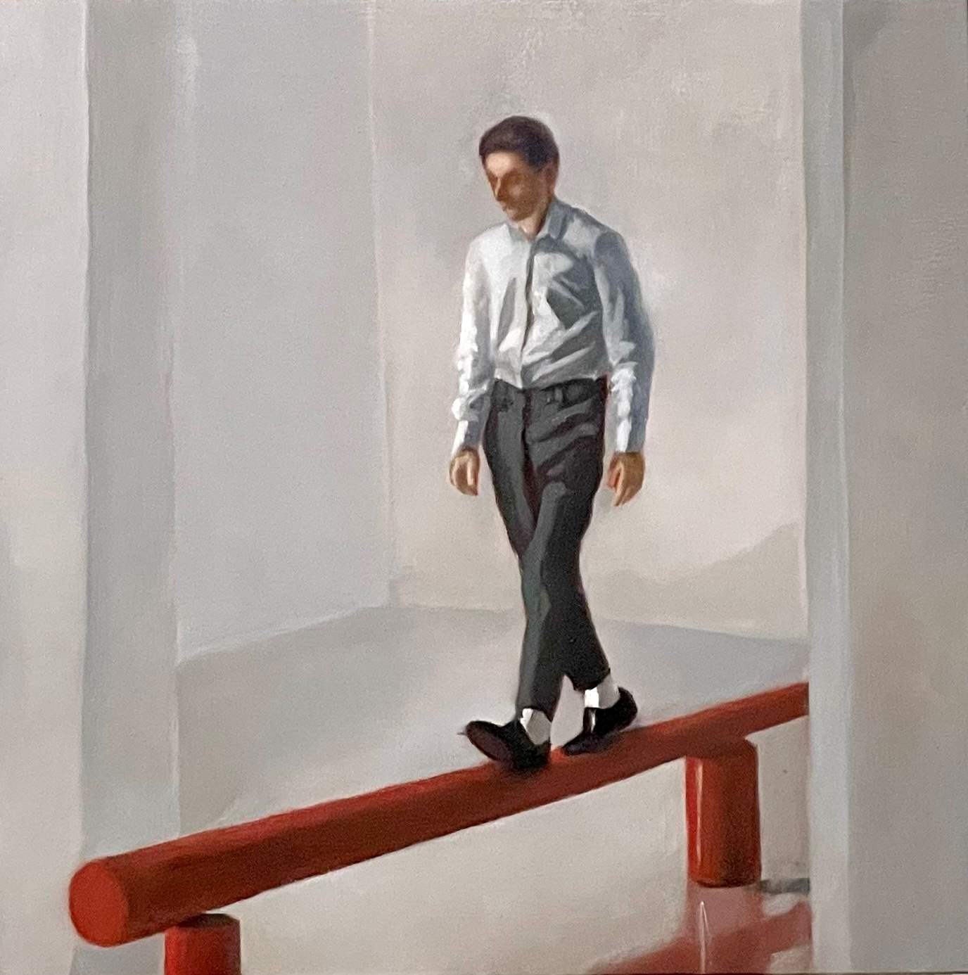 Potential pinnacle moments reflecting ordinary, everyday situations suspended in time present themselves before us in Rebecca Orcutt’s most recent selection of works. For most of us, the everyday consists of routine actions which are done on autopilot without hesitation, forming part of the subconscious mind. Orcutt’s works which zoom in on these moments, allow us to contemplate the subtleties of life. Although we may deem these events insignificant, they are actually great bearers of change. Sometimes life’s biggest events can happen within a millisecond or through an accumulation of moments that may appear static over time. Orcutt presents before us the dilemmas of recognizable subject matter who find themselves in somewhat bizarre, seemingly staged situations. By concentrating on the importance of these instances, Orcutt explores how navigating contemporary society can be like walking a tightrope. In a world where there is an excess of information and a constant reminder of choices to be made, decision-making is no easy task.