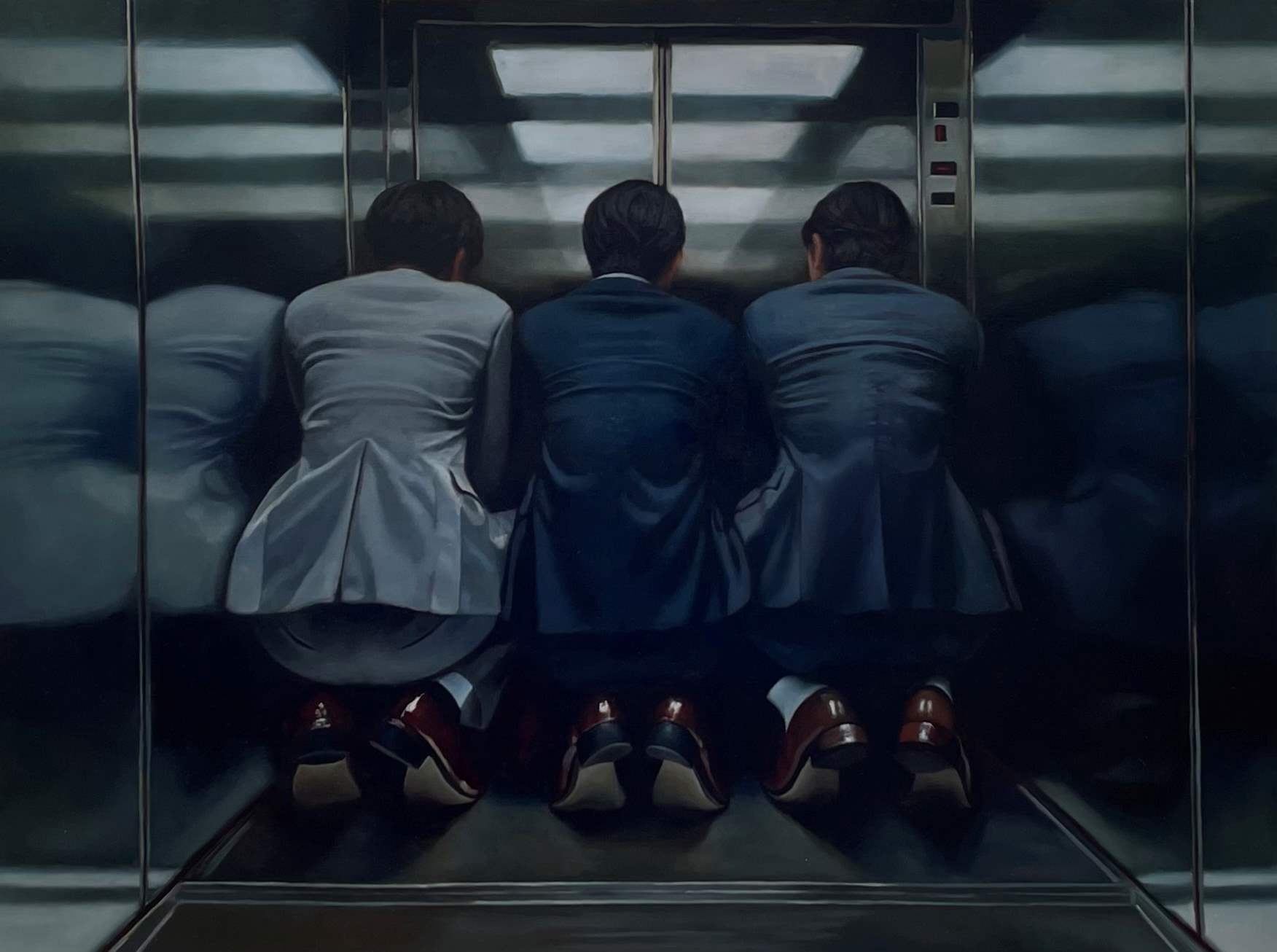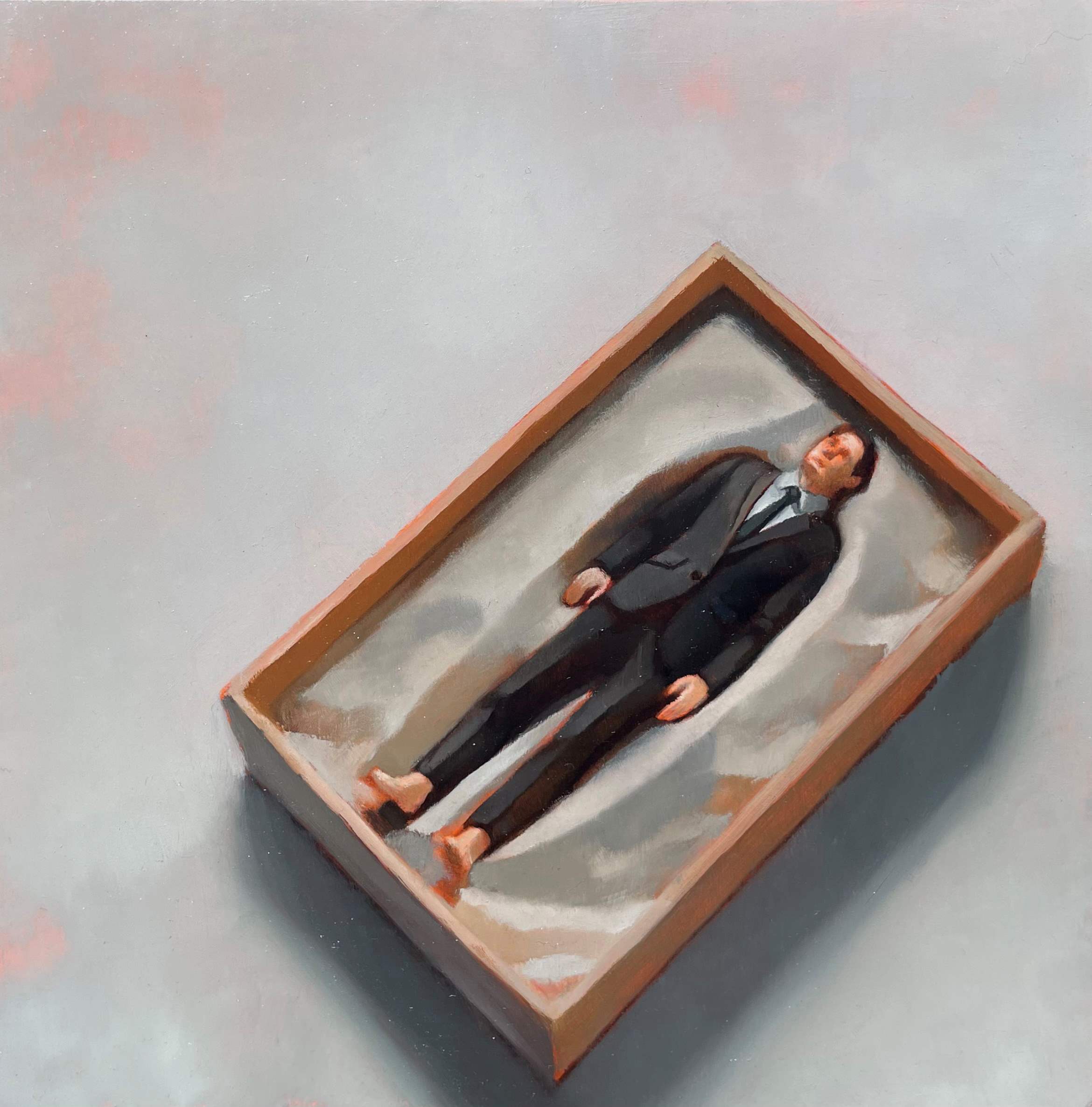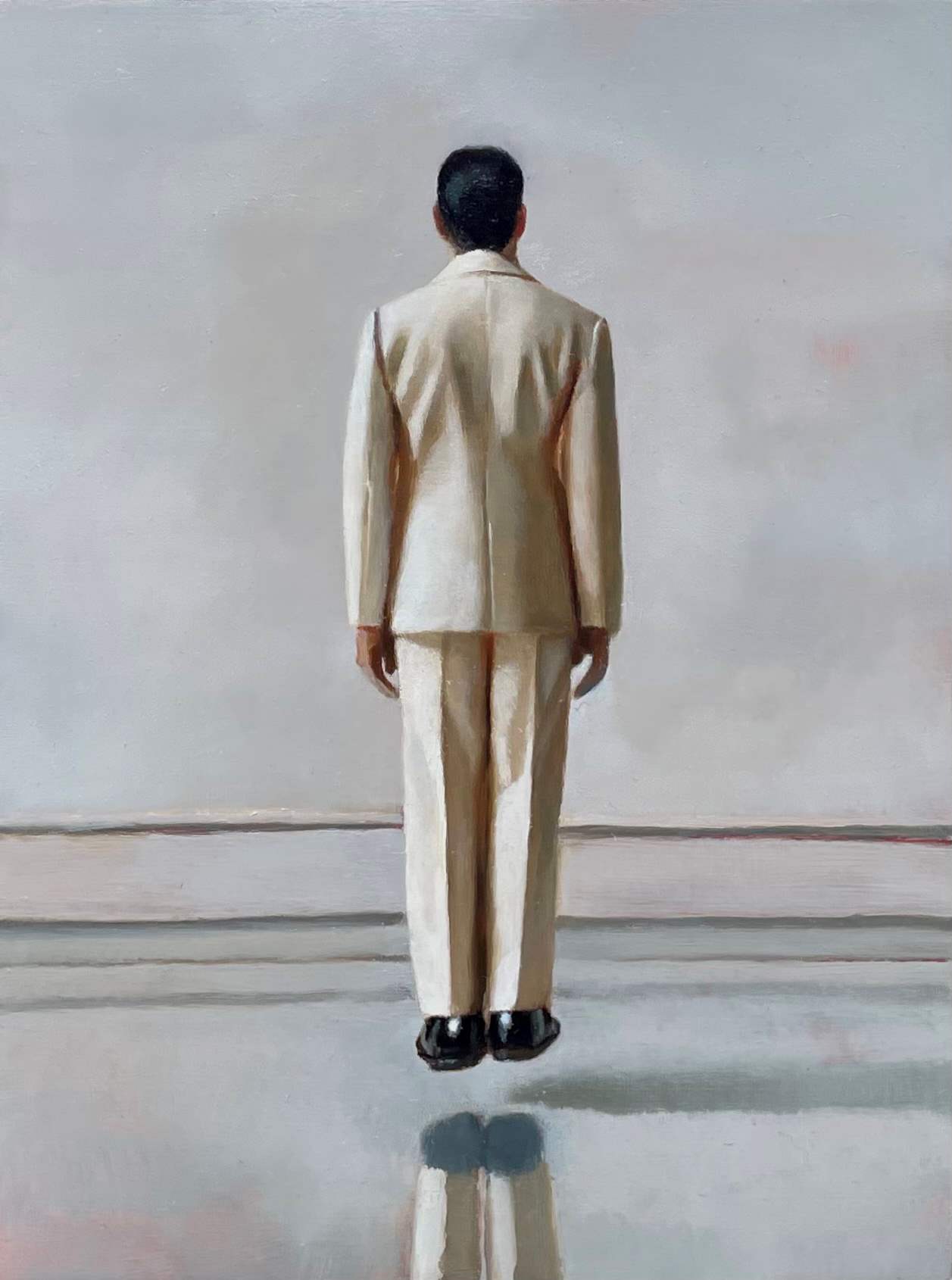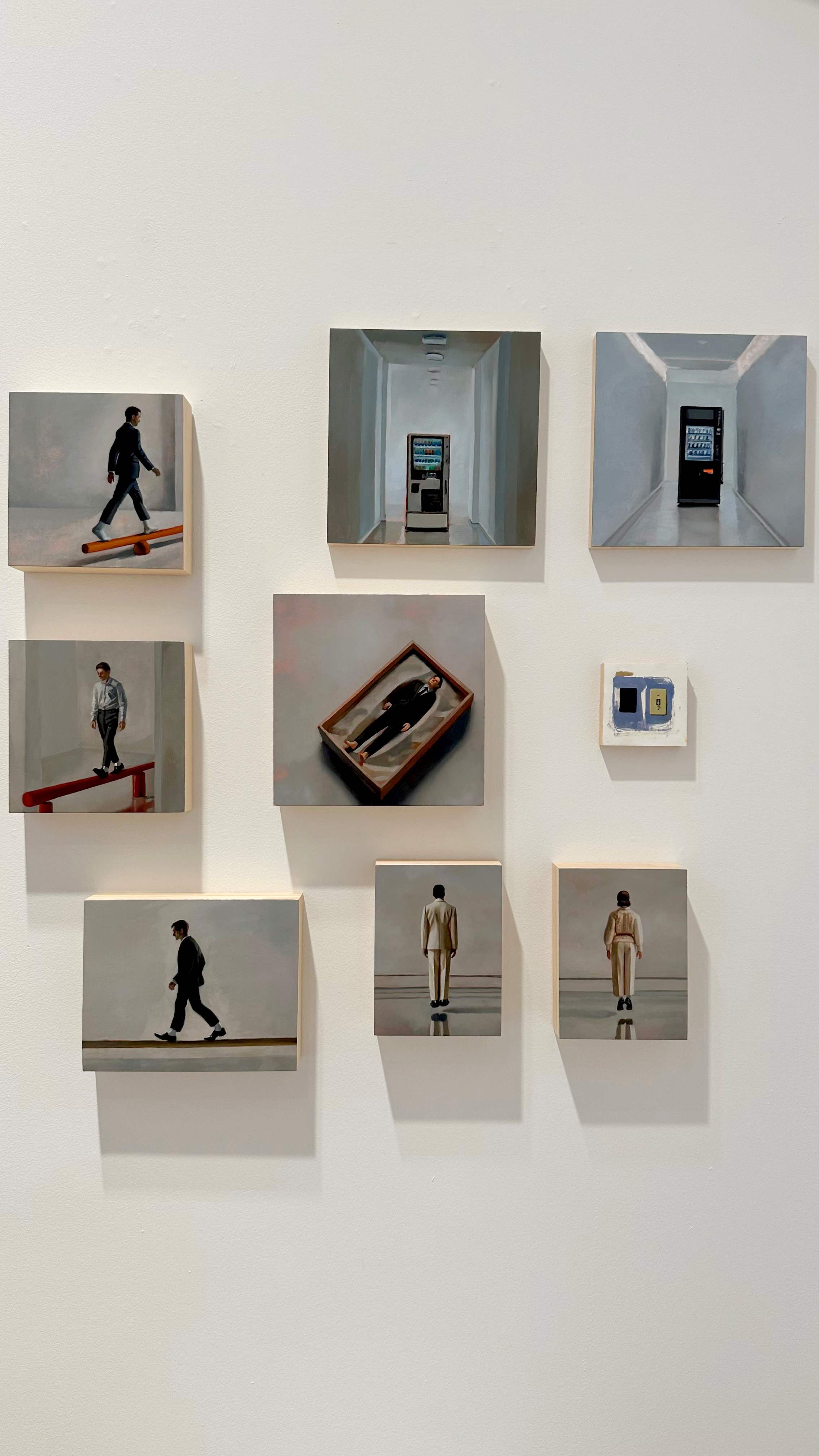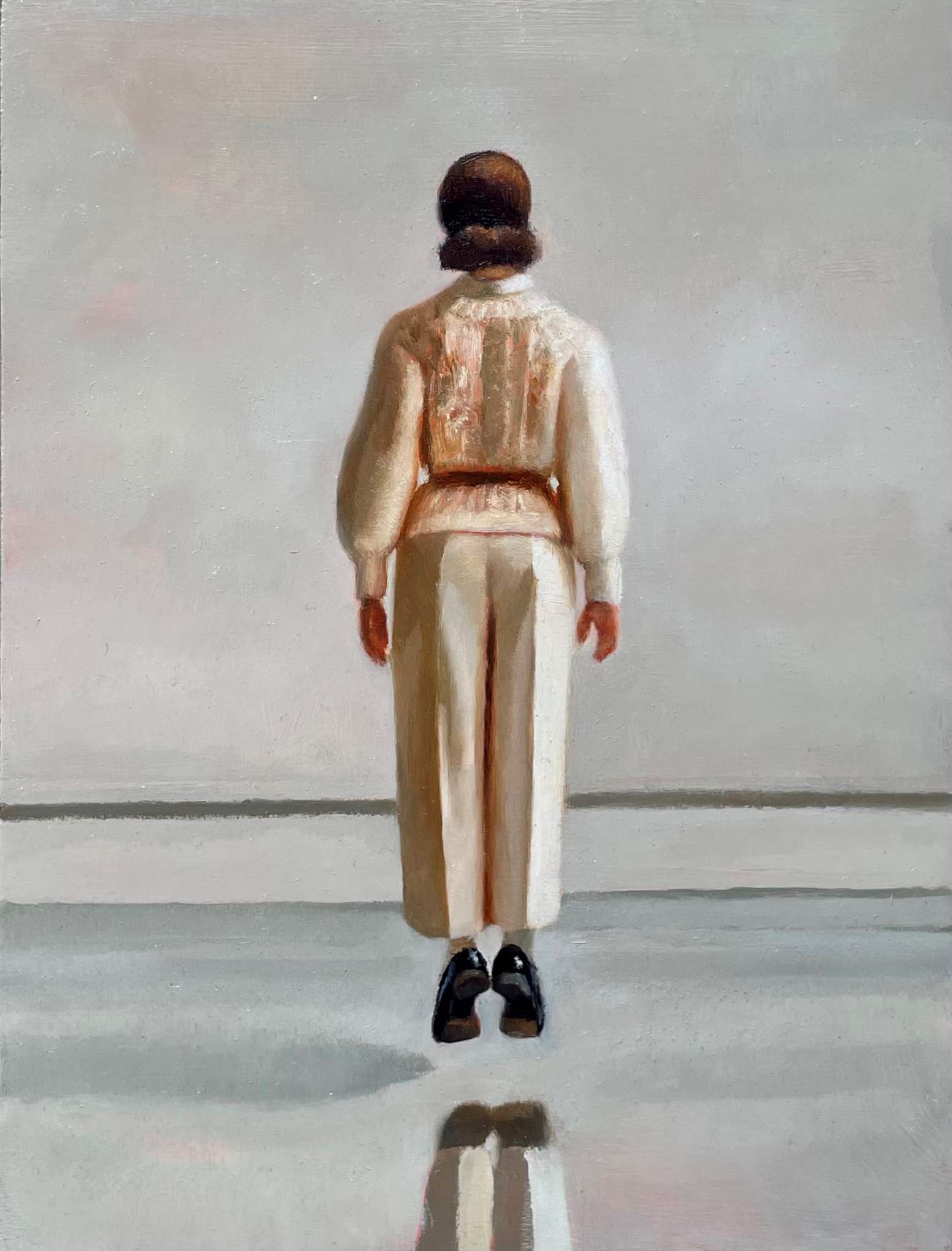 Potential pinnacle moments reflecting ordinary, everyday situations suspended in time present themselves before us in Rebecca Orcutt’s most recent selection of works. For most of us, the everyday consists of routine actions which are done on autopilot without hesitation, forming part of the subconscious mind. Orcutt’s works which zoom in on these moments, allow us to contemplate the subtleties of life. Although we may deem these events insignificant, they are actually great bearers of change. Sometimes life’s biggest events can happen within a millisecond or through an accumulation of moments that may appear static over time. Orcutt presents before us the dilemmas of recognizable subject matter who find themselves in somewhat bizarre, seemingly staged situations. By concentrating on the importance of these instances, Orcutt explores how navigating contemporary society can be like walking a tightrope. In a world where there is an excess of information and a constant reminder of choices to be made, decision-making is no easy task.