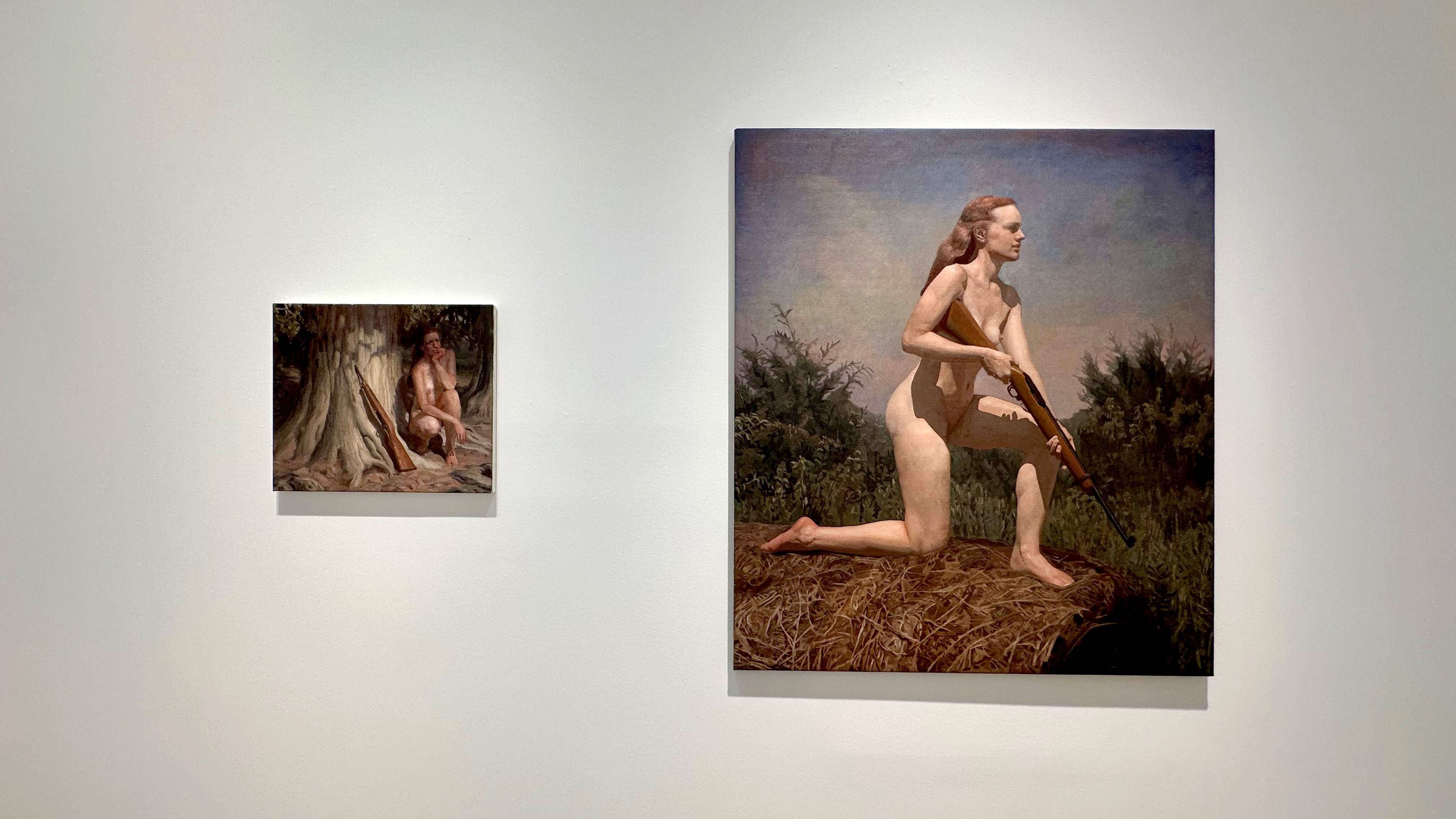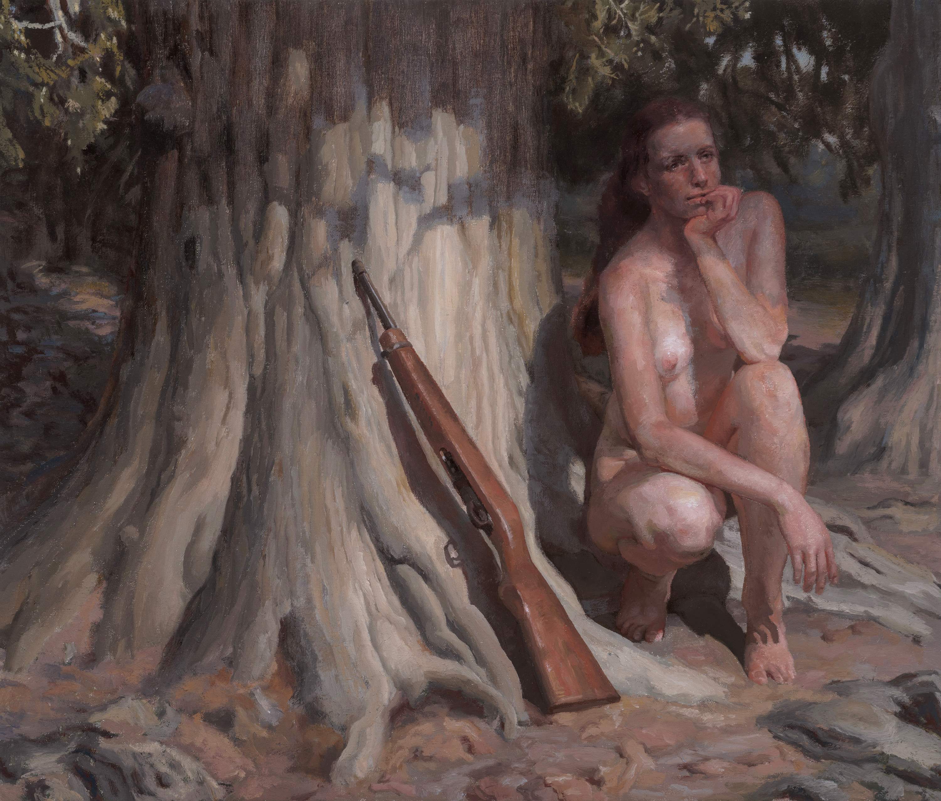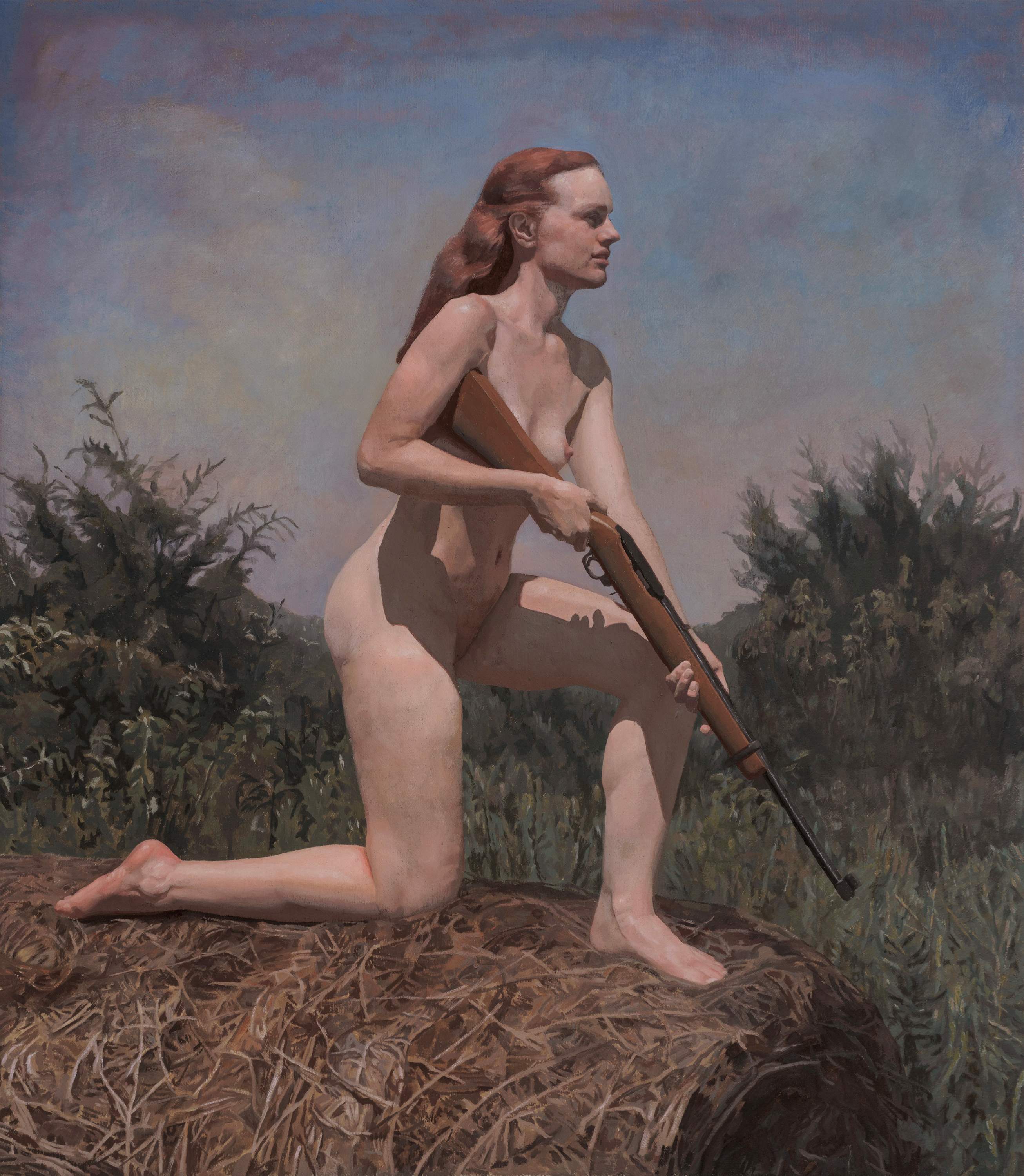 Challenging the restriction of women’s freedom in America, Anne Herrero paints an unyielding, fully nude liberated female, bearing arms in a Midwestern landscape of muted tones. A force to be reckoned with, the woman depicted is her friend Lissa, who routinely hunts naked on her property in Missouri. As an act of freedom and rebellion, Herrero paints women who take fate into their own hands, addressing the roles that women have taken on and inhabited over time. These works serve as powerful allegories of history unfolding, addressing contemporary controversies and prevailing injustices in the states. Born in 1984 in Berkeley, California, Herrero spent most of her summers in Kansas City visiting her mom’s family. Many of her works are set in the American rural landscape which represents a significant part of her life. It is in the sweeping landscapes of the Midwest that Anne explores notions of freedom and equality.