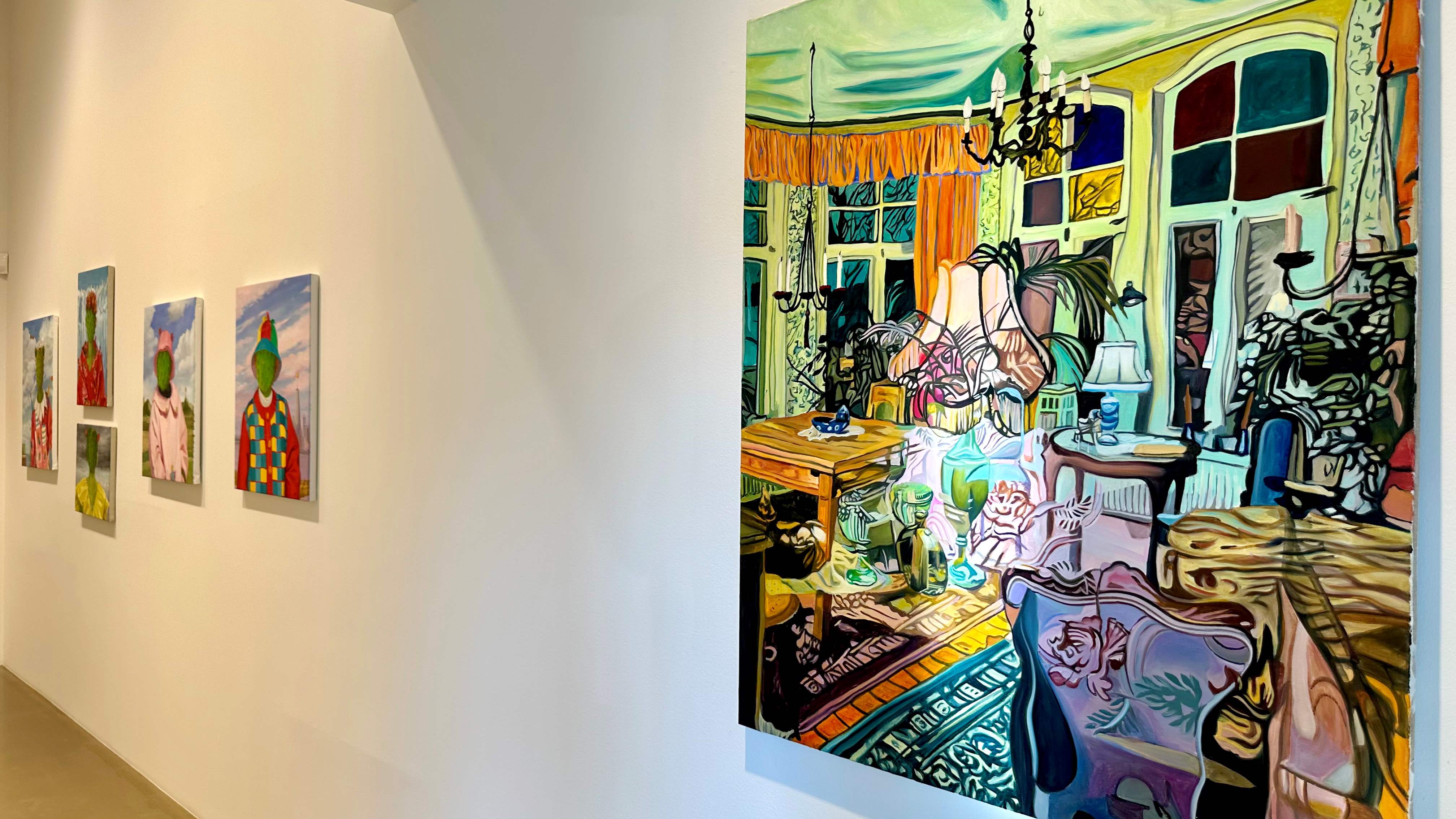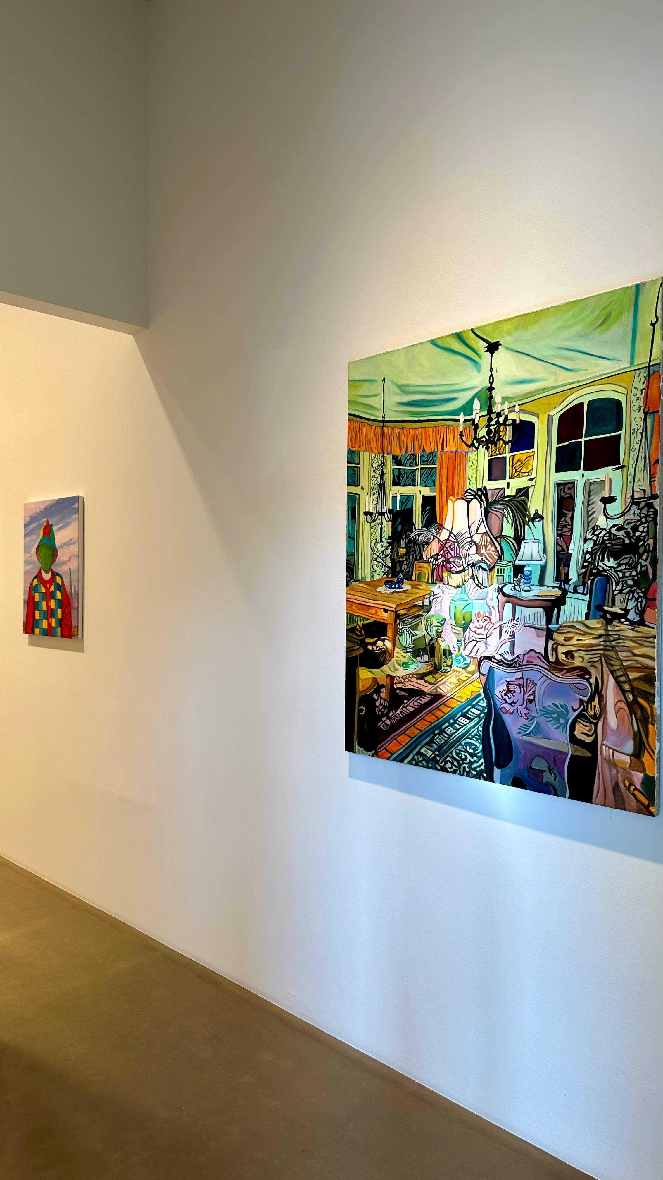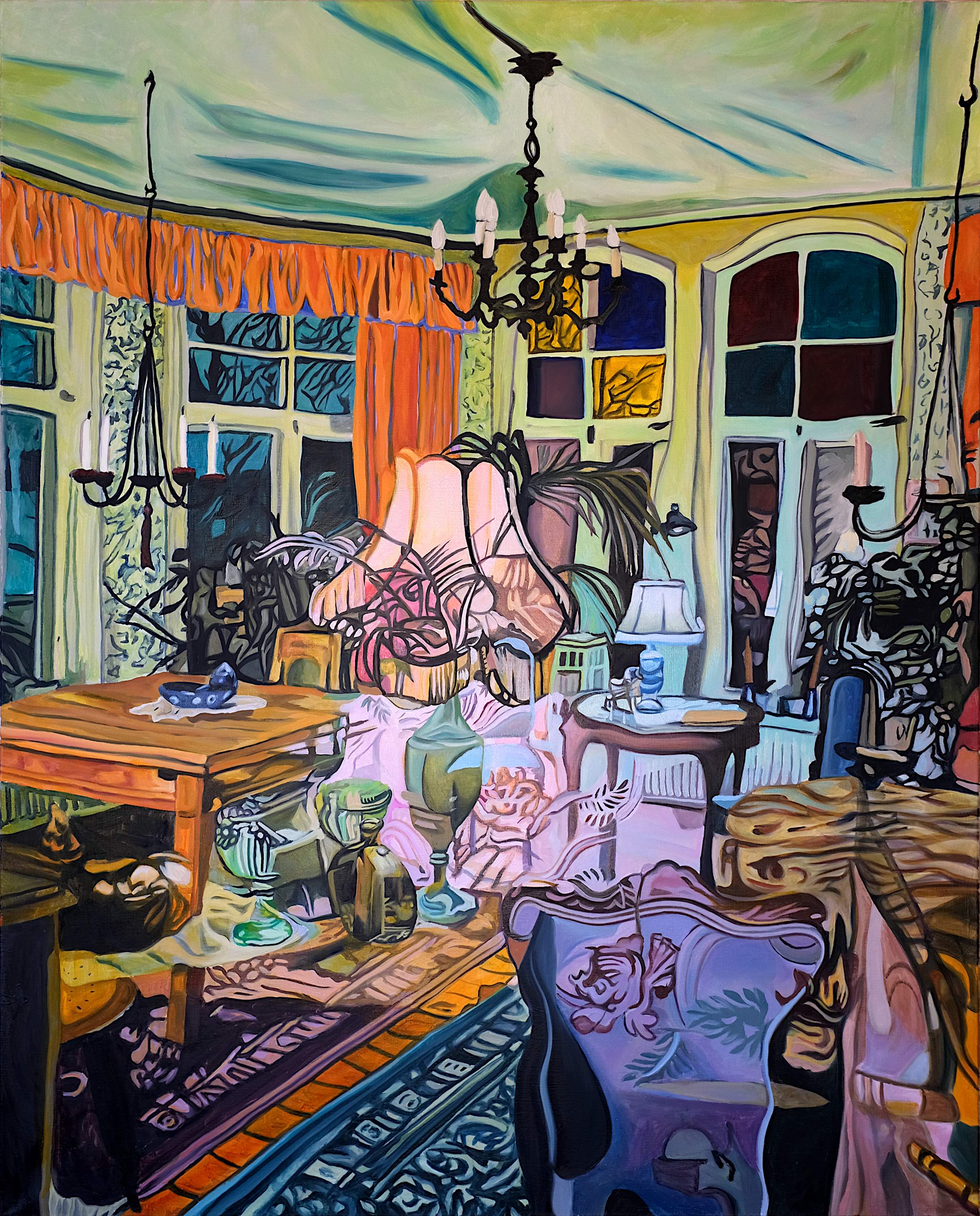 A room filled with assorted lamps, antique furniture and plants forms part of the vibrant interior in Emilia Nurmivaara’s most recent painting. Depicting cherished and lived-in interiors, Nurmivaara fondly captures the living memories that are instilled in her childhood home as she welcomes us into these spaces. Inspired by the French philosopher Gaston Bachelard and his book from 1958 The Poetics of Space, Nurmivaara focuses on how buildings and spaces are transformed by the people who inhabit them, she invites us to look inward and evaluate our relationship with the world and the influences that houses, spaces and interiors have on our metaphysical life and the creation of dreams. For many of us, the childhood home is the first space we inhabit in which our imagination comes to life. These spaces in Nurmivaara’s paintings which combine figurative and abstract imagery, serve as an extension of the soul, embodying her memories, dreams and experiences.