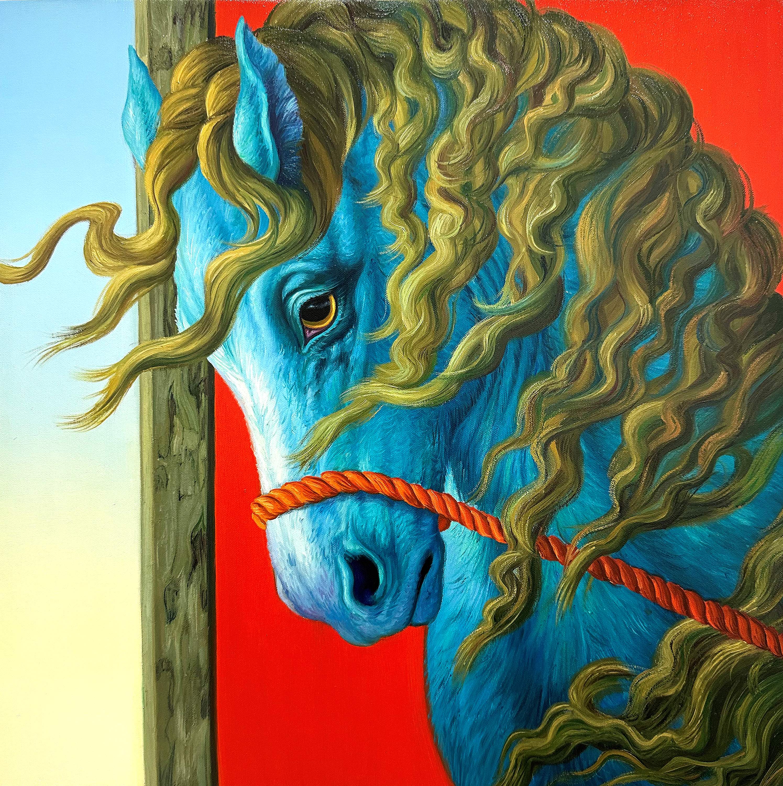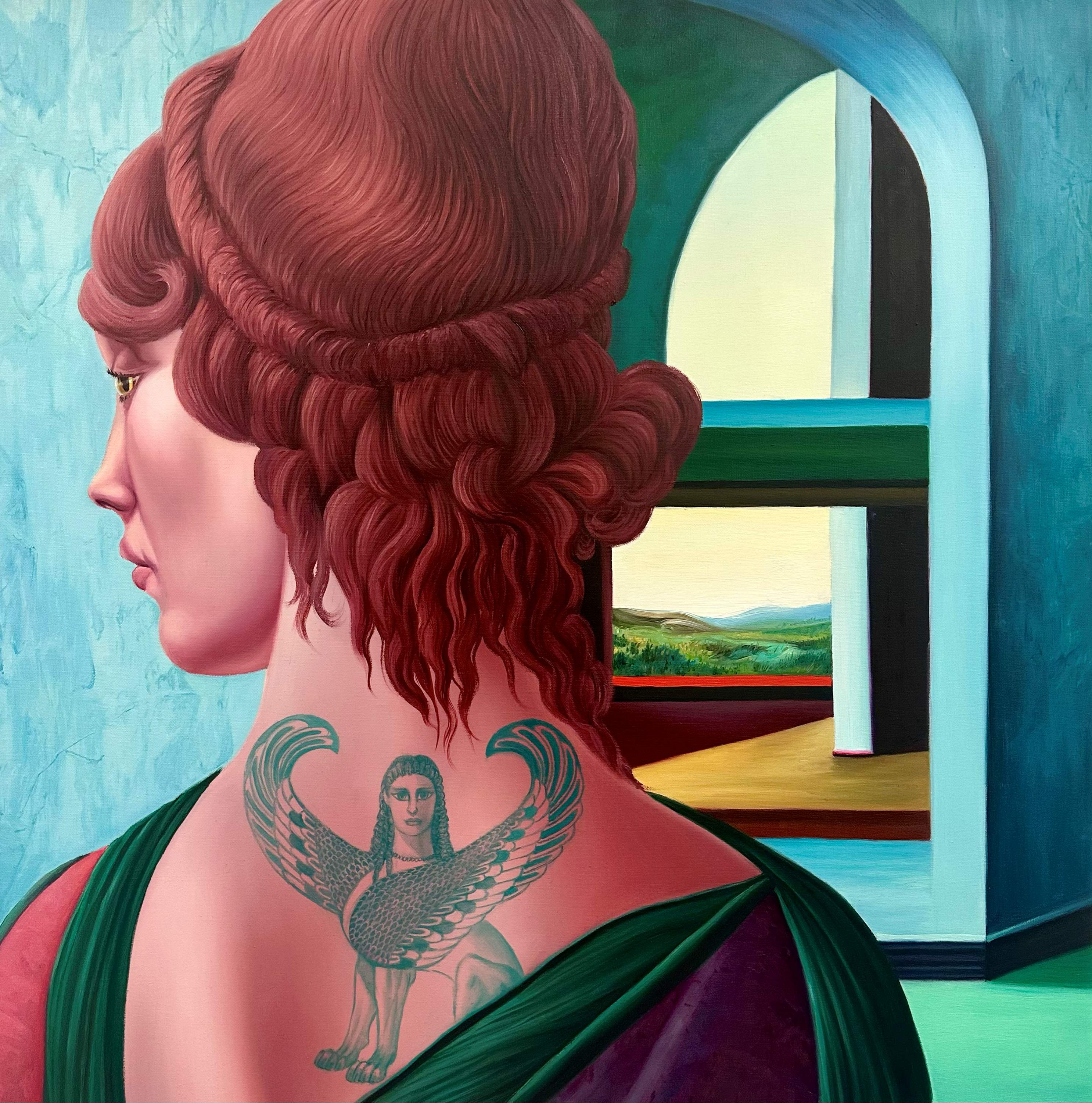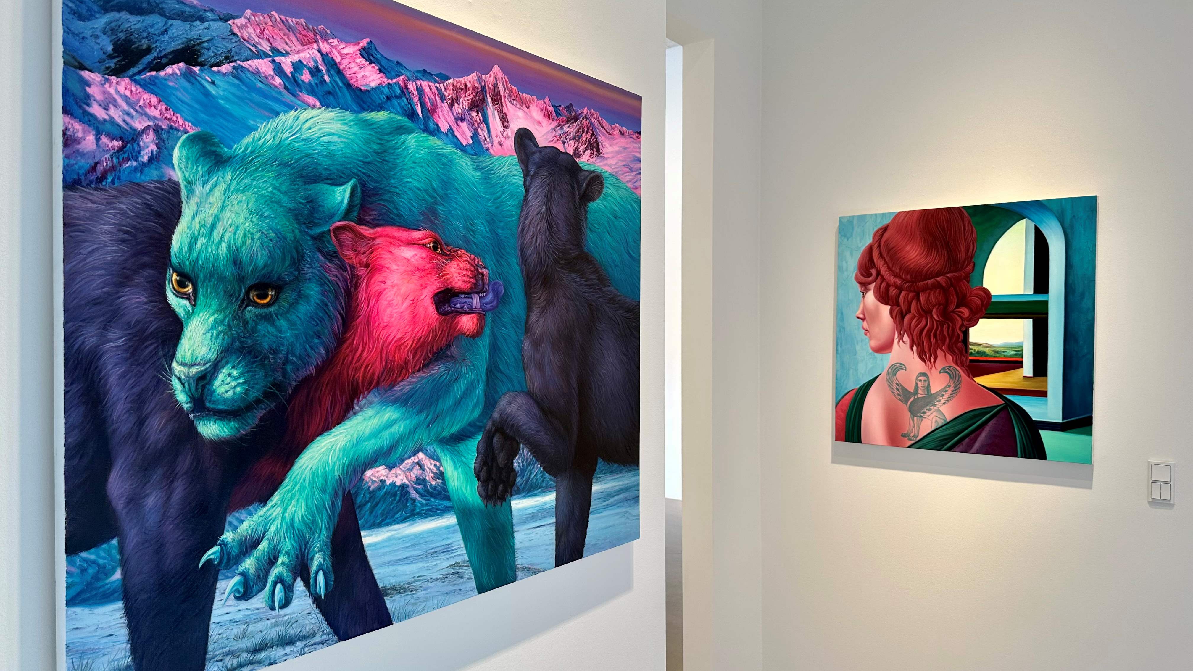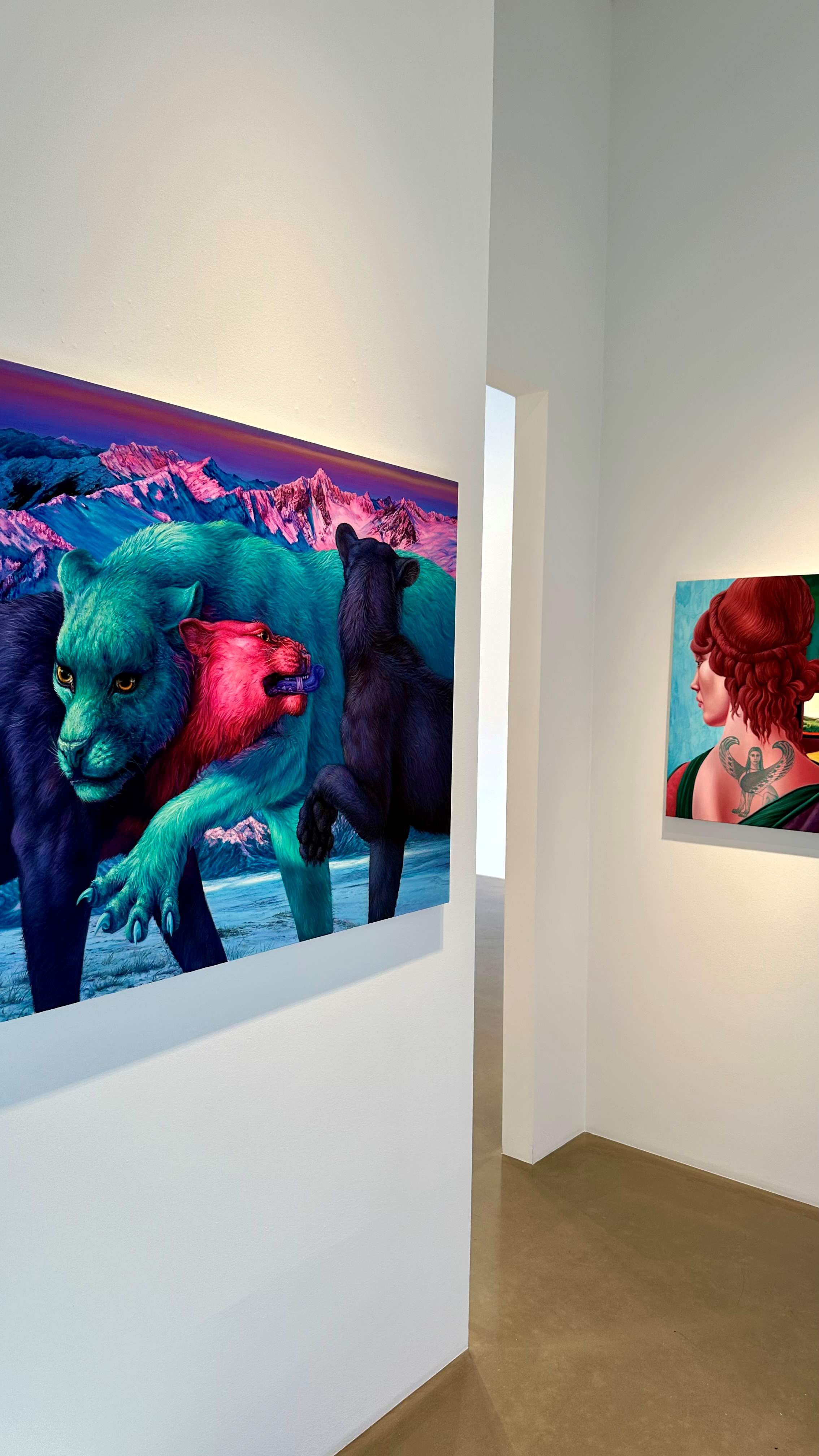 As technology advances and cities grow, many of us may find that our connection to the natural world becomes more distant, to the point that one day it may exist for us as a distant memory or a mere figment of the imagination. Angela Gram's vibrant transcendental paintings are loaded with psychological, thought-provoking imagery that transports us to multiple realms, a concoction of ancient allegories paired with highly saturated, almost artificial universes. Through her anthropomorphic depictions, she paints surreal, ethereal scenes that speak to a primordial part of the subconscious mind representing a human desire to reconcile this forgotten state. Whether it is through animal forms that describe human behaviors or ideal landscapes peeking out from beyond the horizon, Gram’s works explore a hierarchy between humanity and the marginalization of nature, commenting on the cultural and physical disappearance of this connection to the natural world.