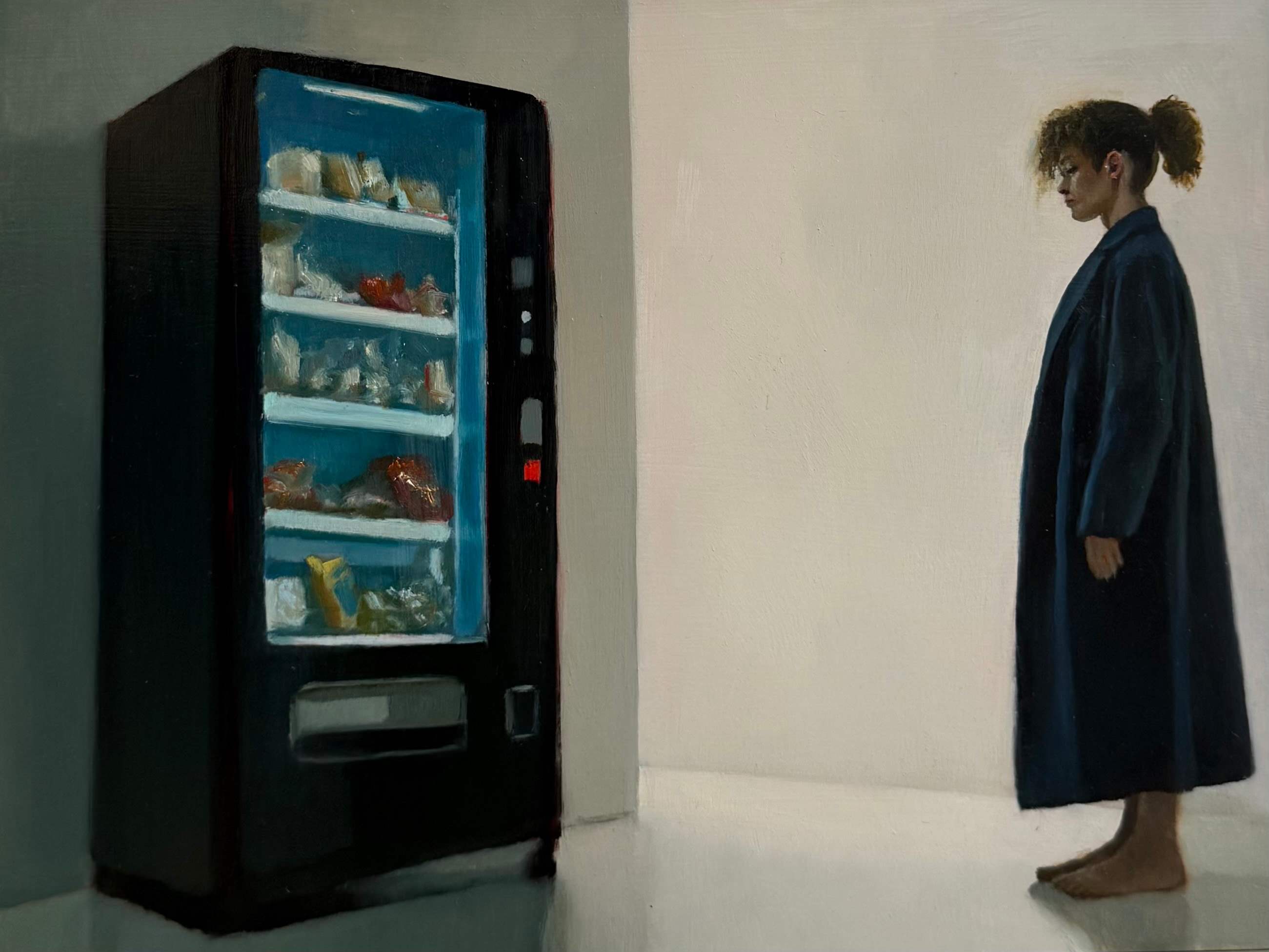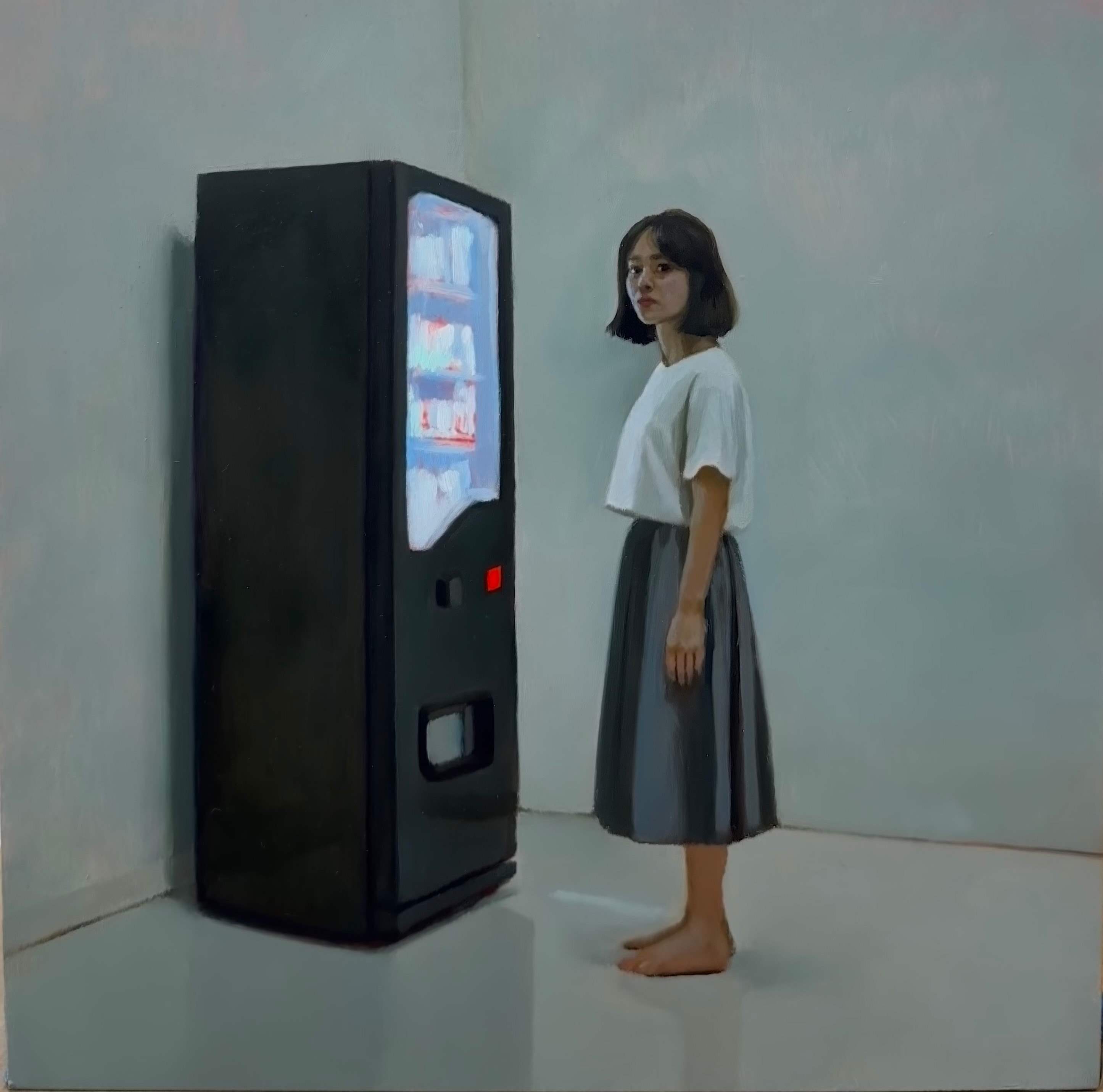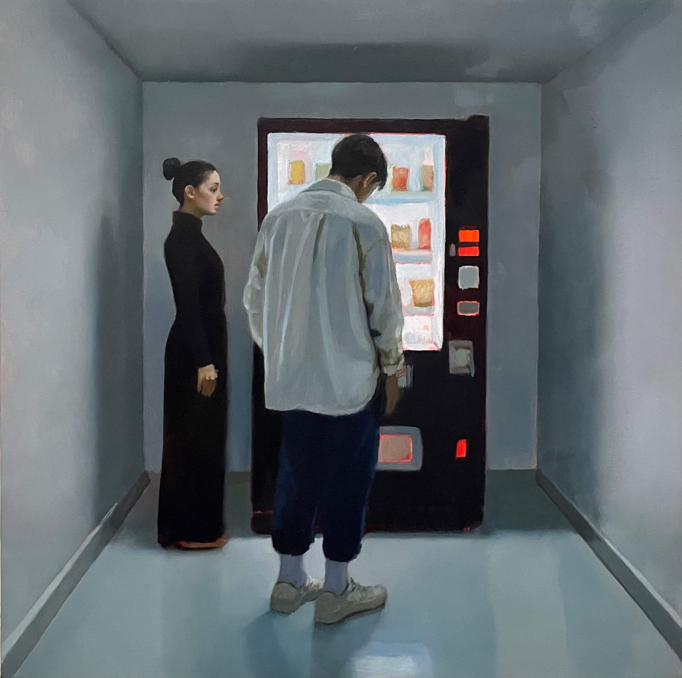 Vending machines also appear familiar— they represent modern convenience and immediate satisfaction. They become objects of desire, offering a safe and concrete way to satisfy one's longing. Yet even the bright, glowing machines fail to provoke a response from the figures.