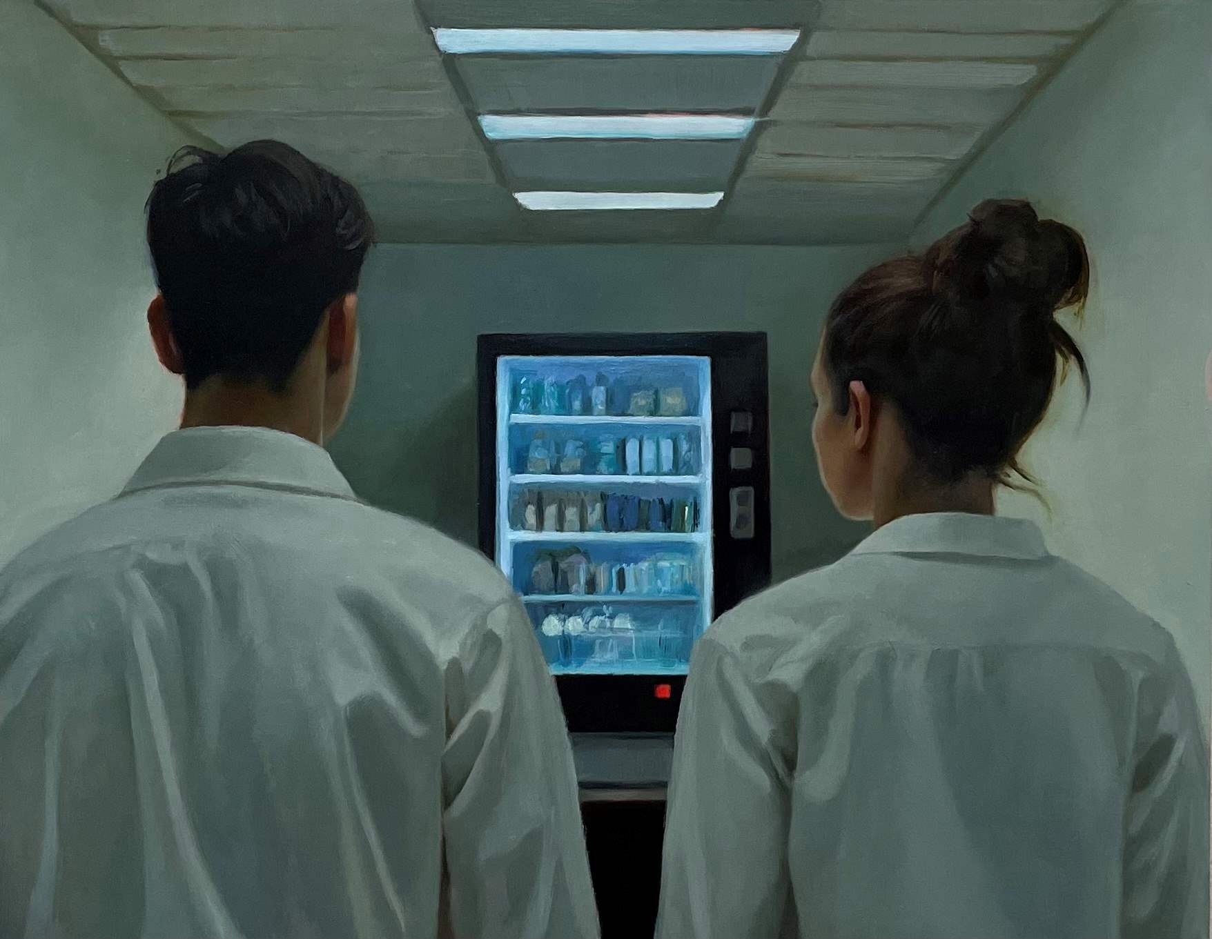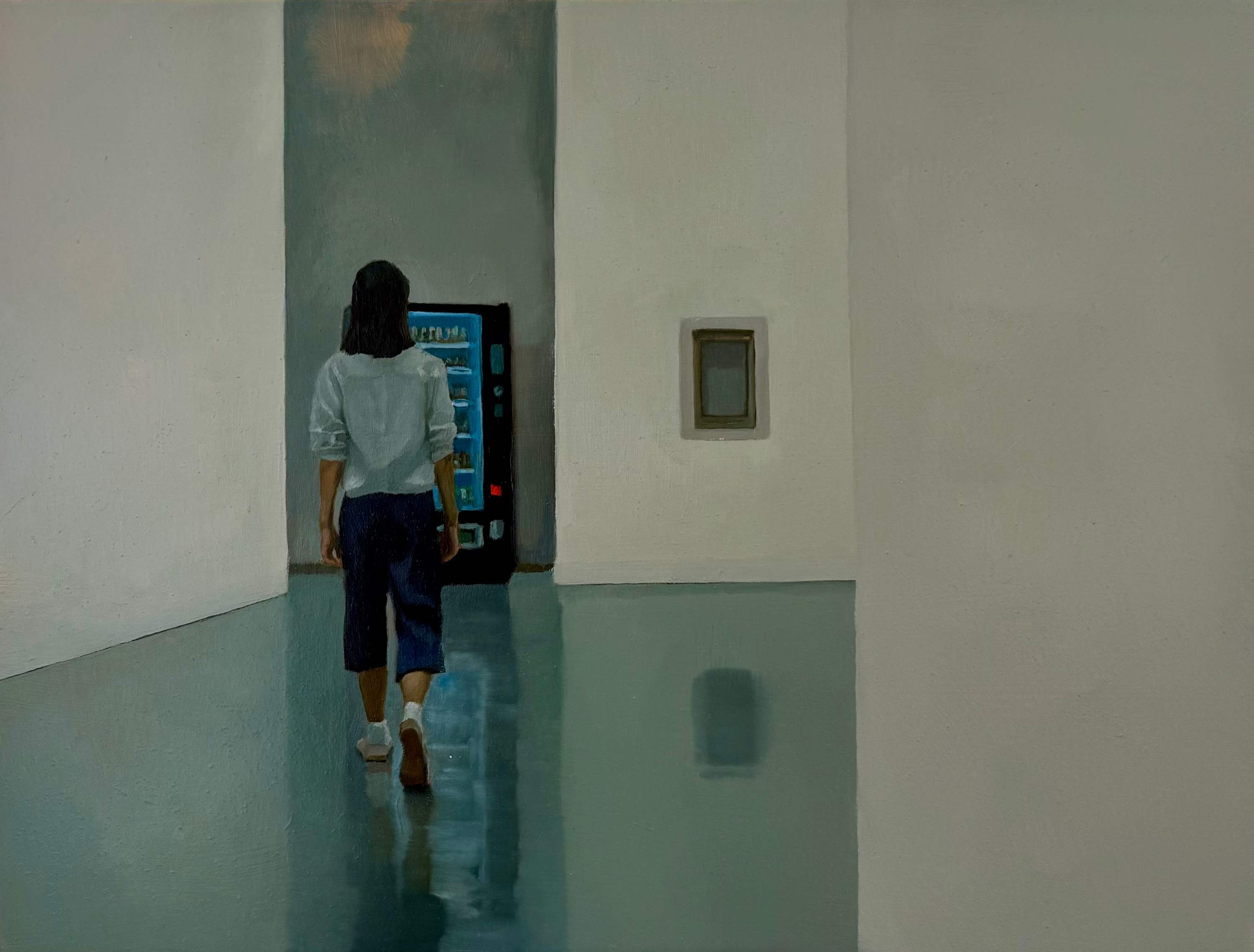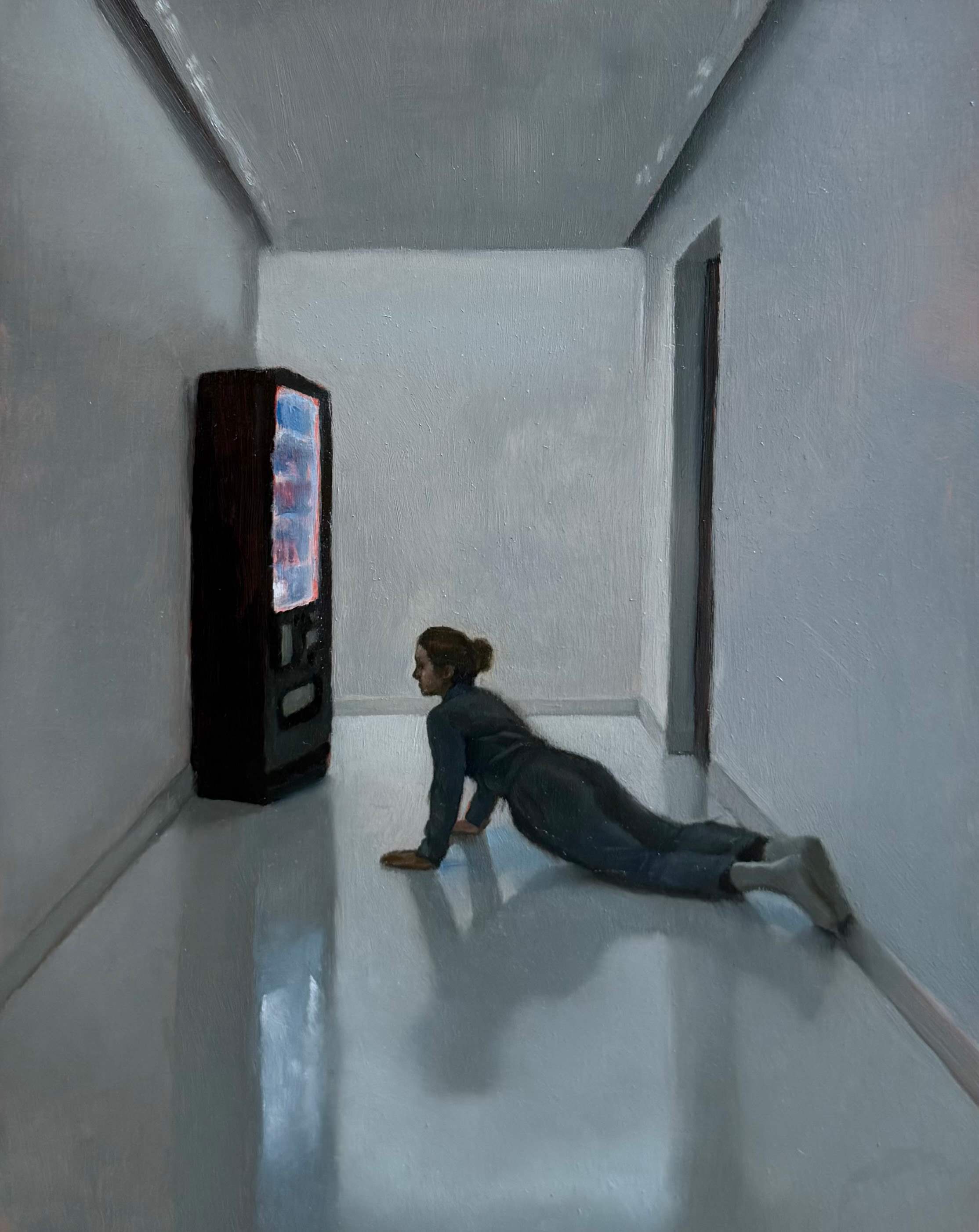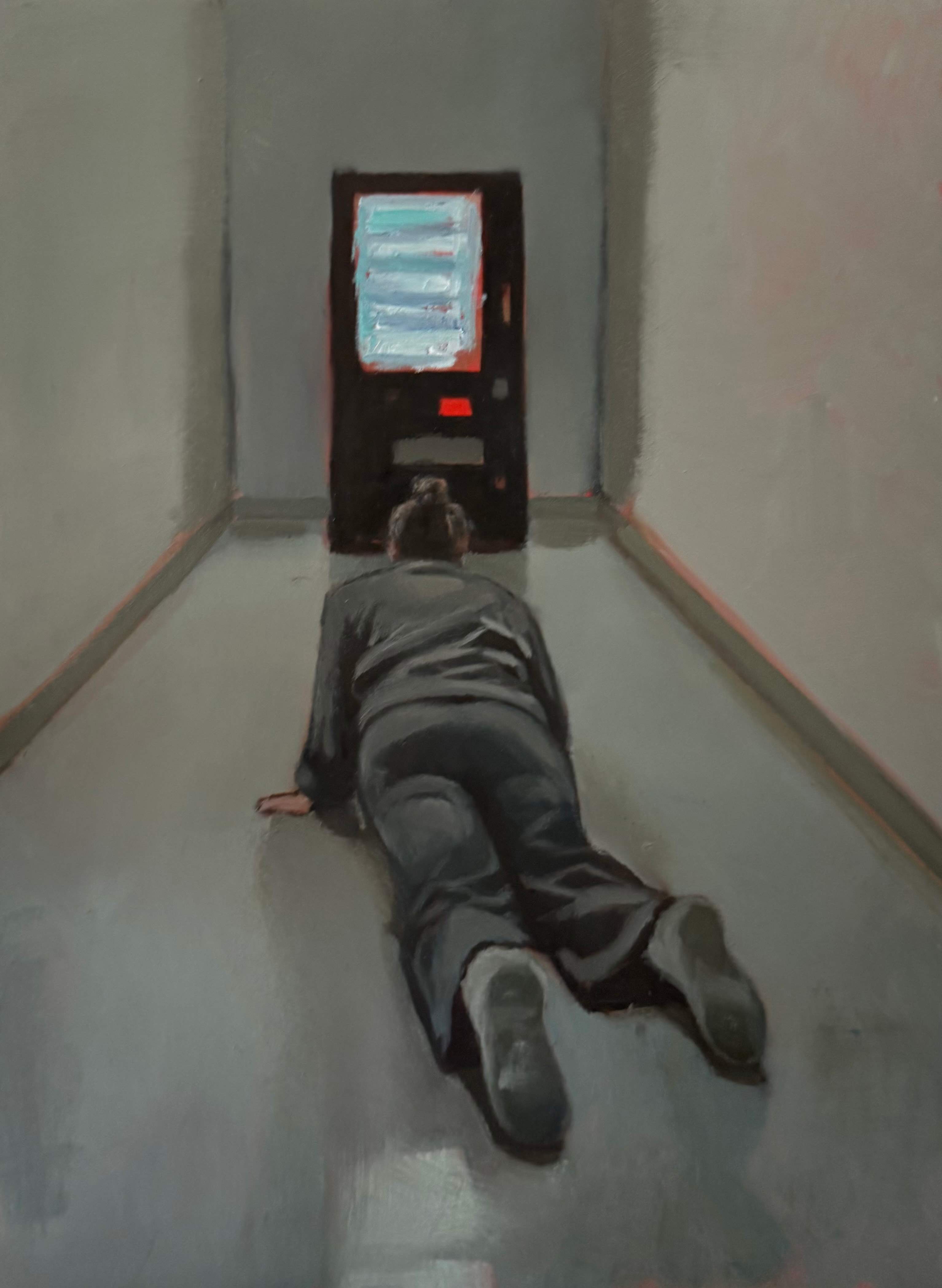 Vending machines also appear familiar— they represent modern convenience and immediate satisfaction. They become objects of desire, offering a safe and concrete way to satisfy one's longing. Yet even the bright, glowing machines fail to provoke a response from the figures.