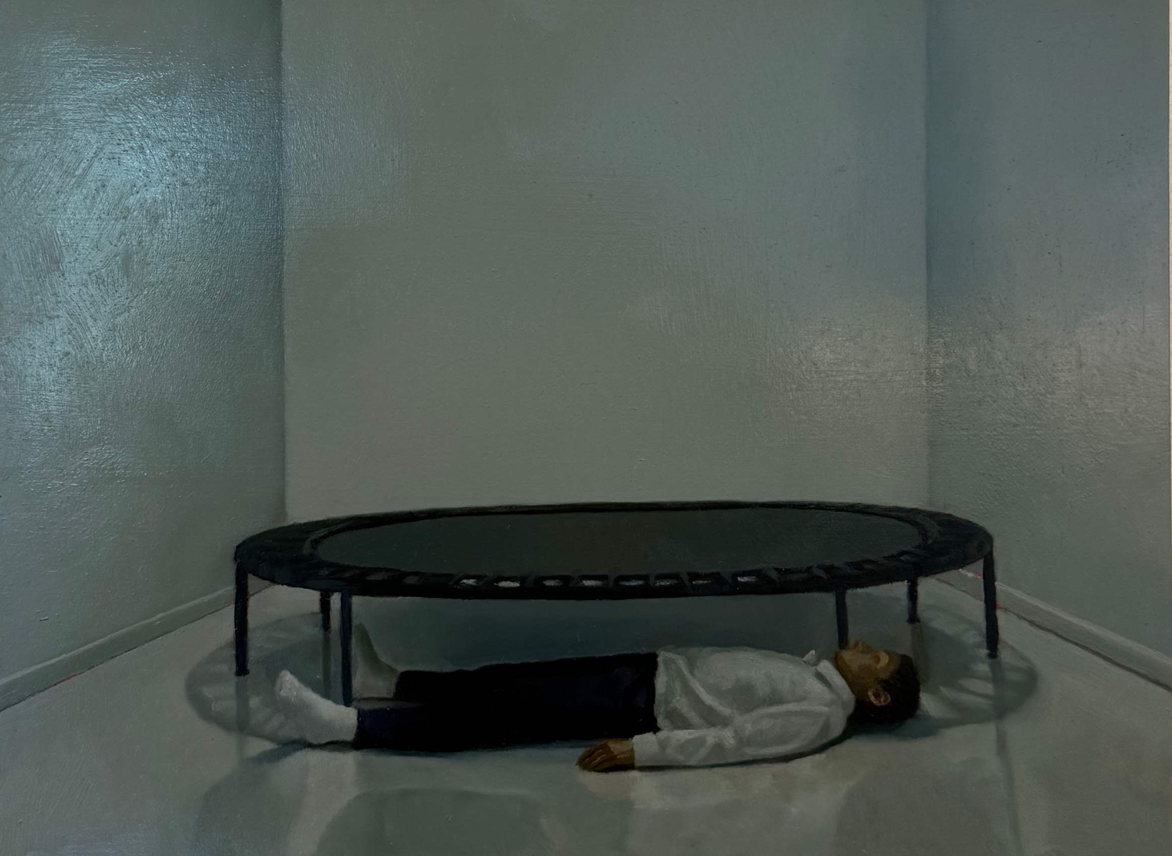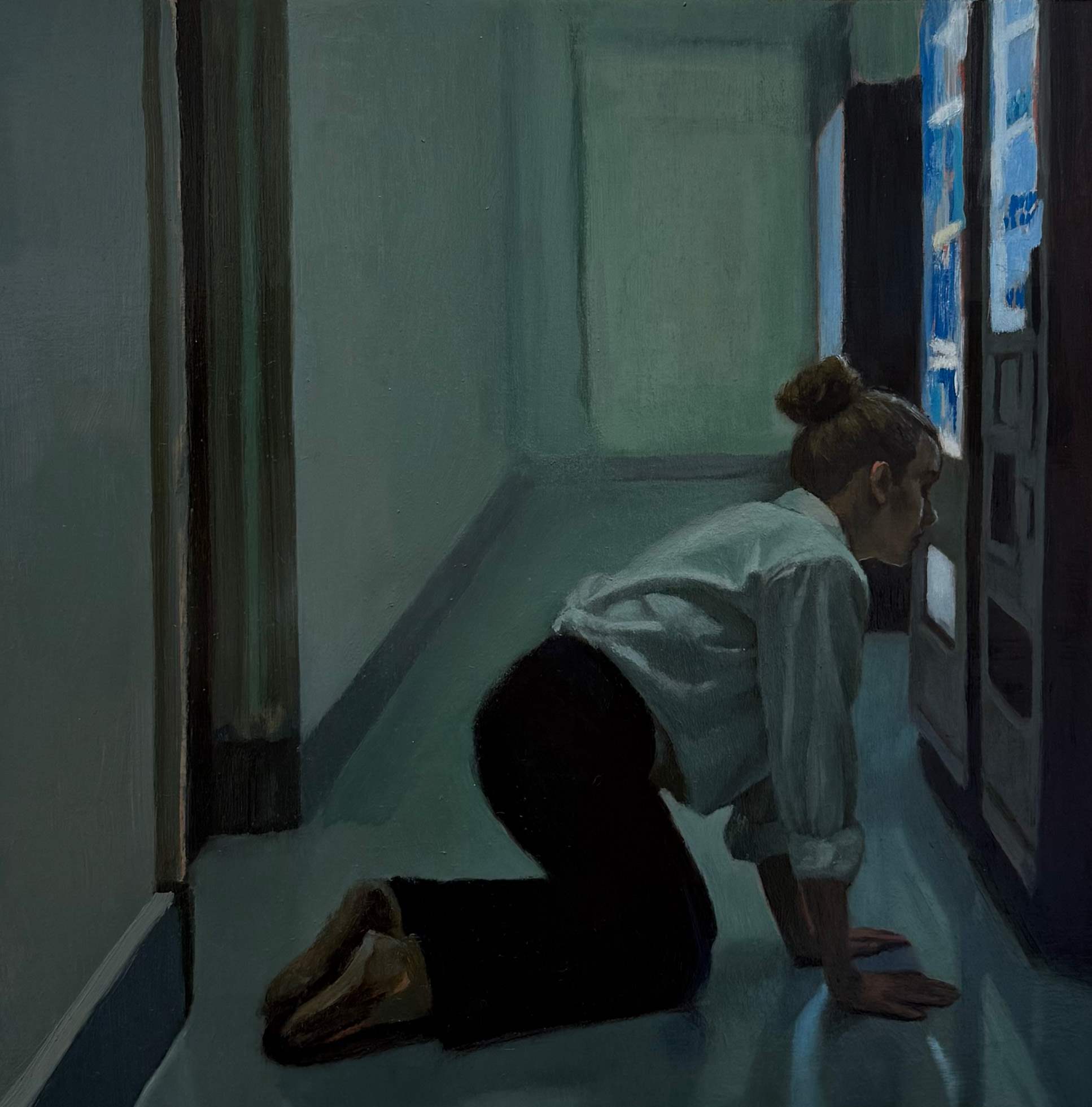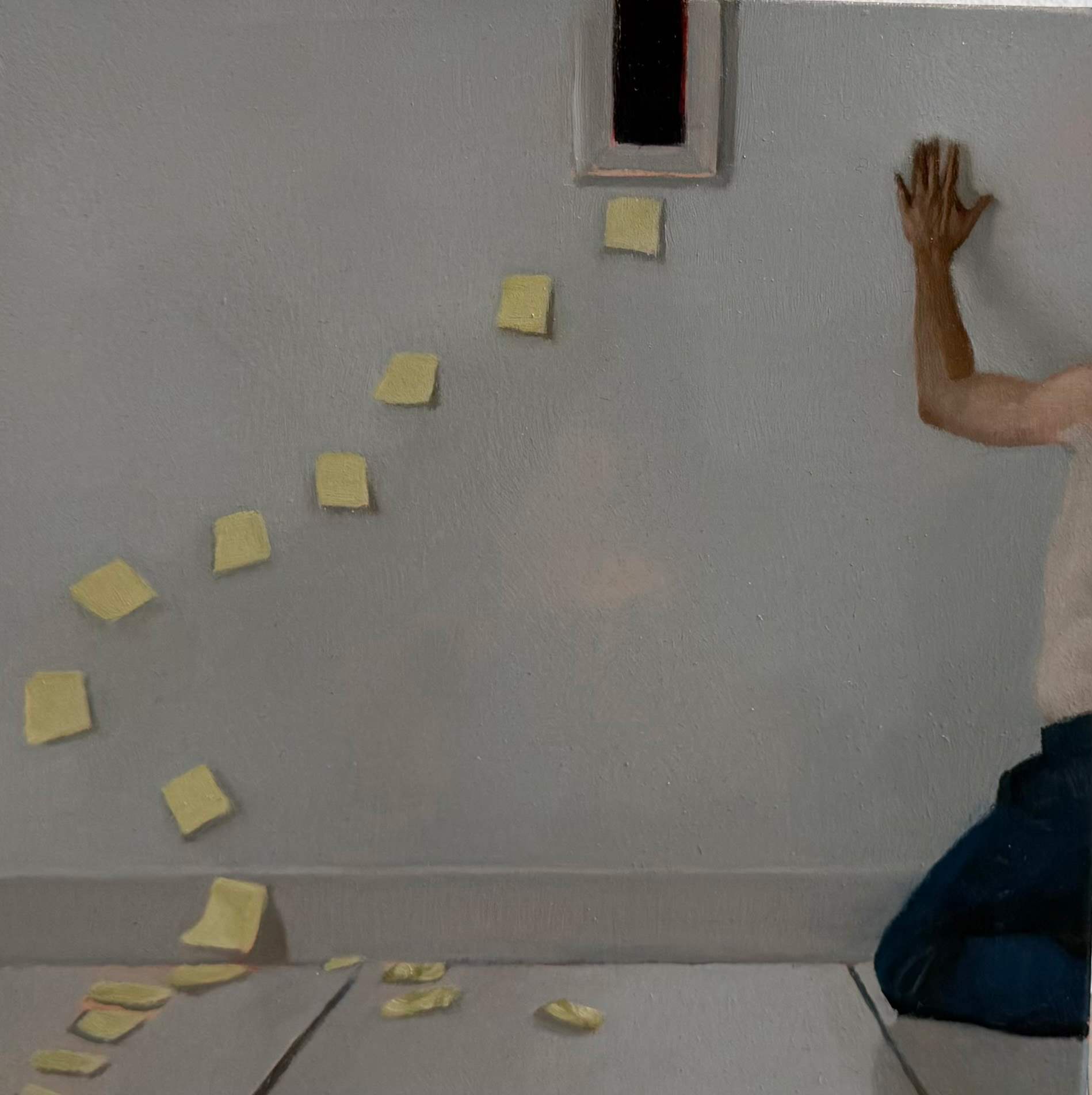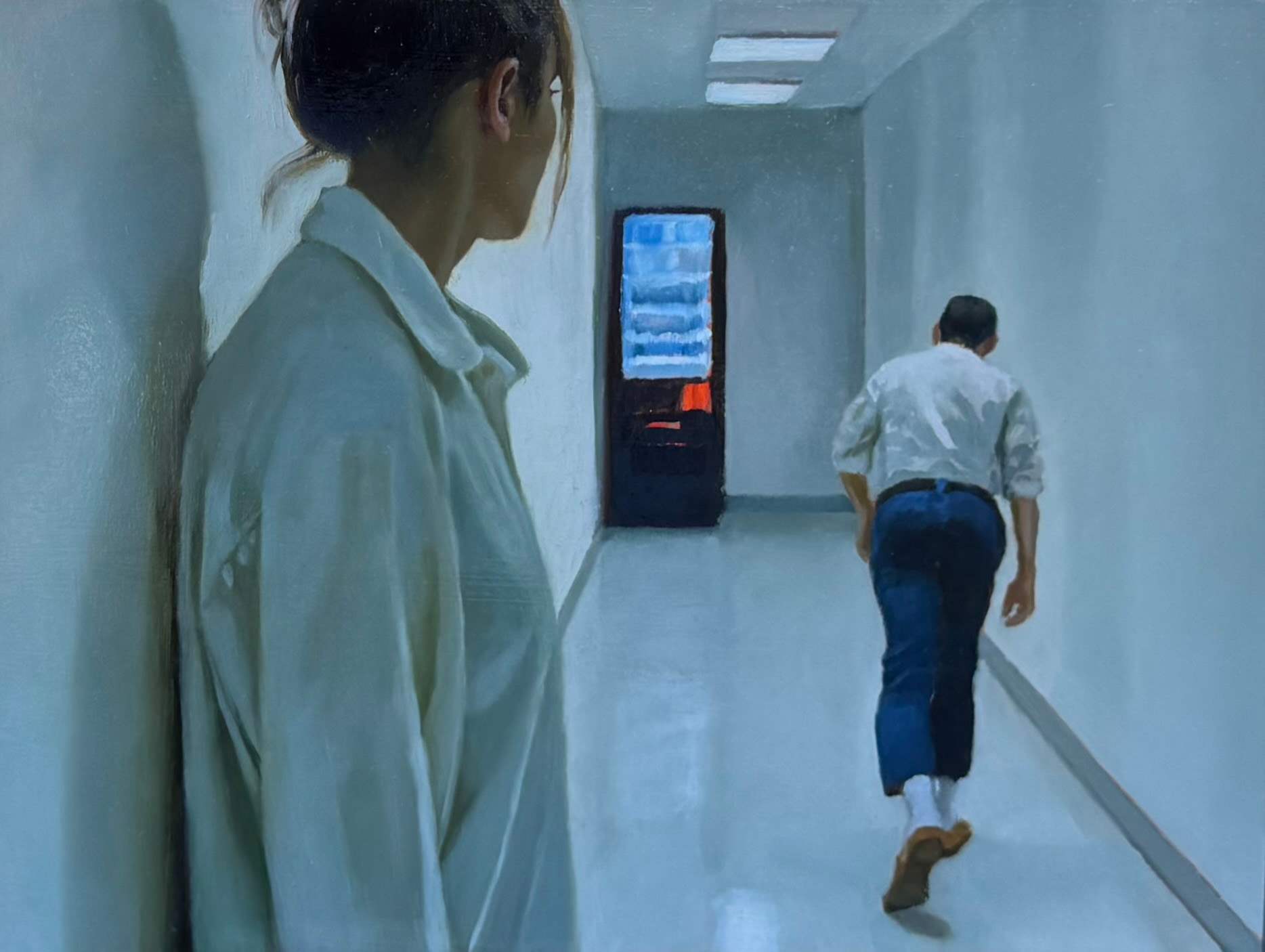 The characters in Orcutt’s paintings often occupy small spaces with low ceilings or narrow hallways — rooms that evoke a sense of limitation, spacet hat could trigger claustrophobia but yet, there is no real reason to be afraid.
