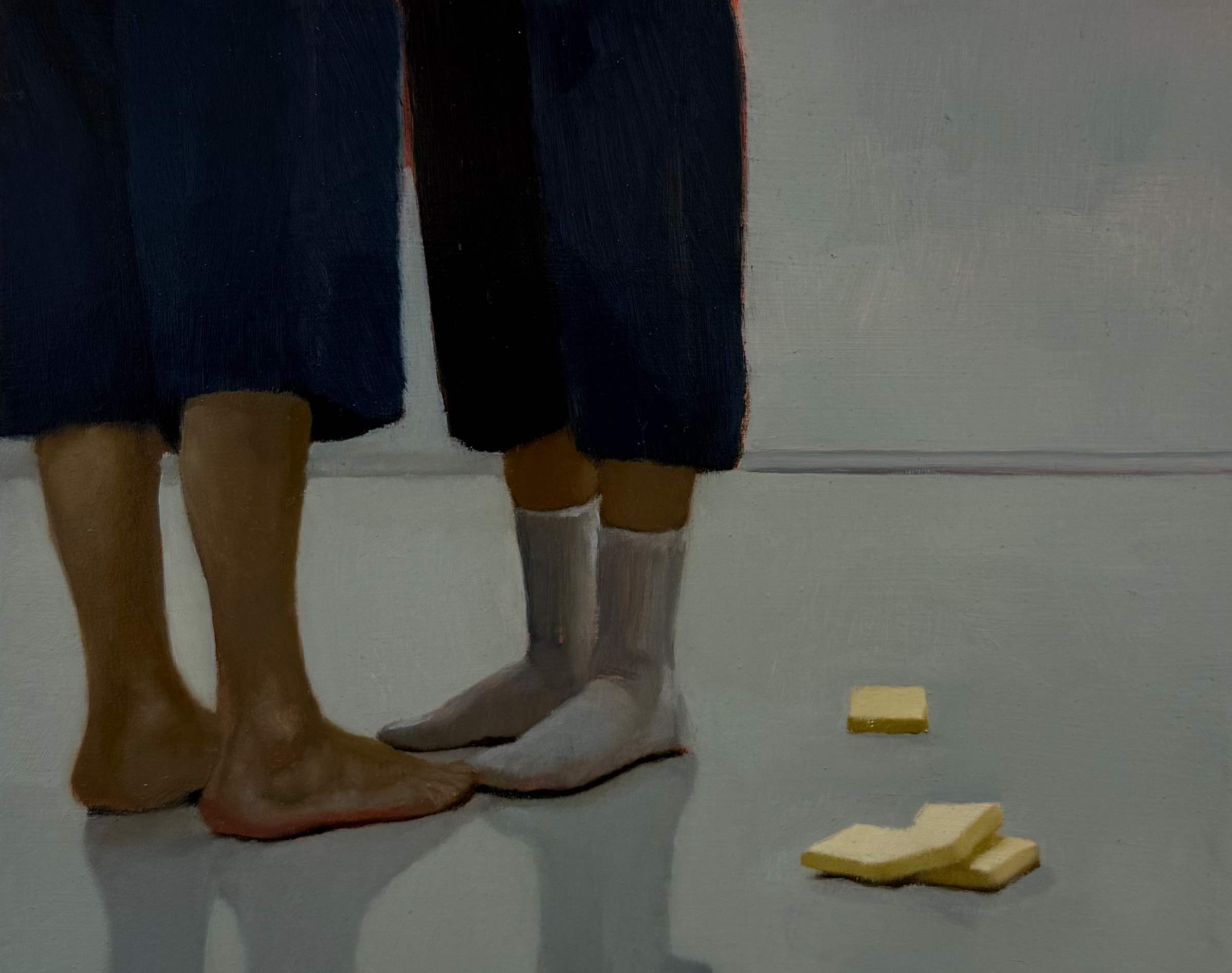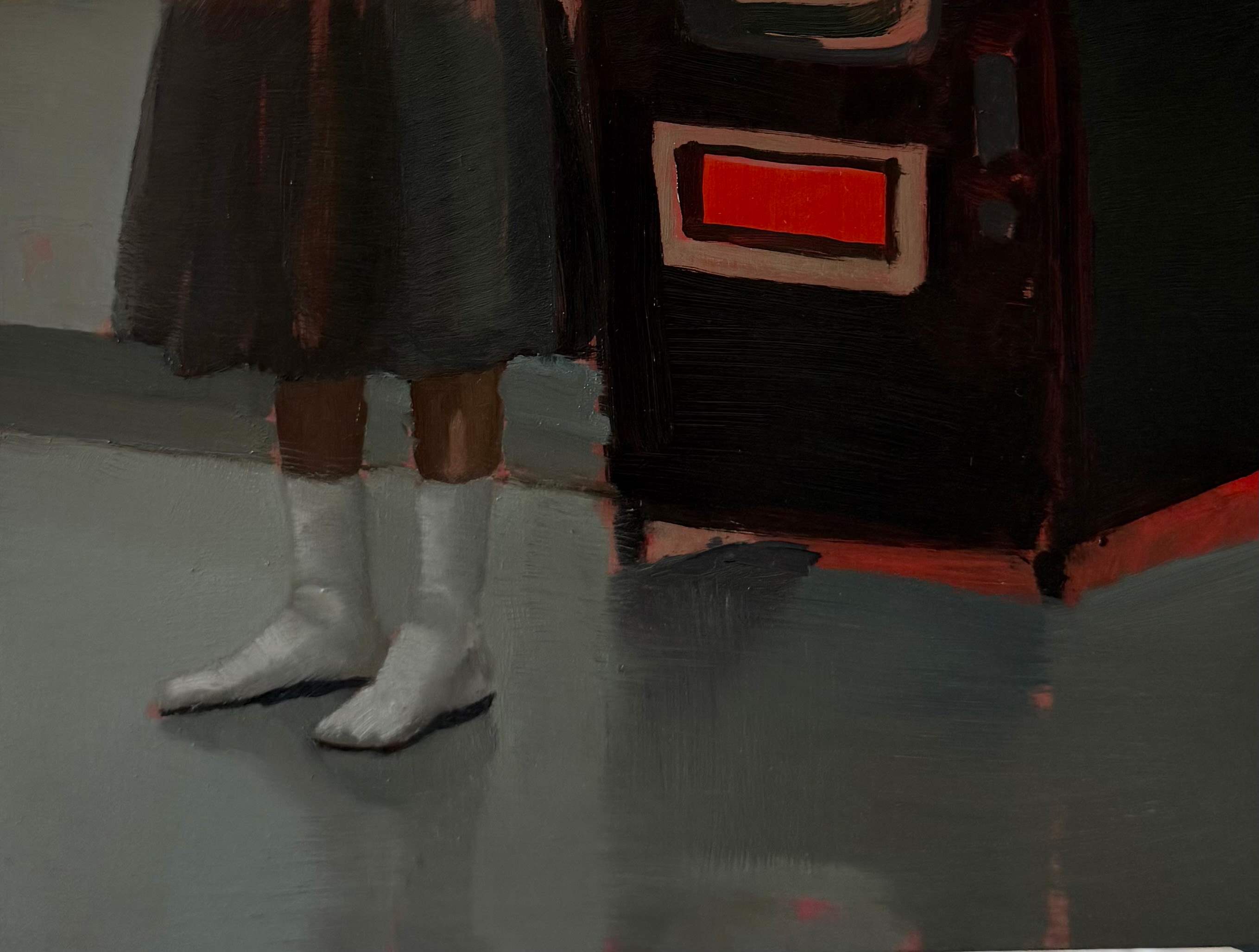 Longing is a recurring theme throughout the paintings — a longing that feels both fundamental and open-ended. It might be for connection, love, food, or perhaps an escape? But this longing is also repressed, as if acting upon it comes with risk or threat. The people seem to want something — yet they do nothing. They stare, they wait, they long for something undefined. Perhaps they don’t even know what it is they’re longing for.