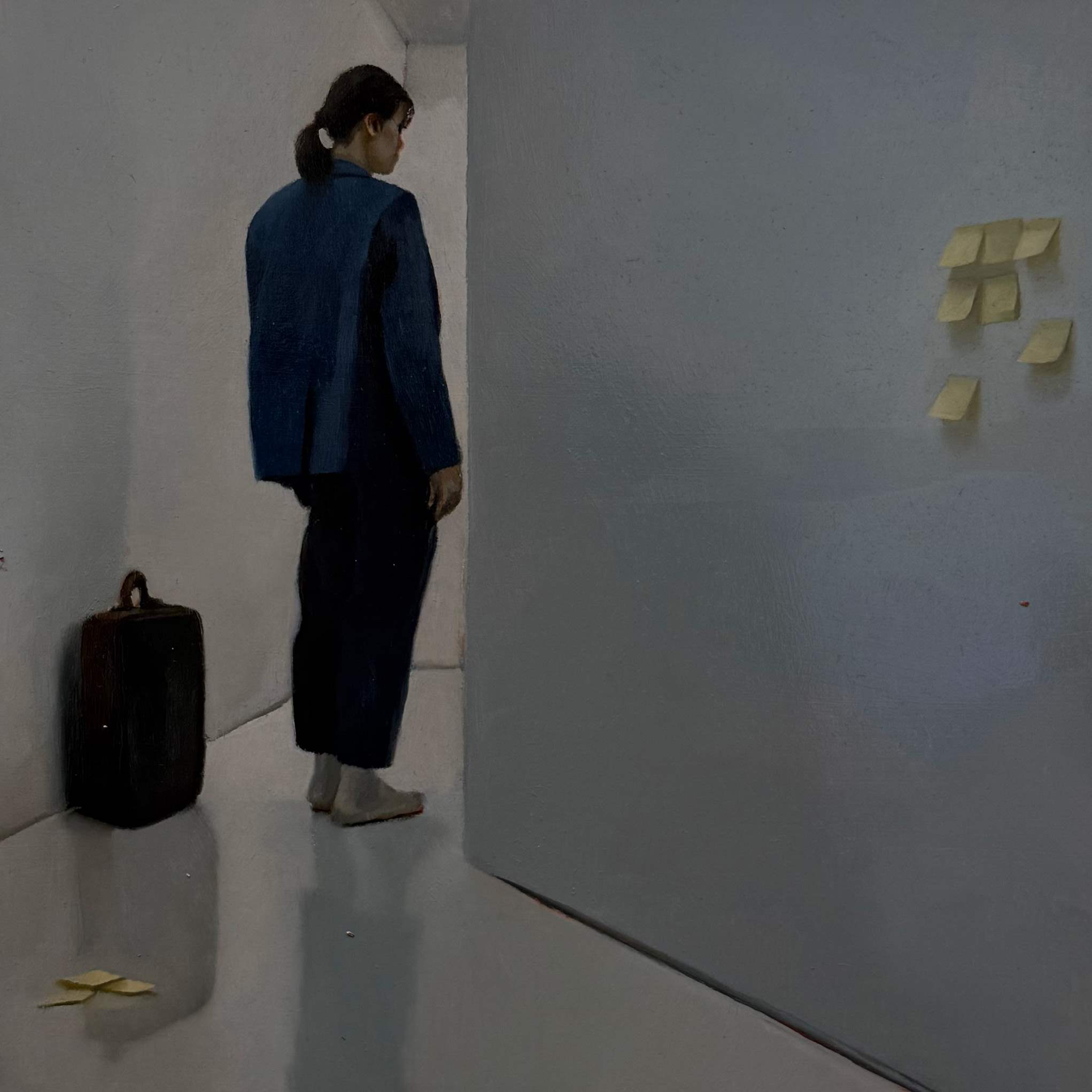 Familiar objects appear — briefcases and Post-it notes — evoking thoughts of work and productivity. But the notes are blank. Perhaps something is forgotten?