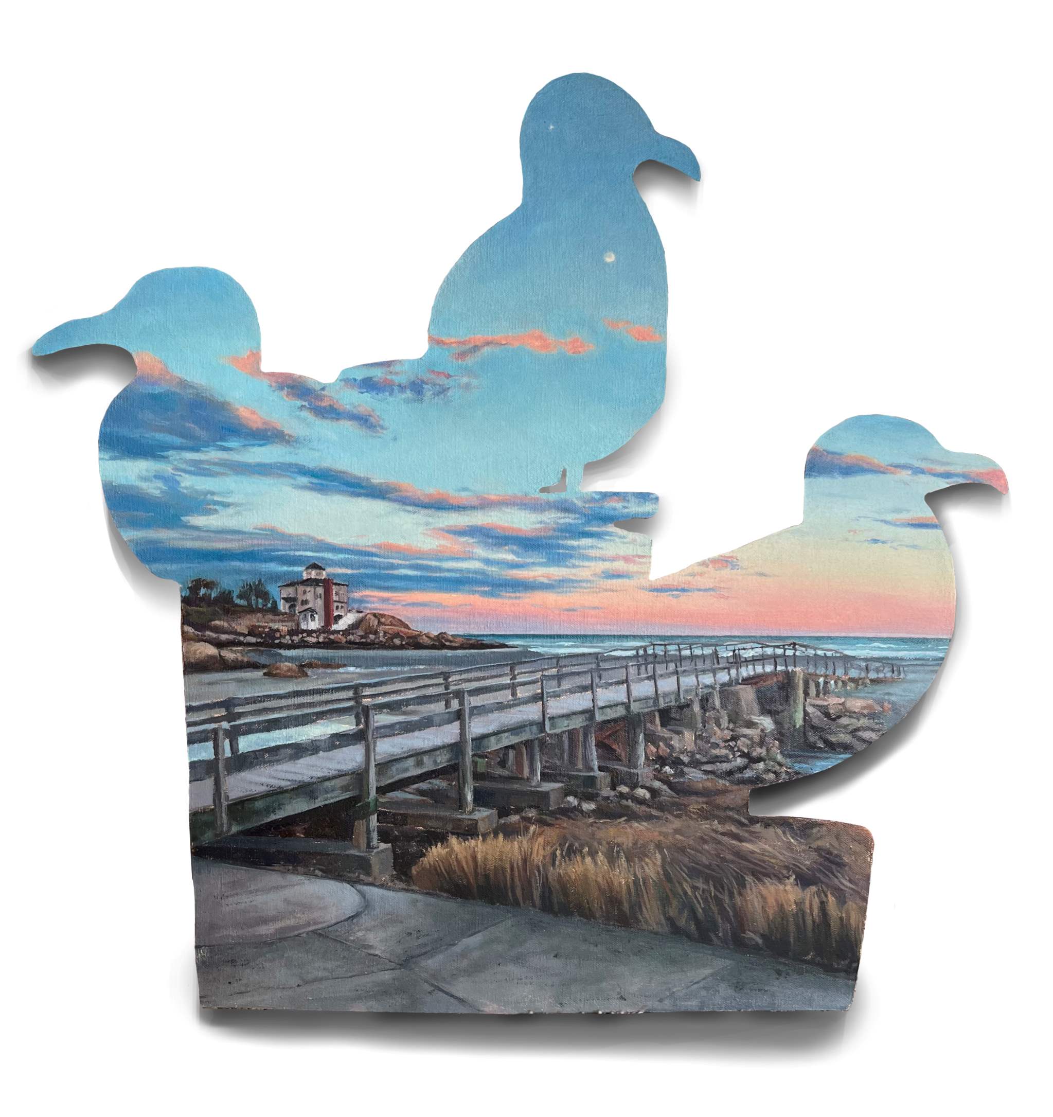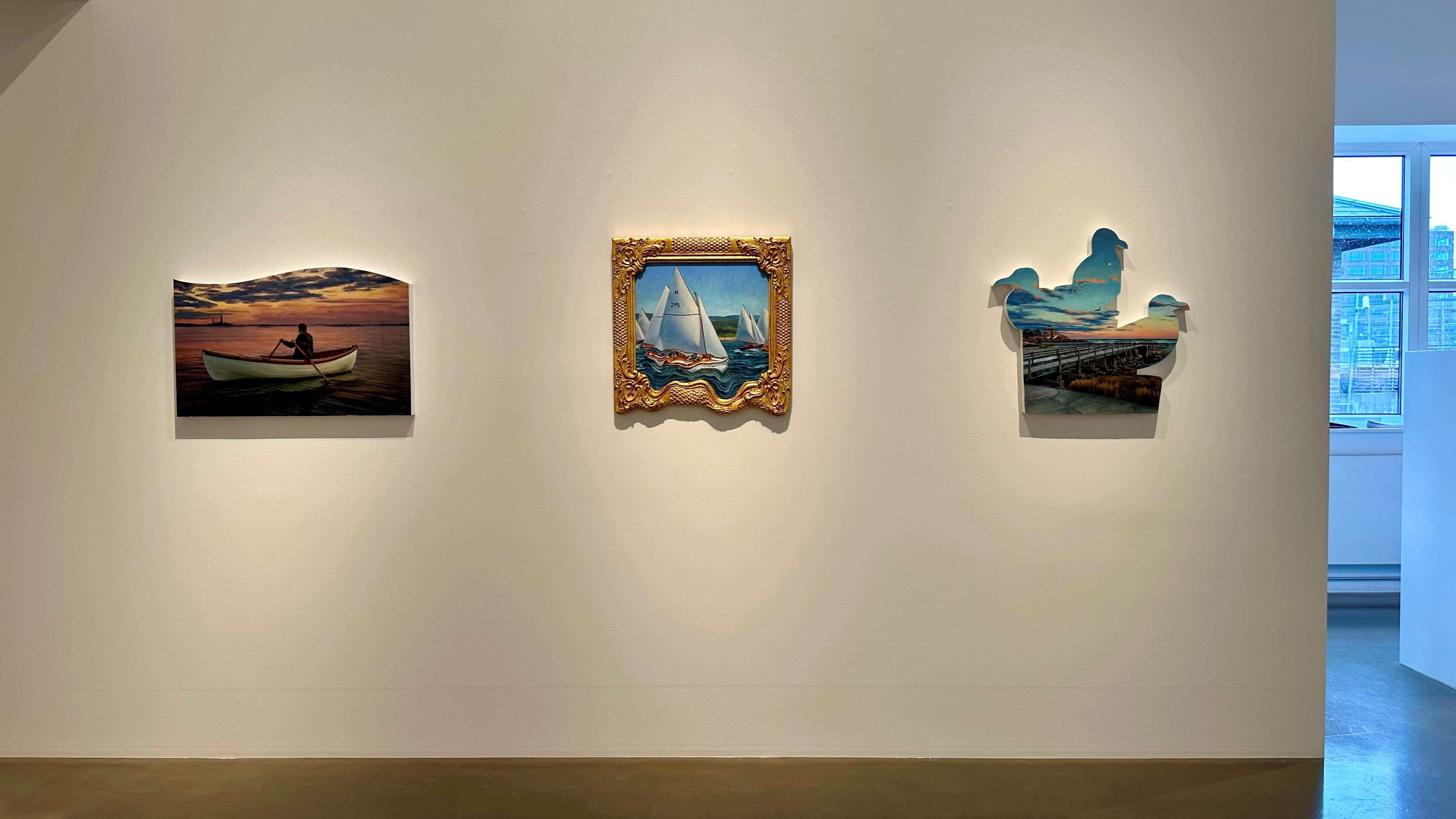 “Placing the sea as a metaphor for the unknown I juxtapose the more traditional painting language with a modern twist with the manipulation of the canvas shapes and frames. My thought process behind this stems from our relationship with the rectangle. The rectangle is a symbol I see as something more than a basic geometric shape. Rectangles have become a symbol that follows us within our daily lives through mirrors, cell phones, tvs, etc.I see this as a mere redundancy that I want a break from. I have always been drawn to irregular, complex and changing environments.The canvas shapes take on images associated with the sea itself while interplaying their role within the painting and design. The process of making the canvas adds on an extra quality of ingenuity and creativity that I find appealing as it reminds me of the days stuck at sea having to think on your feet in case something breaks and you don’t have parts to replace it.”