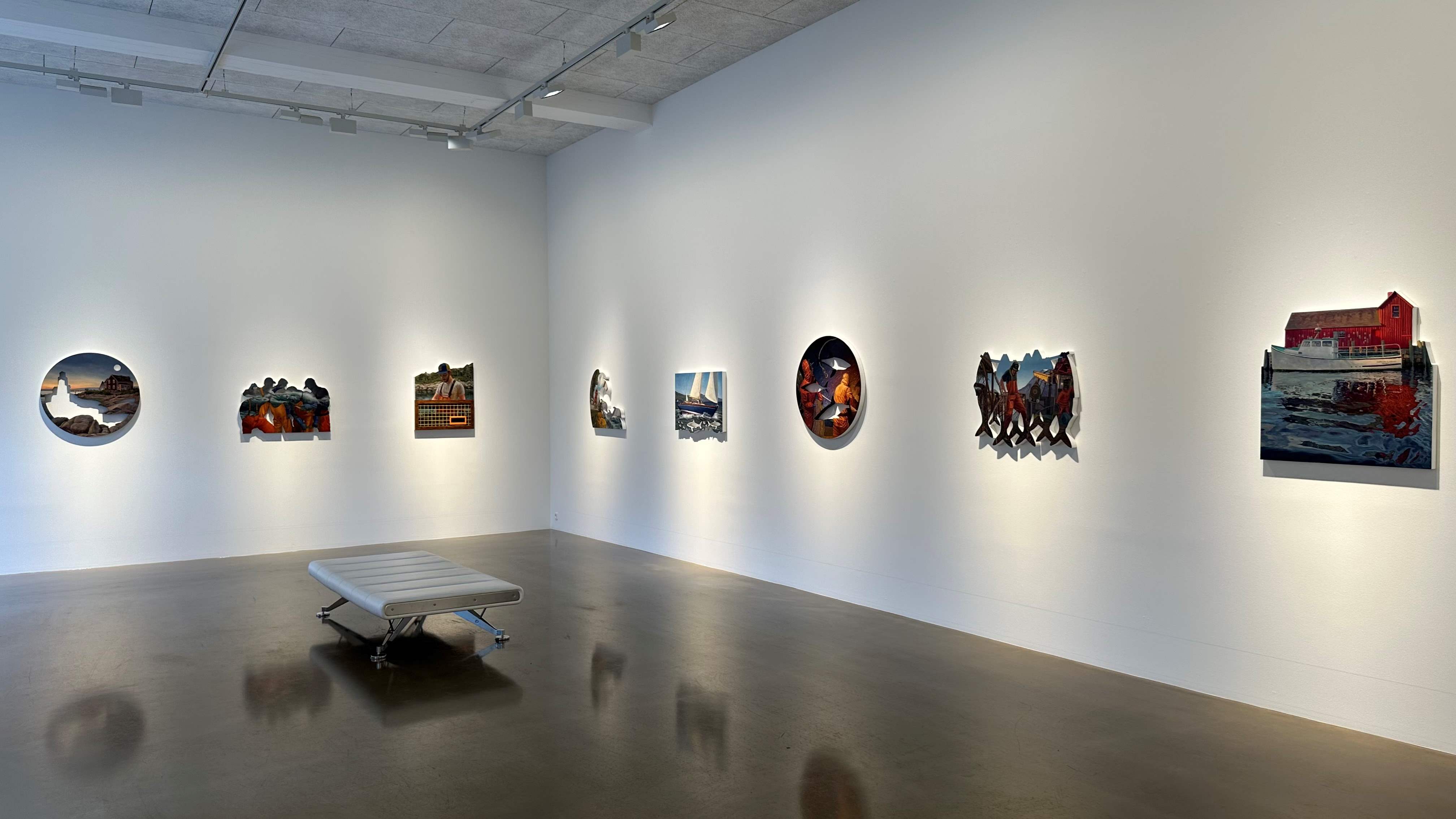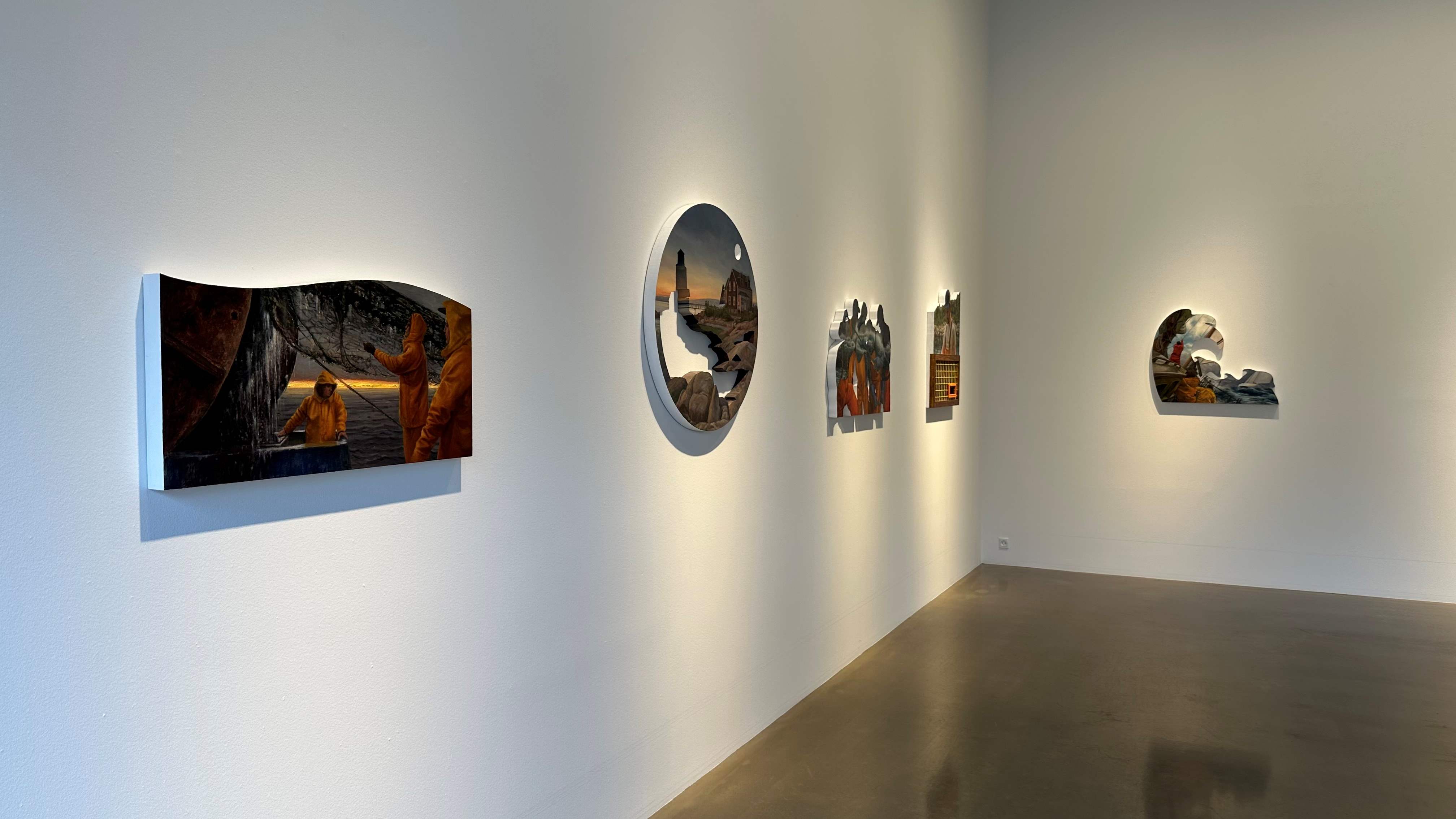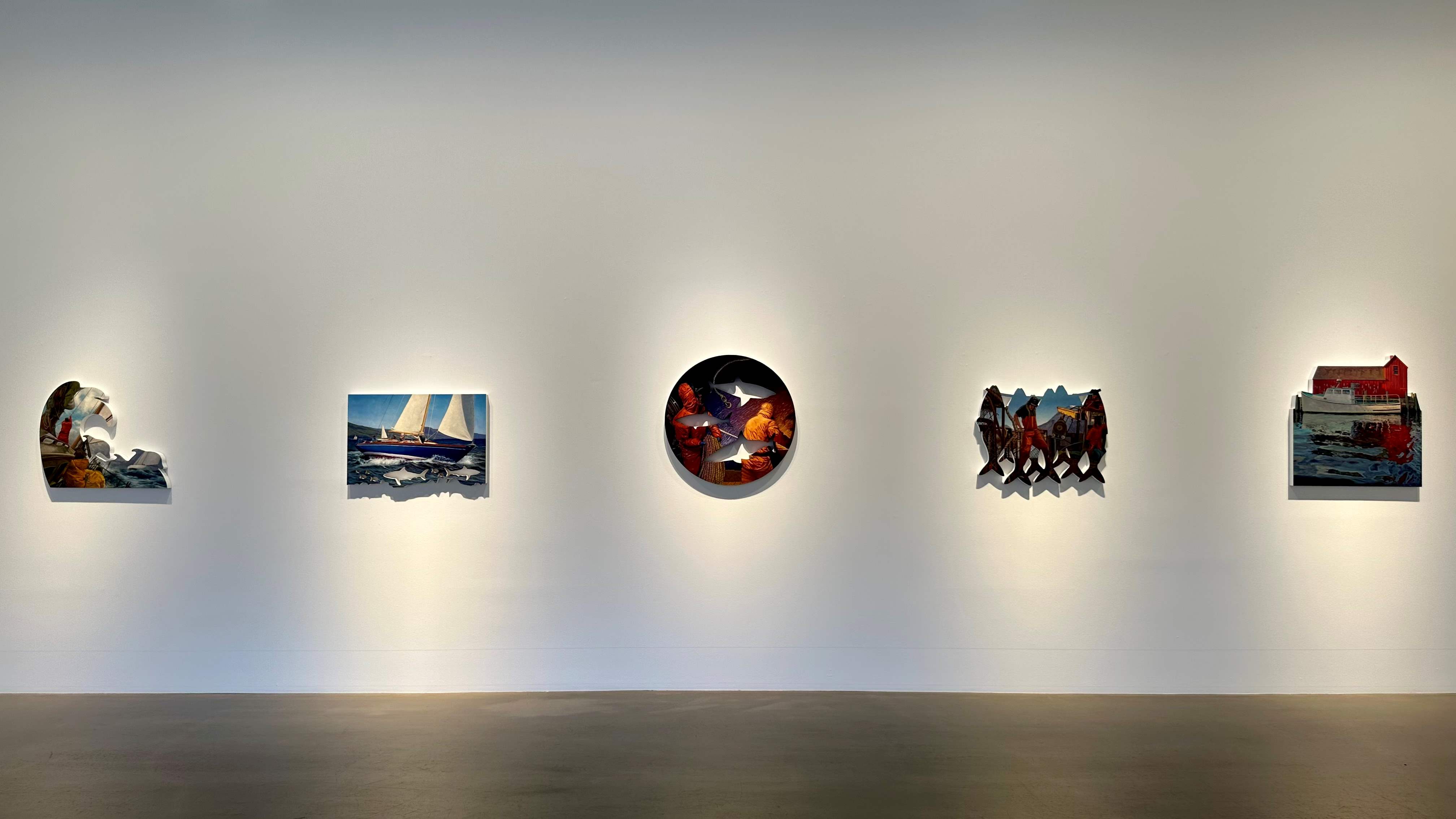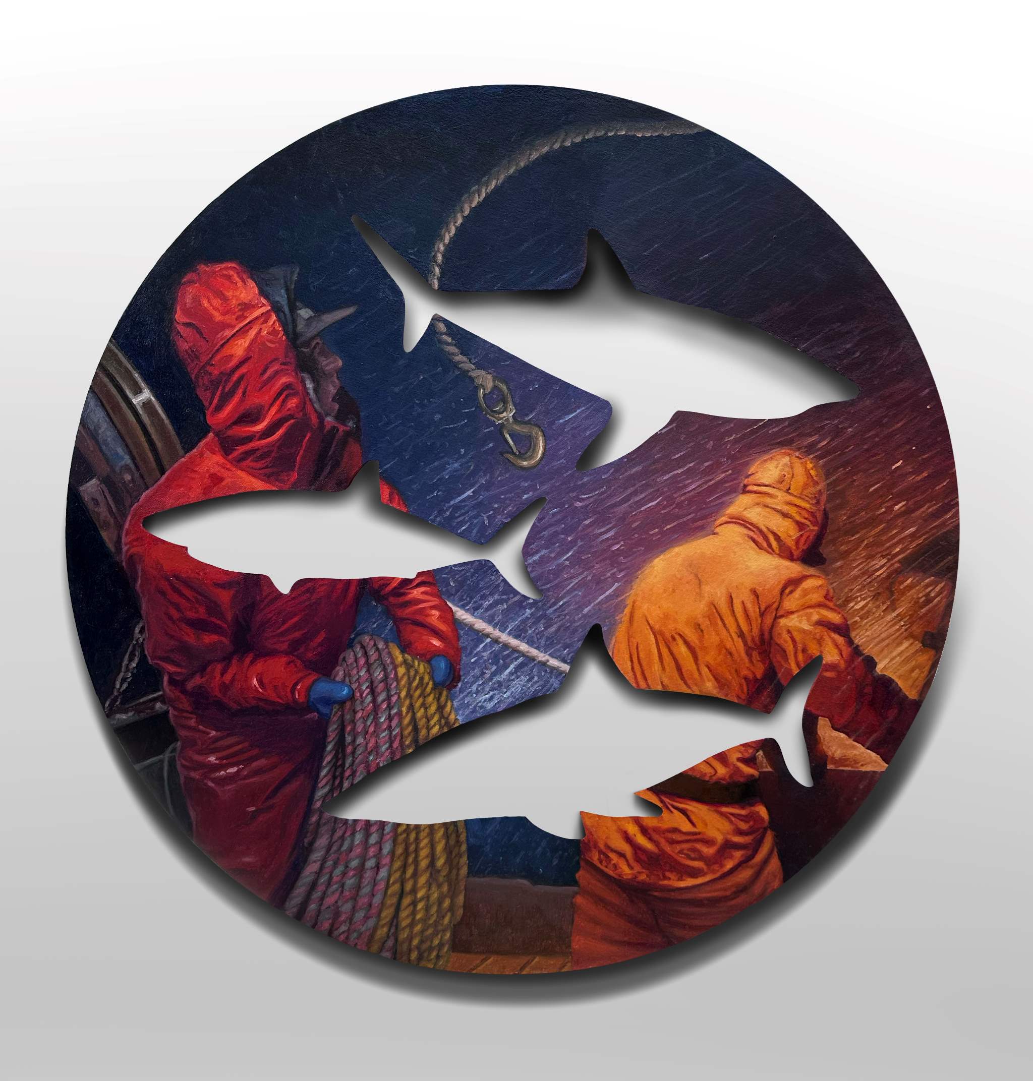 The exhibition “Holy Mackerel!”, which is named after Ryan Davis’ father’s boat, features works that represent Davis’ first-hand experiences and passion for the sea. Not only do they aptly capture the essence of the tides moving in and out, the light bouncing off the waves and the drastic weather changes of the ocean but they also serve as a powerful representation of the livelihood the sea provides, the day-to-day struggle of the fishing community and the massive feat of getting seafood onto a plate. Davis’ artwork observes humanity’s interaction with the ocean and its role as a vital food source, as well as being a significant body of strength, power, beauty and force – indicating a relationship to be sustained and preserved. Encapsulating the jagged, testing and shifting environment of the sea through specially shaped canvases and frames, Davis instills his artwork with a palpable essence of his memories and life experiences, capturing moments that resonate with the senses and reflect his deep affection for his home and community.
