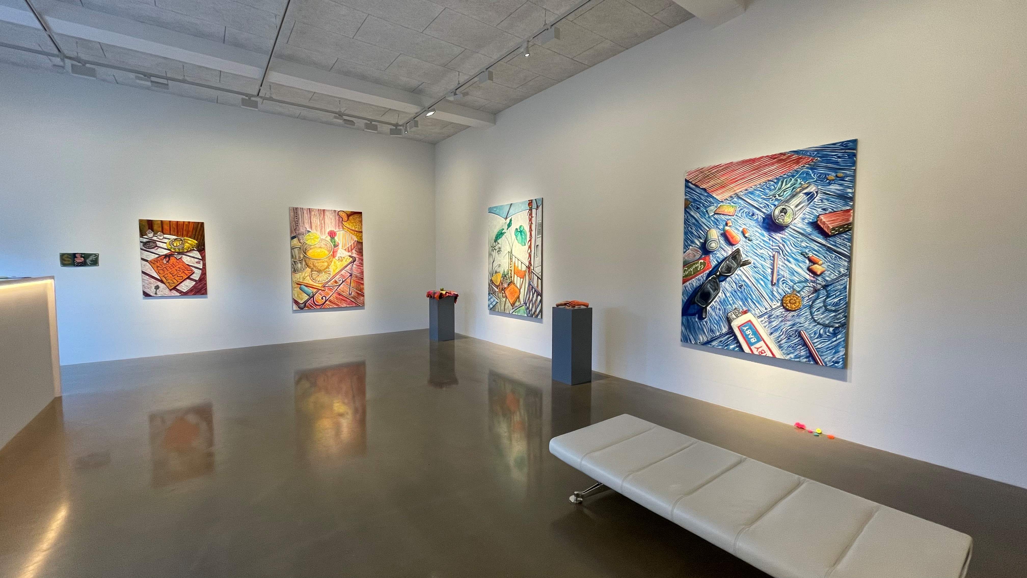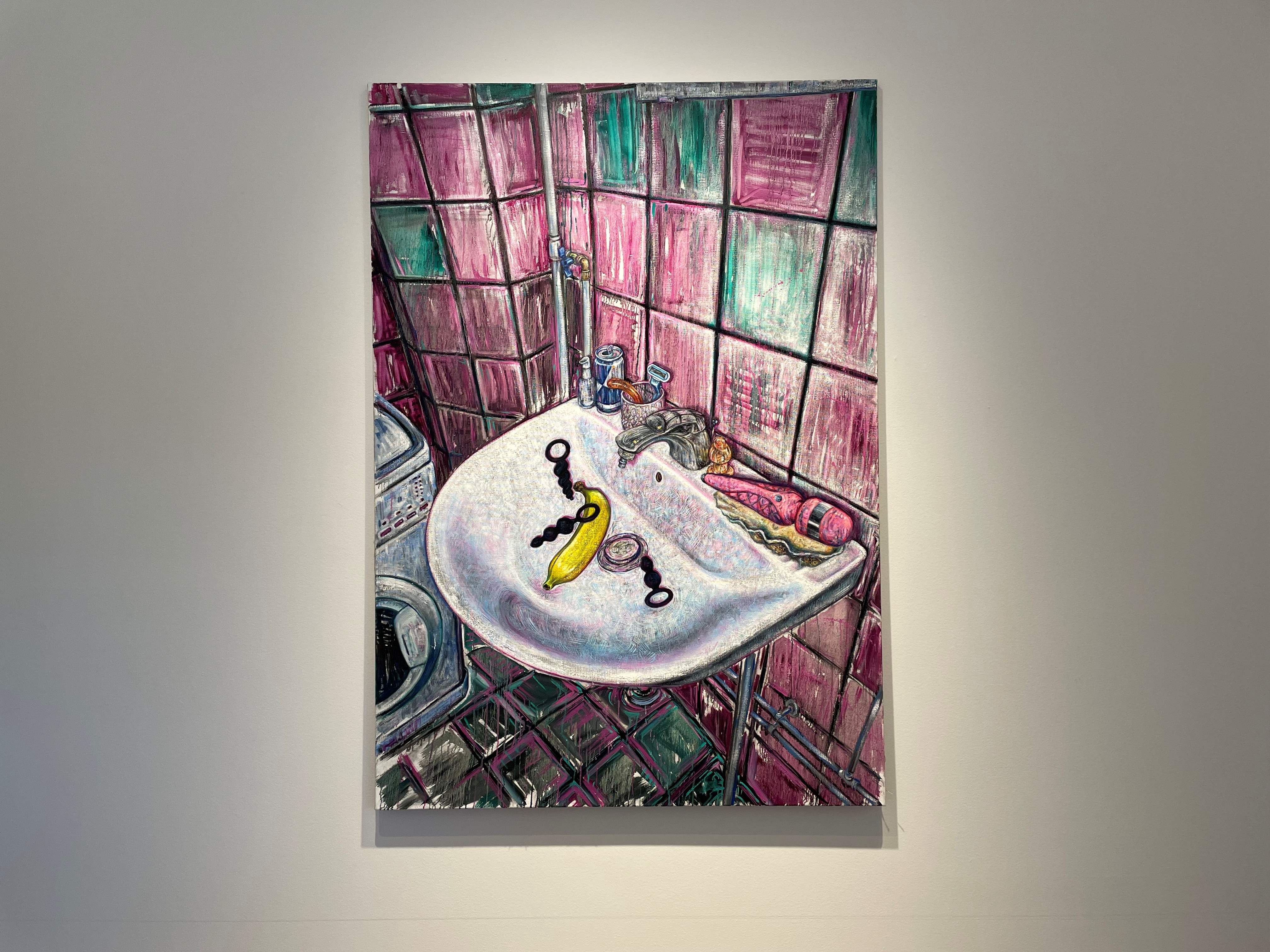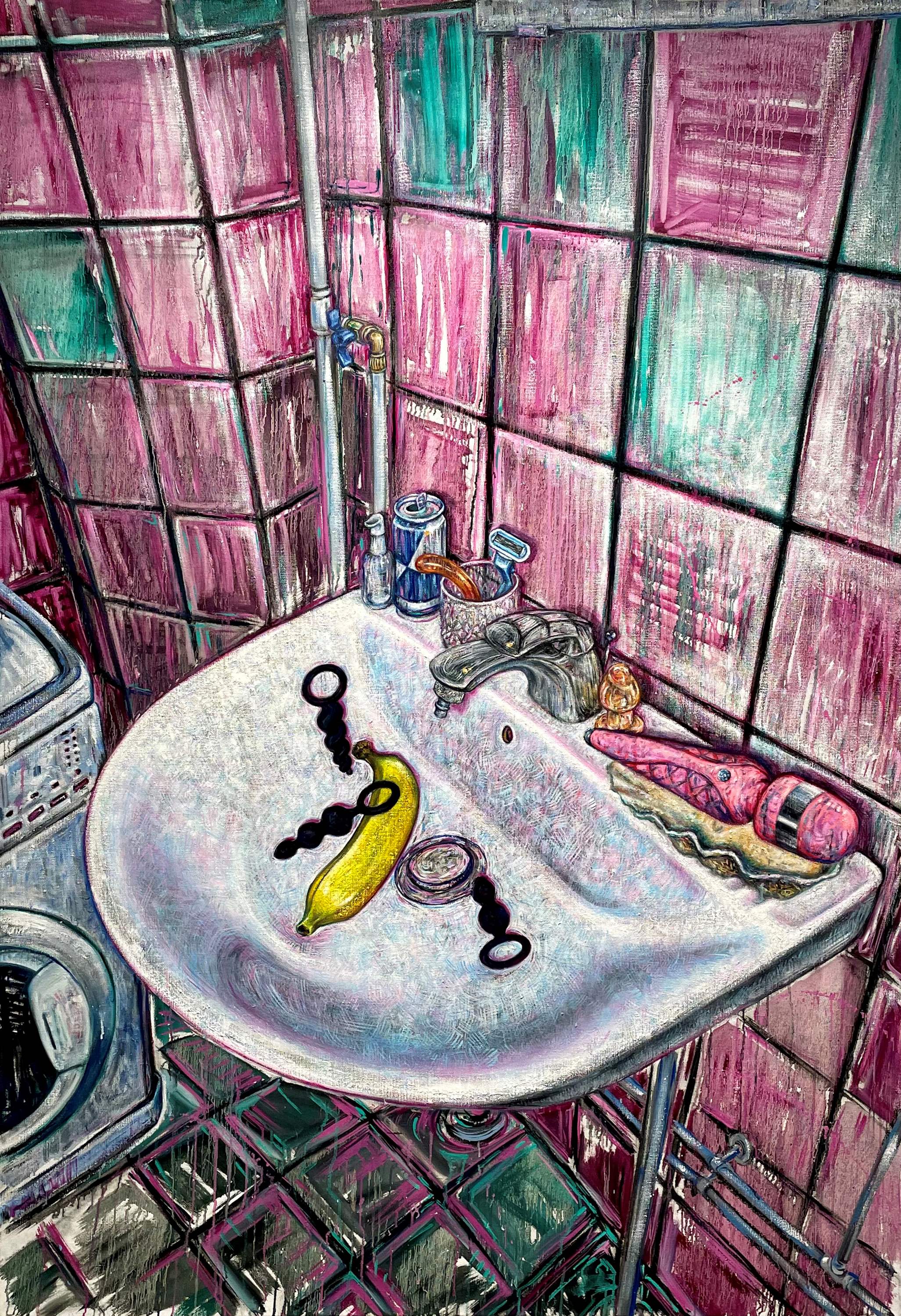 Where Nedbo’s earlier works have often centered around the human figure, the six large and brand-new paintings in the exhibition take a new direction. The paintings work as a kind of object-portraits that all apply the still life genre as the form of inquiry. Here a line of personal snapshots from the reassuring and intimate framework of the home is presented. Through the hijacking of this traditional genre, Tine Nedbo’s new series of works challenge the onlookers’ understanding of how we as humans and individuals inhabit physical spaces and which social and political meanings these intimate relationships entail. Much like the historical still life paintings the mute objects are never isolated but adds to their context as a symbolic representation that welcomes political, economic, and bodily perspectives. The silent echoes of power.