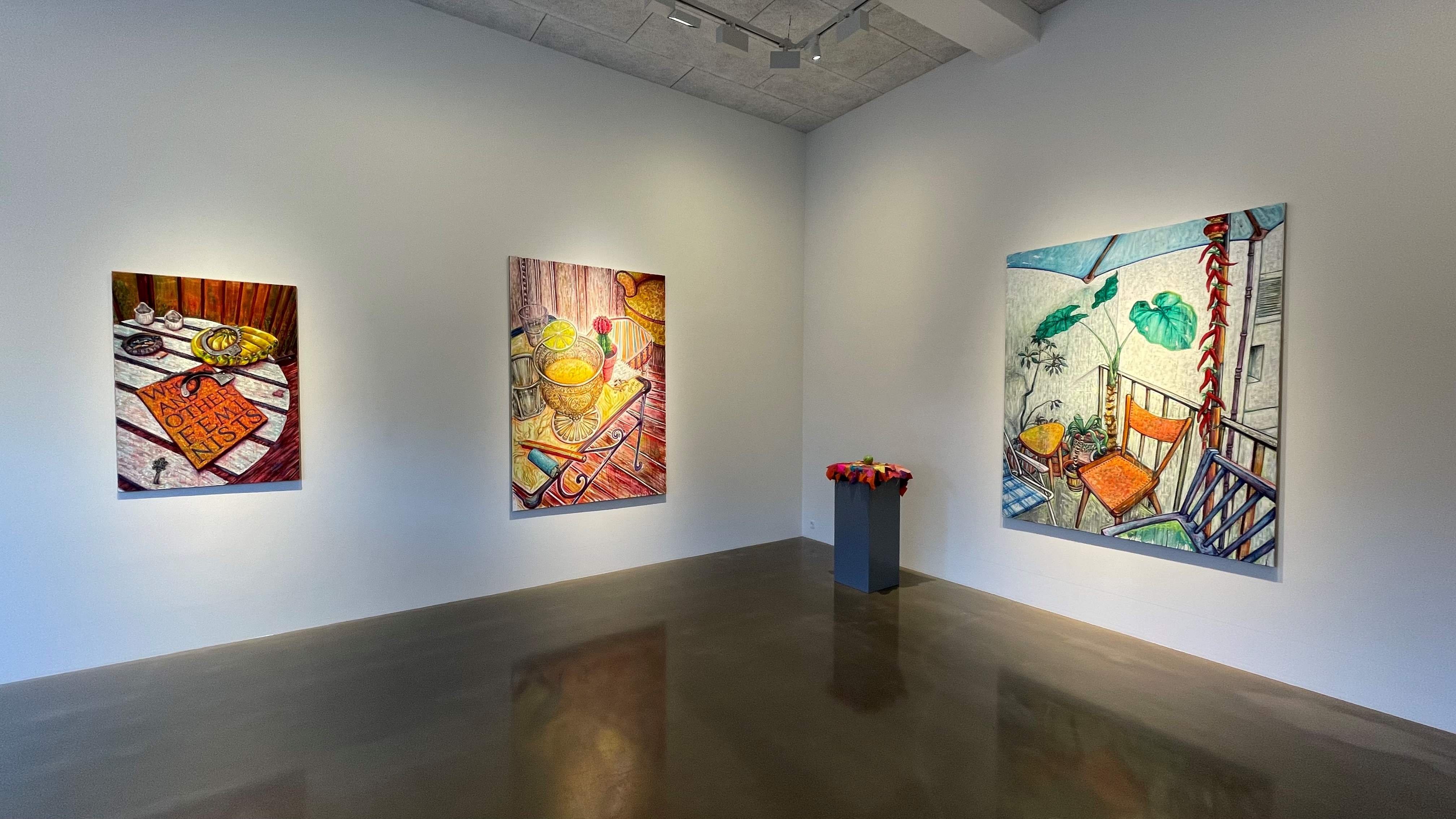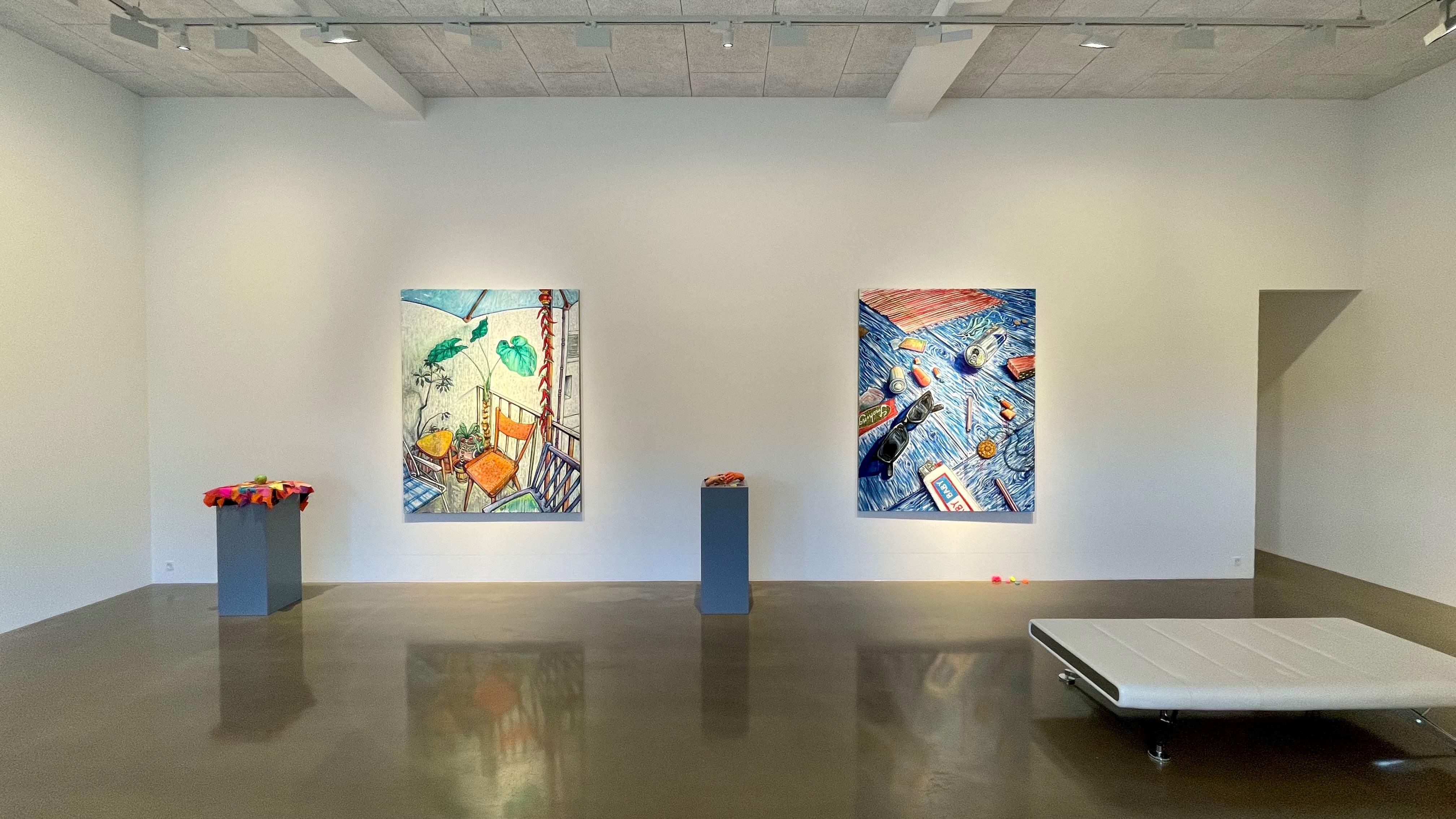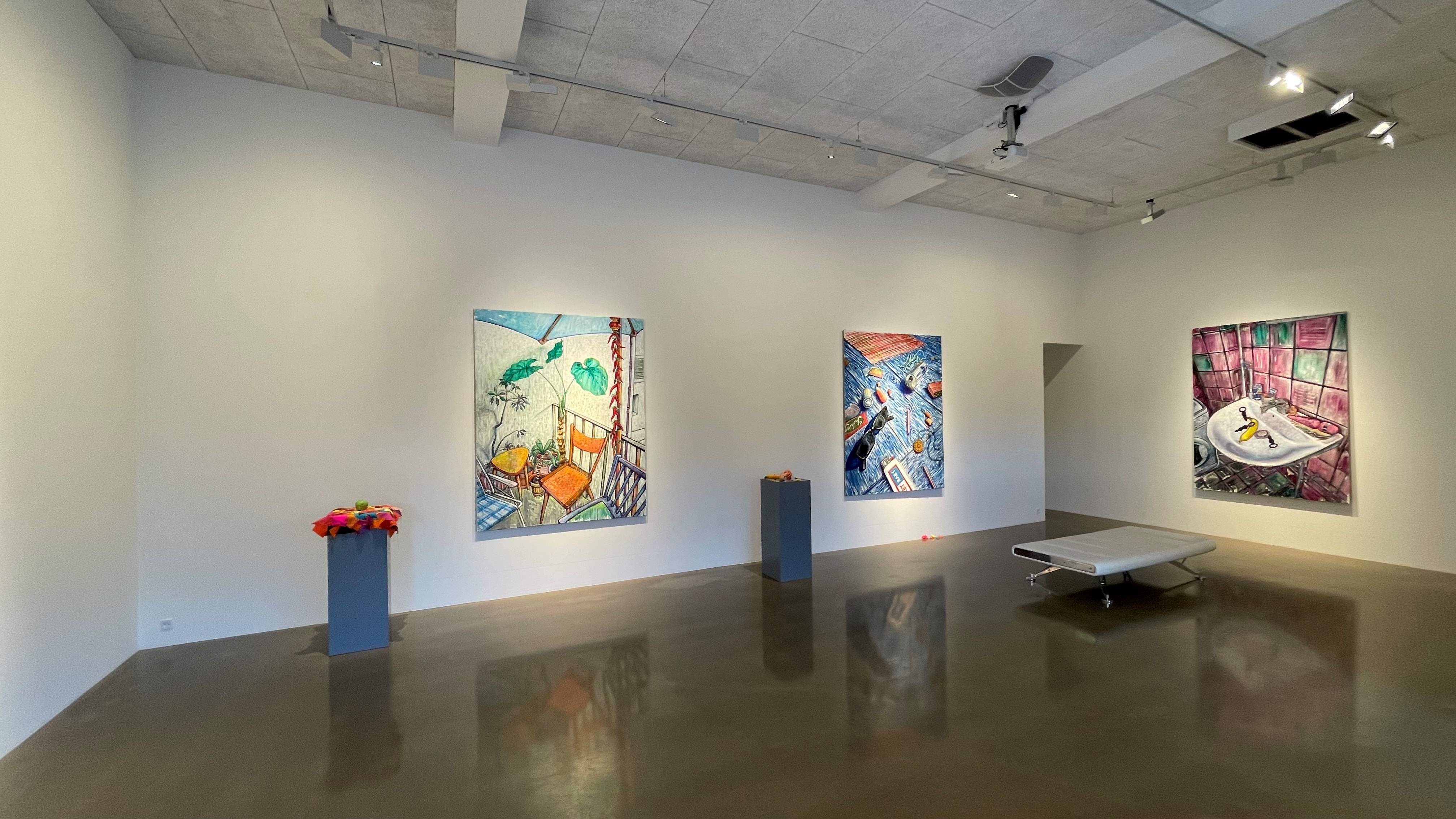 By sharing her most intimate and safe spaces Tine Nedbo points at the connection between the personal and the mutual. Despite the absence of human figures in the object portraits, the paintings tremble with an echo of human presence and influence. The spaces presented in the paintings open themselves towards the viewer and invite us to coinhabit these vulnerable spheres and their objects and to use this open invitation as a base for reflection and exchange.