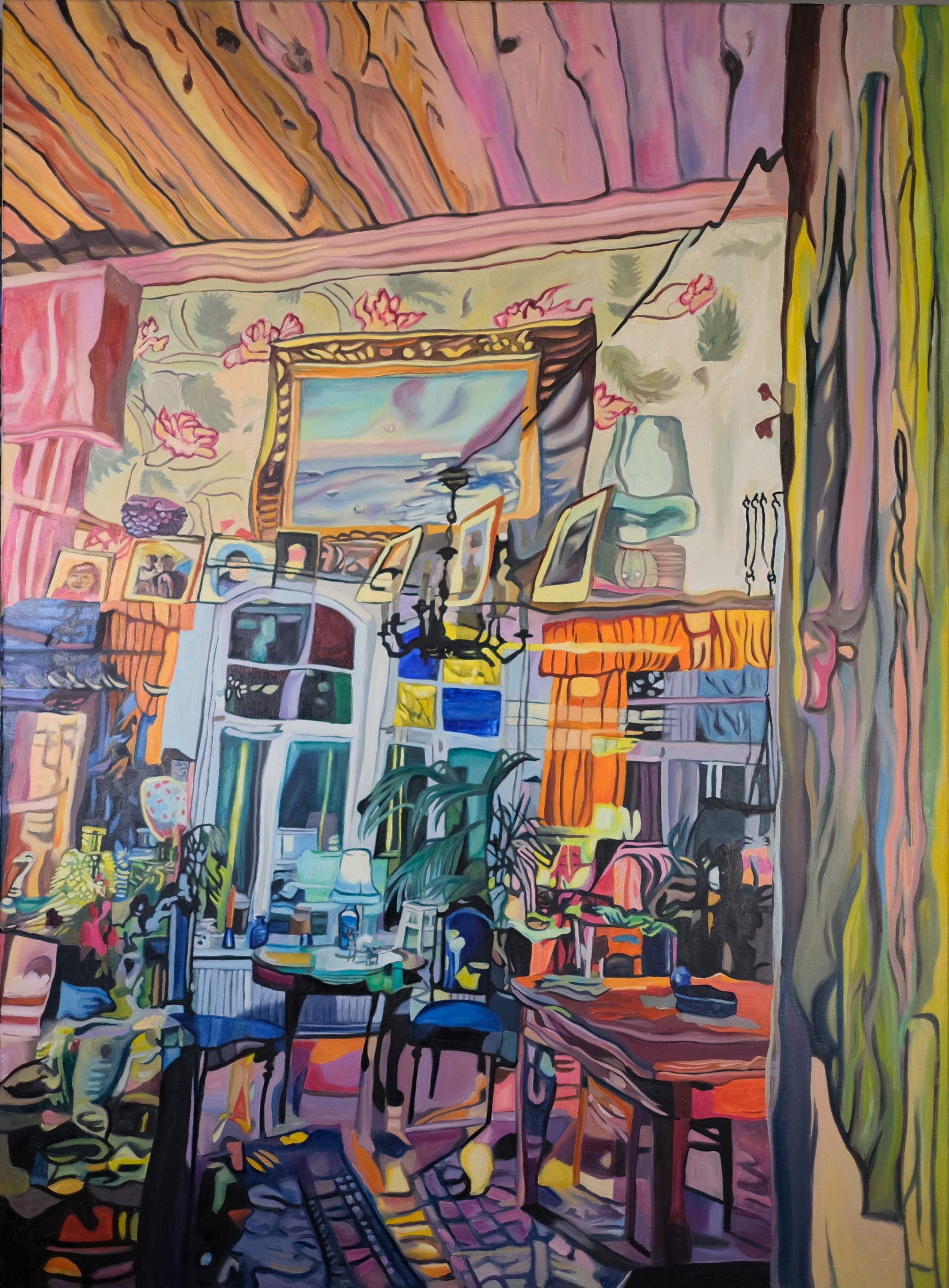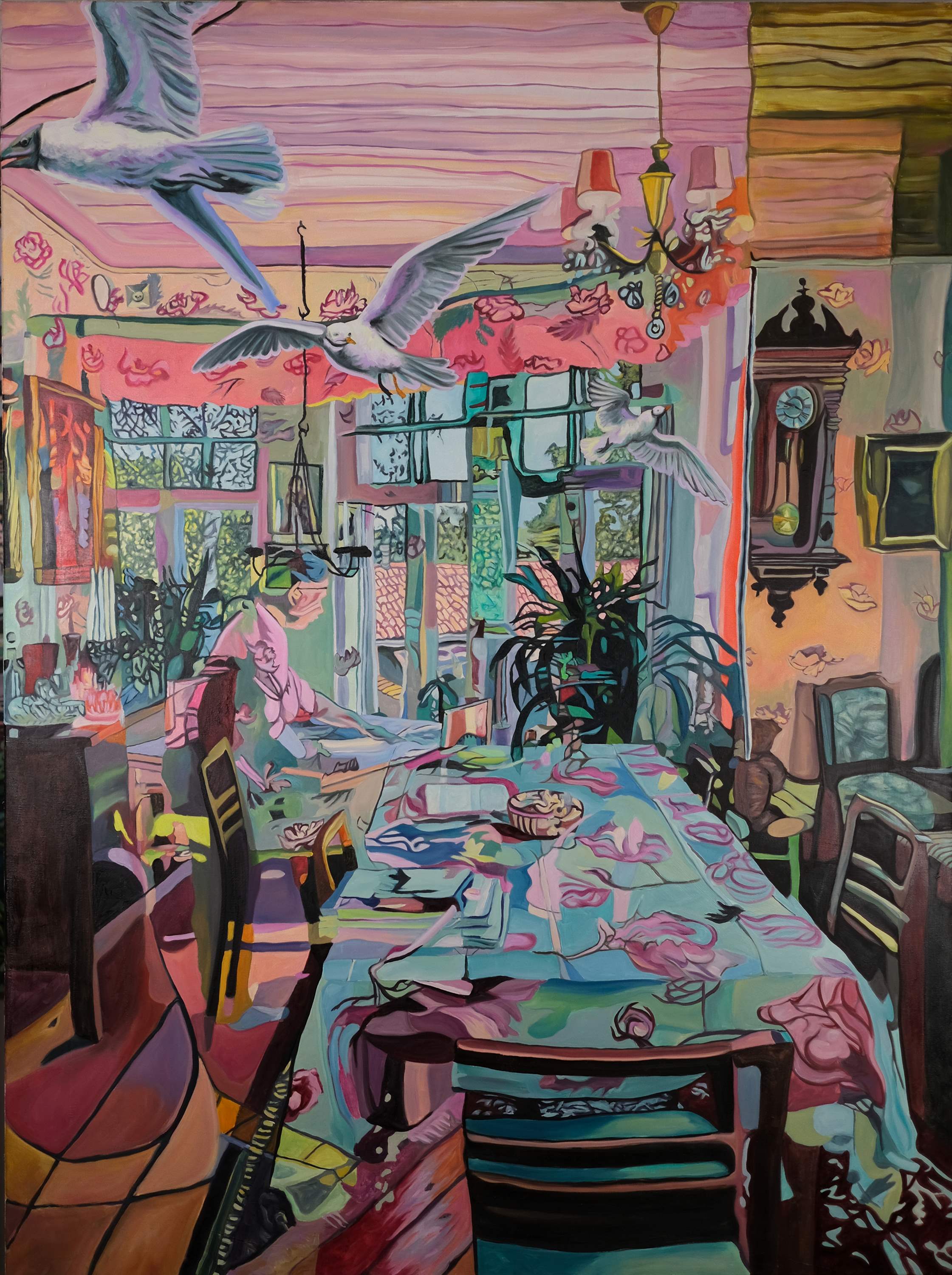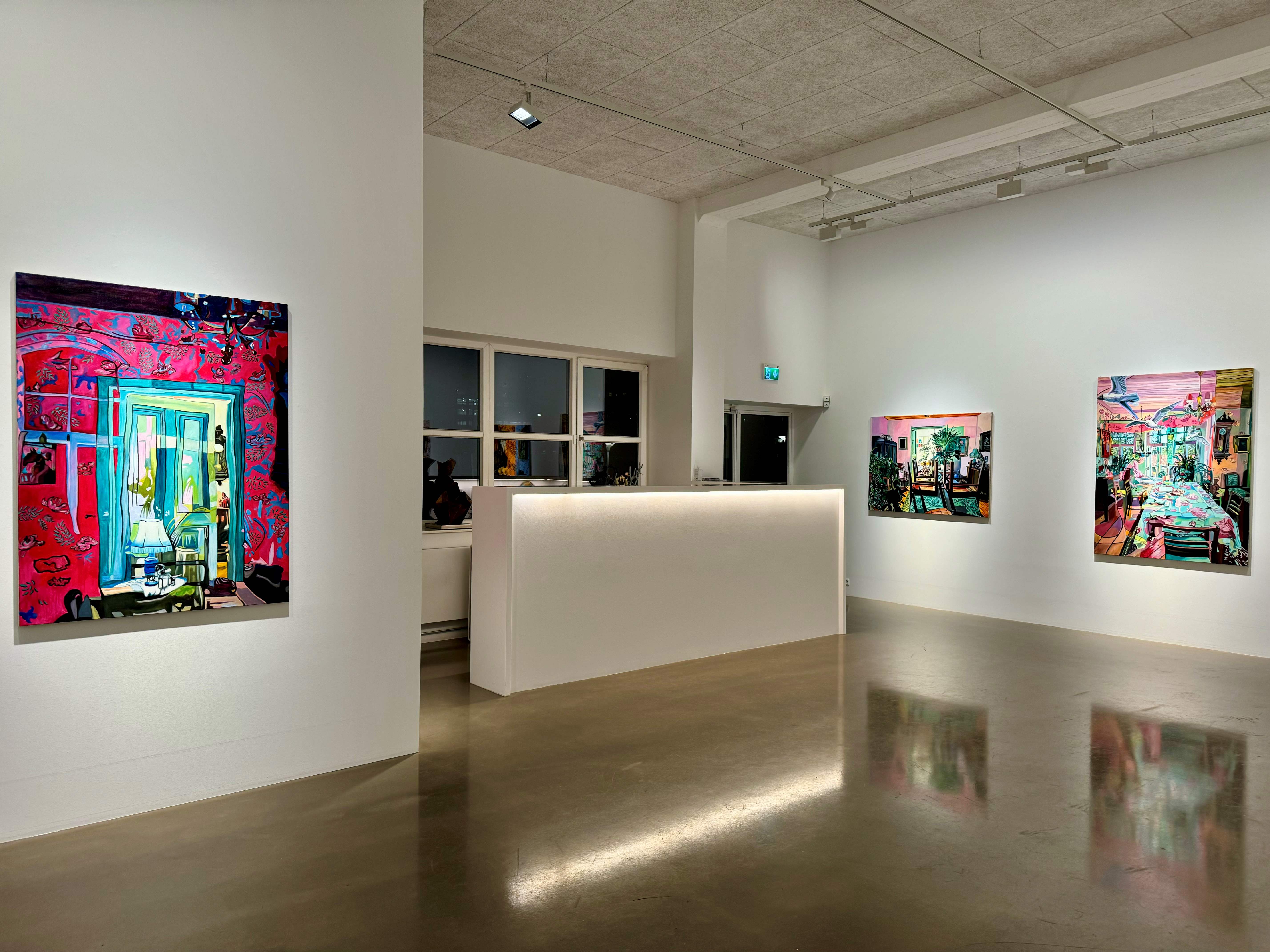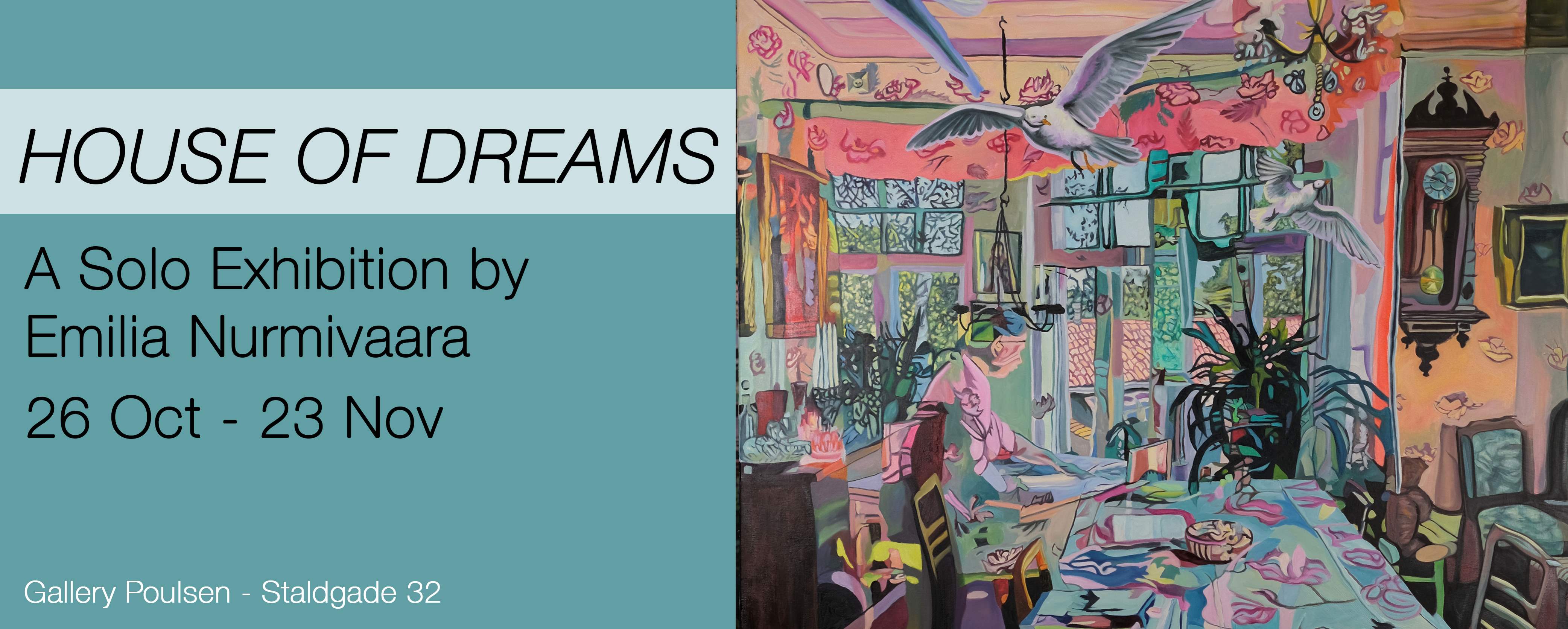 Vibrant, warm interiors filled with assorted furniture and objects bid us welcome in Emilia Nurmivaara’s most recent body of paintings depicting fond interpretations of her childhood home in Finland. The figurative imagery of interior scenes in Nurmivaara’s paintings comes alive through her distinctive and playful use of perspective and proportion. The exhibition House of Dreams is Nurmivaara’s second solo exhibition at Gallery Poulsen. Her works follow a continuation of French philosopher Gaston Bachelard’s book “The Poetics of Space” which explores how dreams, thoughts and memories become attached to the spaces we inhabit, transforming them into powerful extensions of the soul.
