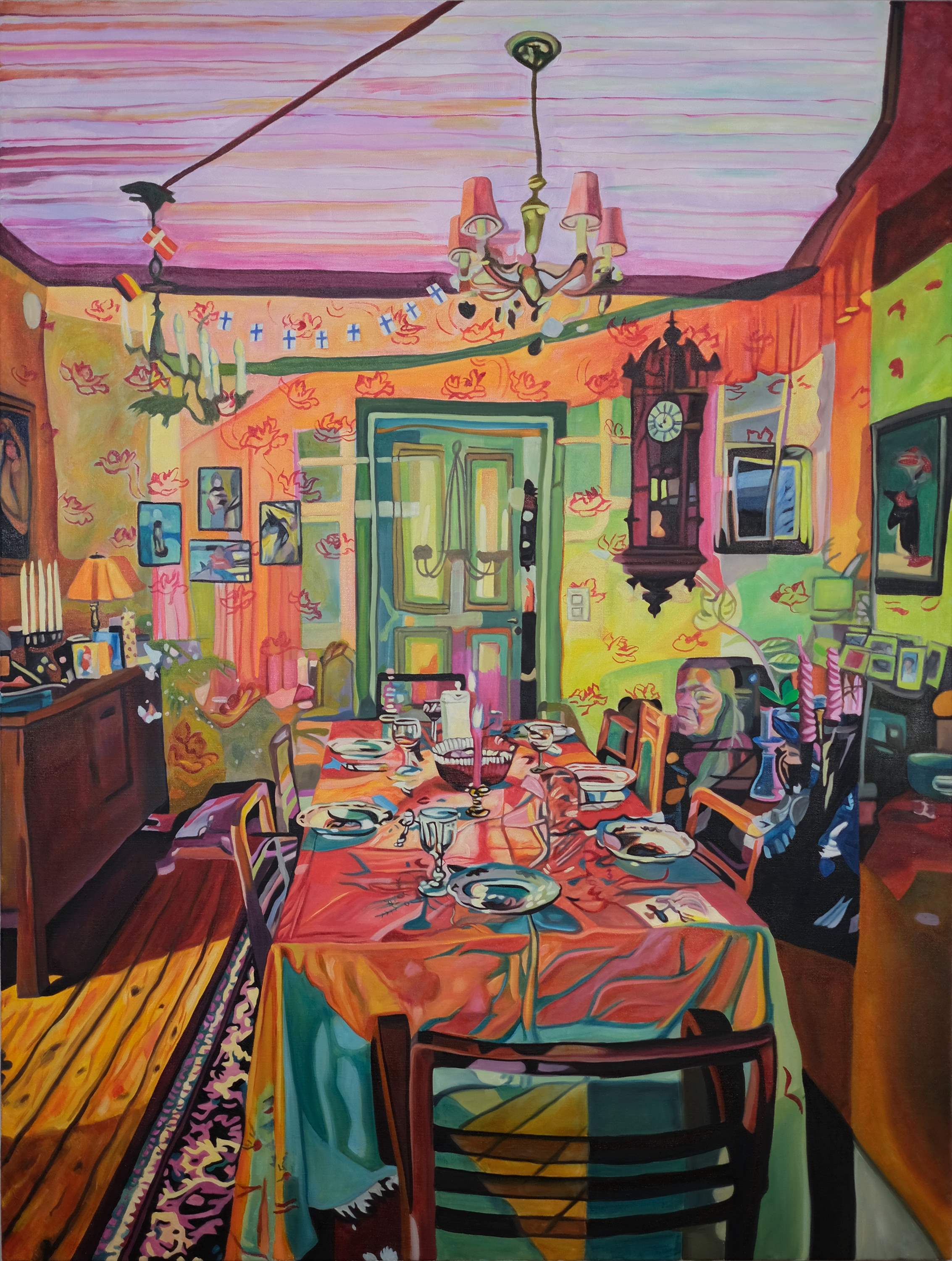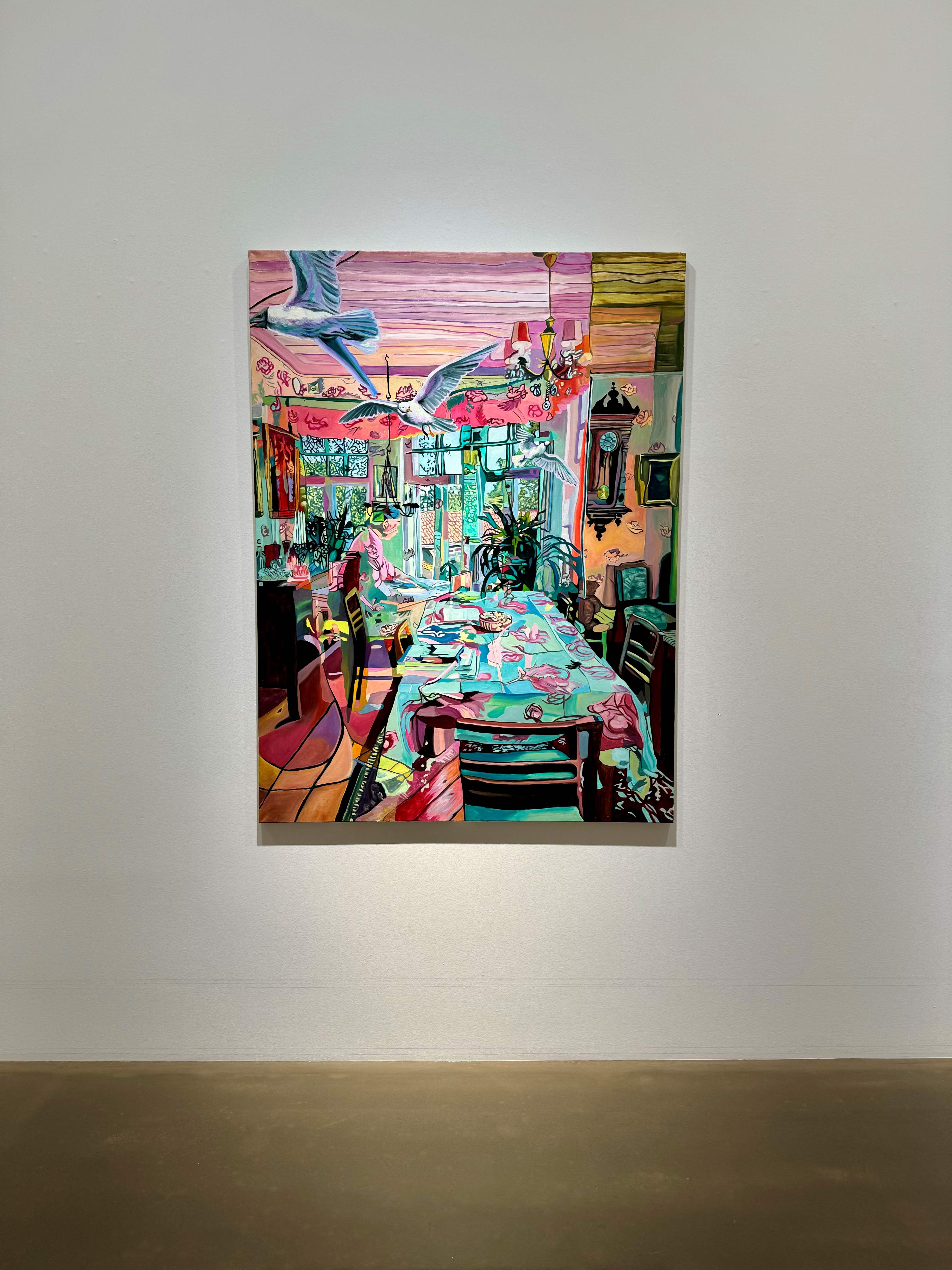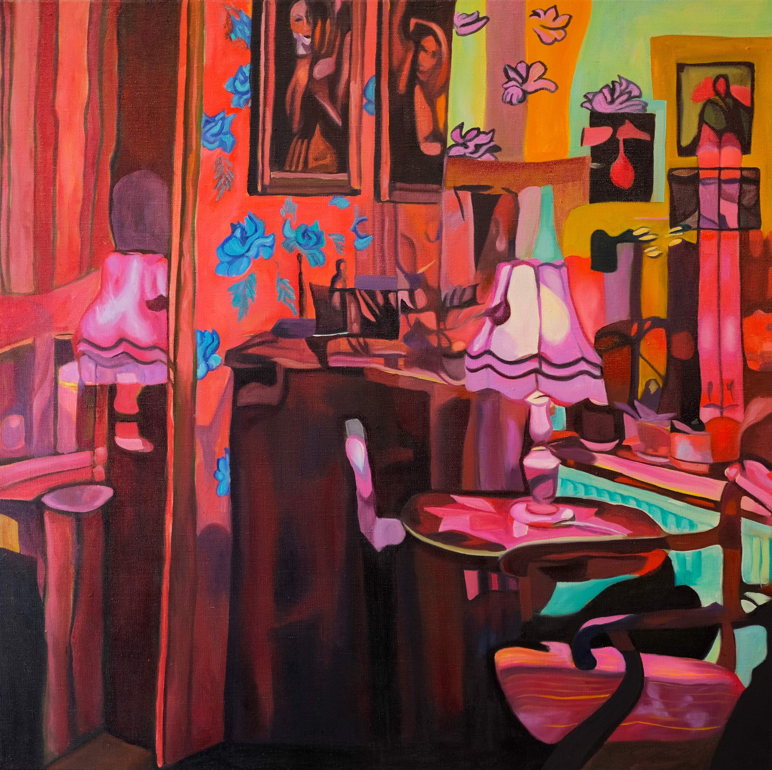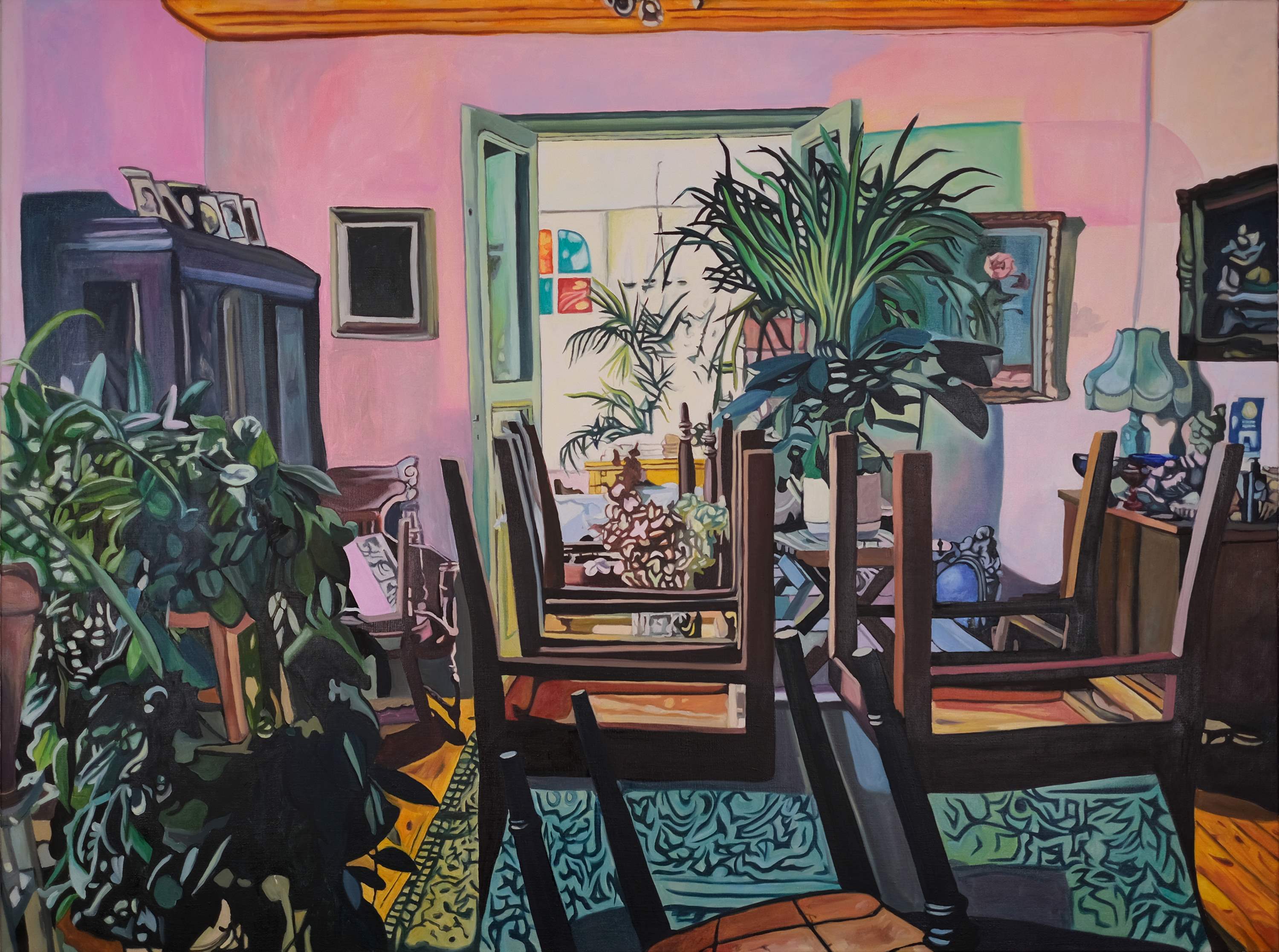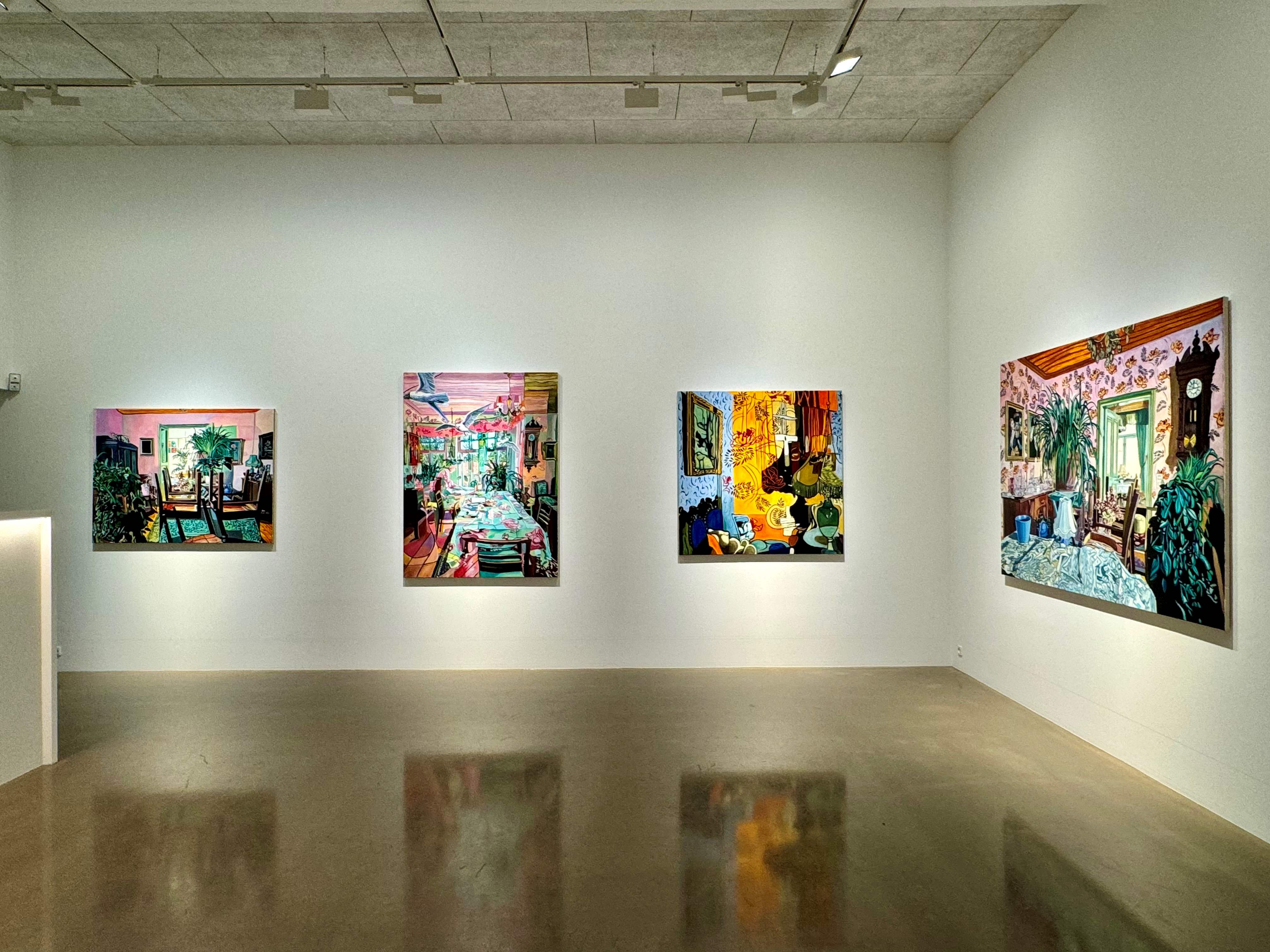Vibrant, warm interiors filled with assorted furniture and objects bid us welcome in Emilia Nurmivaara’s most recent body of paintings depicting fond interpretations of her childhood home in Finland. The figurative imagery of interior scenes in Nurmivaara’s paintings comes alive through her distinctive and playful use of perspective and proportion. The exhibition House of Dreams is Nurmivaara’s second solo exhibition at Gallery Poulsen. Her works follow a continuation of French philosopher Gaston Bachelard’s book “The Poetics of Space” which explores how dreams, thoughts and memories become attached to the spaces we inhabit, transforming them into powerful extensions of the soul.