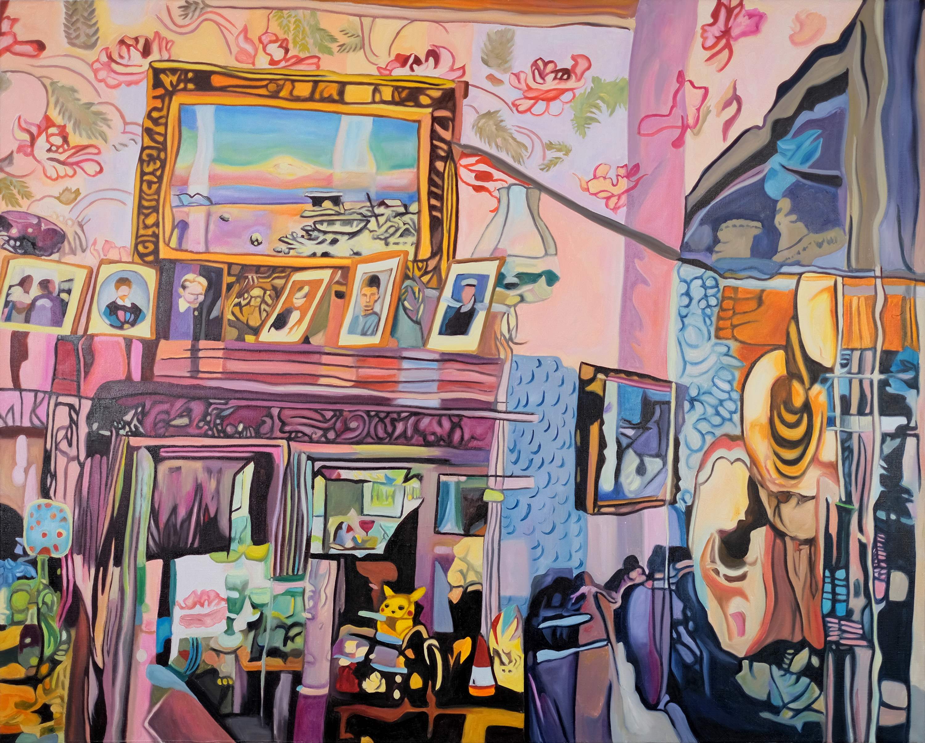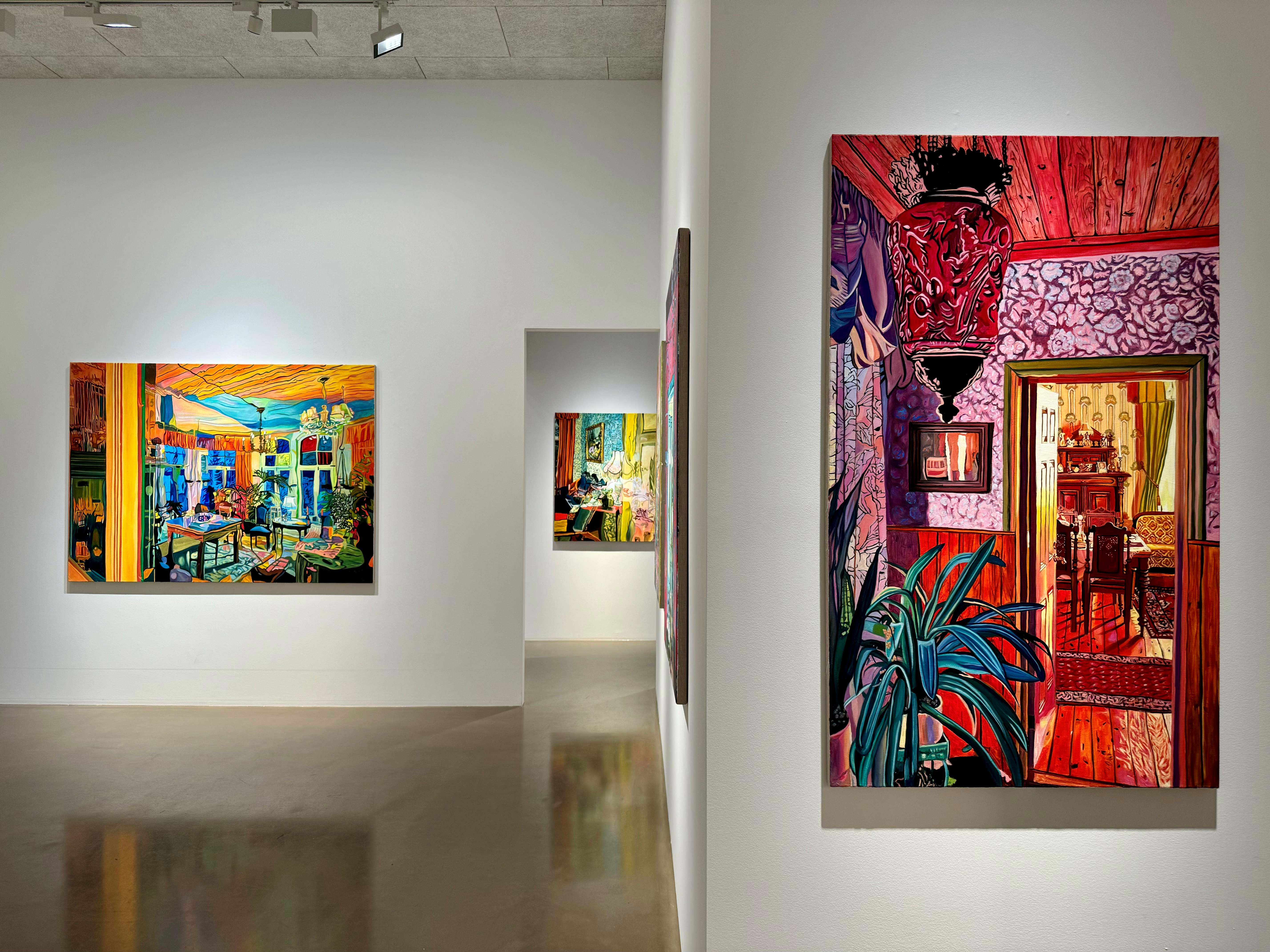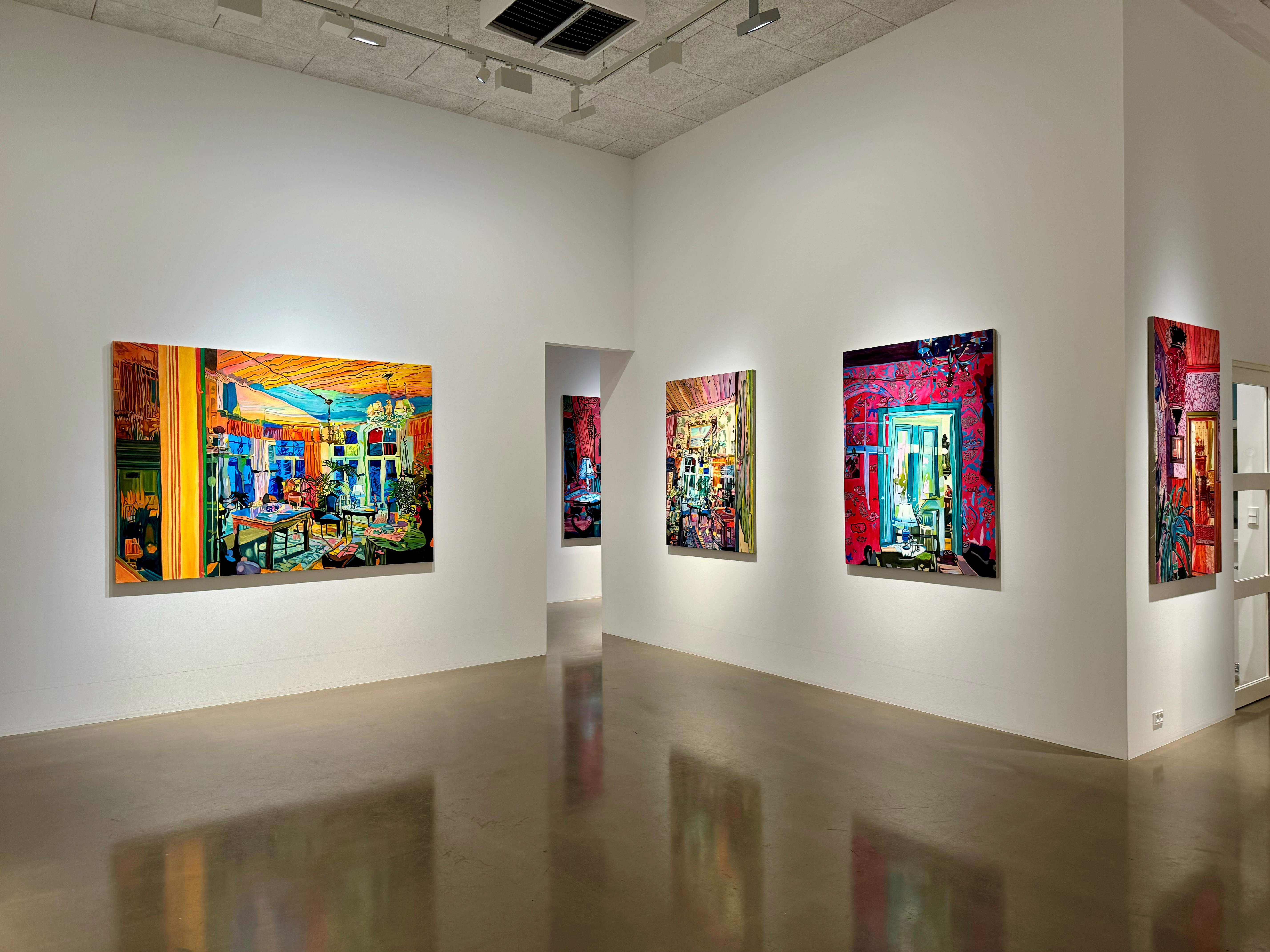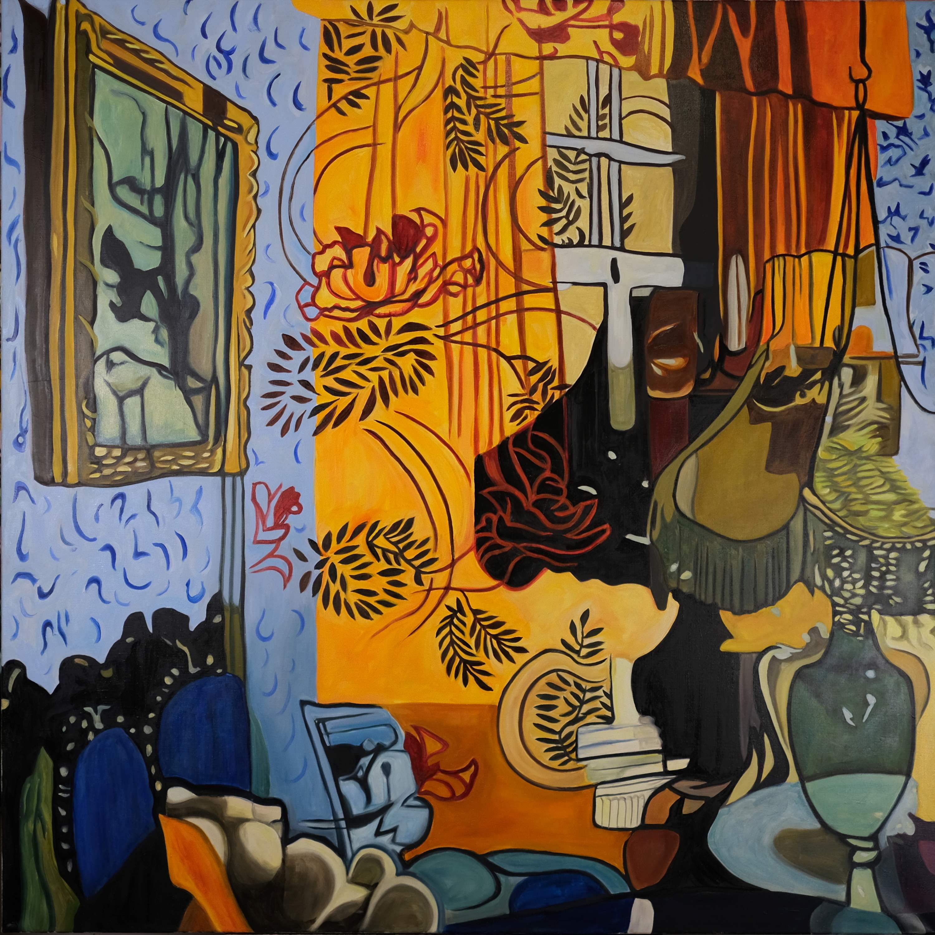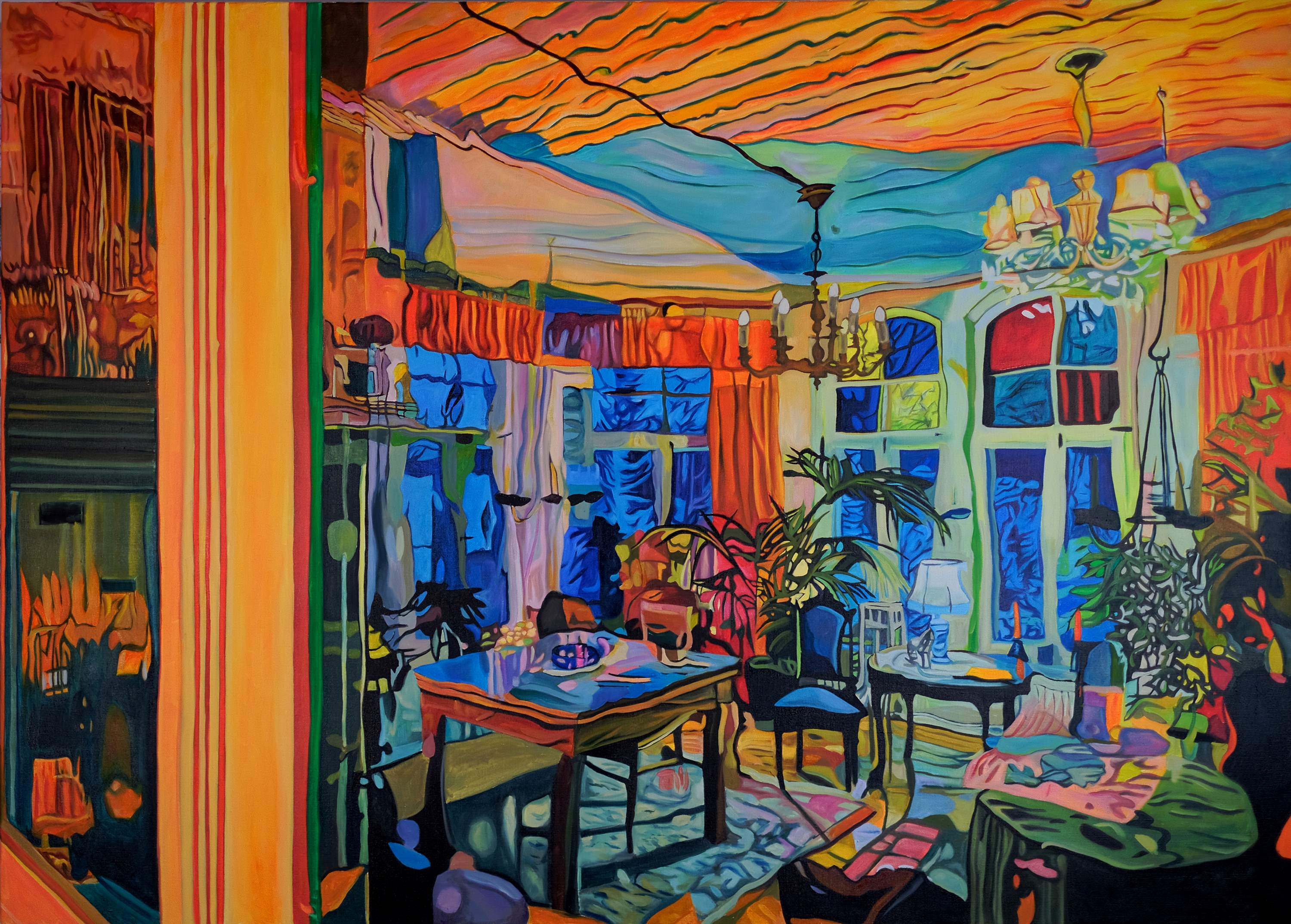 “Through painting, I want to explore how the elements guide the operation and formation of our mental images. Through Bachelard’s essays, I have hoped to find a deeper understanding of the meaning of the elements in the landscape of our soul. In this body of work, I have chosen to combine parts of the elements with my interior paintings. I wanted to create a series of paintings in which each work is dedicated to one of the four elements: House of Water, House of Air, House of Fire and the House of Earth. This exhibition marks the beginning of my investigation of Bachelard’s considerations examining how the different elements can affect our imagination. In doing so, the familiar imagery of my childhood home becomes a transformed space, guided by the viewer’s imagination.”