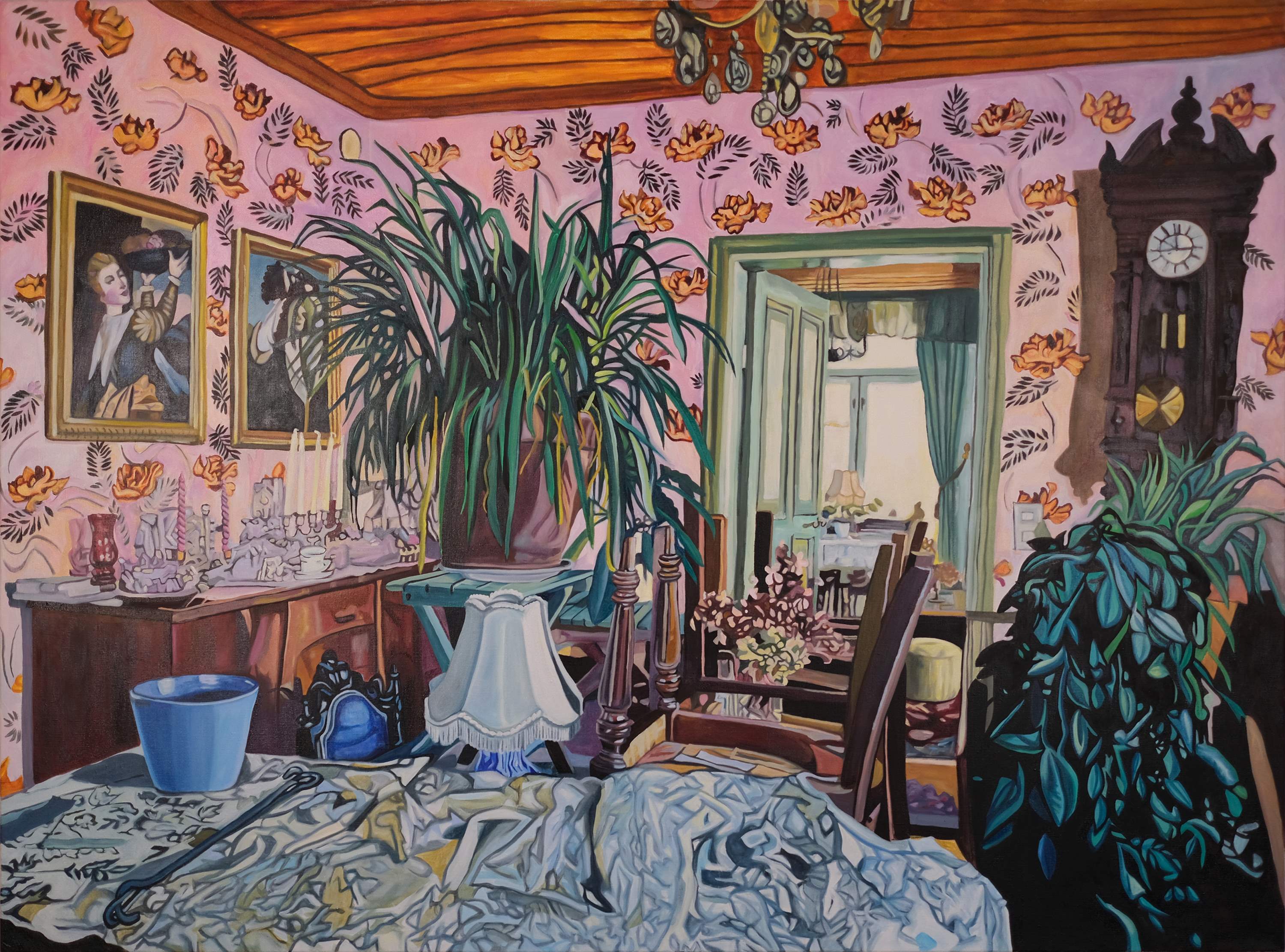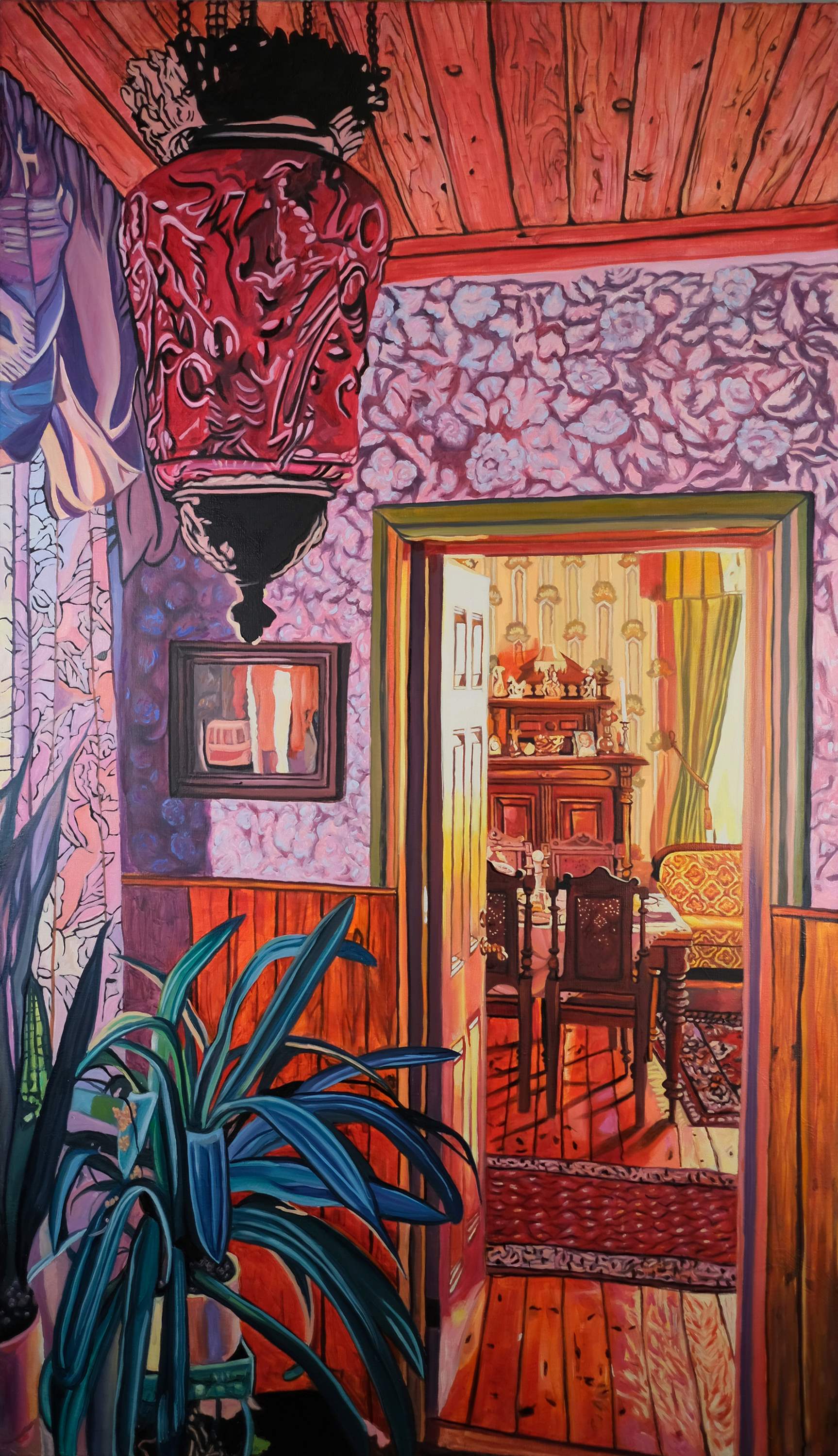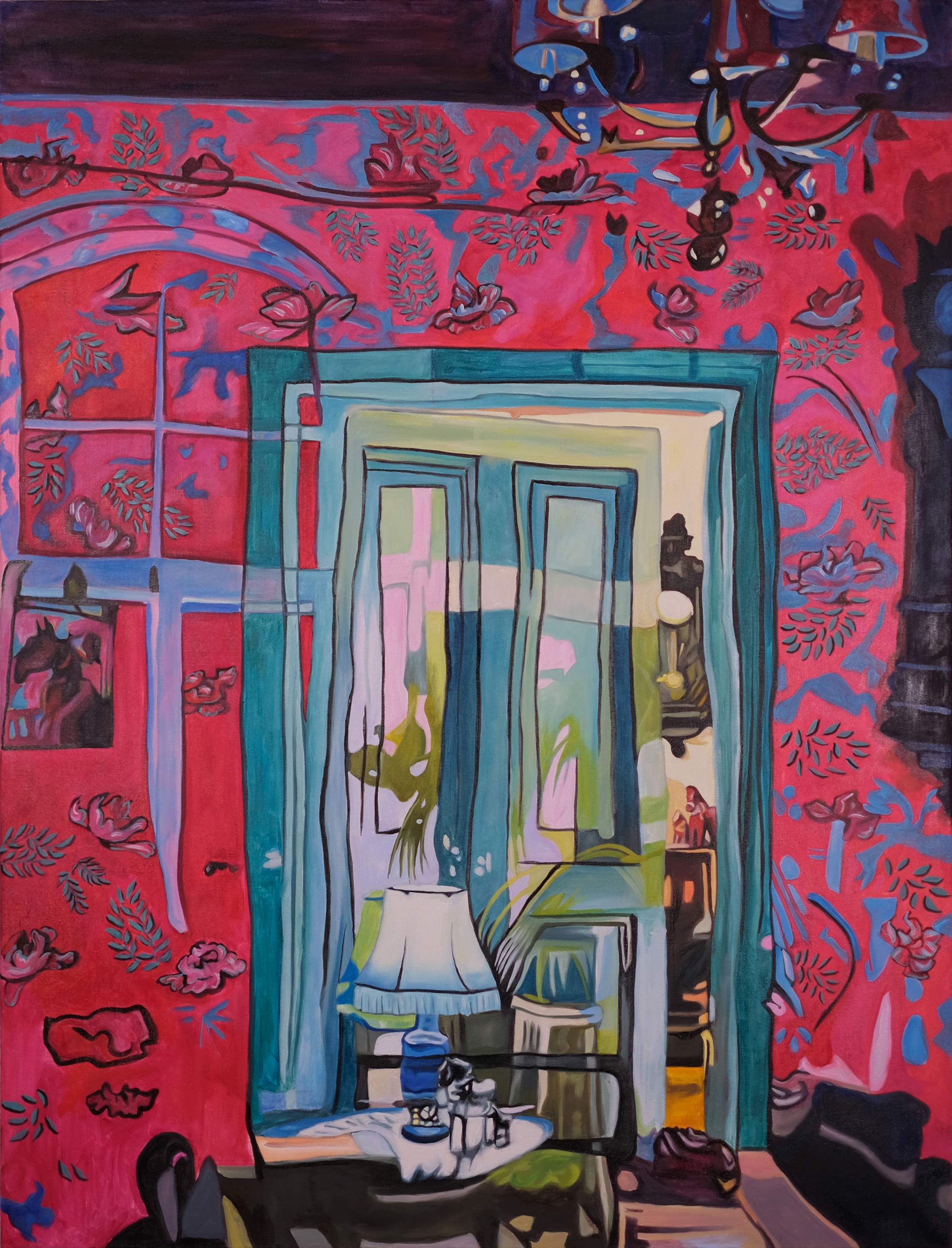In House of Dreams, Nurmivaara draws inspiration for her paintings from Bachelard’s description of the elements and their relation to dreams and the imagination. The spaces and memories Nurmivaara shares with us in her paintings remain in constant flux, continually shaped by the dynamics of both her and our inner worlds, existing somewhere between fantasy and reality. Intricate decorative patterns fill the walls and cherished memories resurface in this series of bold, engaging works. Nurmivaara invites new layers of depth to emerge with every gaze, drawing the viewer deeper into the work. The symbolism of each chosen element allows for a renewed, evolving experience, revealing different facets with each encounter.