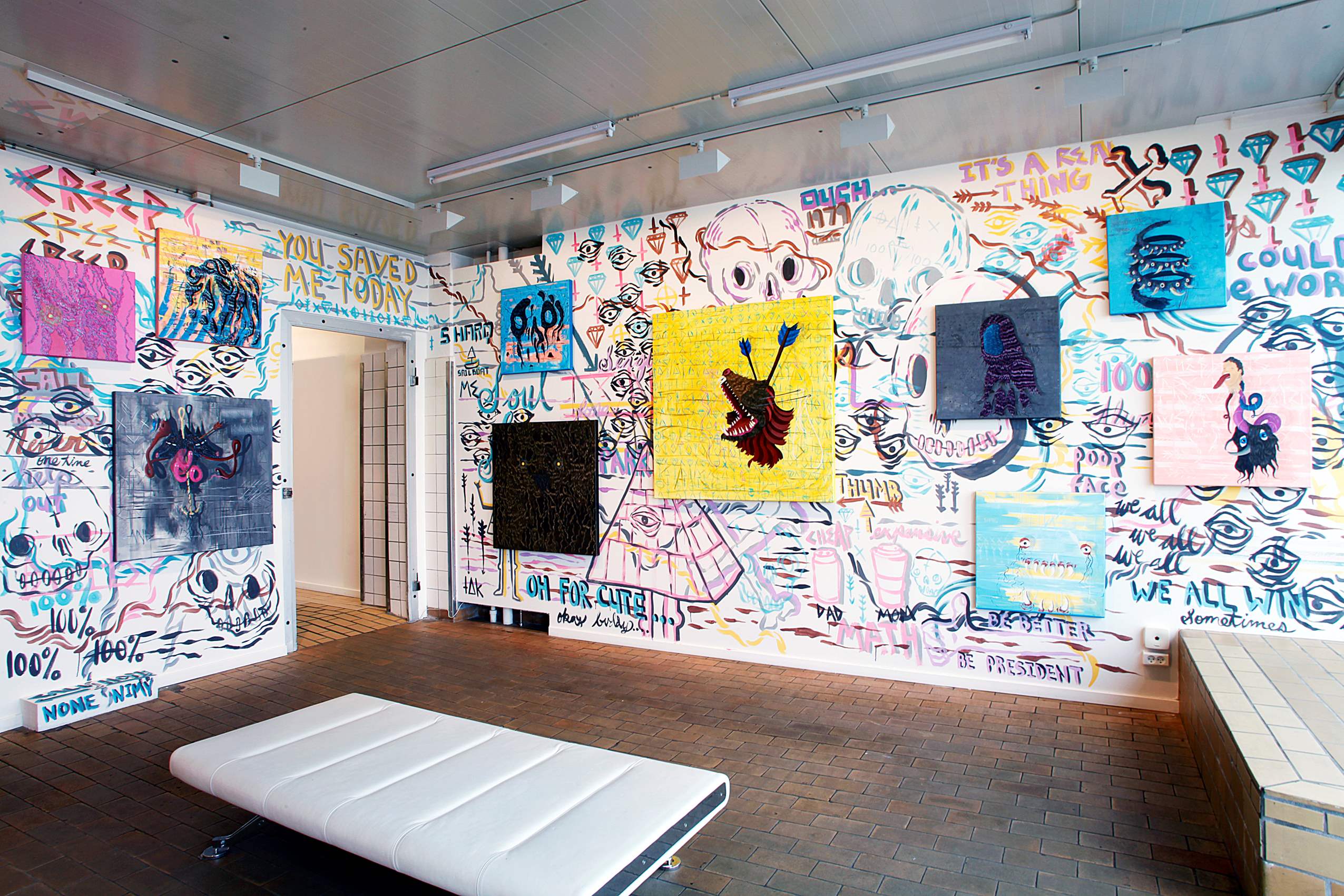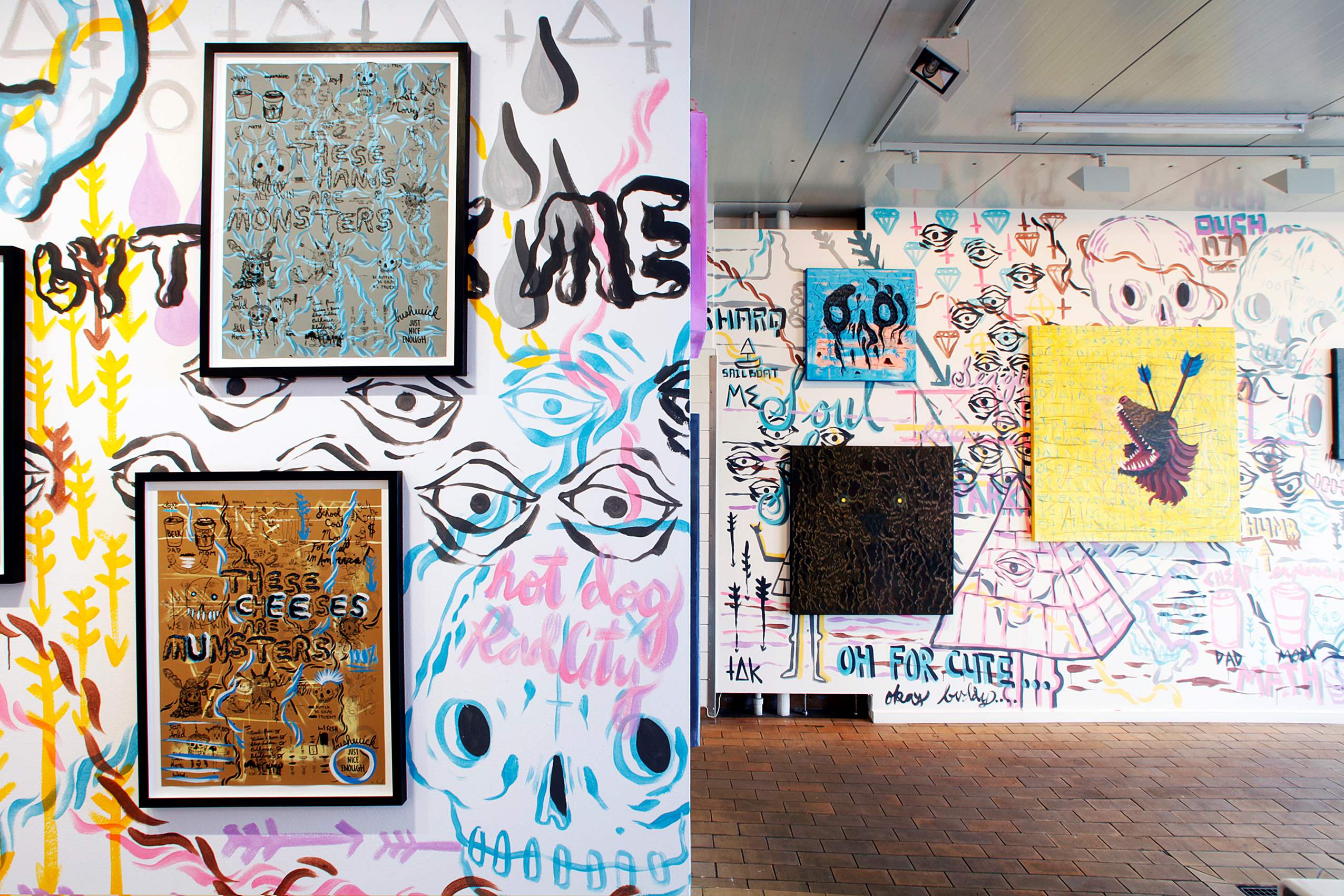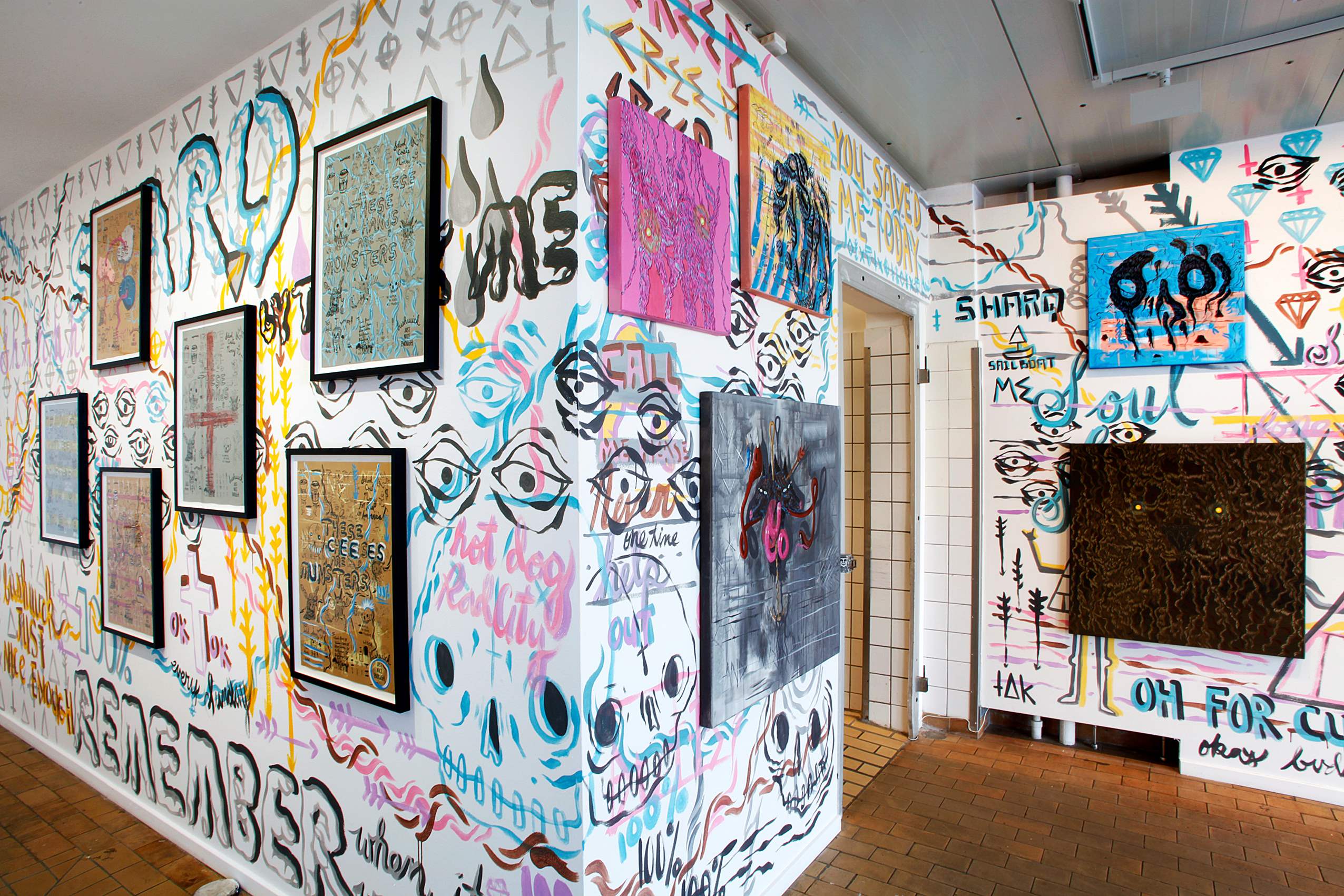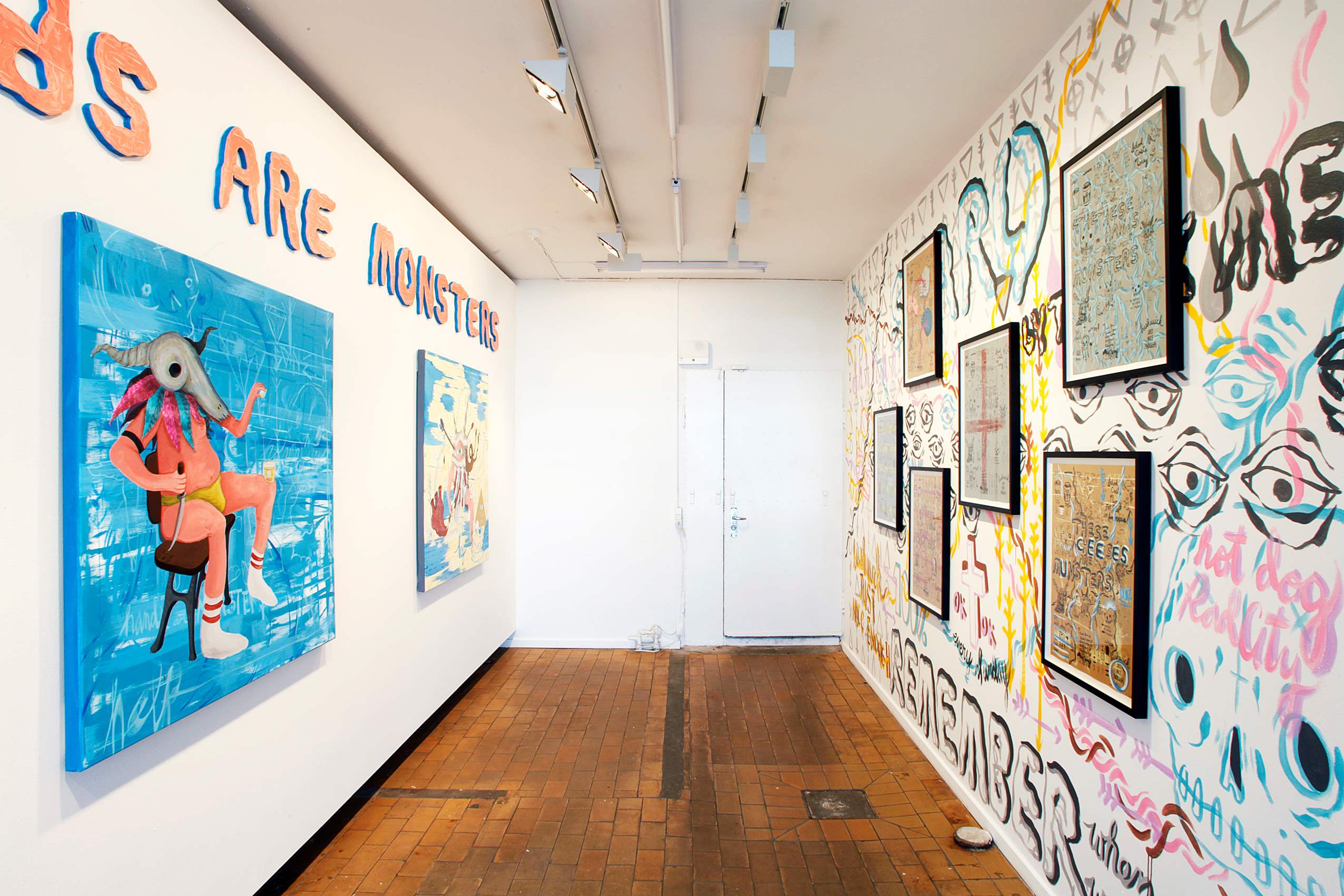 Impressively and convincingly Isaac combines shapes, colors, and text borrowed from many different universes. The inspiration is obvious: comics, surrealism, tattoos and styles of illustration have been renegotiated and united within one single frame in a very alluring way. It’s all the spectacle work of the hand when it’s been set free, and when it has a mind of its own, to use Isaac’s own words. The exhibition “These Hands are Monsters” awakes great questions of the individual human being’s existence in the world, both in mind and in body, and not least in the relation to other people.