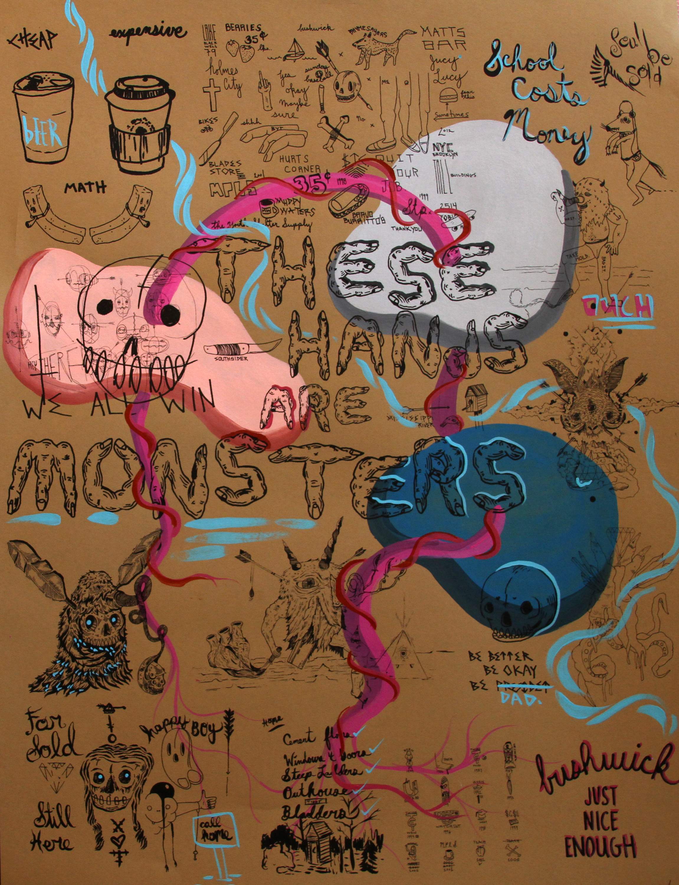 ”From the moment we are born we discover our extremities. We learn how to crawl, explore and create. Through this tactile experience, we learn to feel both emotionally and physically. Our hands, our vehicle of the mind, allow us to show love and hate within one swift act, sometimes before we even know it. Almost as if they have a mind of their own. Like a magical creature connected to the stubs of our heart. We live by our choices and are only left making more choices while our hands endure every season until we find our resting place. We wander through this world wondering if we will ever leave a mark or have our journey be turned into a tale or myth. Our hands, these hands, are monsters.”