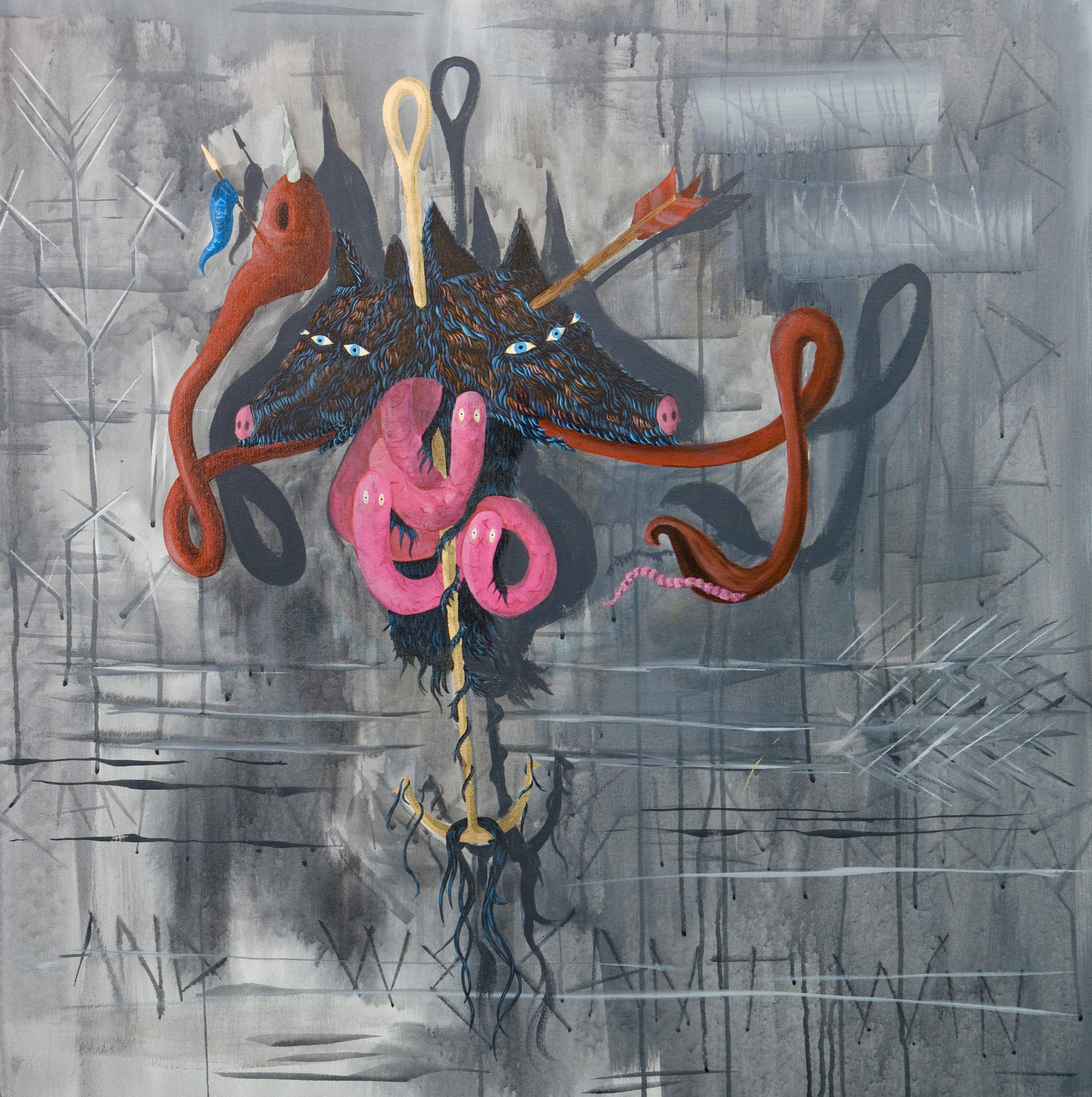 And here it is – “These Hands are Monsters”! The show is a visual stream of contradiction: the accurate line against the rapid and rough brushstrokes, the imaginative surreal figures against the abstract graphical backgrounds, the slow tradition-filled painting against the reproducible print. The contrasts and complexes are many but the hand of Isaac is confident. Welcome to the show – and do not hesitate to be under the amazing and talented hands of Isaac Arvold!