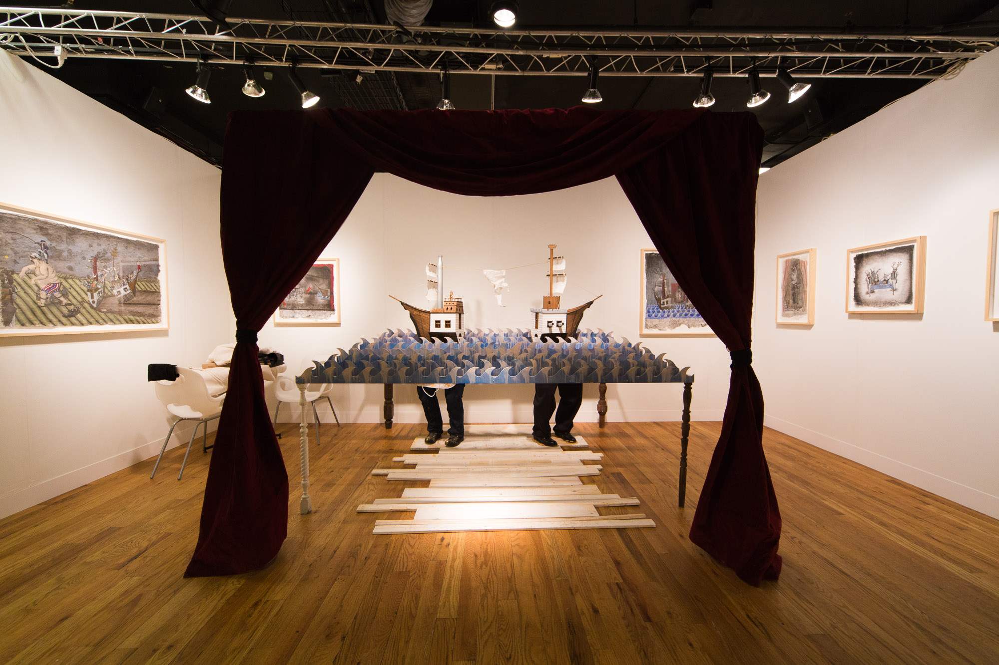 With Jade Townsend’s artwork, one is captivated by his universe and his cross-aesthetic practice, ranging from beautiful detail-oriented drawings to large theatrical installations. His installations engage the viewer to become part of what he builds in various exhibition spaces with a fascinating result. With the drawings, entire worlds and universes are constructed and presented to us. Jade Townsend's artworks have a universal nerve to them that transcend cultures, as he applies a universal visual language known from our earliest memories in literature and history. There is a use of materials and historical imagery that animates his artworks, with a handcrafted expression that cause us to be captivated by them. His works are loaded with timber, ships, kings, hobos, death, tarot cards and mysticism and they are keen to illuminate our existing systems and question their limitations and their flaws.