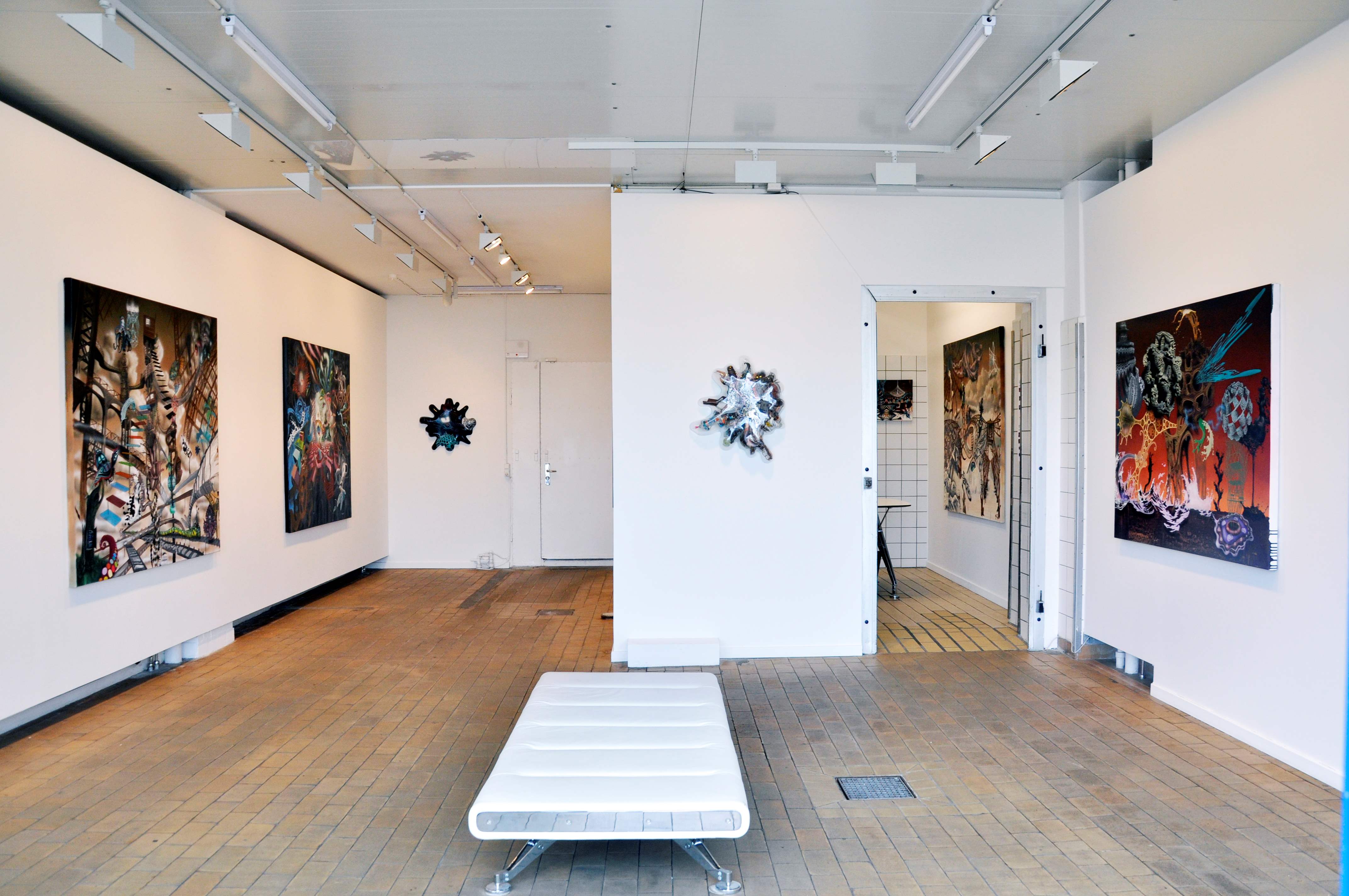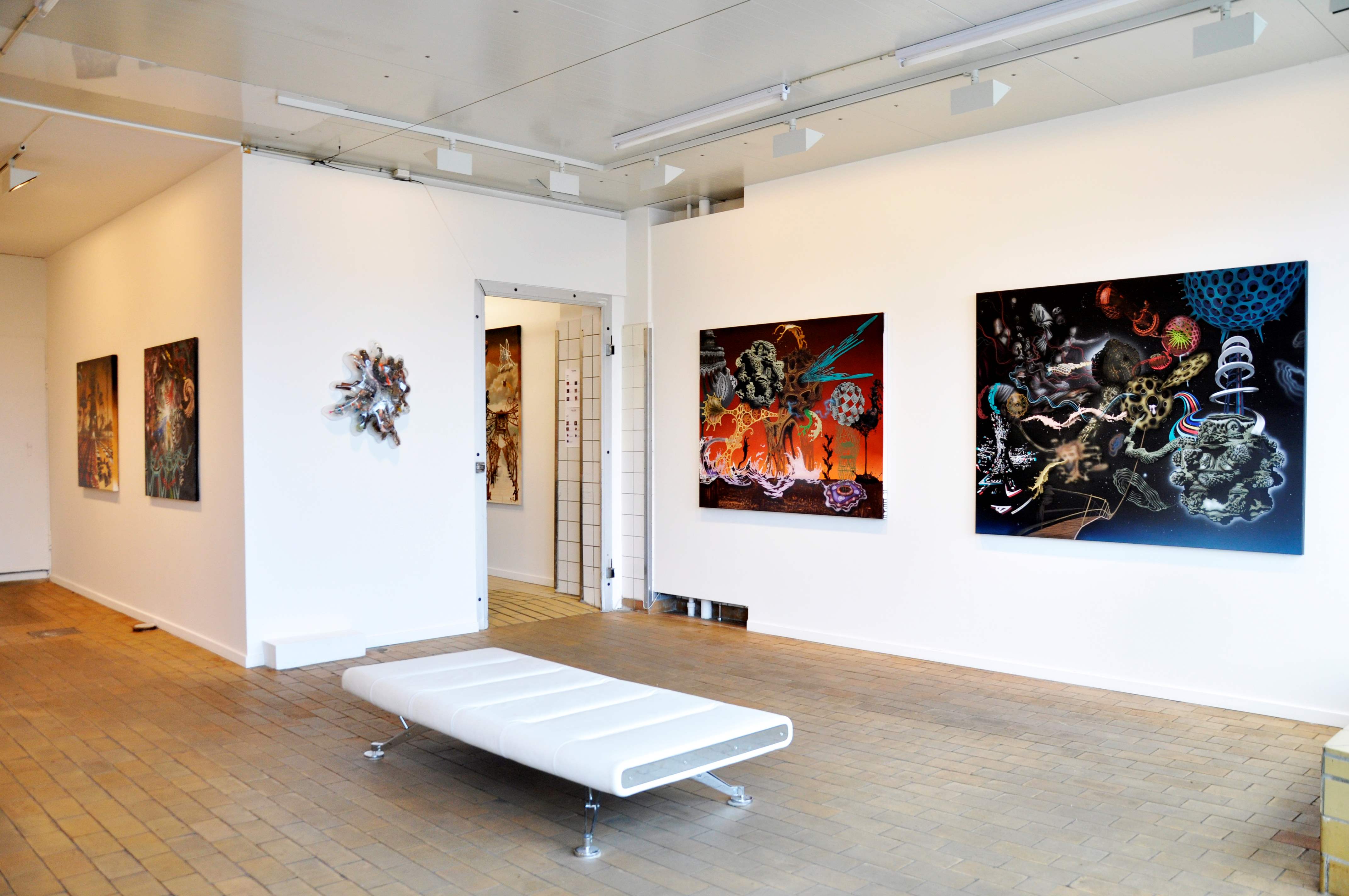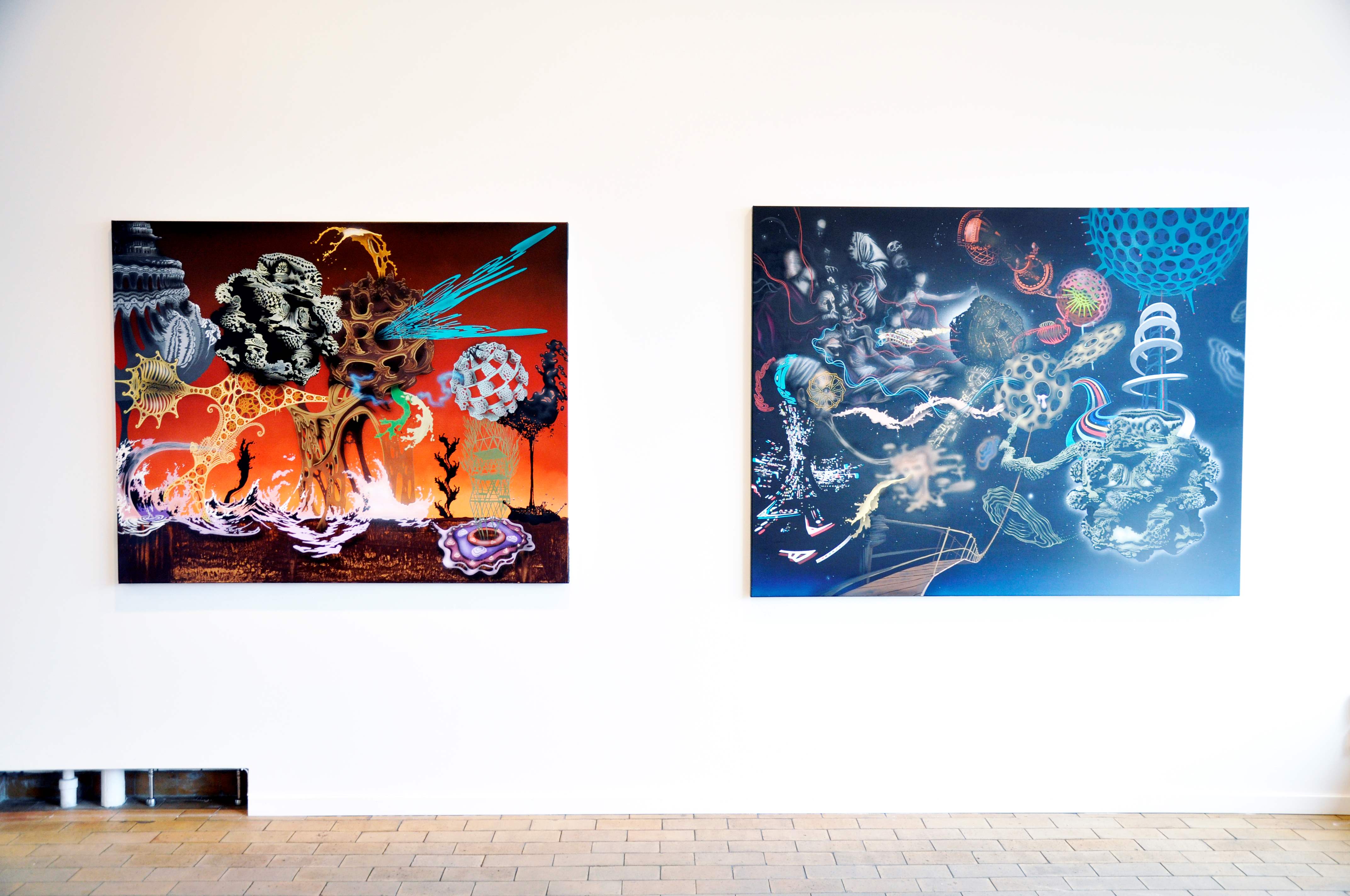 Jonas Pihl´s paintings are transgressing the known Universe and expanding even off the canvas into splash shaped paintings with drips behaving like tentacles reaching out into the white space of the gallery. A painting in the shape of a random splash of paint determinated into a frozen, stylized form of that quick gesture - slowly and meticulously produced. The shape of the painting thereby talks about the content. The shape is the same as the material: The paint. In the proces it is fluid and alive, and it is frozen and still when the work is done, but then still talking about the action of the proces. A frame in a frame in a frame, like Mandelbrot´s fractal, where the whole fractal is the same shape as the little details it consists of. Nature works the same way according to Fibonacci, and if you zoom in enough, the aliens of grotesque imagery are right there in our own world. In the same manner Jonas Pihl´s paintings are universes where each detail are universes in themselves, implementing imagery from our own apparently rational world, talking about irrational contexts. A universe consisting of little universes consisting of smaller universes to infinity. A multiverse.