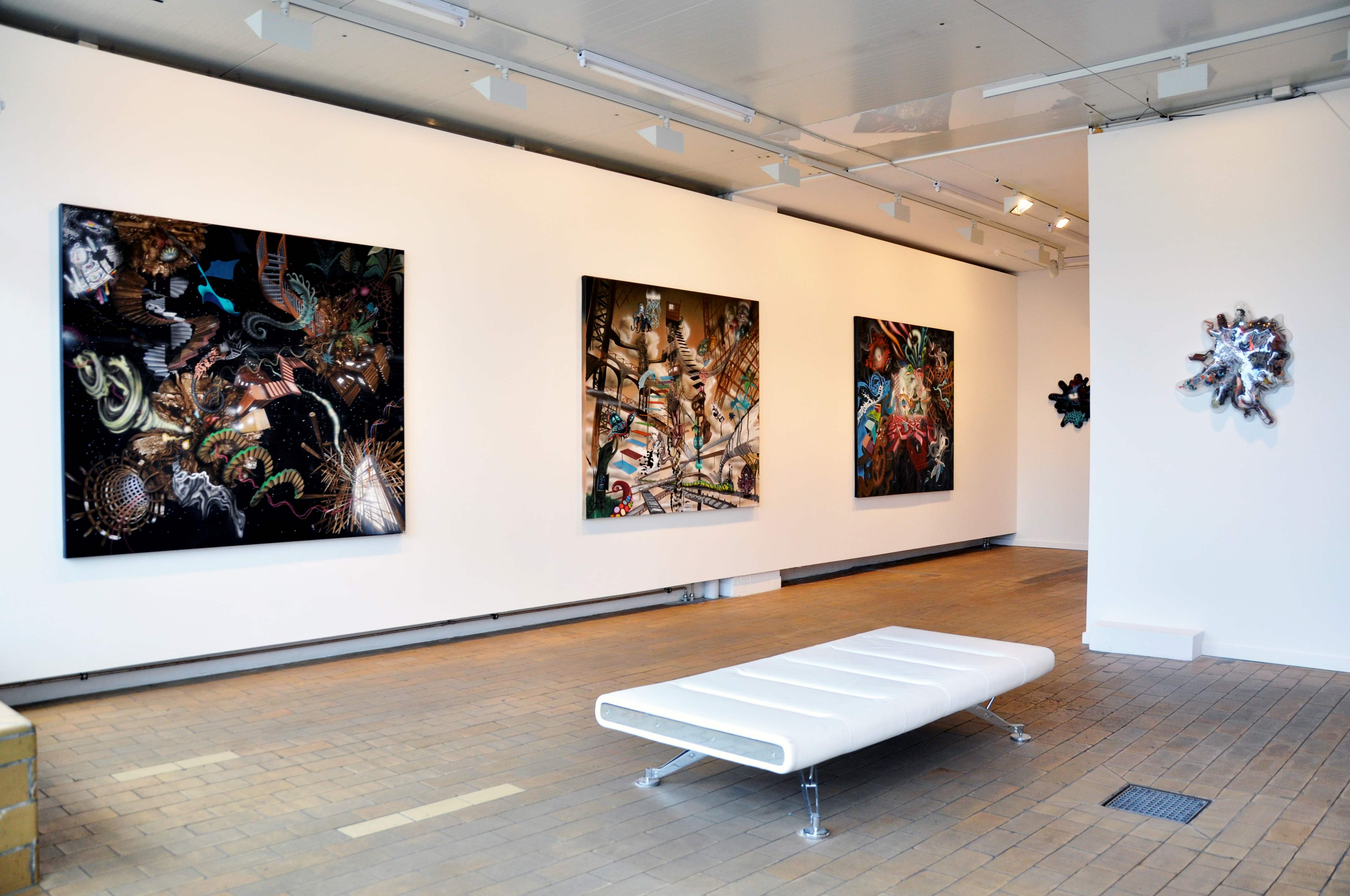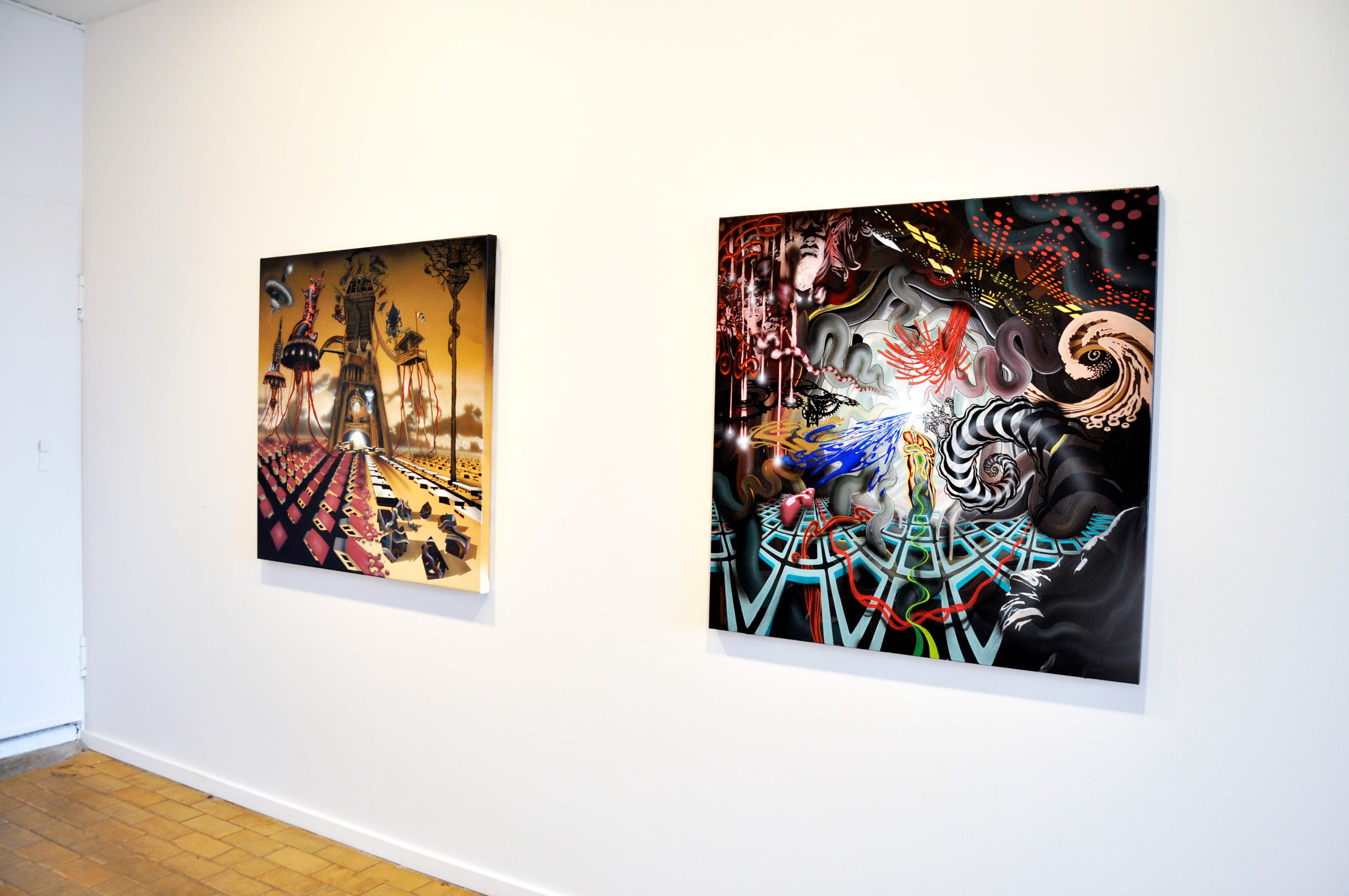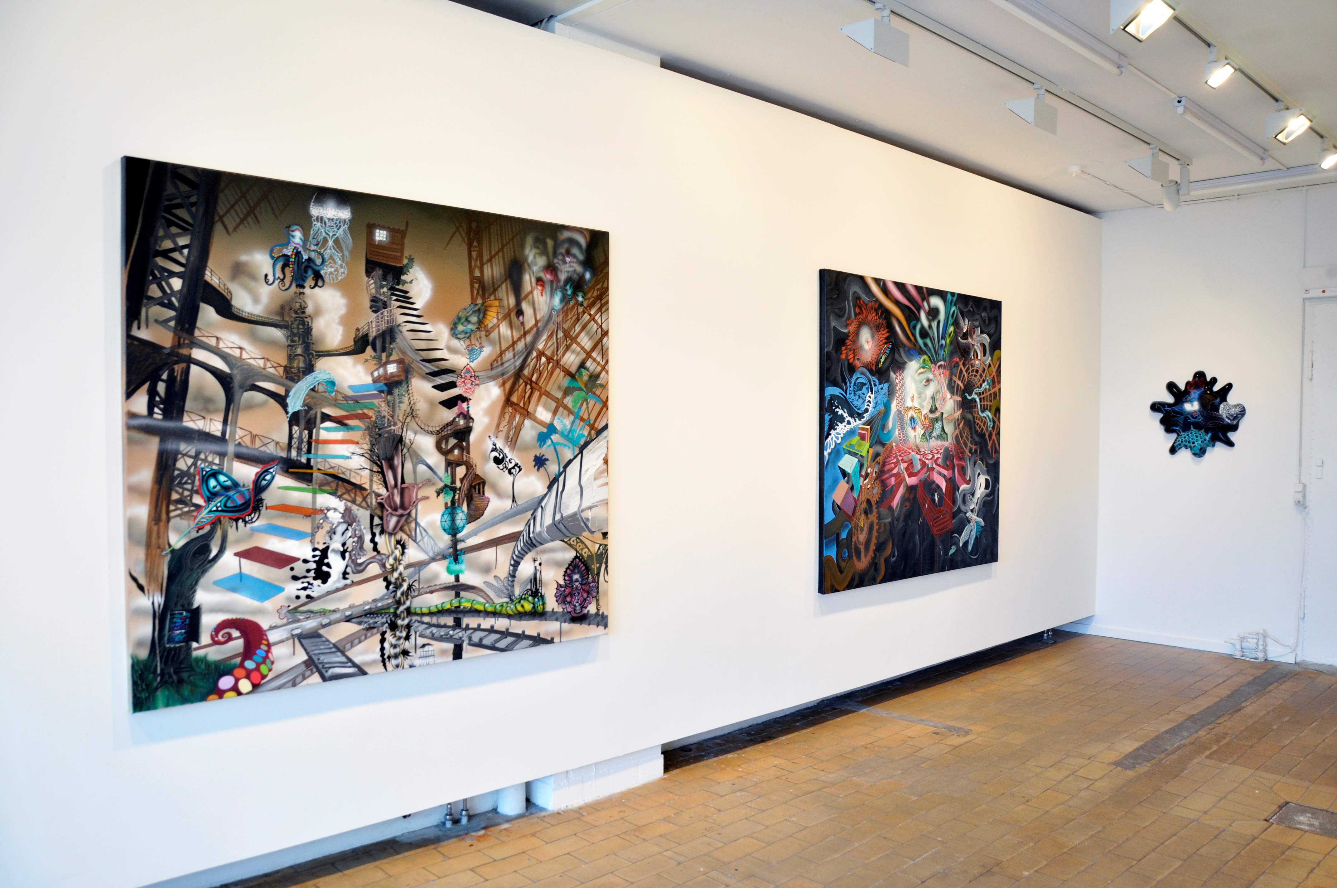 Jonas Pihl´s paintings are transgressing the known Universe and expanding even off the canvas into splash shaped paintings with drips behaving like tentacles reaching out into the white space of the gallery. A painting in the shape of a random splash of paint determinated into a frozen, stylized form of that quick gesture - slowly and meticulously produced. The shape of the painting thereby talks about the content. The shape is the same as the material: The paint. In the proces it is fluid and alive, and it is frozen and still when the work is done, but then still talking about the action of the proces. A frame in a frame in a frame, like Mandelbrot´s fractal, where the whole fractal is the same shape as the little details it consists of. Nature works the same way according to Fibonacci, and if you zoom in enough, the aliens of grotesque imagery are right there in our own world. In the same manner Jonas Pihl´s paintings are universes where each detail are universes in themselves, implementing imagery from our own apparently rational world, talking about irrational contexts. A universe consisting of little universes consisting of smaller universes to infinity. A multiverse.