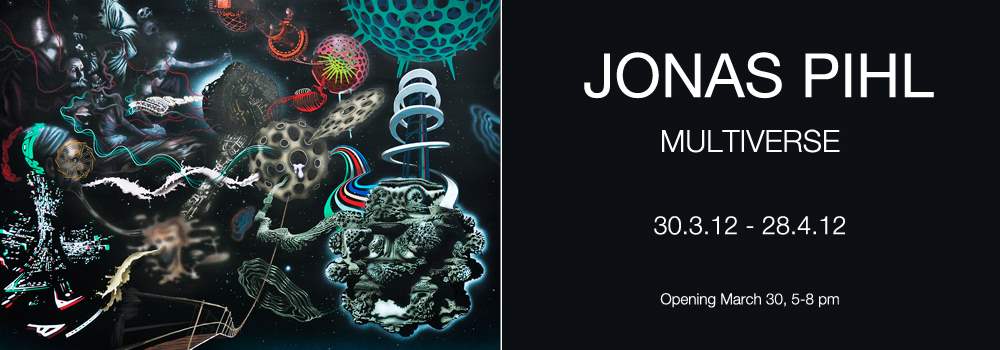 Jonas Pihl´s paintings paradoxically seem to transcend that stillness and move rhythmically in a circular groove like a moebius band or a Bach variation, infinitely modulating, rather than a composition with a beginning and an ending. Everything happens here and now in the painting in an entanglement of interconnected lines and tentacles fusing imagery in new irrational combinations, also talking about the structure of our modern communication and globalization. The challenge is the openness to let various different approaches to the world work together in a flat structure with no hierarchy, no absolutism, no one truth. Many different truths can coexist at the same time in Jonas Pihl´s paintings in a complex, rhizomatic structure. There is not one message, not one answer, but many questions and enigmas. Like in our world. Or worlds. Every idea is a world in itself in a philosophical sense. In a scientific sense these different universes are referred to as a multiverse. Our known Universe is only one among an infinite amount of other universes clinging to each other like soap bubbles in a bubble bath, or different spheres as Anton Sloterdijk describes what he calls ”Spherology”.